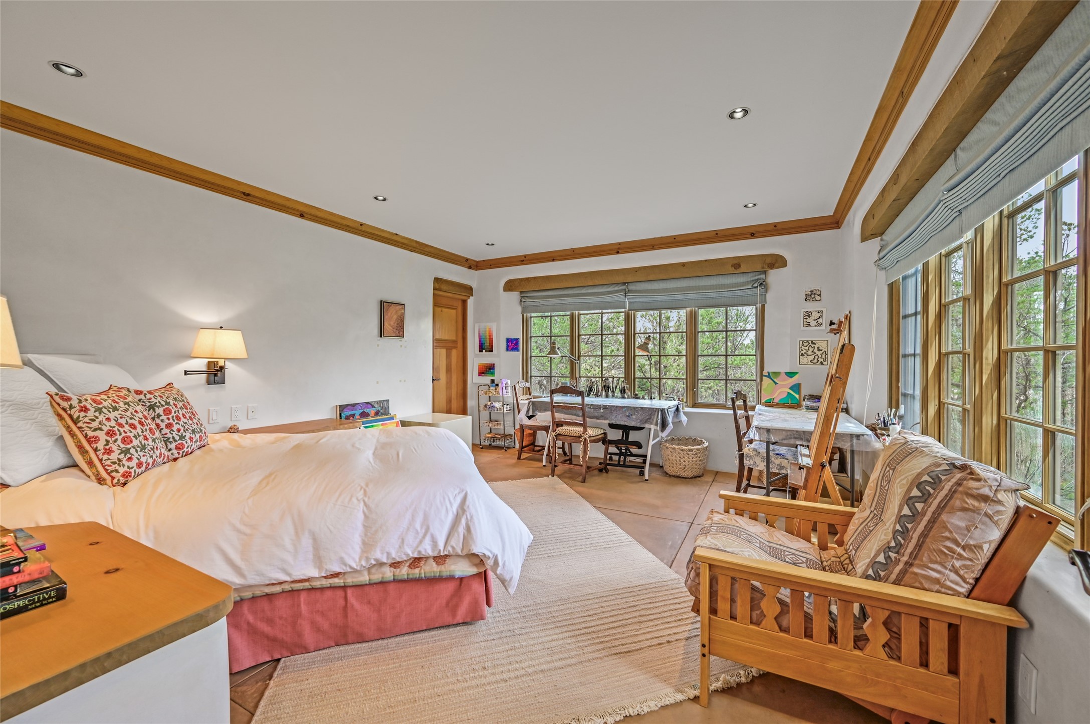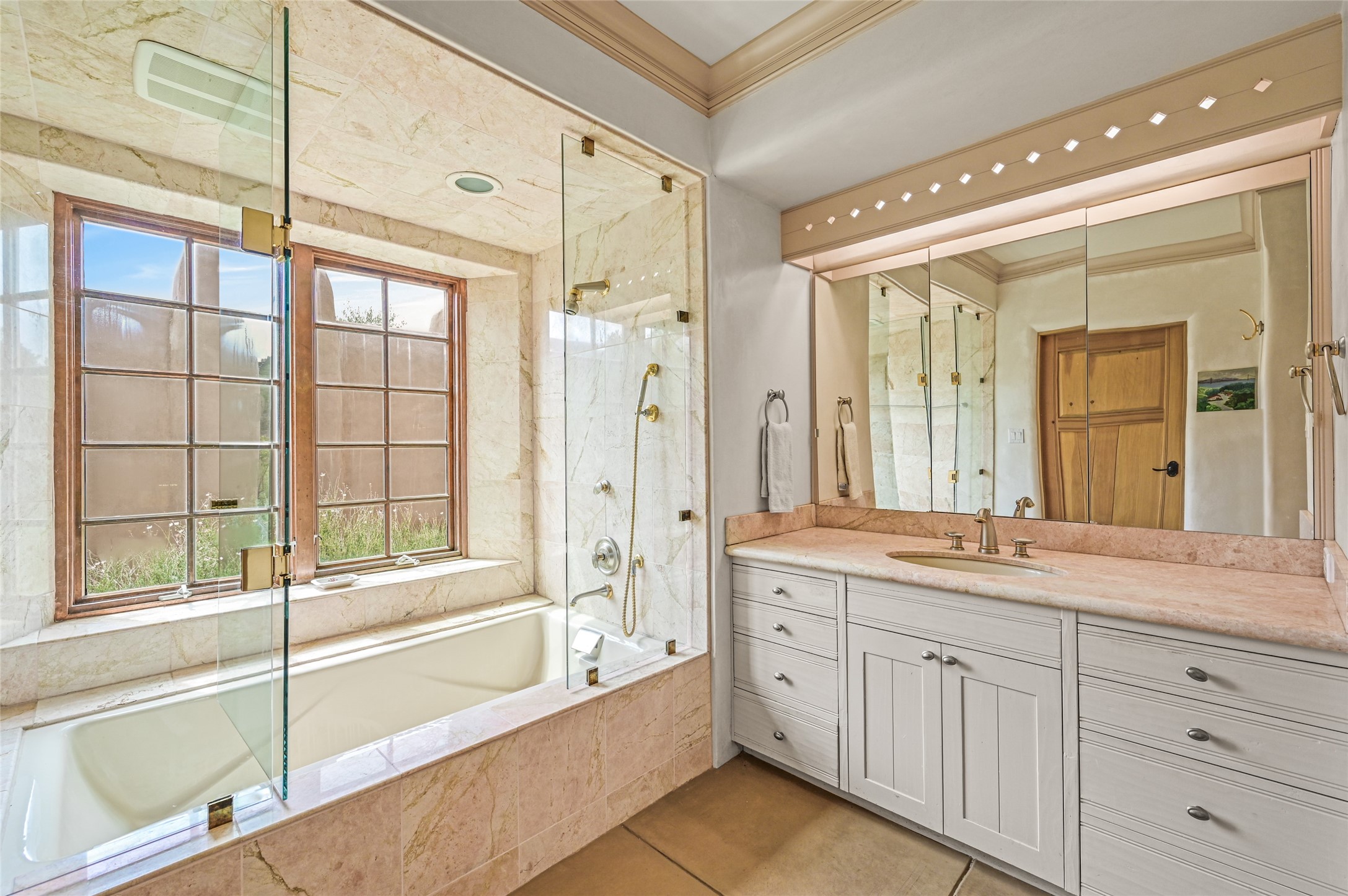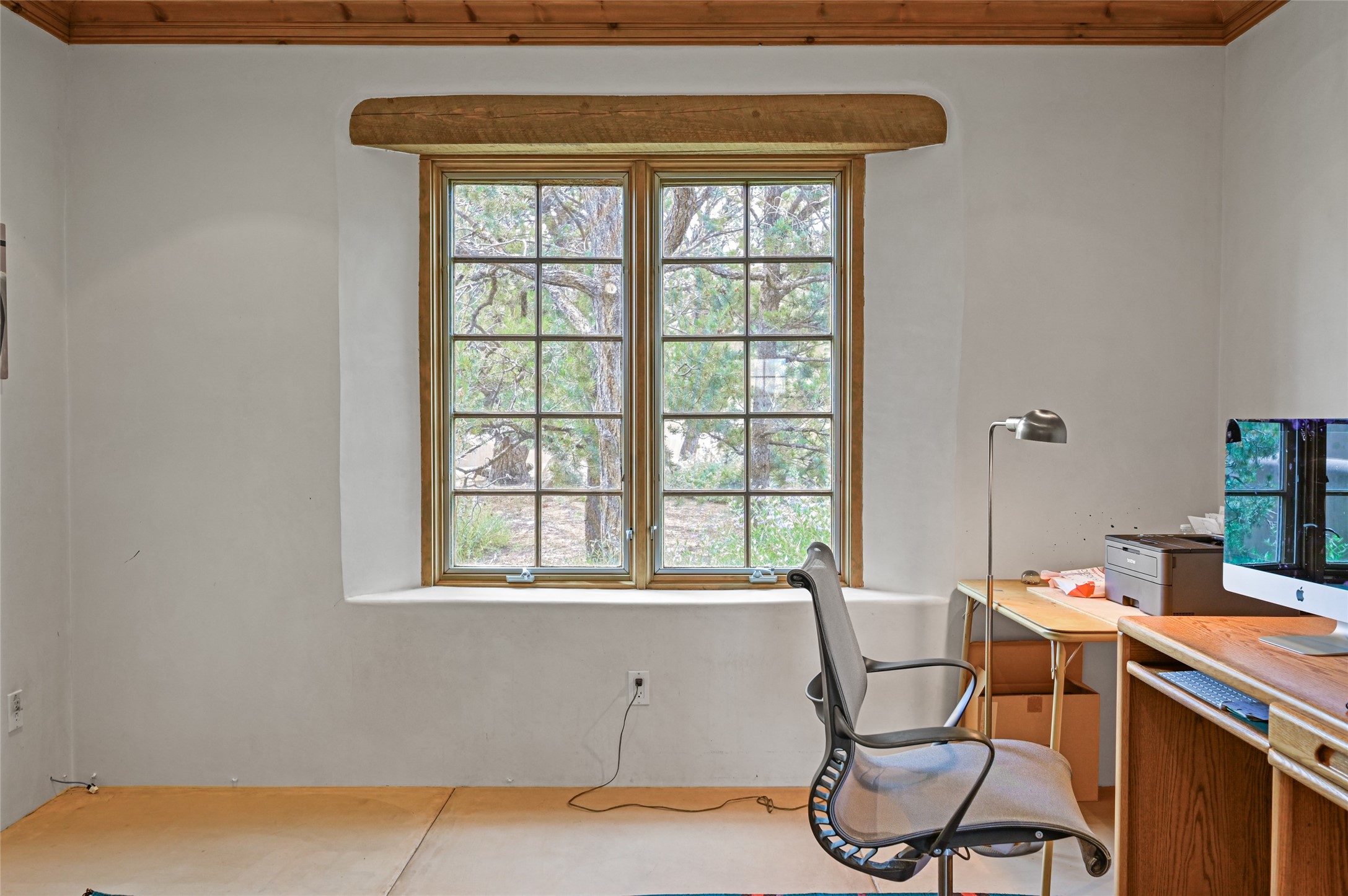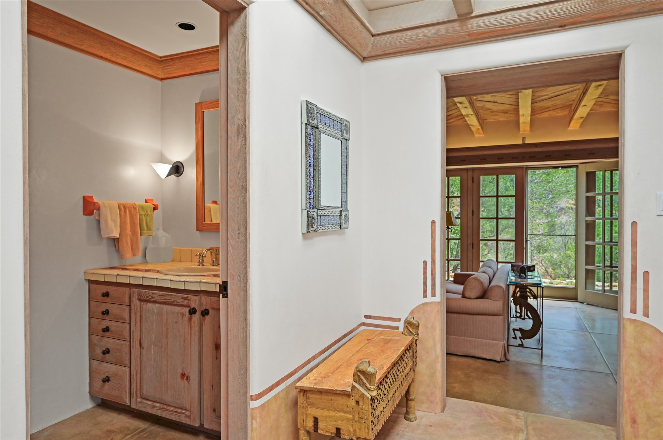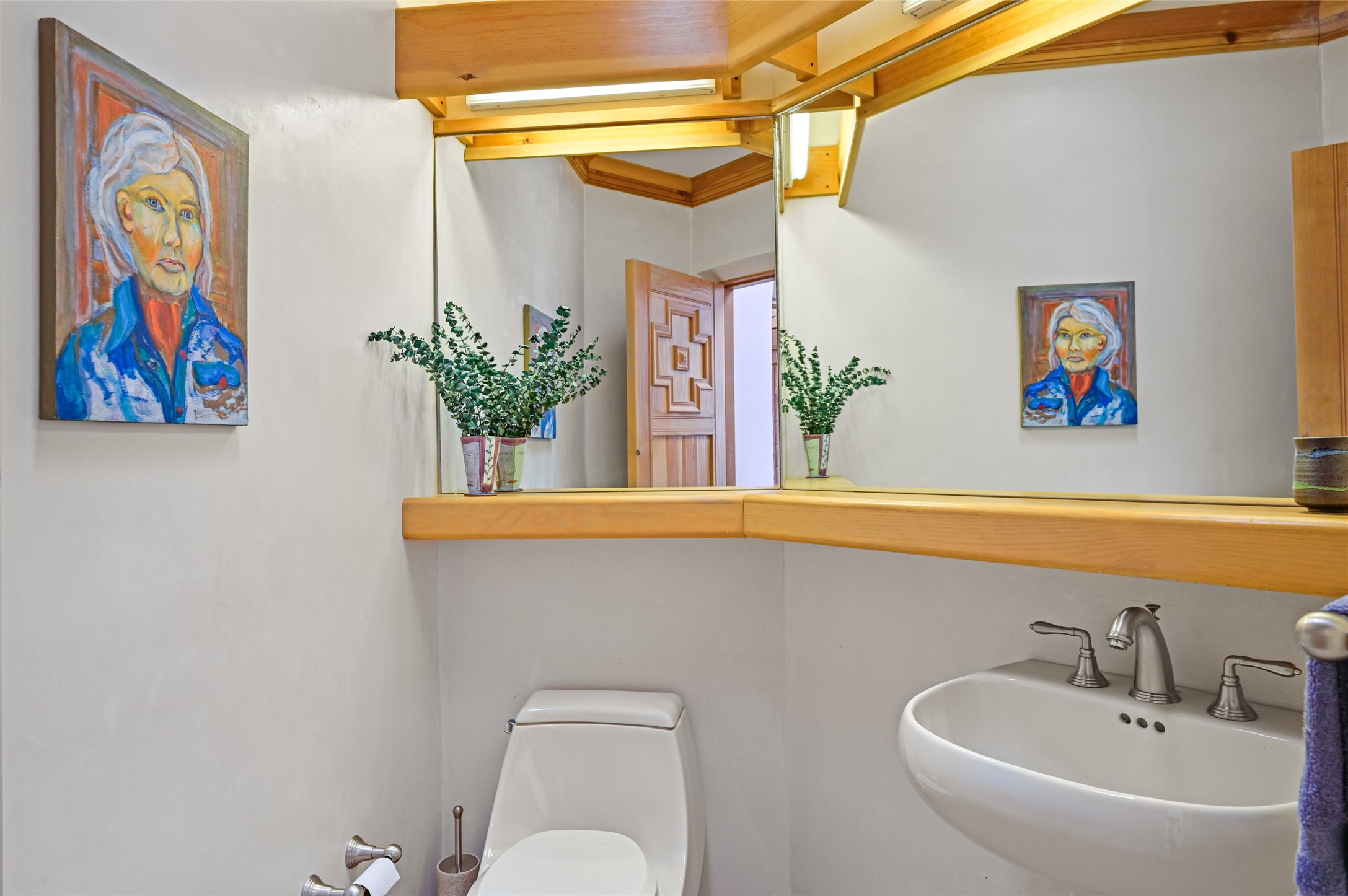 Nestled on a full acre in Santa Fe's sought-after Eastside, this beautifully maintained single-level adobe home--with a detached guest house--offers approximately 4,500 square feet of flexible living space, timeless design, and sweeping views. Built in 1995 by McDowell Builders with architect Lila DeWindt, the main residence features classic Santa Fe elements throughout: painted ceilings with vigas, kiva fireplaces, and a natural flow between indoor and outdoor living areas. The spacious primary suite is a true retreat, complete with a sitting area, private patio, and dual bathrooms for ultimate comfort and privacy.The heart of the home centers around a sunlit living room with northeast-facing mountain views, opening gracefully into a formal dining room that extends to the rear portal--perfect for entertaining or quiet evenings under the stars. The well-appointed kitchen and great room includes a cozy breakfast nook, kiva fireplace, TV viewing area, and abundant storage.A versatile office or flex room, a laundry room and a half bath for guests completes one area of the home, while a privately situated bedroom with full bath provides additional comfort and privacy for an additional family member or out-of-town guest.The detached guest house is ideal for visitors, work, or creative pursuits. It includes its own entrance, a welcoming entry portal, a private bedroom, full bathroom, kitchenette, and a richly appointed library or sitting room.This is a rare opportunity to own a spacious and flexible home in one of Santa Fe's most desirable neighborhoods--offering classic architecture, serene surroundings, and room to make it your own.