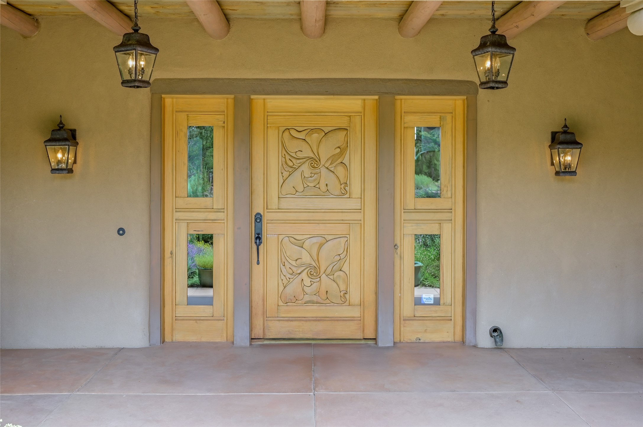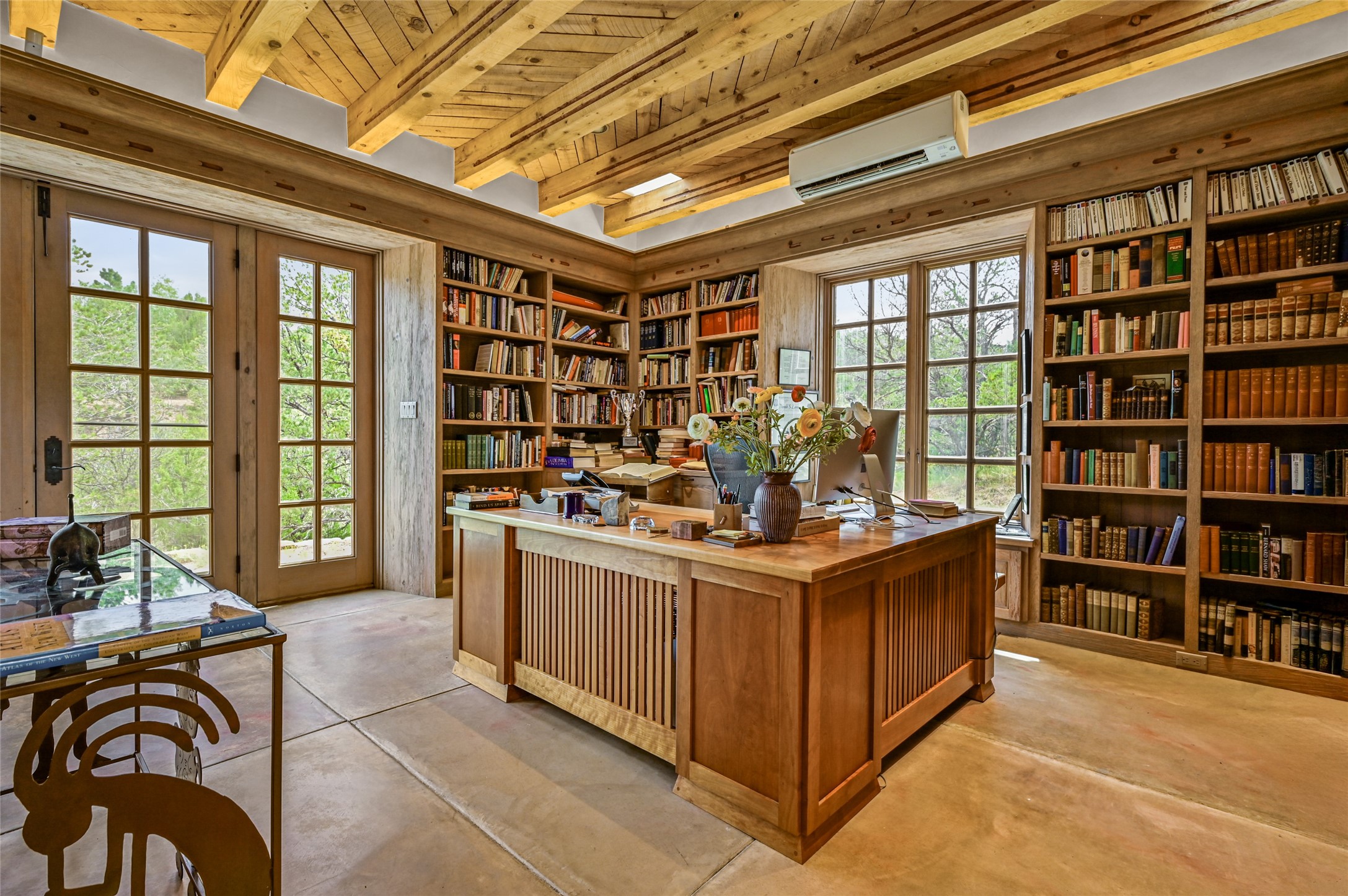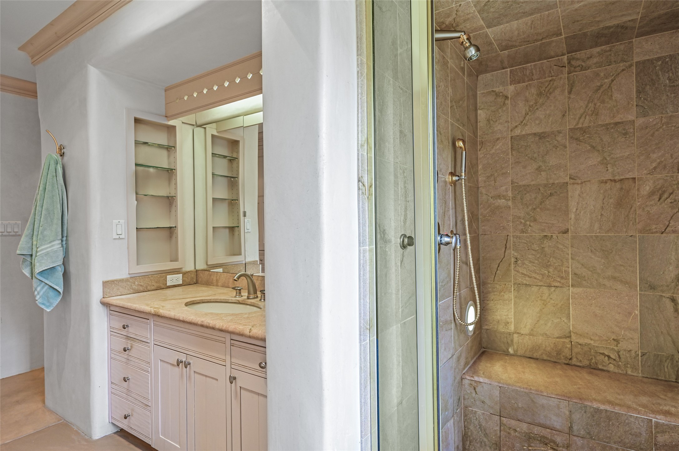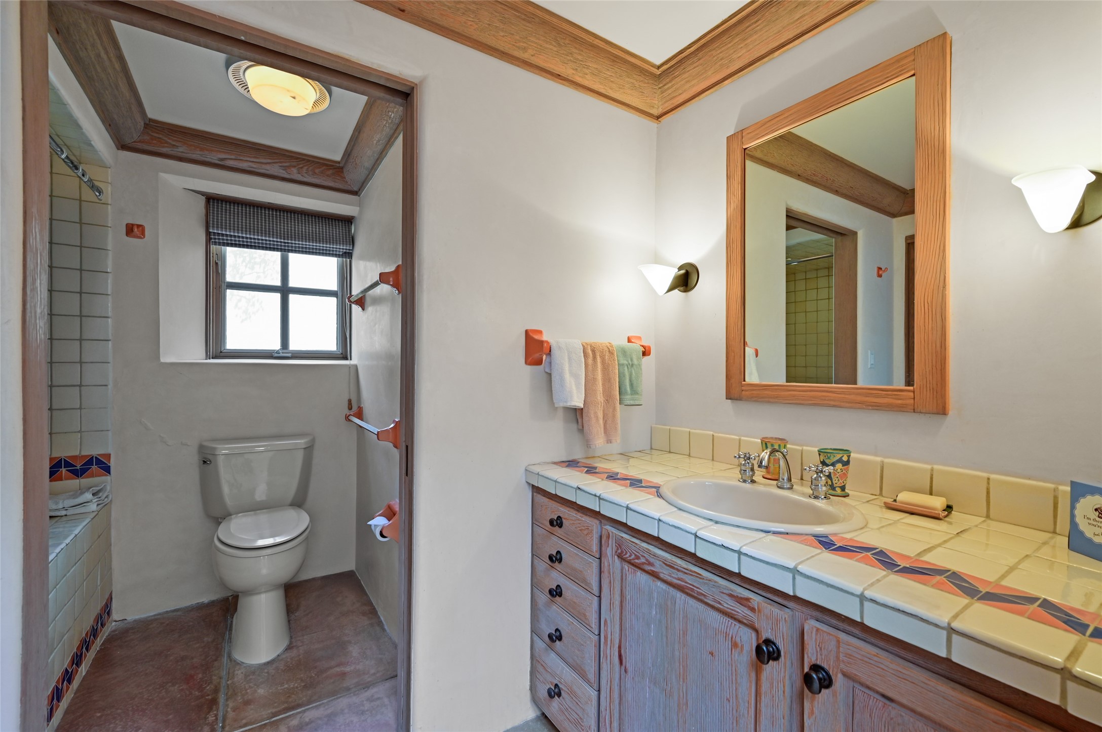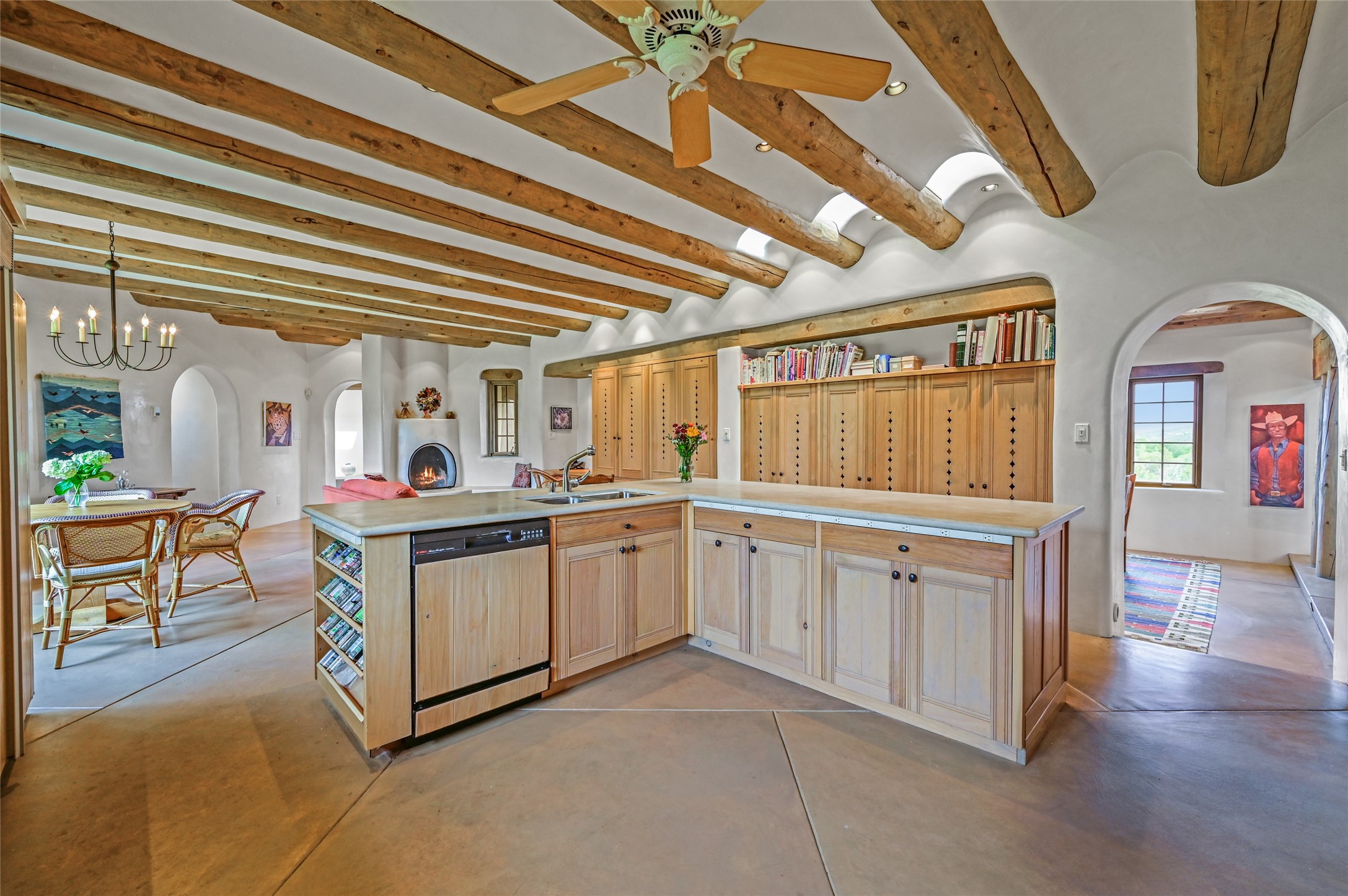 Nestled on a full acre in Santa Fe's sought-after Eastside, this beautifully maintained single-level adobe home--with a detached guest house--offers approximately 4,500 square feet of flexible living space, timeless design, and sweeping views. Built in 1995 by McDowell Builders with architect Lila DeWindt, the main residence features classic Santa Fe elements throughout: painted ceilings with vigas, kiva fireplaces, and a natural flow between indoor and outdoor living areas. The spacious primary suite is a true retreat, complete with a sitting area, private patio, and dual bathrooms for ultimate comfort and privacy.The heart of the home centers around a sunlit living room with northeast-facing mountain views, opening gracefully into a formal dining room that extends to the rear portal--perfect for entertaining or quiet evenings under the stars. The well-appointed kitchen and great room includes a cozy breakfast nook, kiva fireplace, TV viewing area, and abundant storage.A versatile office or flex room, a laundry room and a half bath for guests completes one area of the home, while a privately situated bedroom with full bath provides additional comfort and privacy for an additional family member or out-of-town guest.The detached guest house is ideal for visitors, work, or creative pursuits. It includes its own entrance, a welcoming entry portal, a private bedroom, full bathroom, kitchenette, and a richly appointed library or sitting room.This is a rare opportunity to own a spacious and flexible home in one of Santa Fe's most desirable neighborhoods--offering classic architecture, serene surroundings, and room to make it your own.