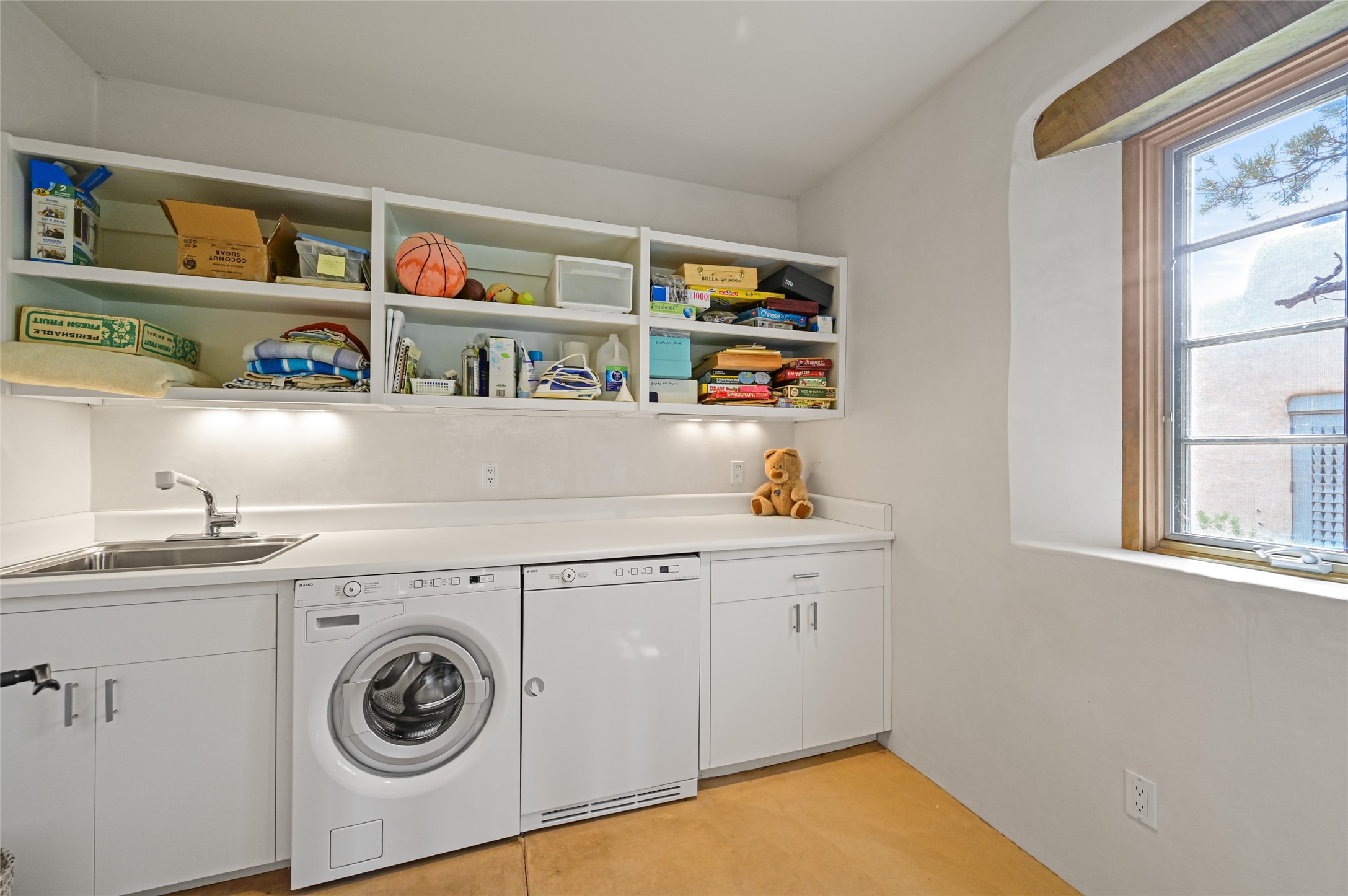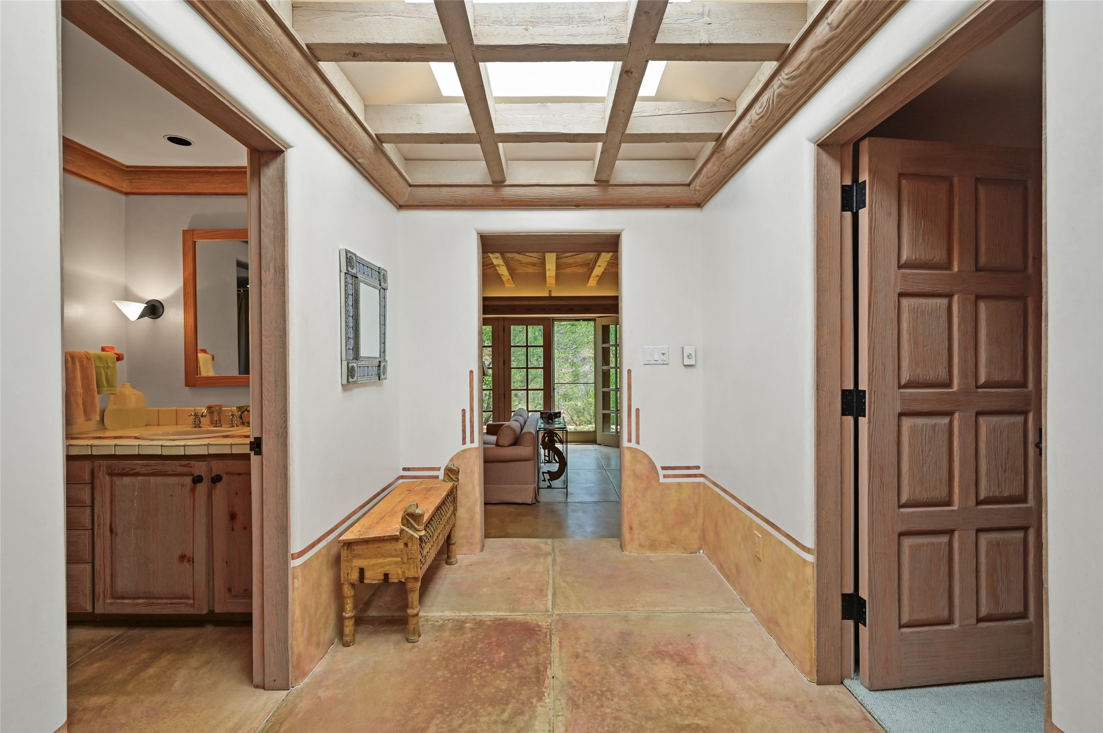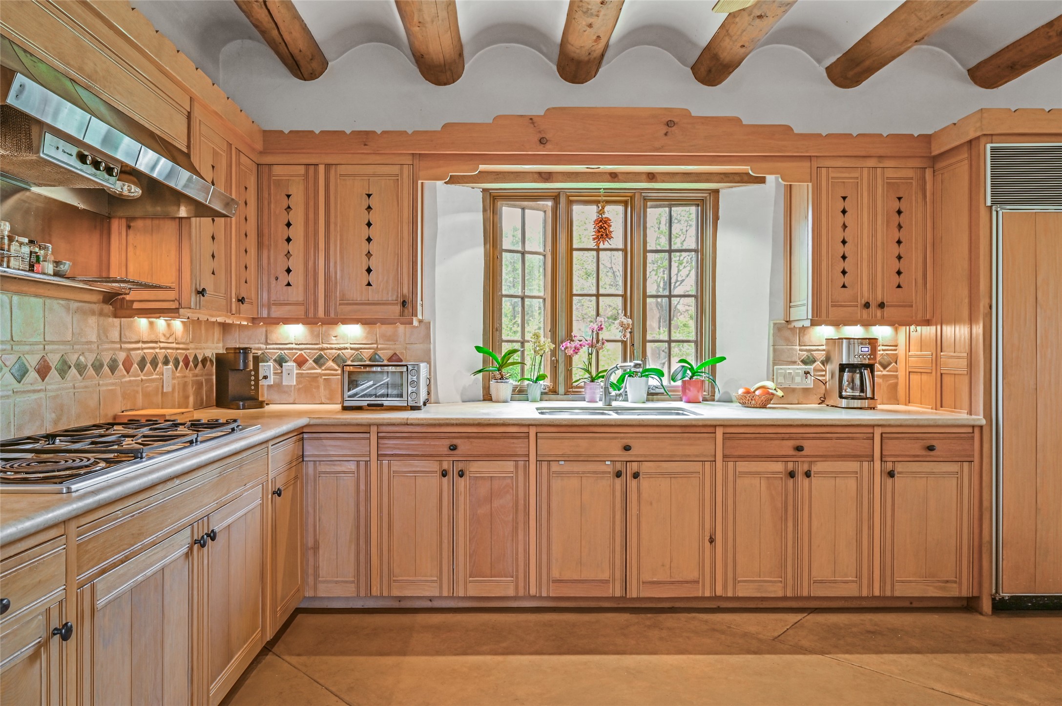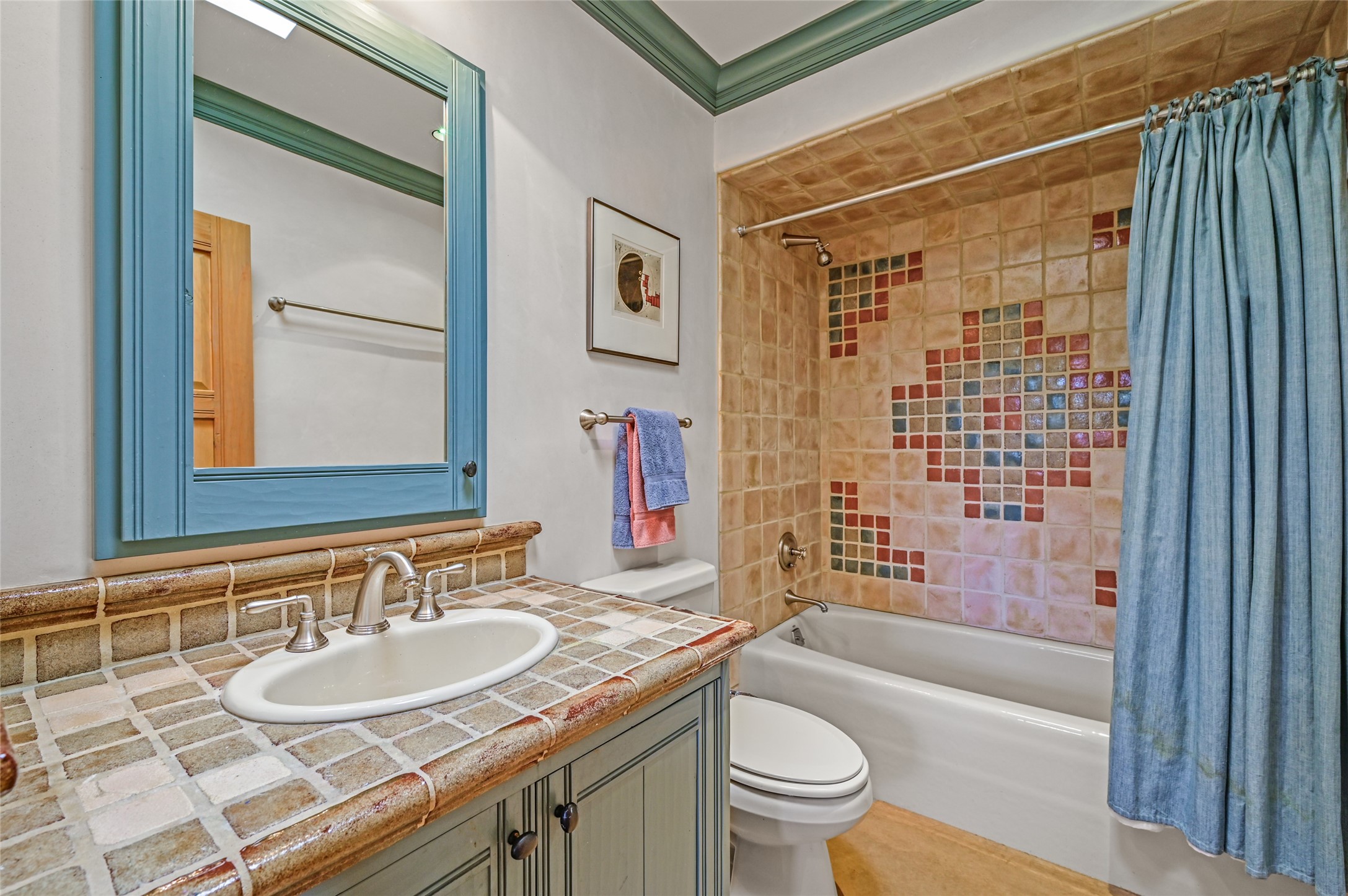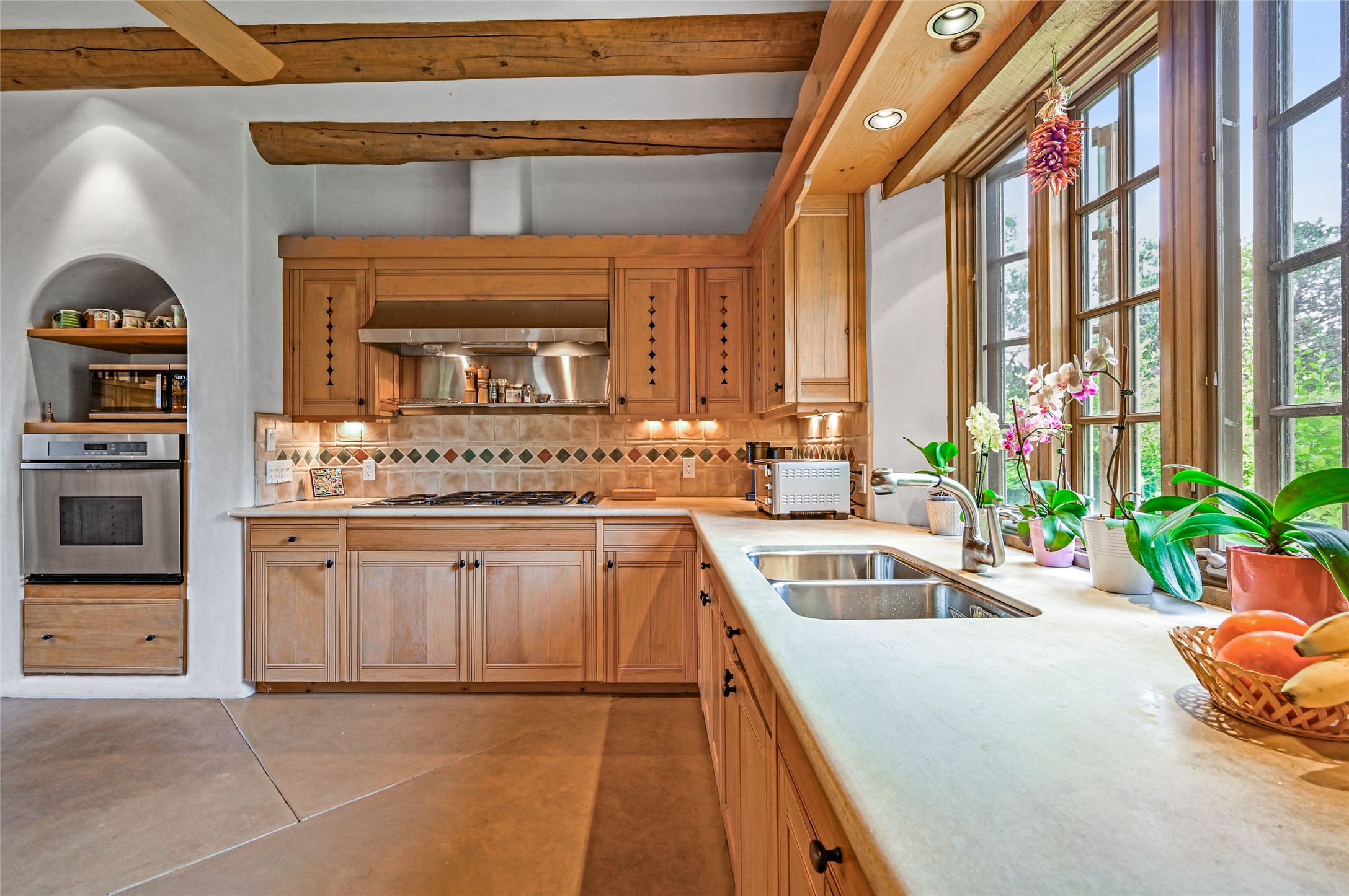 Nestled on a full acre in Santa Fe's sought-after Eastside, this beautifully maintained single-level adobe home--with a detached guest house--offers approximately 4,500 square feet of flexible living space, timeless design, and sweeping views. Built in 1995 by McDowell Builders with architect Lila DeWindt, the main residence features classic Santa Fe elements throughout: painted ceilings with vigas, kiva fireplaces, and a natural flow between indoor and outdoor living areas. The spacious primary suite is a true retreat, complete with a sitting area, private patio, and dual bathrooms for ultimate comfort and privacy.The heart of the home centers around a sunlit living room with northeast-facing mountain views, opening gracefully into a formal dining room that extends to the rear portal--perfect for entertaining or quiet evenings under the stars. The well-appointed kitchen and great room includes a cozy breakfast nook, kiva fireplace, TV viewing area, and abundant storage.A versatile office or flex room, a laundry room and a half bath for guests completes one area of the home, while a privately situated bedroom with full bath provides additional comfort and privacy for an additional family member or out-of-town guest.The detached guest house is ideal for visitors, work, or creative pursuits. It includes its own entrance, a welcoming entry portal, a private bedroom, full bathroom, kitchenette, and a richly appointed library or sitting room.This is a rare opportunity to own a spacious and flexible home in one of Santa Fe's most desirable neighborhoods--offering classic architecture, serene surroundings, and room to make it your own.