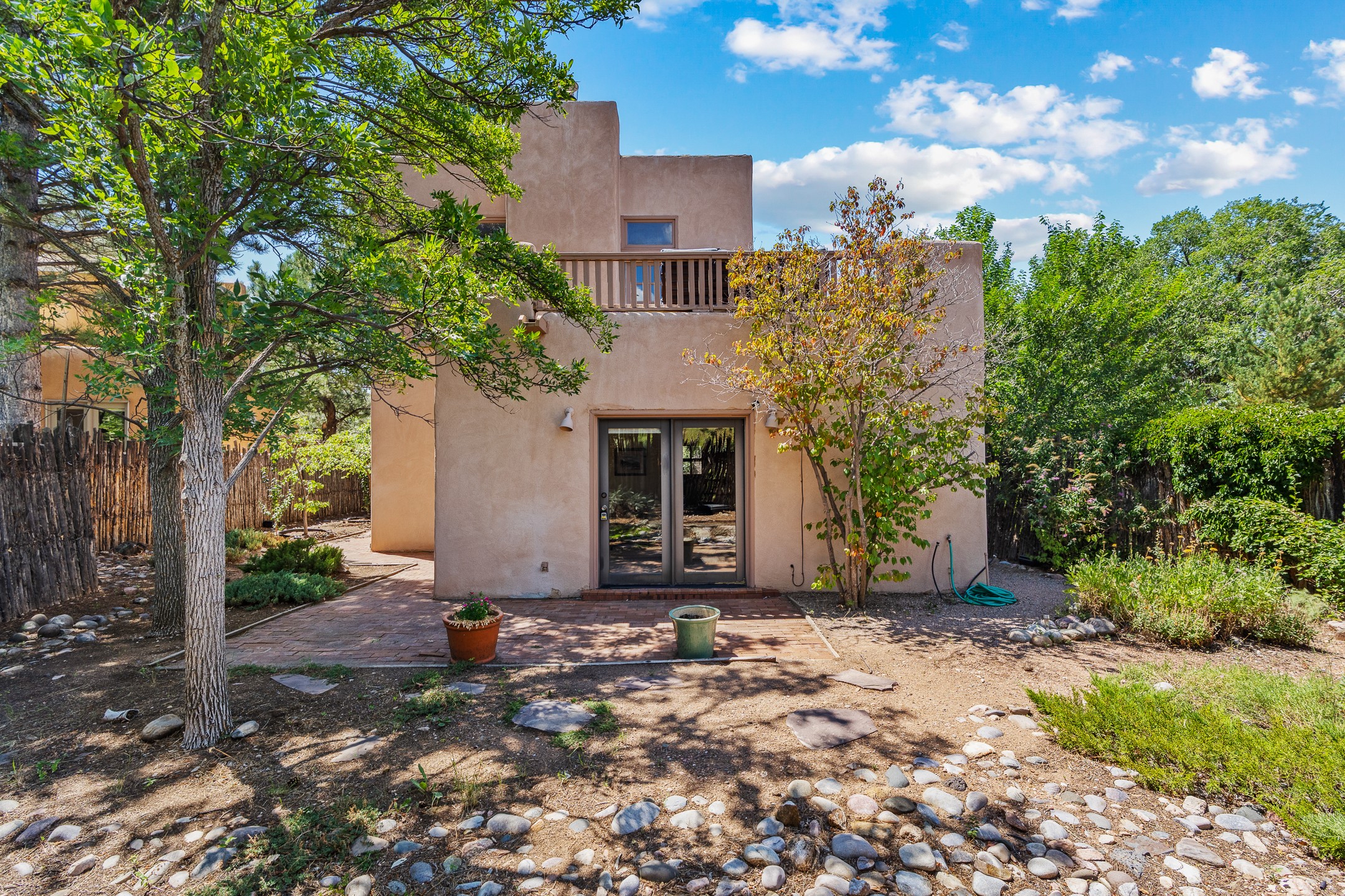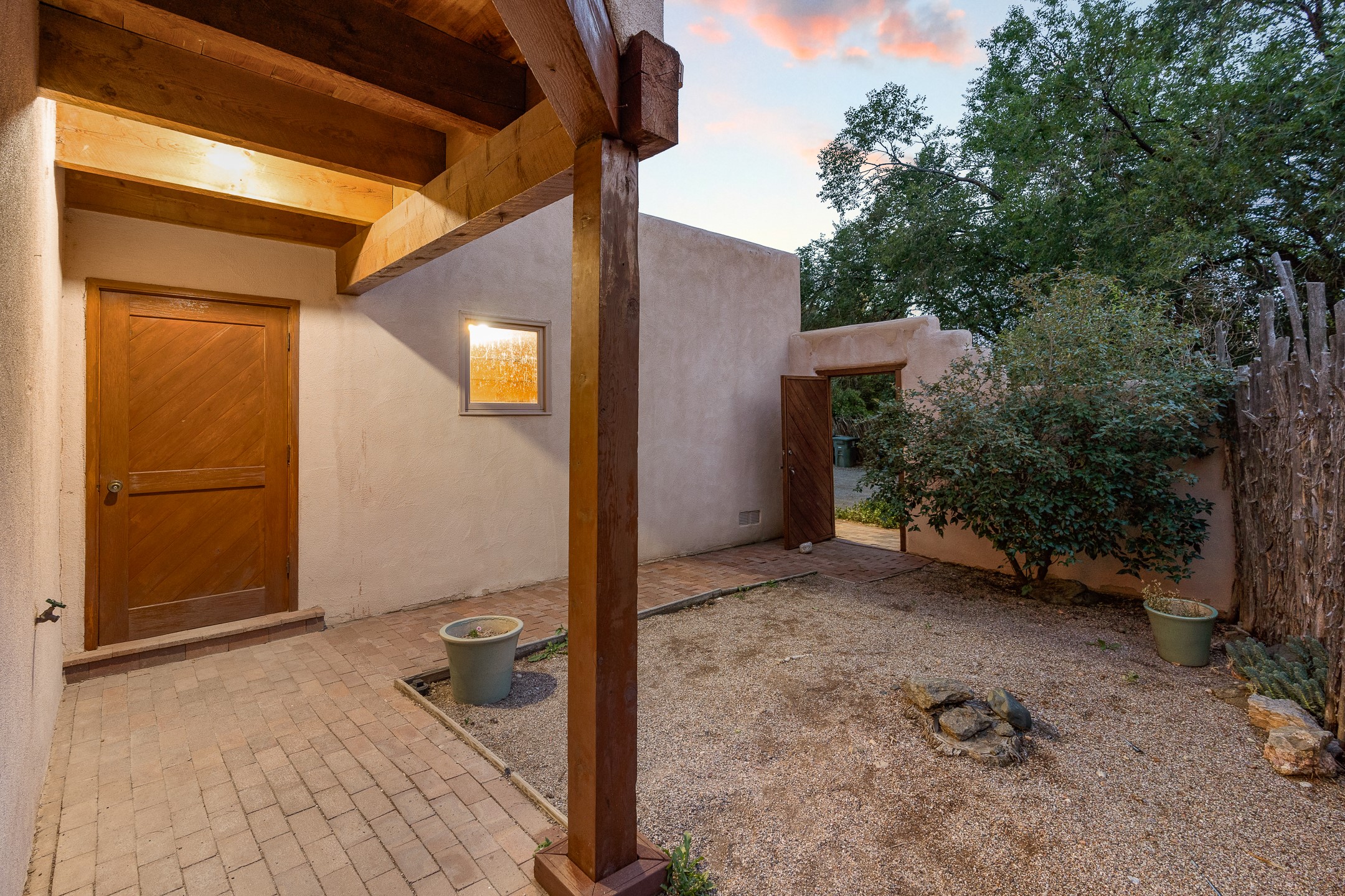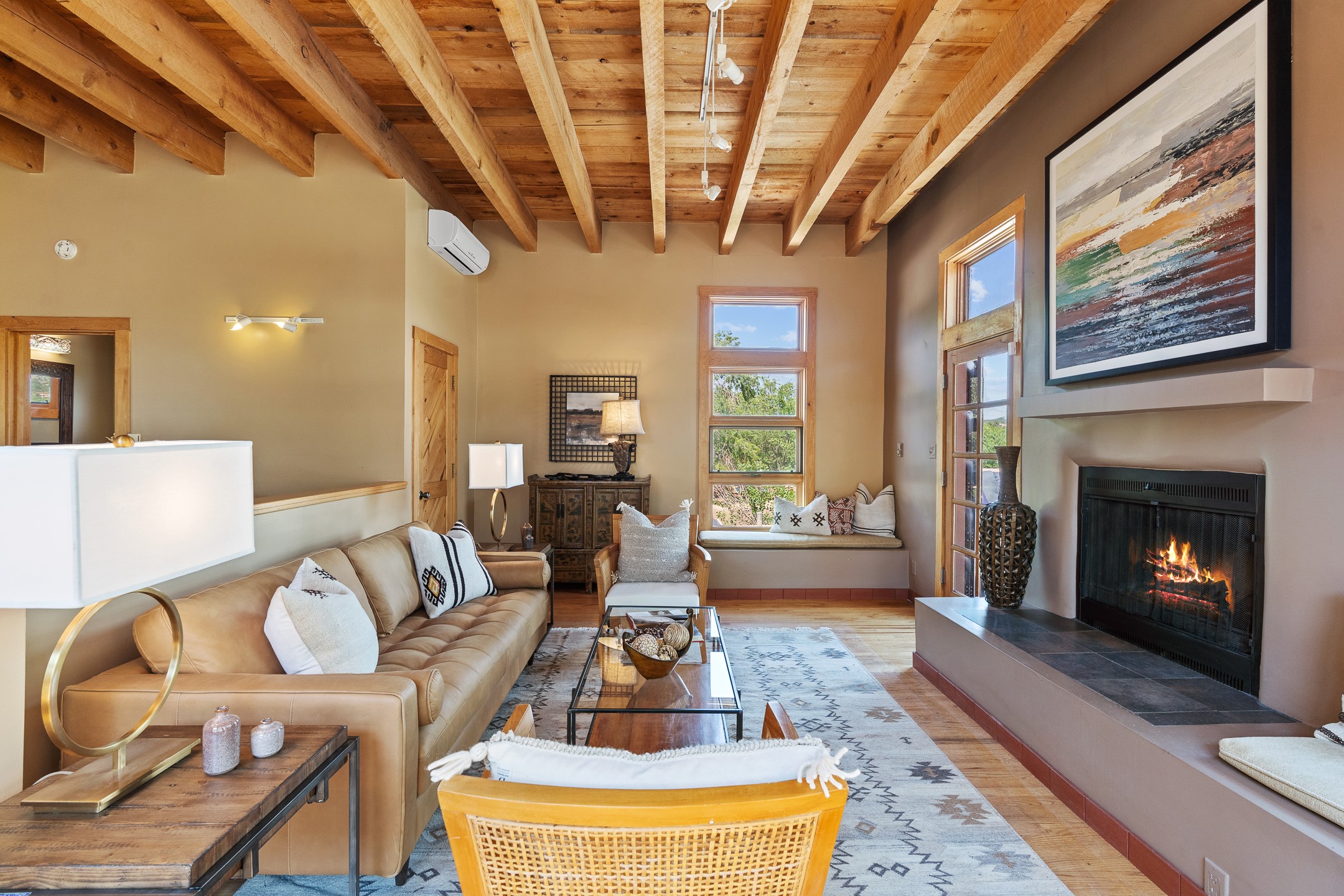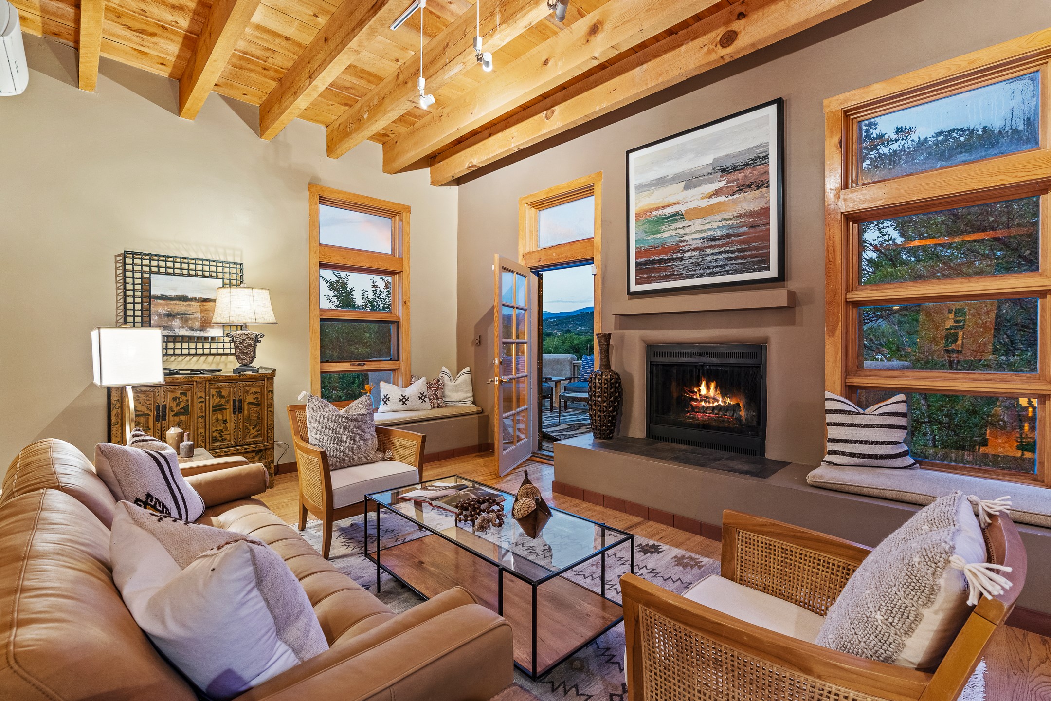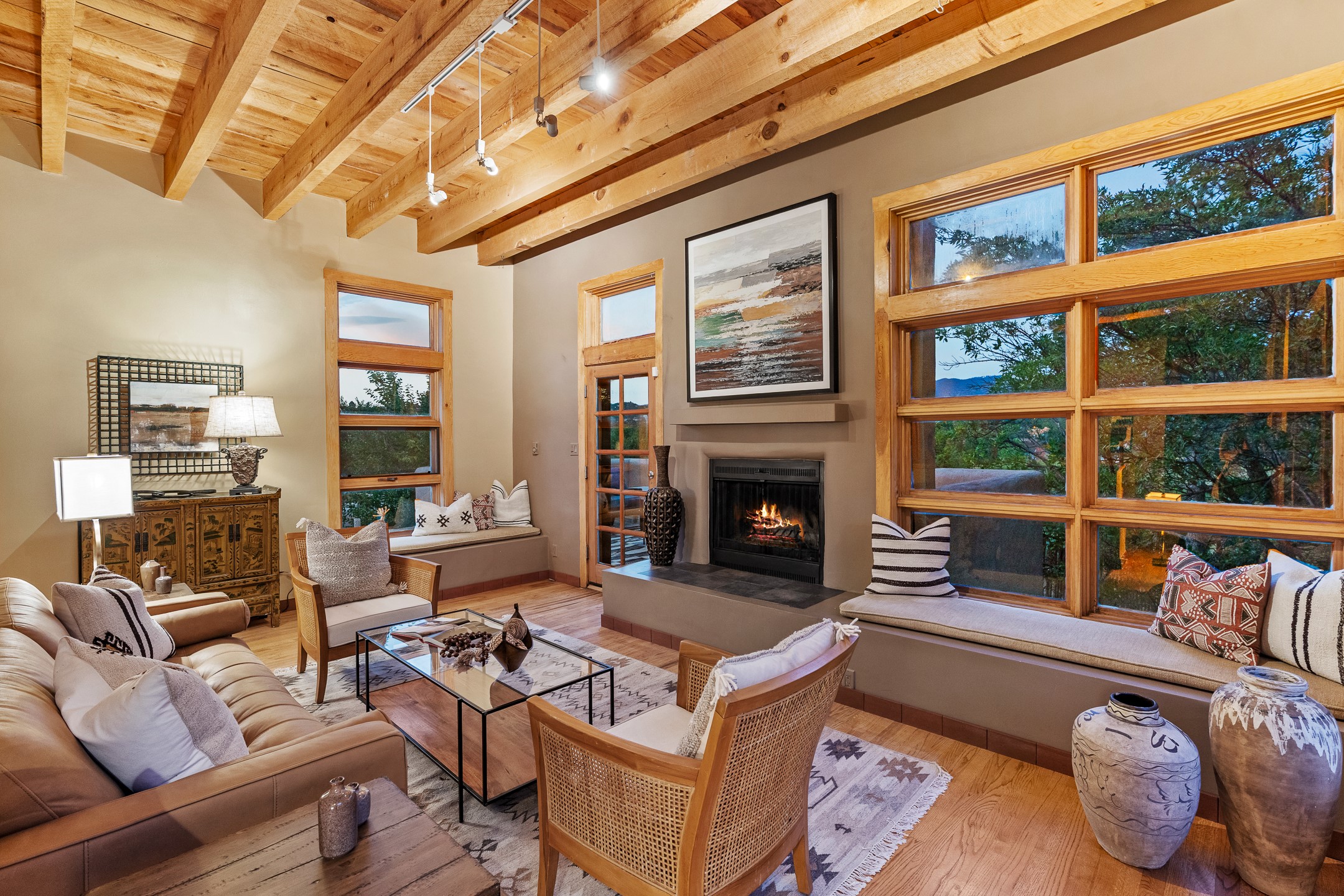 Located down a little lane in Santa Fe's Historic Eastside! With walking easement to Canyon Road, is this beautiful 2145 sq. ft. 3-bedroom, 2 1/2-bath light filled home. Architectural features are floor to ceiling windows of both East and West views featuring Picacho peak, trees and garden views, wood floors, beams, authentic talavera tile, and brick floors. Upstairs, a sunlit living area flows seamlessly into a dining room and kitchen, complete with custom cabinets, stone tile, stainless appliances, stunning wood floors and a half bath. Two decks provide serene views, while a central wood-burning fireplace and cushioned bancos create a lovely environment to entertain. All bedrooms are on the main level, including the primary suite showcasing a wall of windows facing East with private patio access, a sitting area, and tumbled travertine bath. The expansive guest bedroom also with an ensuite bathroom enjoys South facing windows and access to private gardens. While the third bedroom is currently used as a home office also with lots of South facing windows and its own entrance. Rich brick floors enhance the home's warm, enduring character throughout.Thoughtful amenities include a two-car garage with covered brick walkway and gated courtyard entrance. This residence combines artisanal finishes, historic charm, and a prime Eastside location just steps from galleries, restaurants, and cultural landmarks. A rare opportunity to enjoy privacy, quality construction and views. The perfect Santa Fe lifestyle.