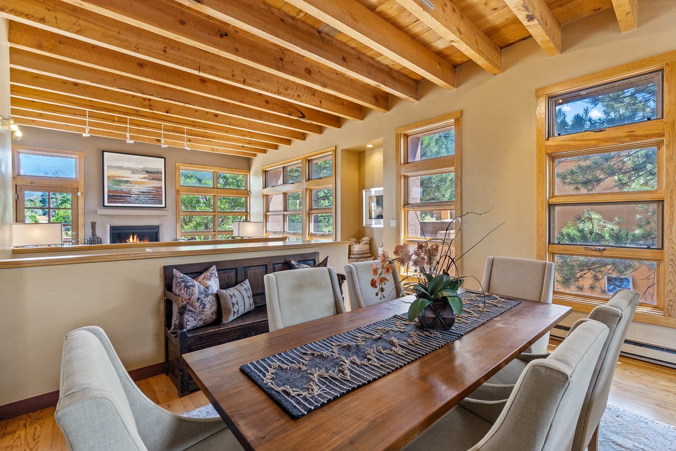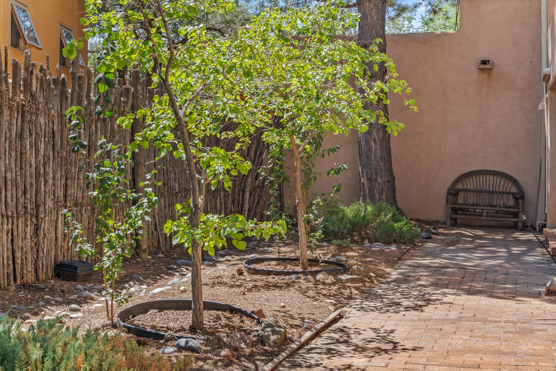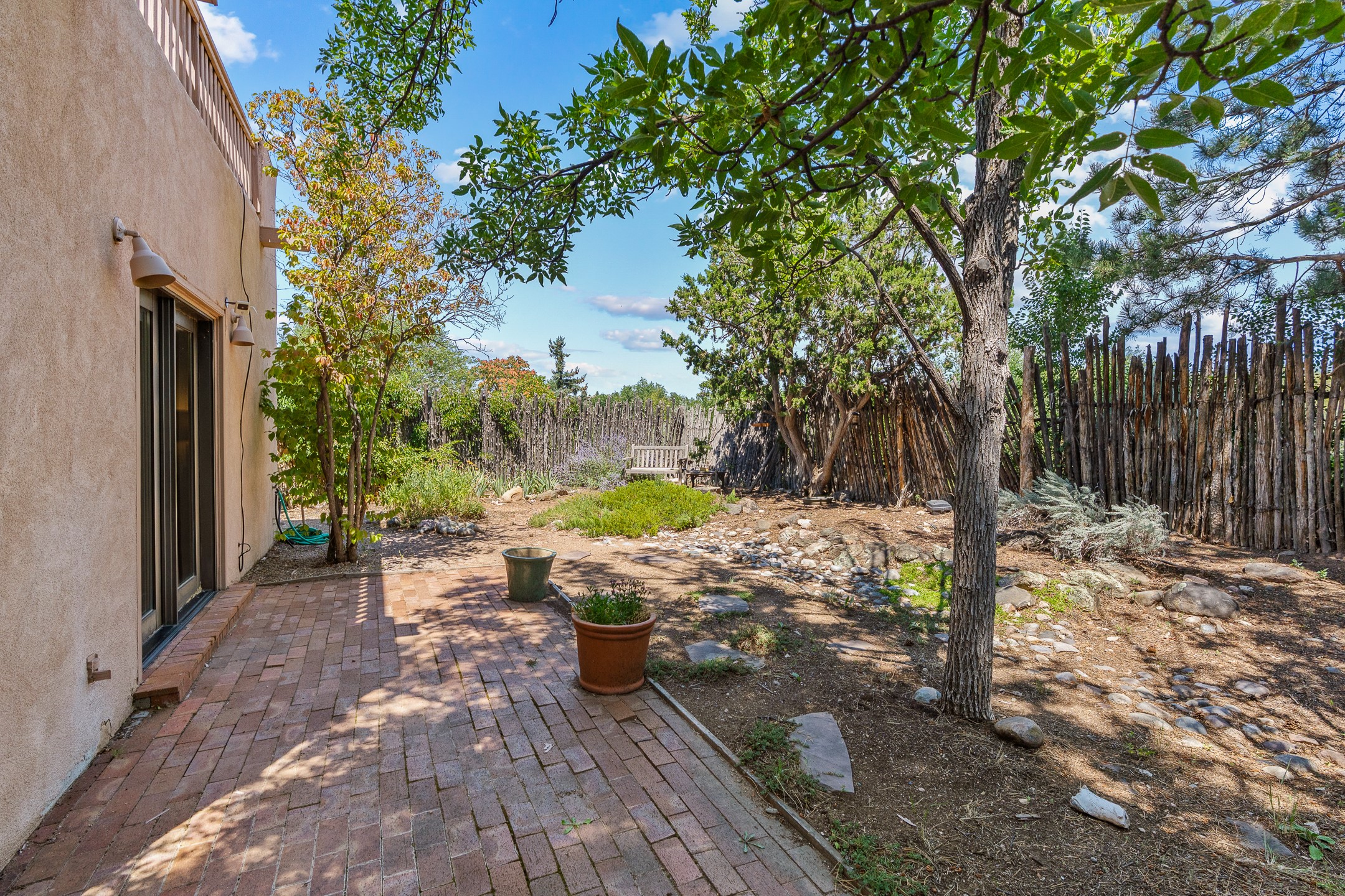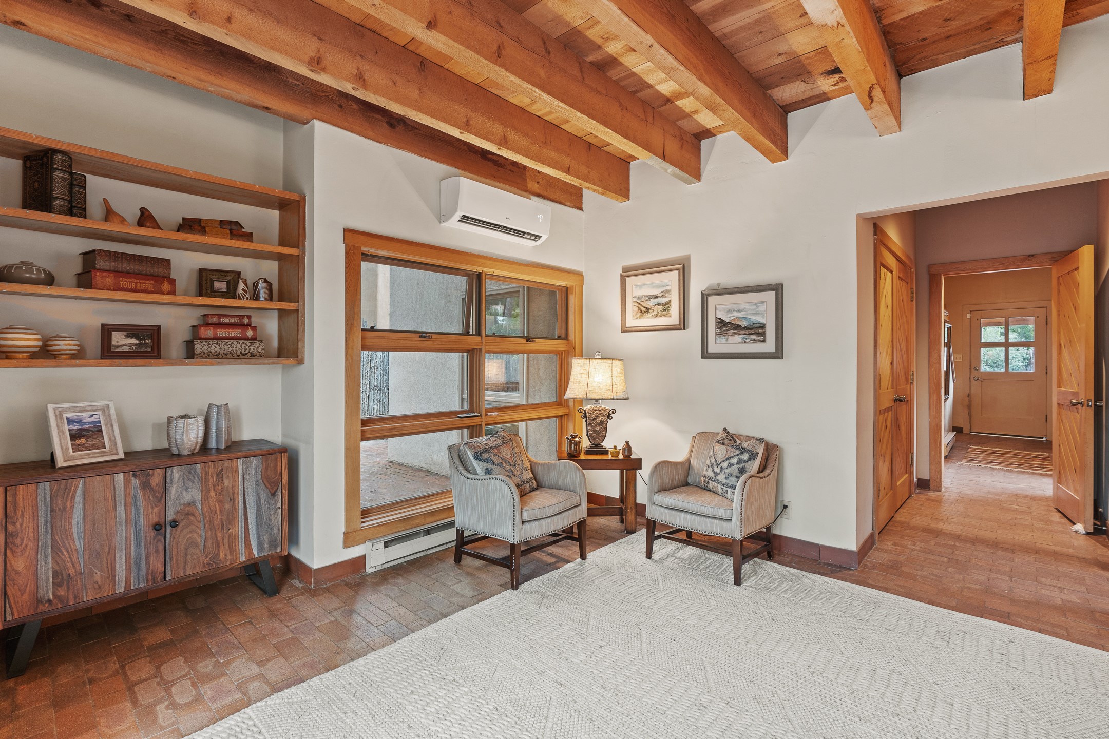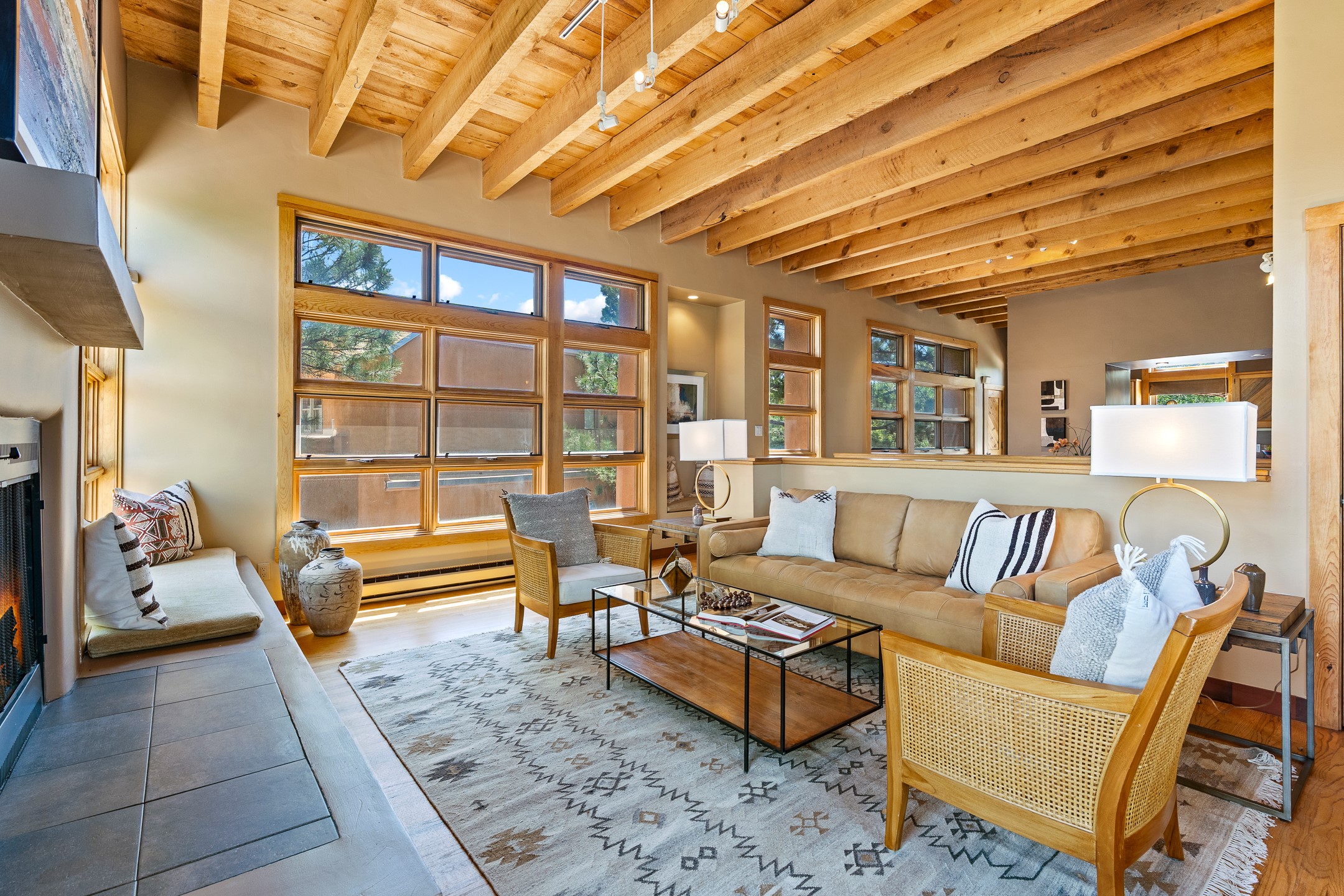 Located down a little lane in Santa Fe's Historic Eastside! With walking easement to Canyon Road, is this beautiful 2145 sq. ft. 3-bedroom, 2 1/2-bath light filled home. Architectural features are floor to ceiling windows of both East and West views featuring Picacho peak, trees and garden views, wood floors, beams, authentic talavera tile, and brick floors. Upstairs, a sunlit living area flows seamlessly into a dining room and kitchen, complete with custom cabinets, stone tile, stainless appliances, stunning wood floors and a half bath. Two decks provide serene views, while a central wood-burning fireplace and cushioned bancos create a lovely environment to entertain. All bedrooms are on the main level, including the primary suite showcasing a wall of windows facing East with private patio access, a sitting area, and tumbled travertine bath. The expansive guest bedroom also with an ensuite bathroom enjoys South facing windows and access to private gardens. While the third bedroom is currently used as a home office also with lots of South facing windows and its own entrance. Rich brick floors enhance the home's warm, enduring character throughout.Thoughtful amenities include a two-car garage with covered brick walkway and gated courtyard entrance. This residence combines artisanal finishes, historic charm, and a prime Eastside location just steps from galleries, restaurants, and cultural landmarks. A rare opportunity to enjoy privacy, quality construction and views. The perfect Santa Fe lifestyle.