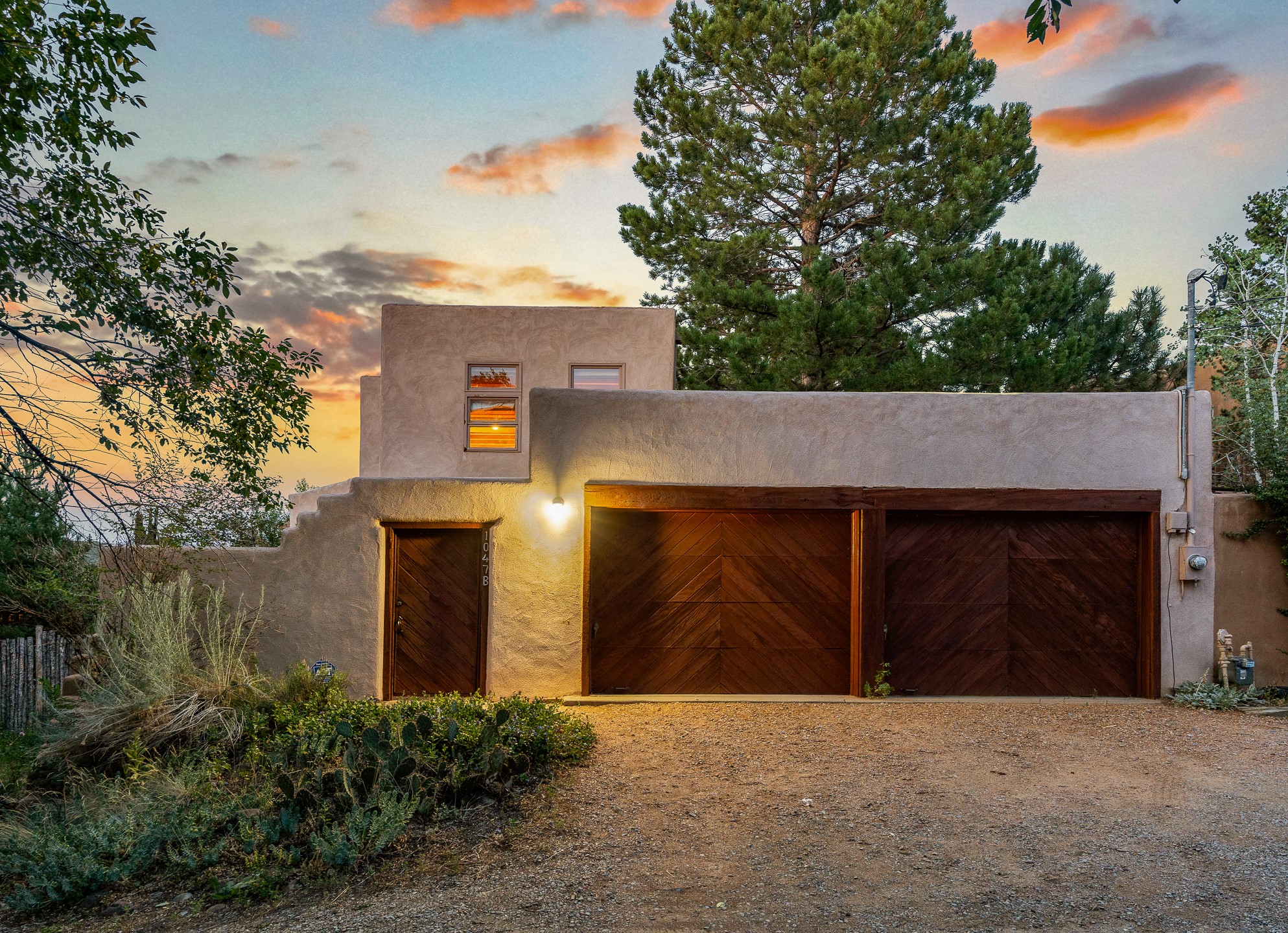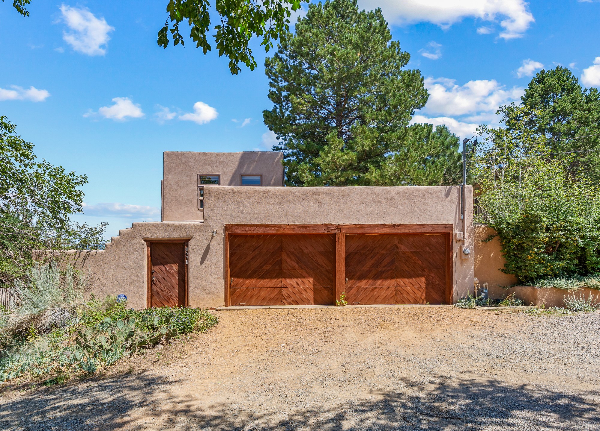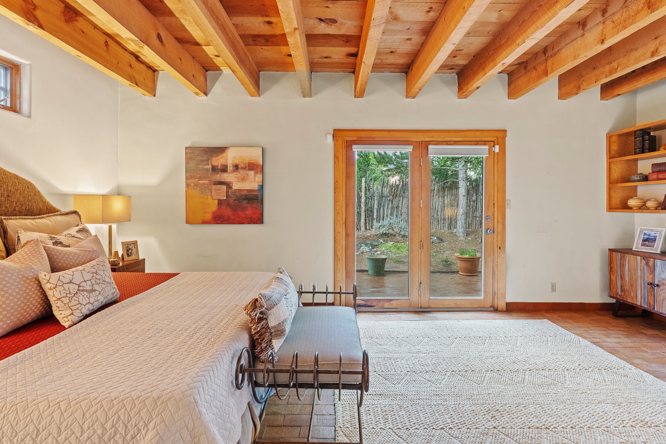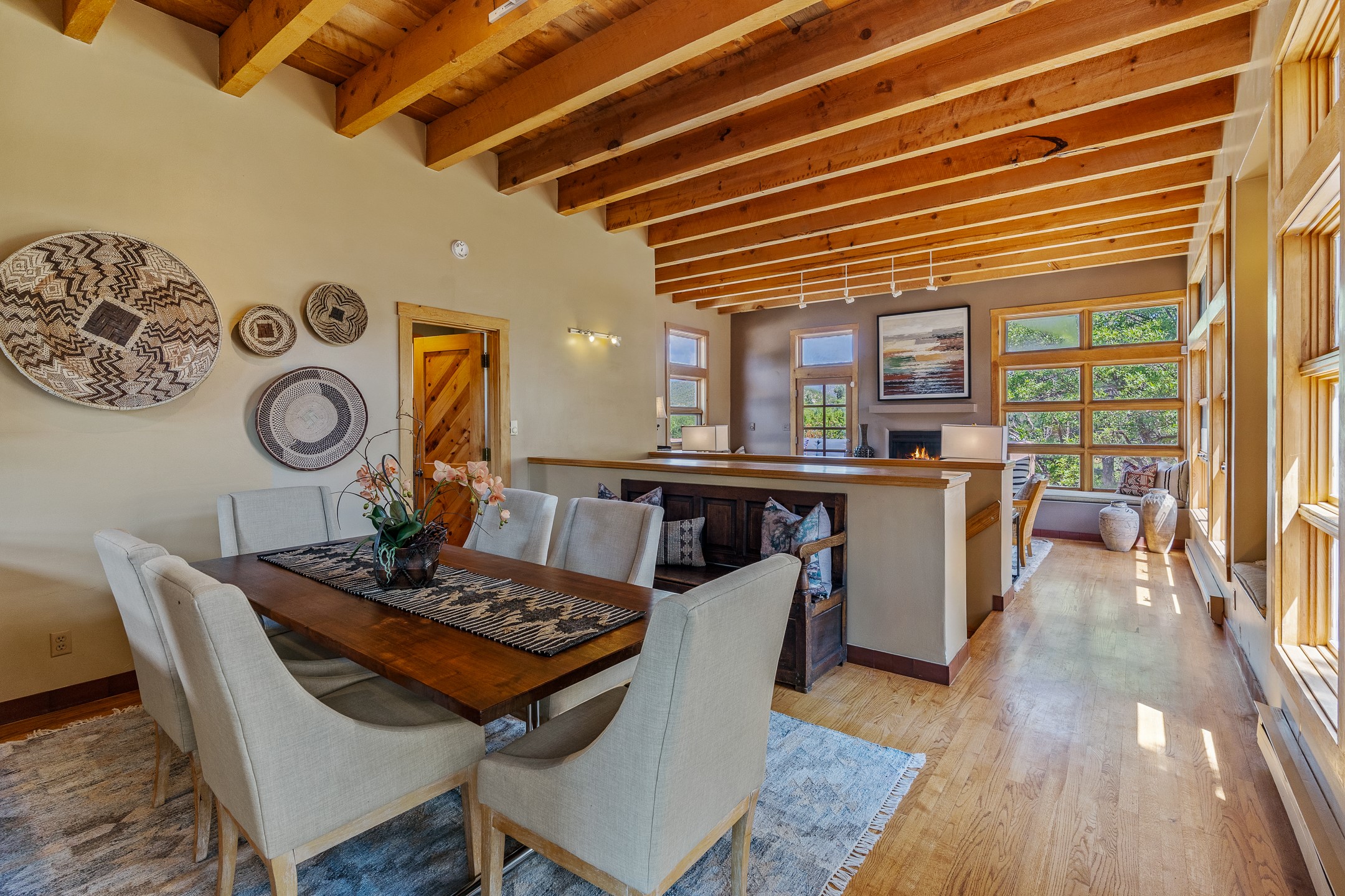 Located down a little lane in Santa Fe's Historic Eastside! With walking easement to Canyon Road, is this beautiful 2145 sq. ft. 3-bedroom, 2 1/2-bath light filled home. Architectural features are floor to ceiling windows of both East and West views featuring Picacho peak, trees and garden views, wood floors, beams, authentic talavera tile, and brick floors. Upstairs, a sunlit living area flows seamlessly into a dining room and kitchen, complete with custom cabinets, stone tile, stainless appliances, stunning wood floors and a half bath. Two decks provide serene views, while a central wood-burning fireplace and cushioned bancos create a lovely environment to entertain. All bedrooms are on the main level, including the primary suite showcasing a wall of windows facing East with private patio access, a sitting area, and tumbled travertine bath. The expansive guest bedroom also with an ensuite bathroom enjoys South facing windows and access to private gardens. While the third bedroom is currently used as a home office also with lots of South facing windows and its own entrance. Rich brick floors enhance the home's warm, enduring character throughout.Thoughtful amenities include a two-car garage with covered brick walkway and gated courtyard entrance. This residence combines artisanal finishes, historic charm, and a prime Eastside location just steps from galleries, restaurants, and cultural landmarks. A rare opportunity to enjoy privacy, quality construction and views. The perfect Santa Fe lifestyle.