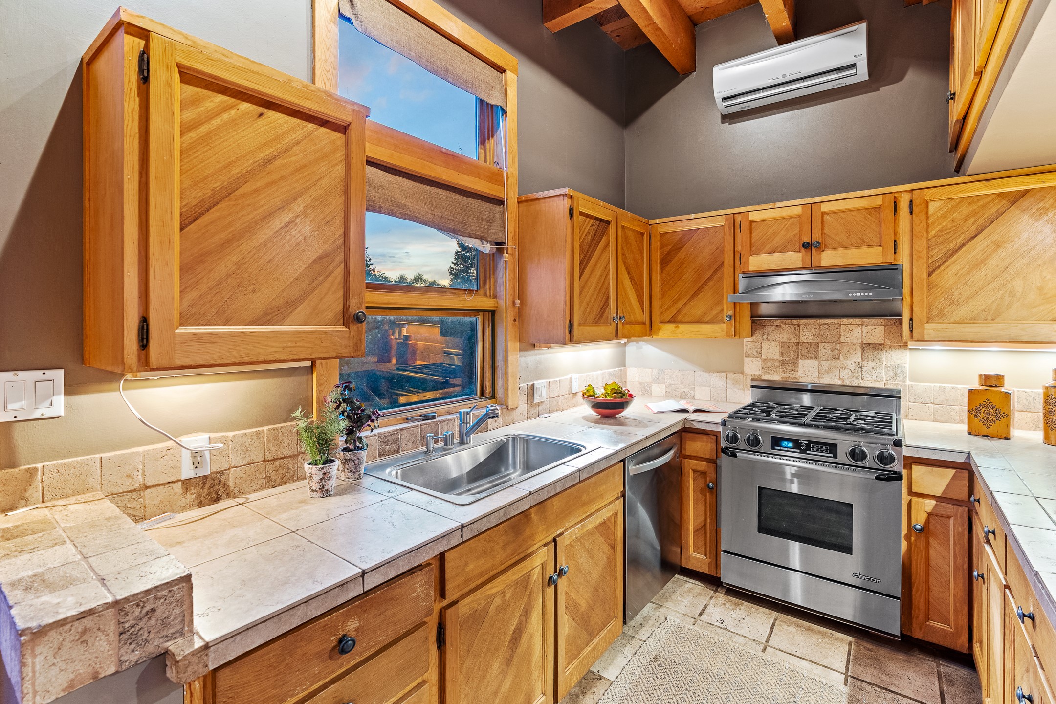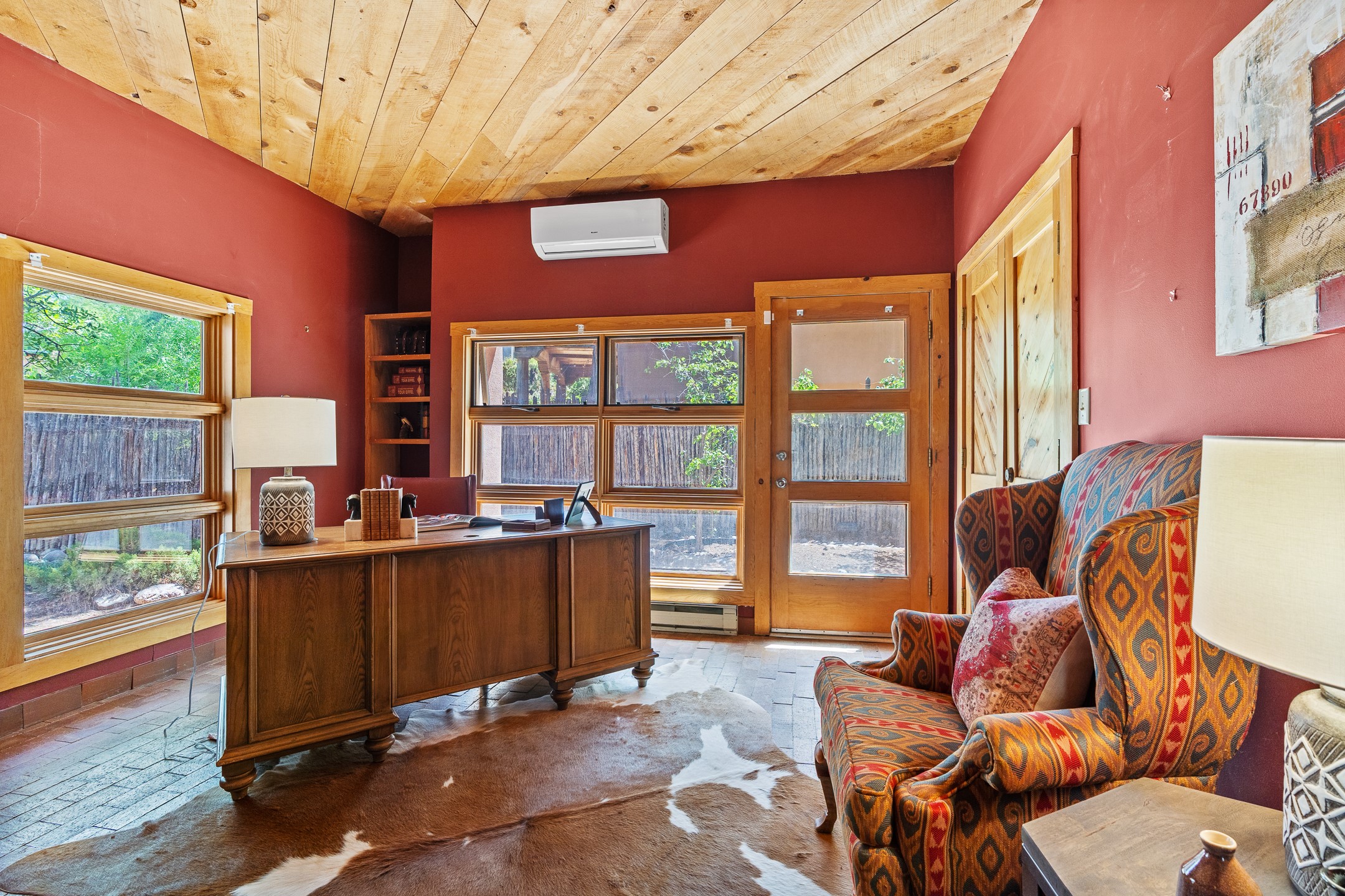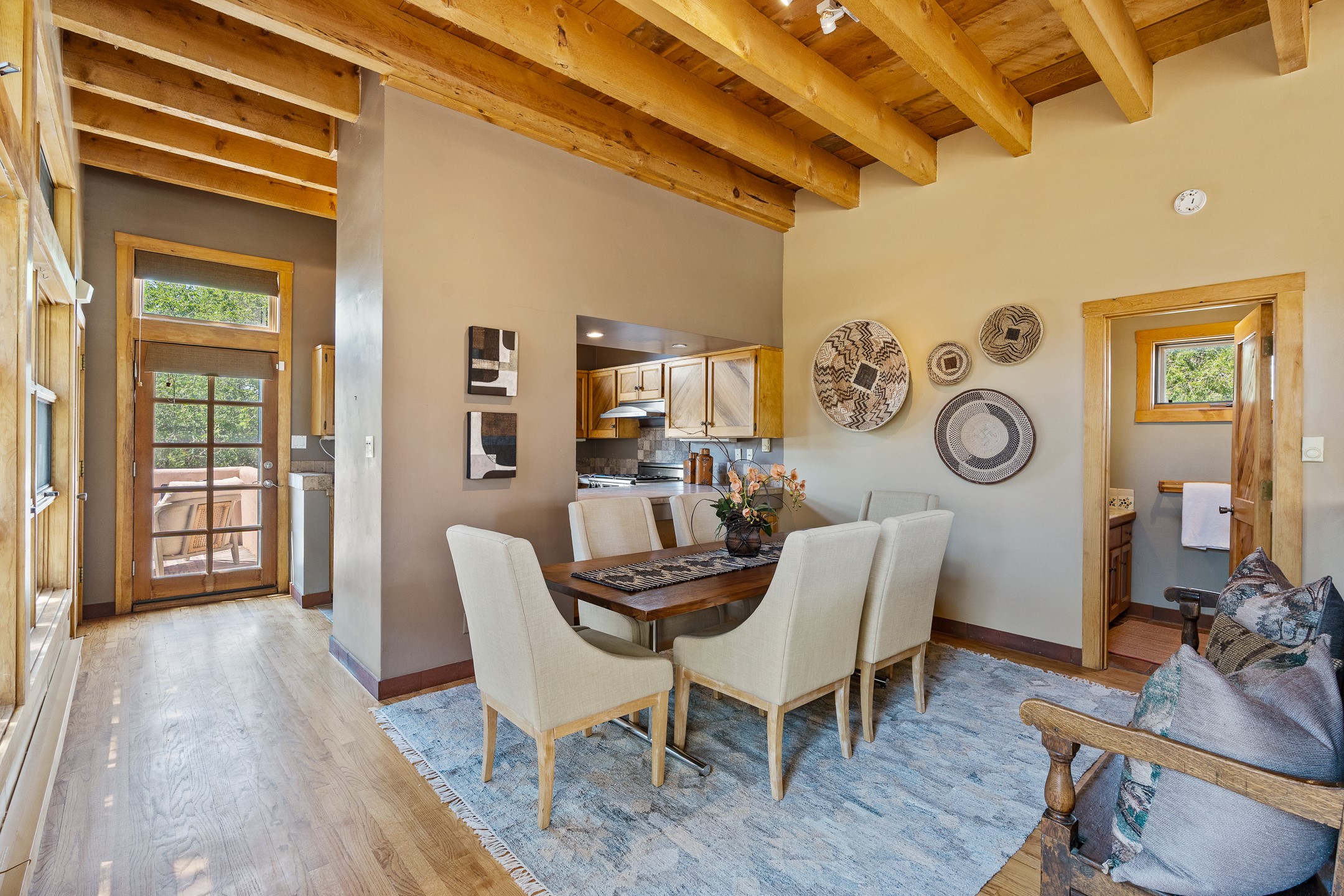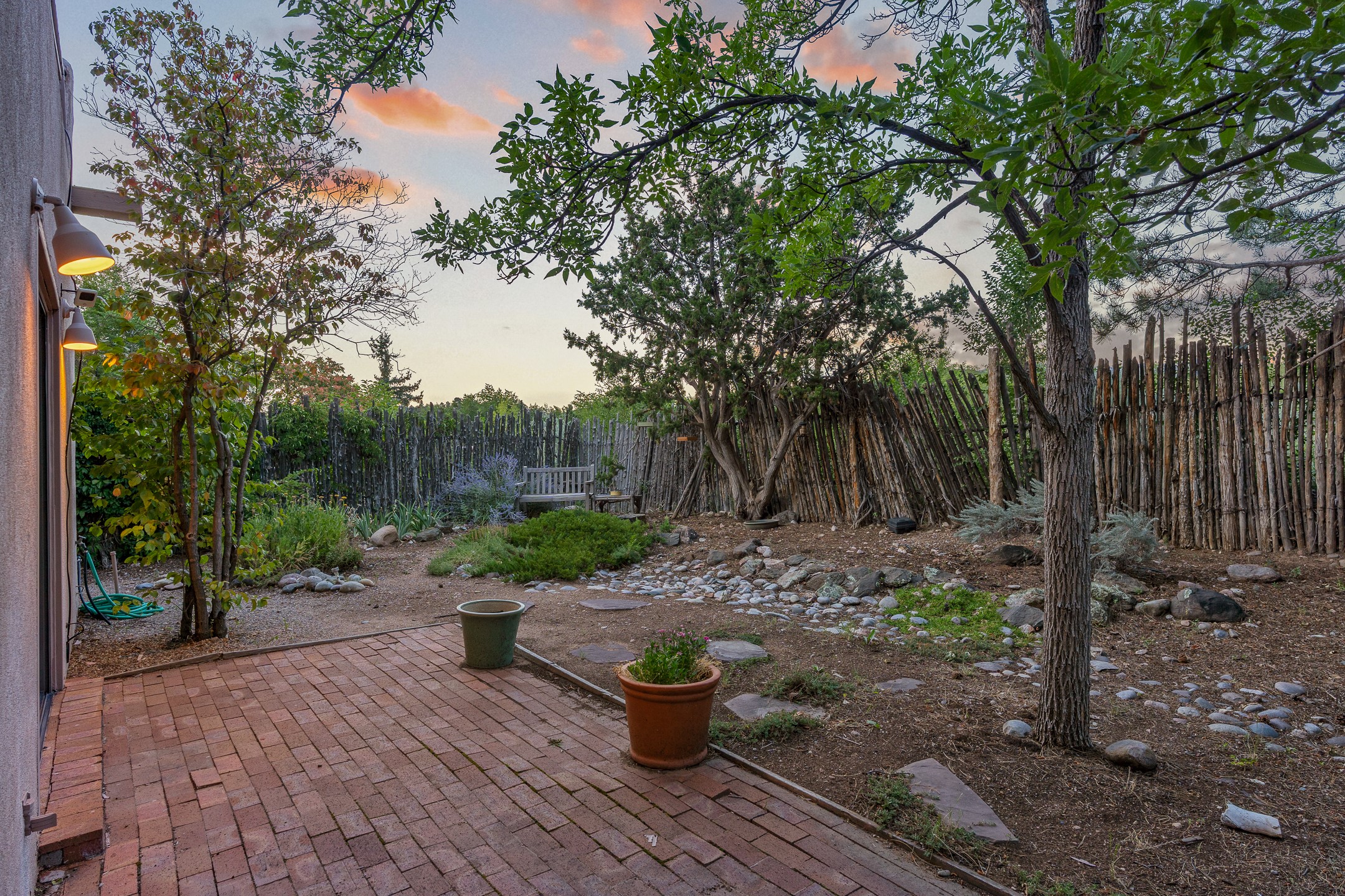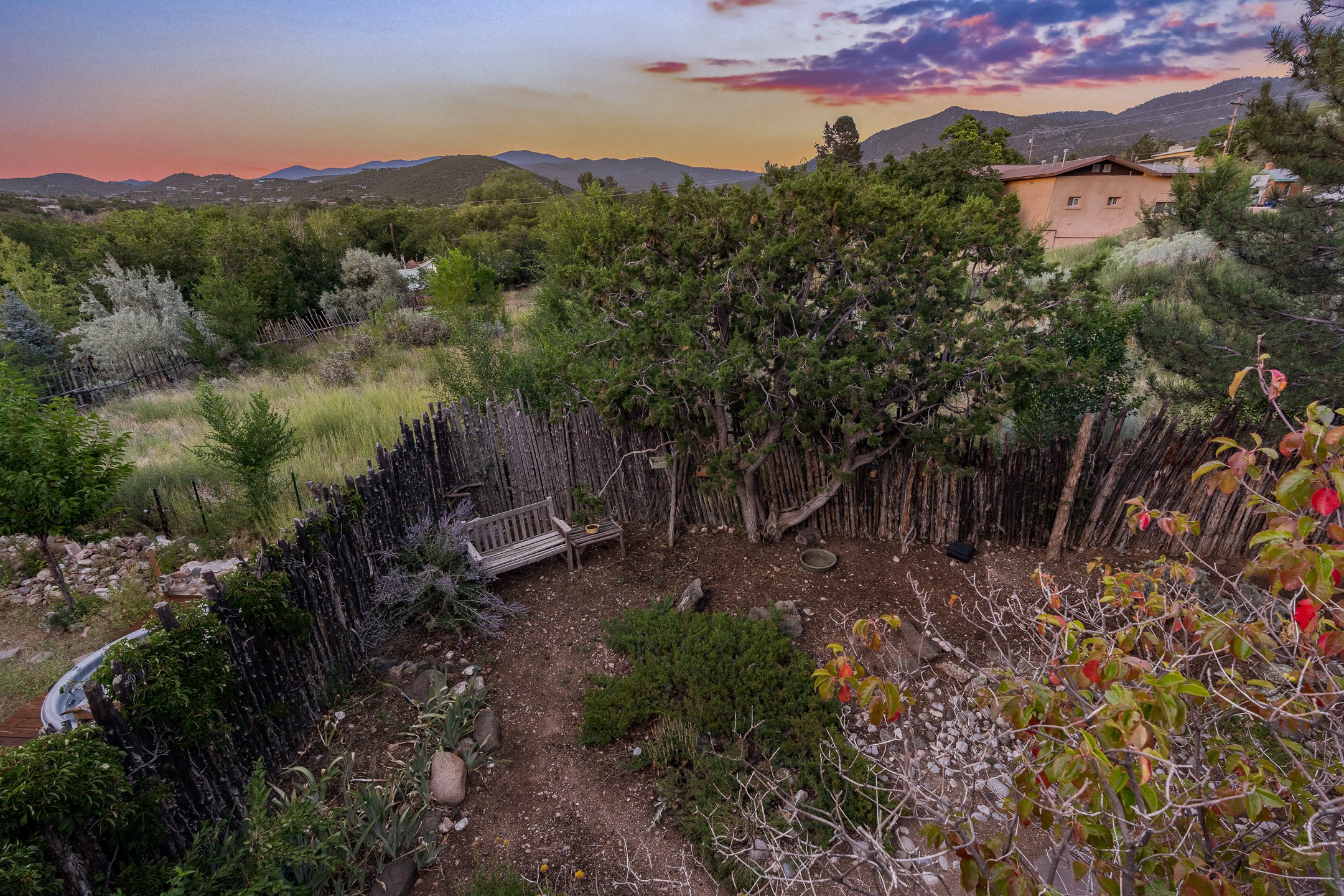 Located down a little lane in Santa Fe's Historic Eastside! With walking easement to Canyon Road, is this beautiful 2145 sq. ft. 3-bedroom, 2 1/2-bath light filled home. Architectural features are floor to ceiling windows of both East and West views featuring Picacho peak, trees and garden views, wood floors, beams, authentic talavera tile, and brick floors. Upstairs, a sunlit living area flows seamlessly into a dining room and kitchen, complete with custom cabinets, stone tile, stainless appliances, stunning wood floors and a half bath. Two decks provide serene views, while a central wood-burning fireplace and cushioned bancos create a lovely environment to entertain. All bedrooms are on the main level, including the primary suite showcasing a wall of windows facing East with private patio access, a sitting area, and tumbled travertine bath. The expansive guest bedroom also with an ensuite bathroom enjoys South facing windows and access to private gardens. While the third bedroom is currently used as a home office also with lots of South facing windows and its own entrance. Rich brick floors enhance the home's warm, enduring character throughout.Thoughtful amenities include a two-car garage with covered brick walkway and gated courtyard entrance. This residence combines artisanal finishes, historic charm, and a prime Eastside location just steps from galleries, restaurants, and cultural landmarks. A rare opportunity to enjoy privacy, quality construction and views. The perfect Santa Fe lifestyle.