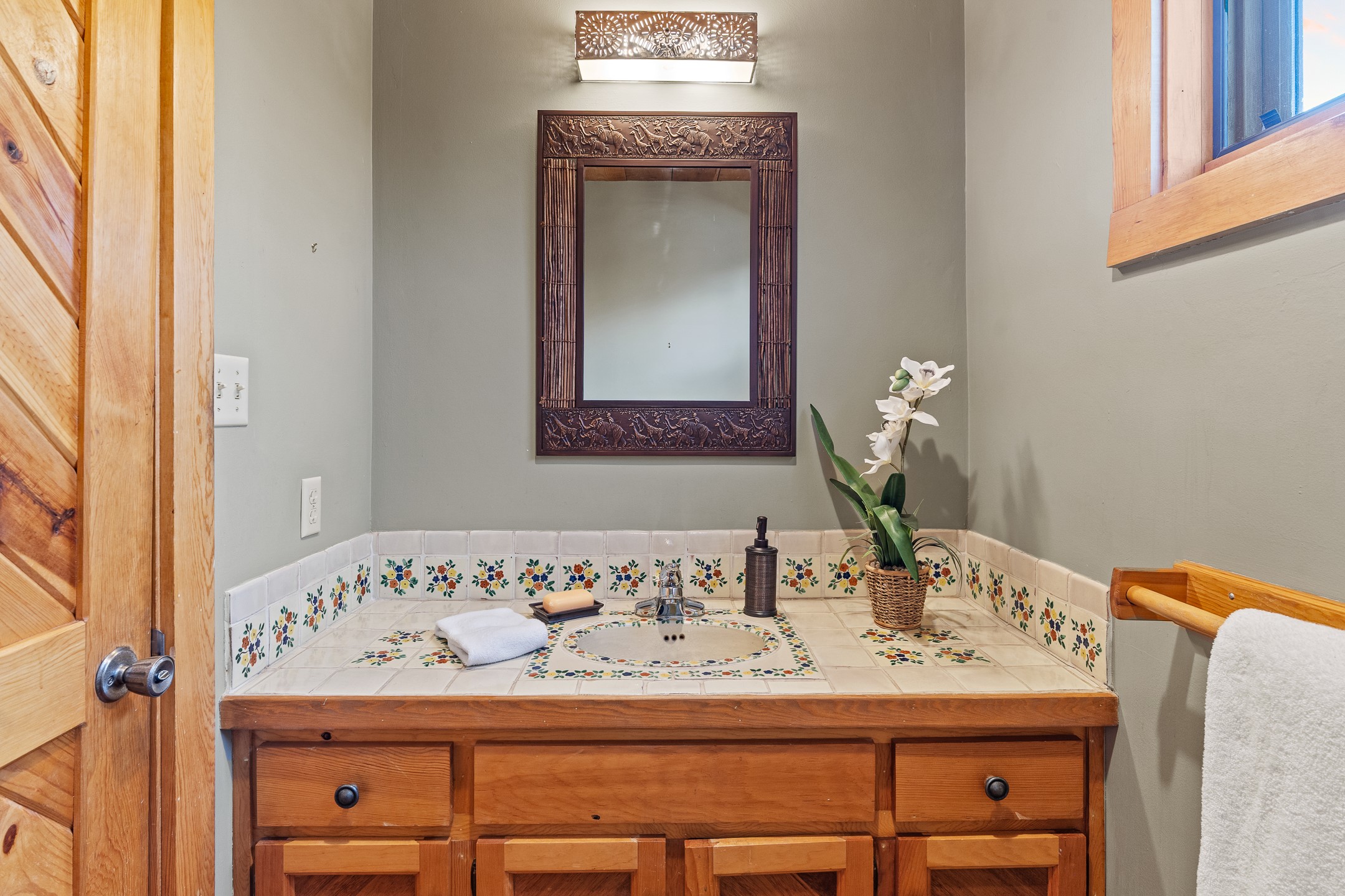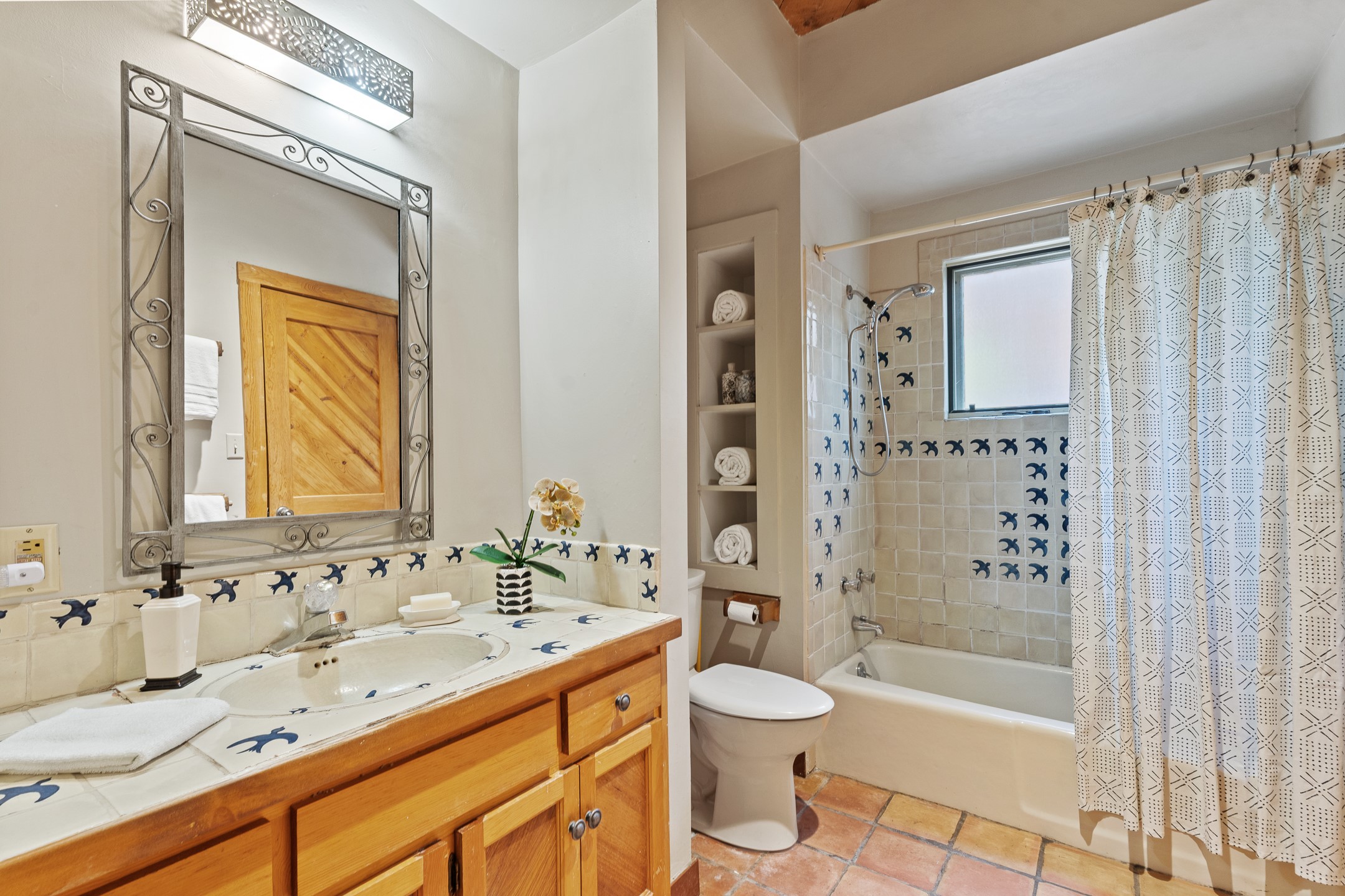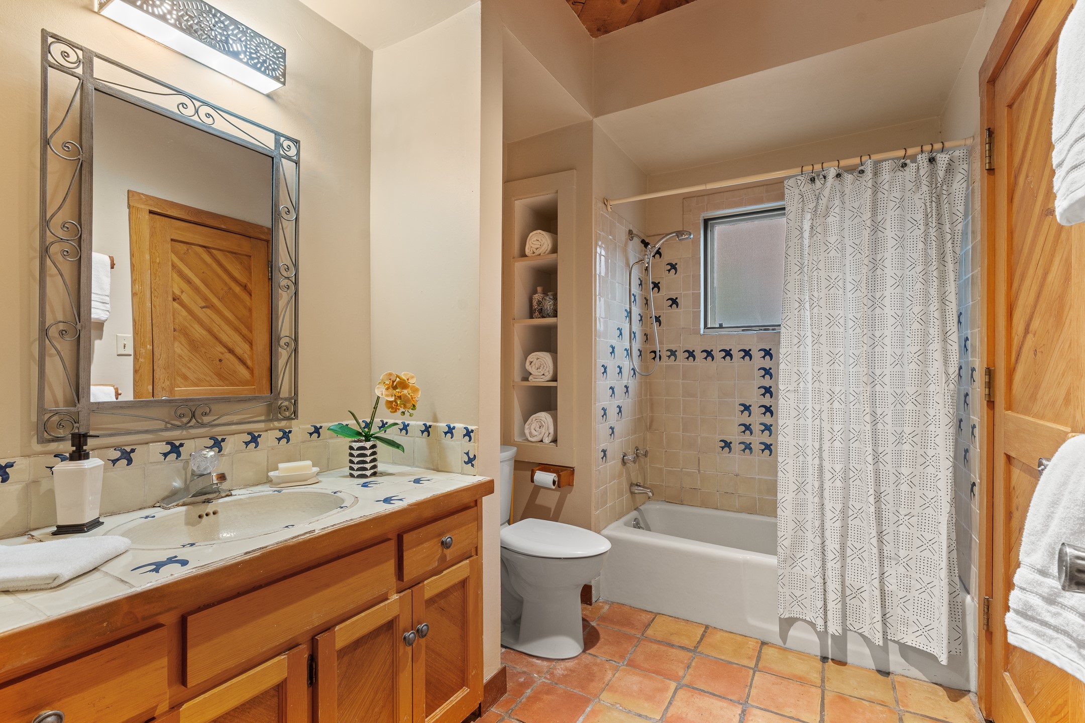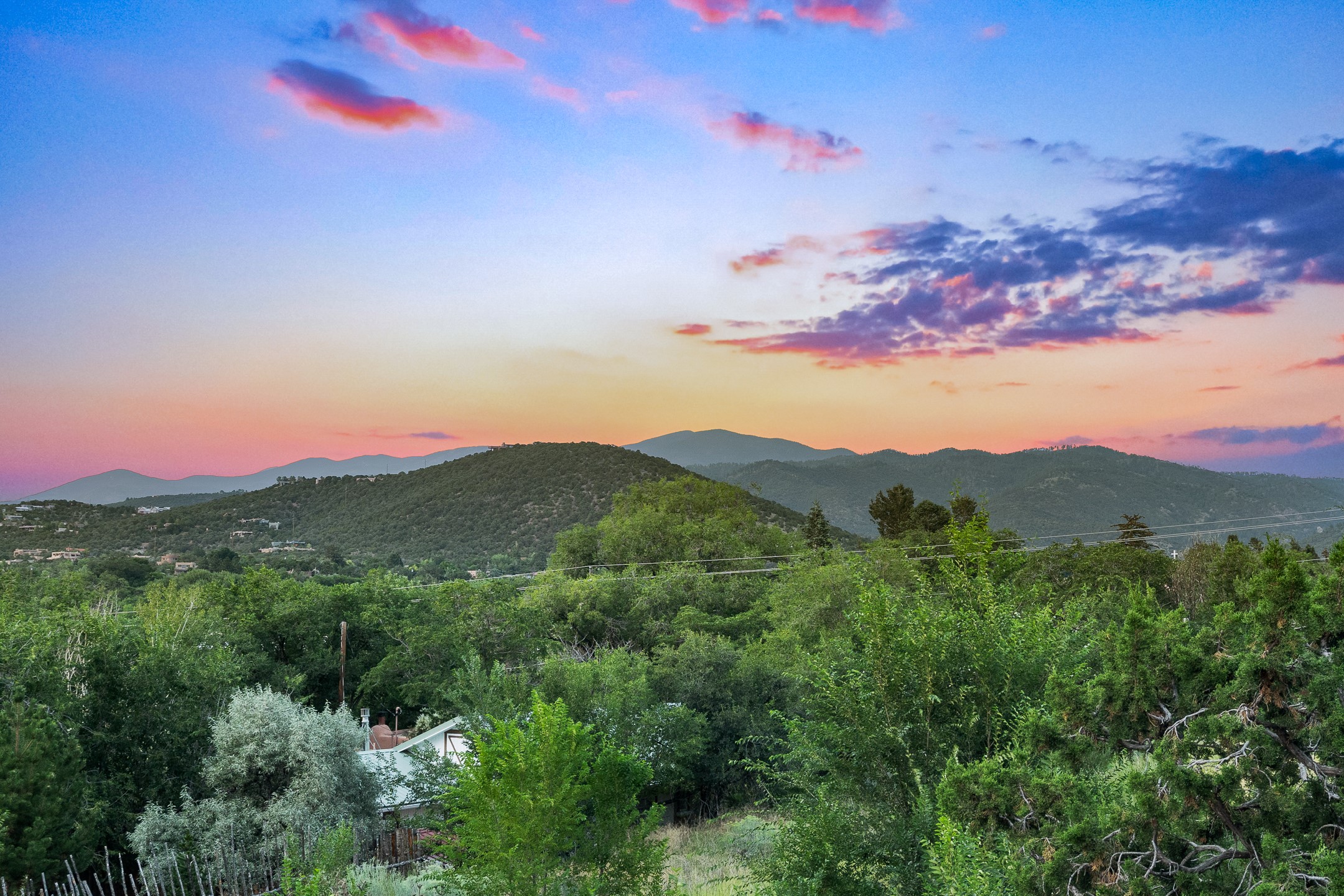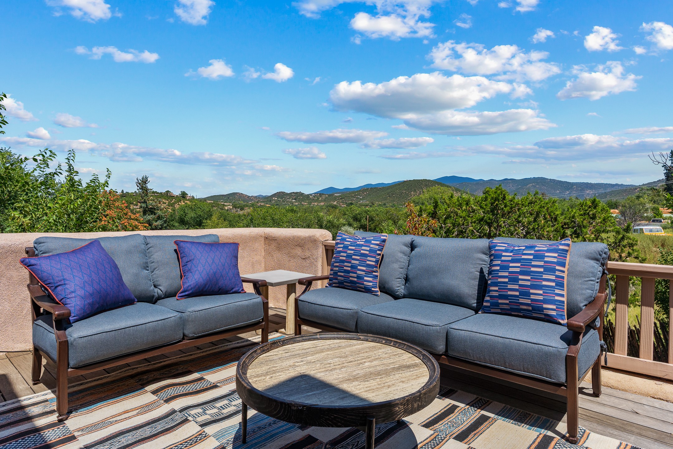 Located down a little lane in Santa Fe's Historic Eastside! With walking easement to Canyon Road, is this beautiful 2145 sq. ft. 3-bedroom, 2 1/2-bath light filled home. Architectural features are floor to ceiling windows of both East and West views featuring Picacho peak, trees and garden views, wood floors, beams, authentic talavera tile, and brick floors. Upstairs, a sunlit living area flows seamlessly into a dining room and kitchen, complete with custom cabinets, stone tile, stainless appliances, stunning wood floors and a half bath. Two decks provide serene views, while a central wood-burning fireplace and cushioned bancos create a lovely environment to entertain. All bedrooms are on the main level, including the primary suite showcasing a wall of windows facing East with private patio access, a sitting area, and tumbled travertine bath. The expansive guest bedroom also with an ensuite bathroom enjoys South facing windows and access to private gardens. While the third bedroom is currently used as a home office also with lots of South facing windows and its own entrance. Rich brick floors enhance the home's warm, enduring character throughout.Thoughtful amenities include a two-car garage with covered brick walkway and gated courtyard entrance. This residence combines artisanal finishes, historic charm, and a prime Eastside location just steps from galleries, restaurants, and cultural landmarks. A rare opportunity to enjoy privacy, quality construction and views. The perfect Santa Fe lifestyle.