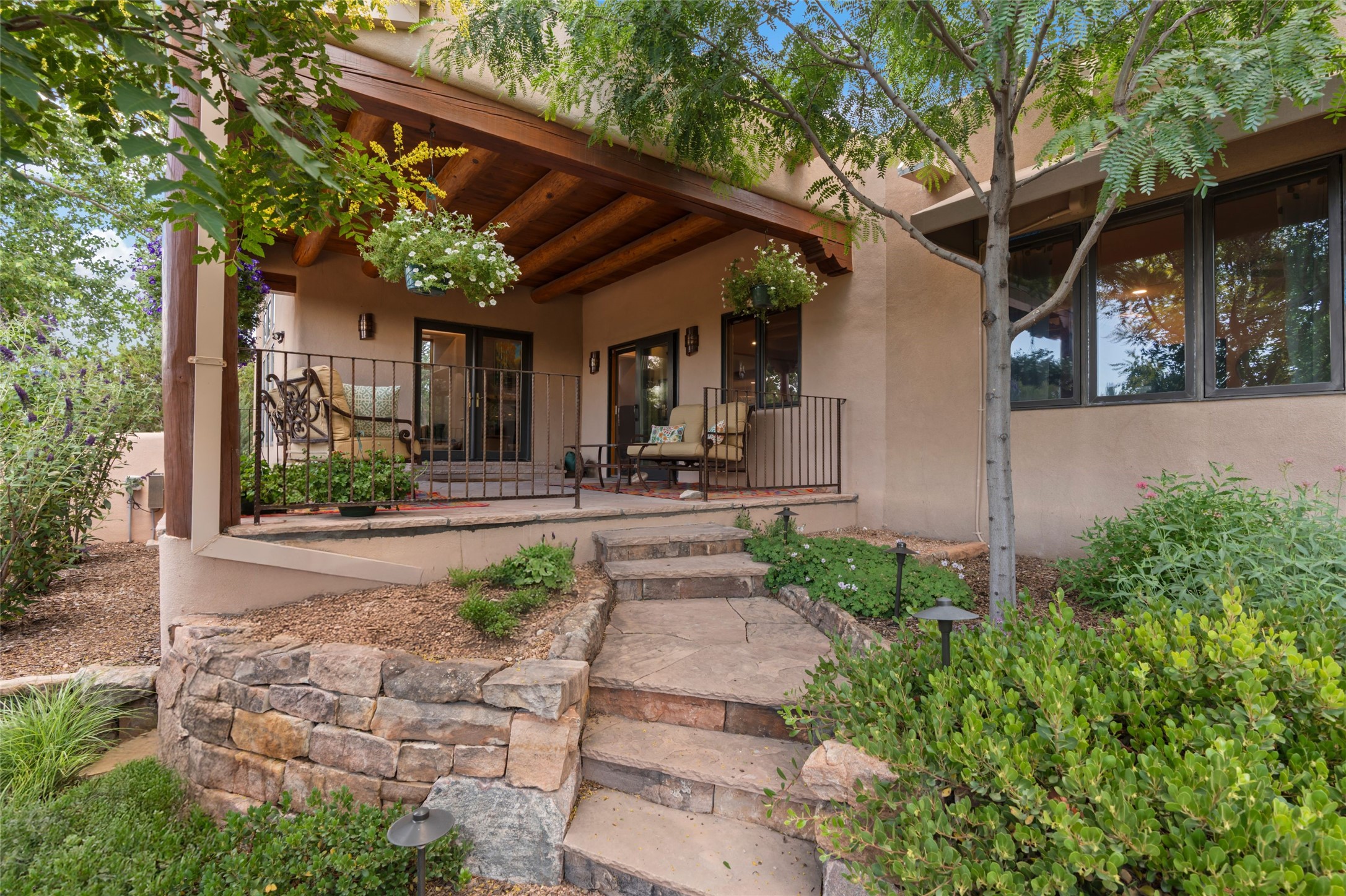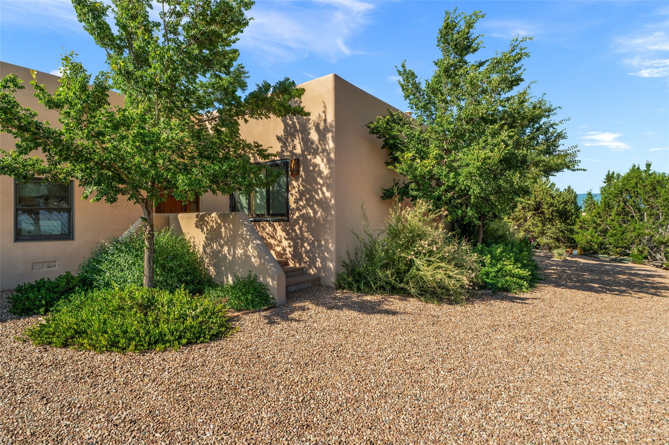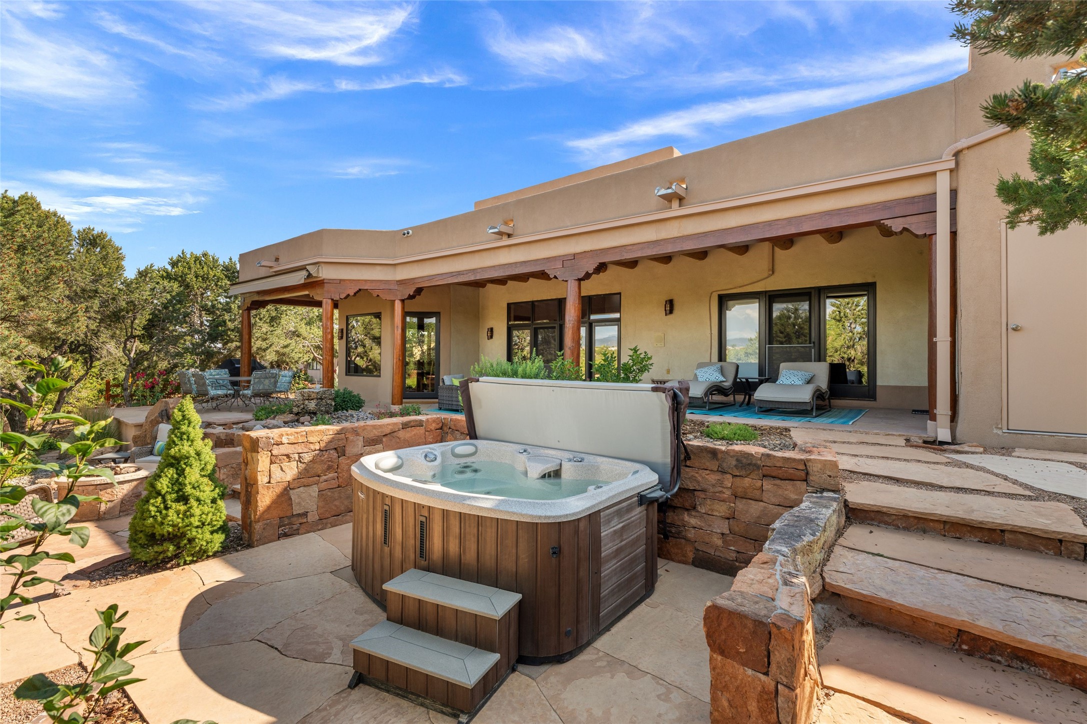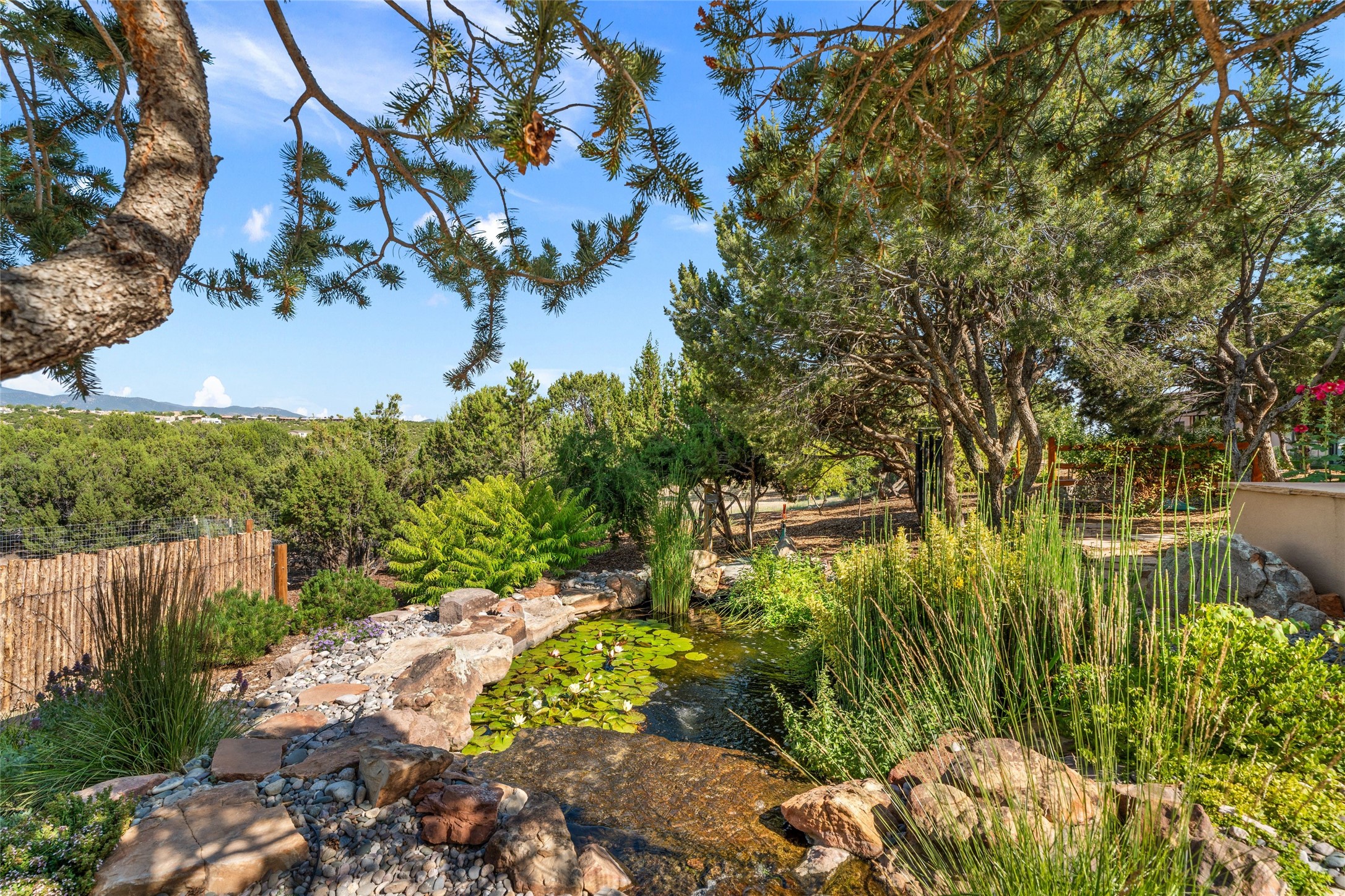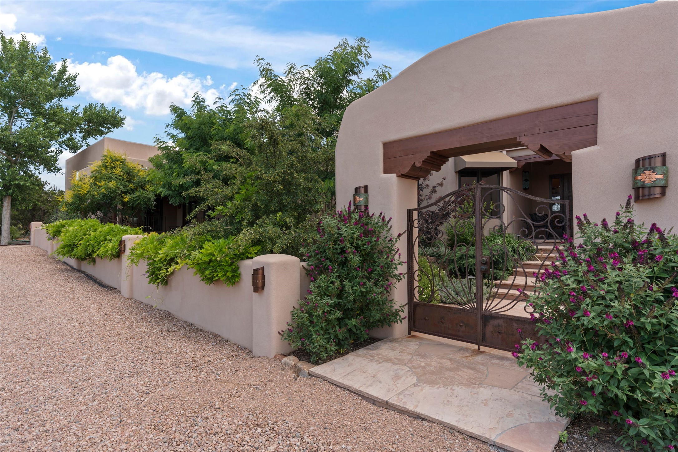 A true Santa Fe masterpiece, this luxurious estate seamlessly blends art, architecture, and nature on a serene 2.46-acre lot with breathtaking views of the Sangre de Cristo mountains. Designed for comfort, sustainability, and inspired living, this extraordinary property offers every amenity for the discerning homeowner.Notable features include double and single-car garages plus a large RV garage, ideal for car enthusiasts, adventure seekers or workshop. The 62-panel solar system and five 2,500-gallon interconnected buried cisterns support an eco-conscious lifestyle, while the extensive drip irrigation system nourishes a lush 1,000 sq. ft. irrigated vegetable garden, orchard (peach, apple, and plum trees), a berry patch bursting with blueberries, blackberries, and raspberries.Enjoy miles of hiking, biking, and horseback riding trails just across the street, or relax in your private oasis with green space bordering the eastern edge of the property, a tranquil water feature with Koi pond, and multiple covered outdoor entertaining spaces, including a plumbed gas fire pit and a fully insulated hot tub.Inside, comfort and luxury abound with radiant floor heating throughout, mini-split systems for cooling, and a security system with cameras. The heart of the home is the spectacular Great Hall, anchored by a gas fireplace, and offering soaring ceilings and an atmosphere of timeless elegance and opening to outdoor spaces. Additional highlights include a top-of-the-line chef's kitchen, butler's pantry, and a quilting/art studio.The estate also includes a charming 2-bedroom guest house and a spacious 2-bedroom studio, also with Sangre de Cristo mountains views. Perfect for guests, extended family, or creative workspaces.There is ample parking for guests and extra vehicles, this estate is ideal for entertaining or enjoying peaceful privacy and solitude. A rare opportunity to own a truly magical home that celebrates the best of indoor-outdoor living in Santa Fe.