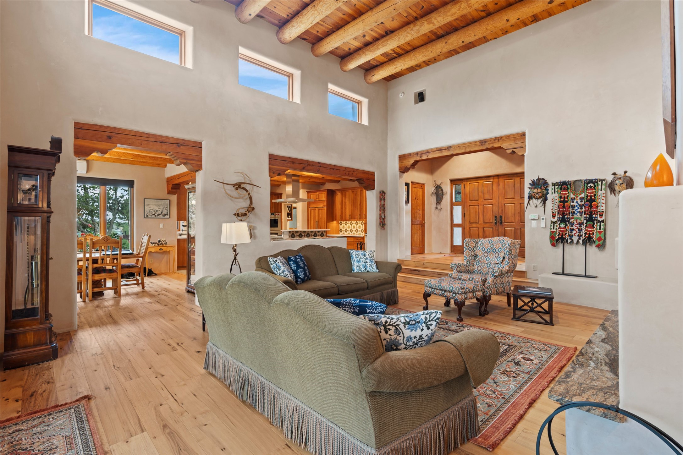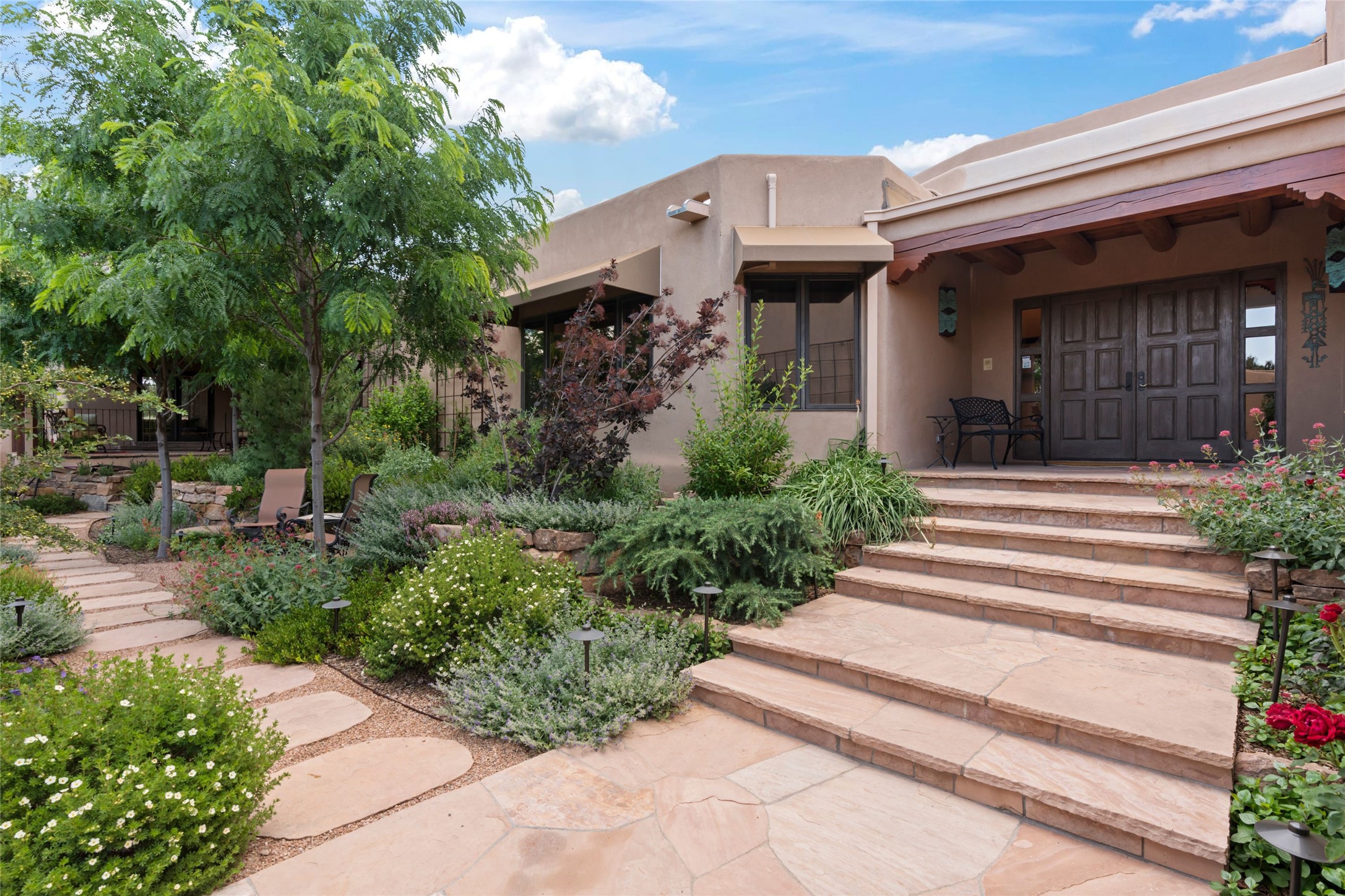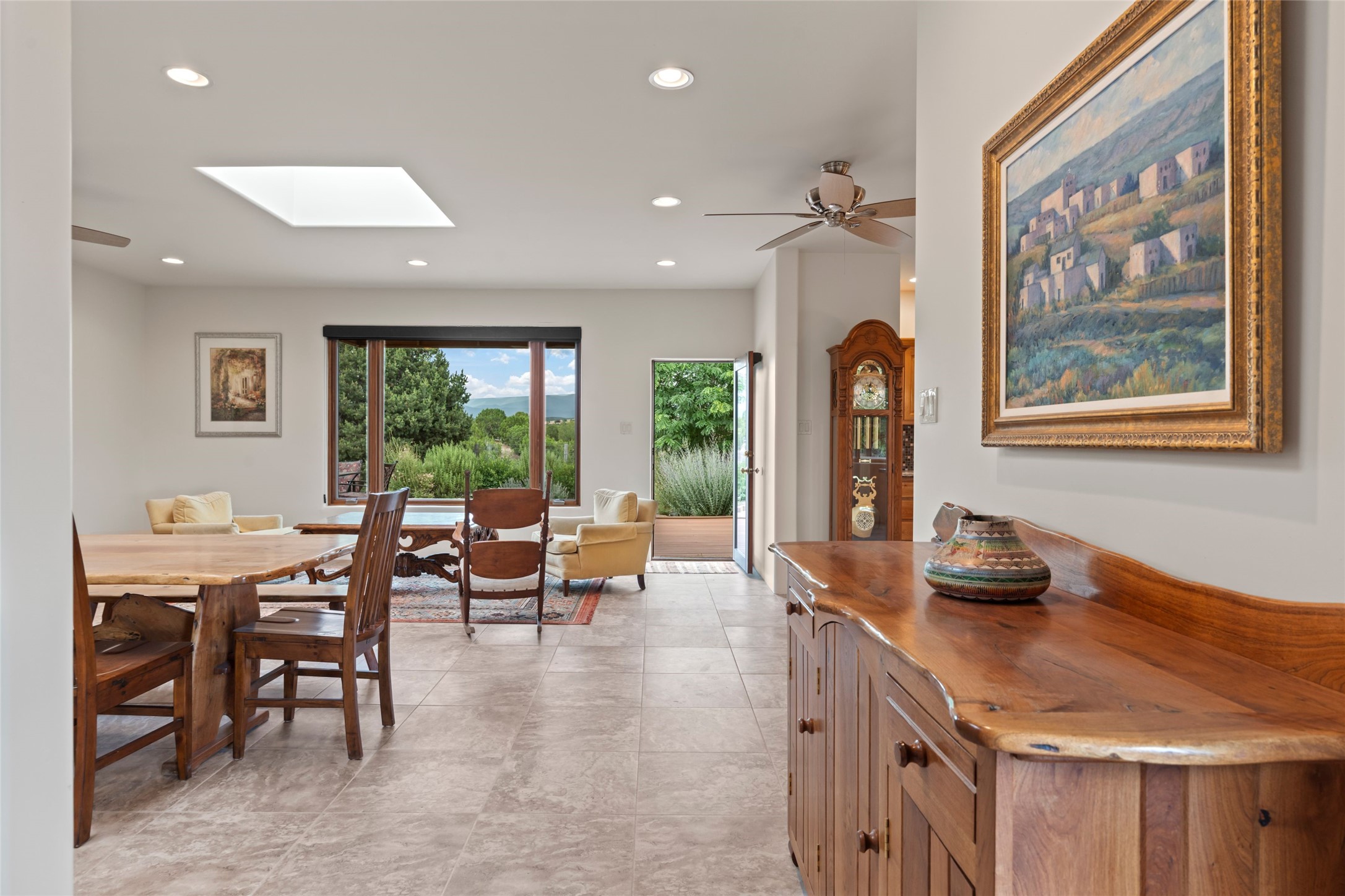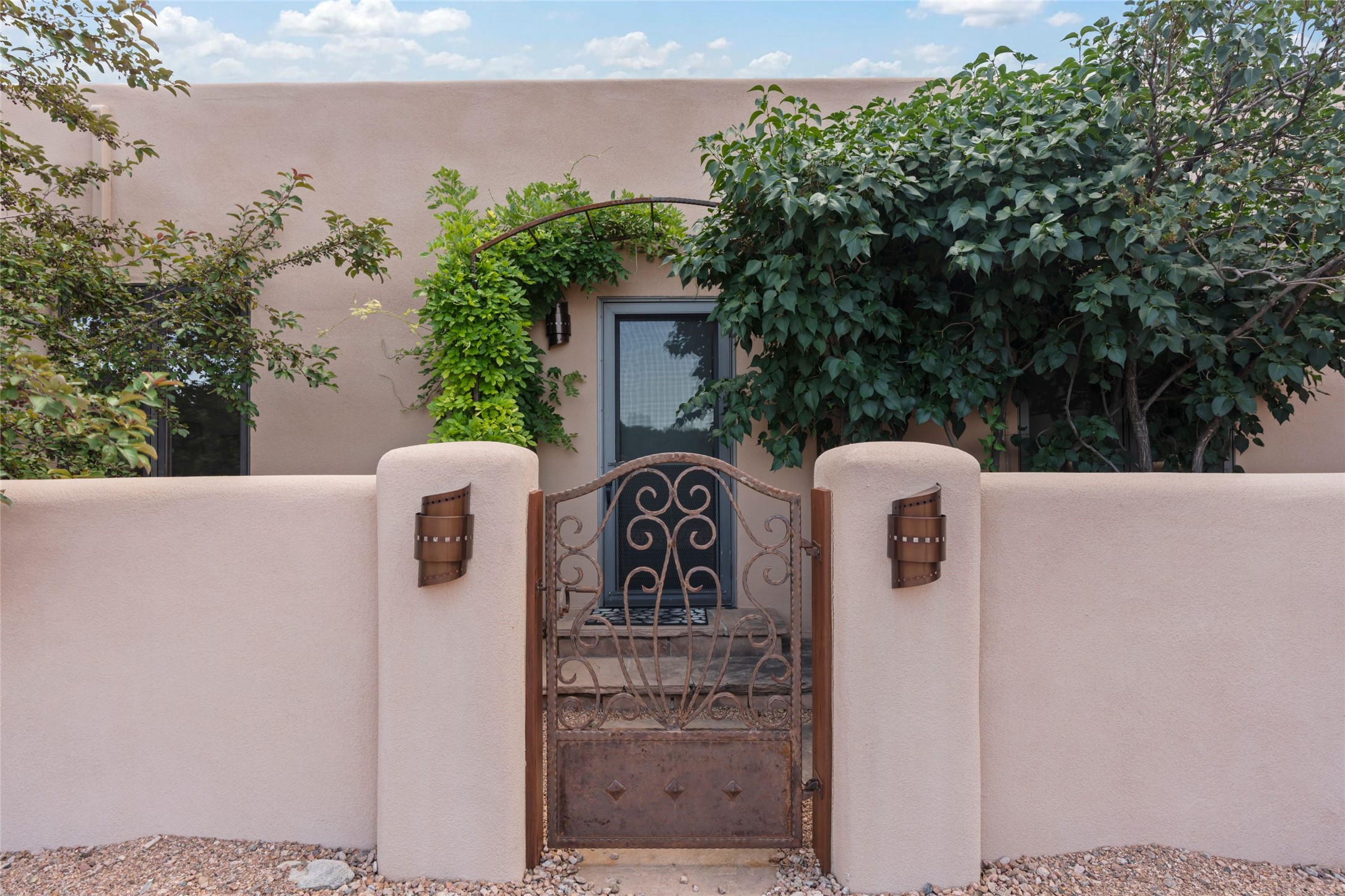 A true Santa Fe masterpiece, this luxurious estate seamlessly blends art, architecture, and nature on a serene 2.46-acre lot with breathtaking views of the Sangre de Cristo mountains. Designed for comfort, sustainability, and inspired living, this extraordinary property offers every amenity for the discerning homeowner.Notable features include double and single-car garages plus a large RV garage, ideal for car enthusiasts, adventure seekers or workshop. The 62-panel solar system and five 2,500-gallon interconnected buried cisterns support an eco-conscious lifestyle, while the extensive drip irrigation system nourishes a lush 1,000 sq. ft. irrigated vegetable garden, orchard (peach, apple, and plum trees), a berry patch bursting with blueberries, blackberries, and raspberries.Enjoy miles of hiking, biking, and horseback riding trails just across the street, or relax in your private oasis with green space bordering the eastern edge of the property, a tranquil water feature with Koi pond, and multiple covered outdoor entertaining spaces, including a plumbed gas fire pit and a fully insulated hot tub.Inside, comfort and luxury abound with radiant floor heating throughout, mini-split systems for cooling, and a security system with cameras. The heart of the home is the spectacular Great Hall, anchored by a gas fireplace, and offering soaring ceilings and an atmosphere of timeless elegance and opening to outdoor spaces. Additional highlights include a top-of-the-line chef's kitchen, butler's pantry, and a quilting/art studio.The estate also includes a charming 2-bedroom guest house and a spacious 2-bedroom studio, also with Sangre de Cristo mountains views. Perfect for guests, extended family, or creative workspaces.There is ample parking for guests and extra vehicles, this estate is ideal for entertaining or enjoying peaceful privacy and solitude. A rare opportunity to own a truly magical home that celebrates the best of indoor-outdoor living in Santa Fe.