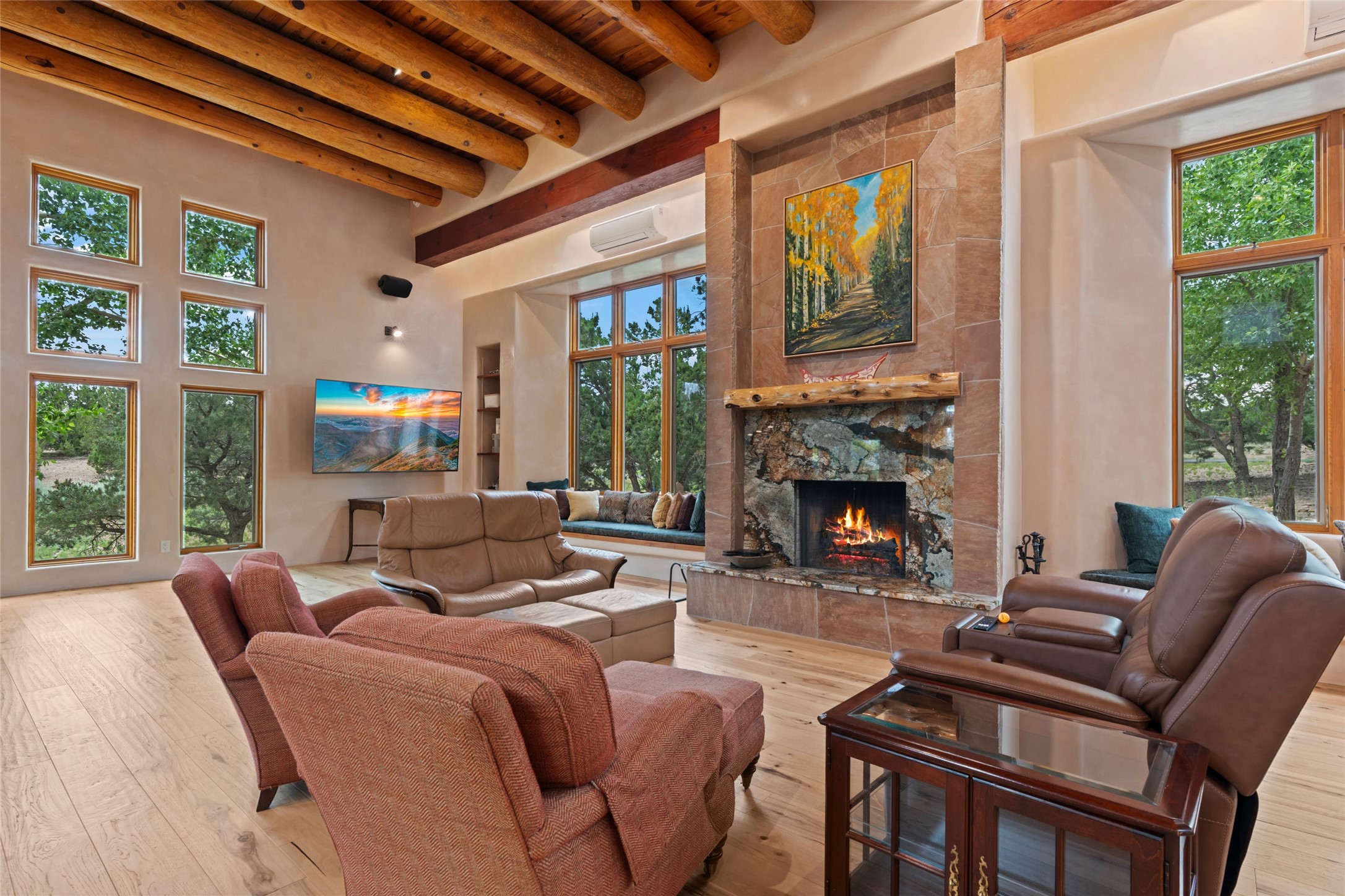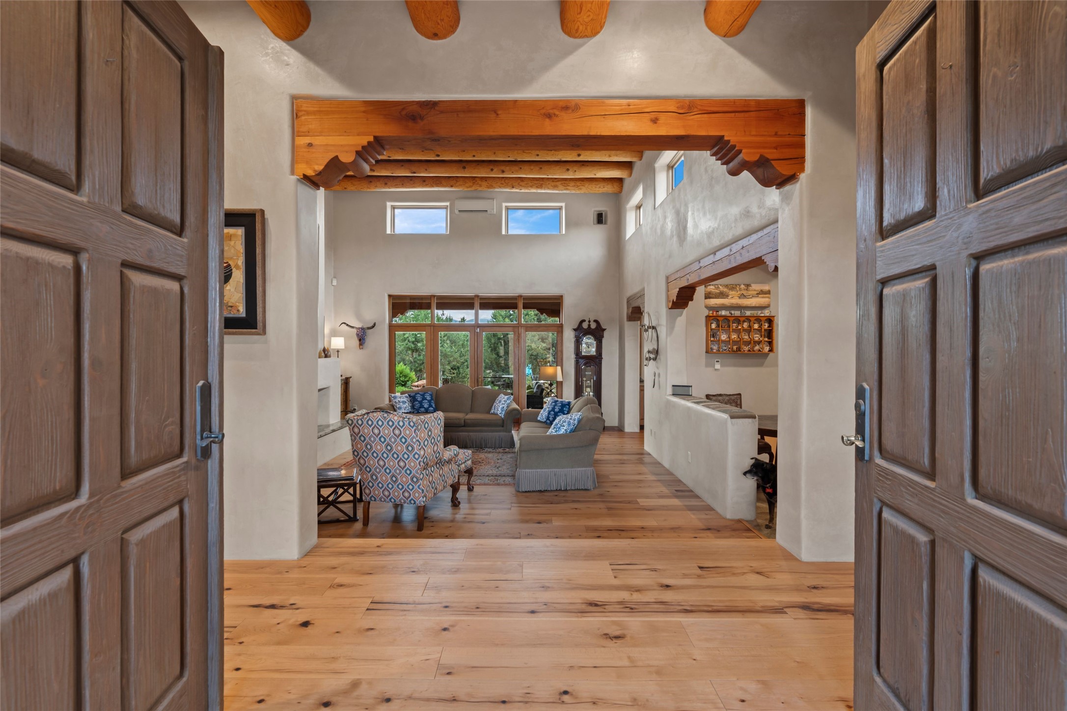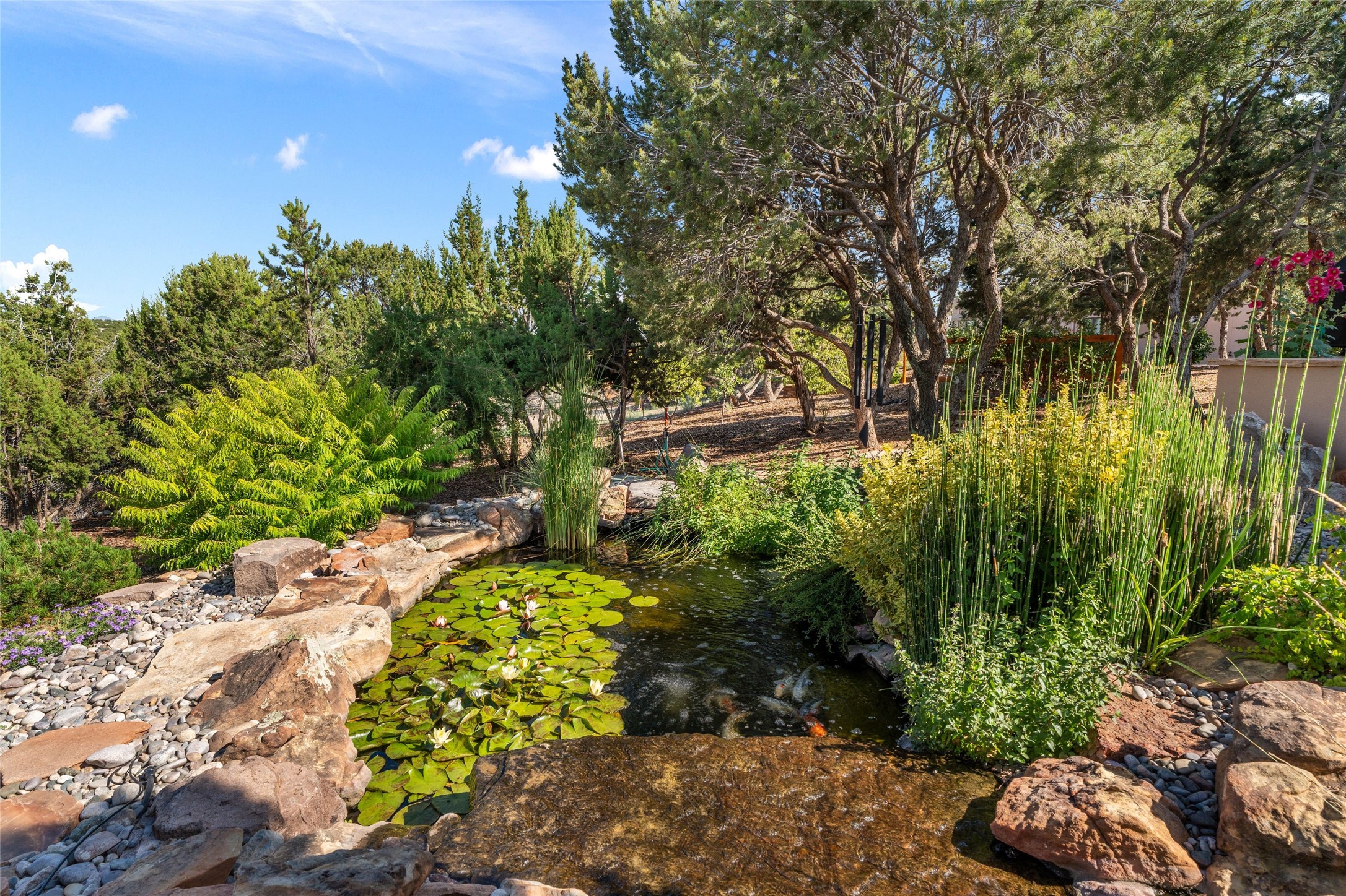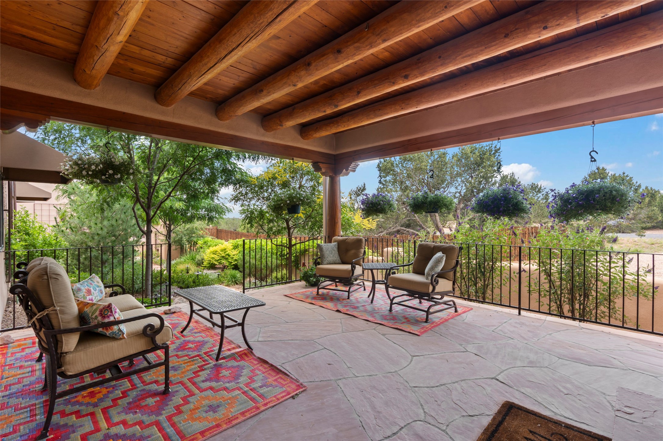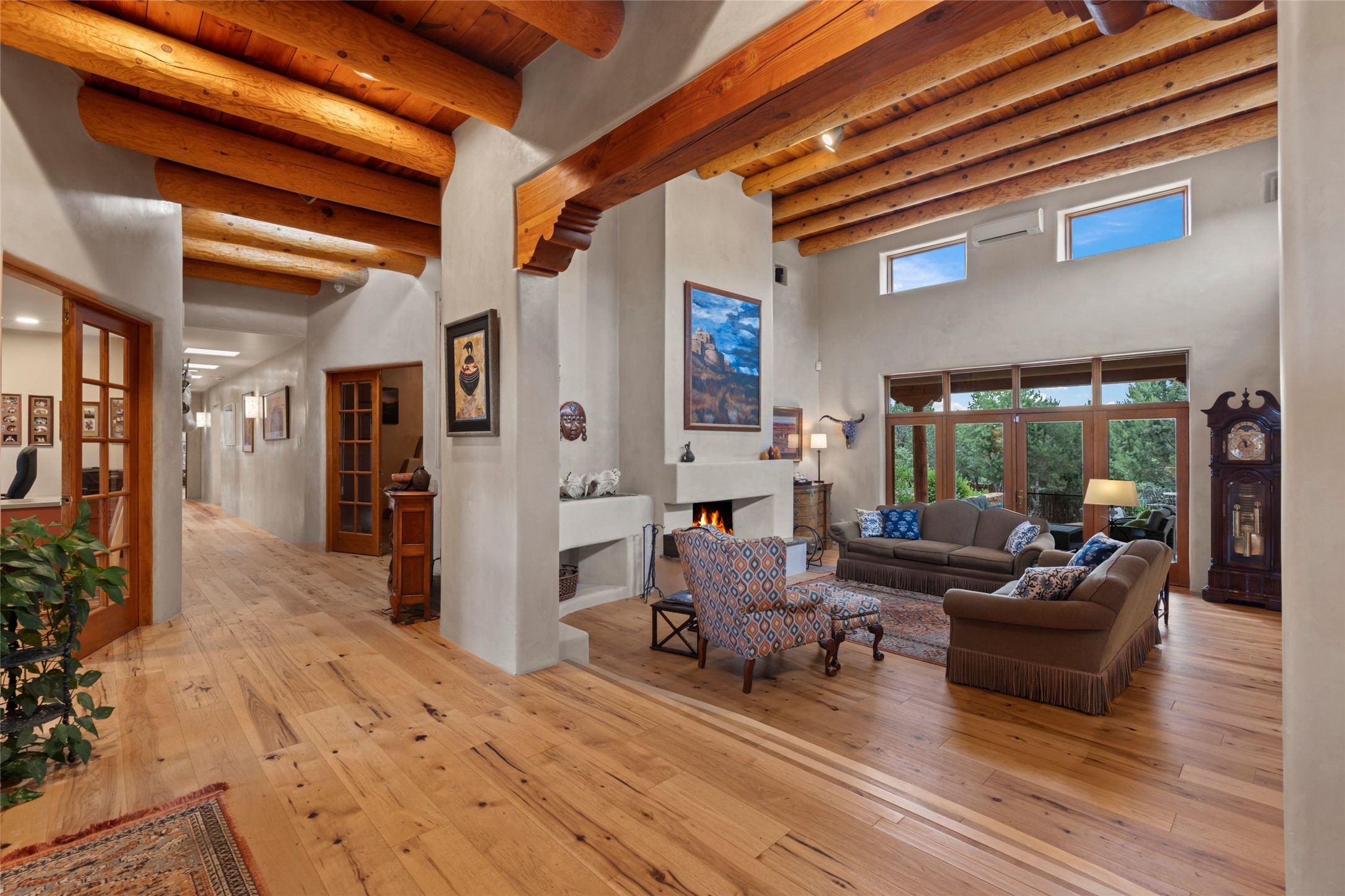 A true Santa Fe masterpiece, this luxurious estate seamlessly blends art, architecture, and nature on a serene 2.46-acre lot with breathtaking views of the Sangre de Cristo mountains. Designed for comfort, sustainability, and inspired living, this extraordinary property offers every amenity for the discerning homeowner.Notable features include double and single-car garages plus a large RV garage, ideal for car enthusiasts, adventure seekers or workshop. The 62-panel solar system and five 2,500-gallon interconnected buried cisterns support an eco-conscious lifestyle, while the extensive drip irrigation system nourishes a lush 1,000 sq. ft. irrigated vegetable garden, orchard (peach, apple, and plum trees), a berry patch bursting with blueberries, blackberries, and raspberries.Enjoy miles of hiking, biking, and horseback riding trails just across the street, or relax in your private oasis with green space bordering the eastern edge of the property, a tranquil water feature with Koi pond, and multiple covered outdoor entertaining spaces, including a plumbed gas fire pit and a fully insulated hot tub.Inside, comfort and luxury abound with radiant floor heating throughout, mini-split systems for cooling, and a security system with cameras. The heart of the home is the spectacular Great Hall, anchored by a gas fireplace, and offering soaring ceilings and an atmosphere of timeless elegance and opening to outdoor spaces. Additional highlights include a top-of-the-line chef's kitchen, butler's pantry, and a quilting/art studio.The estate also includes a charming 2-bedroom guest house and a spacious 2-bedroom studio, also with Sangre de Cristo mountains views. Perfect for guests, extended family, or creative workspaces.There is ample parking for guests and extra vehicles, this estate is ideal for entertaining or enjoying peaceful privacy and solitude. A rare opportunity to own a truly magical home that celebrates the best of indoor-outdoor living in Santa Fe.