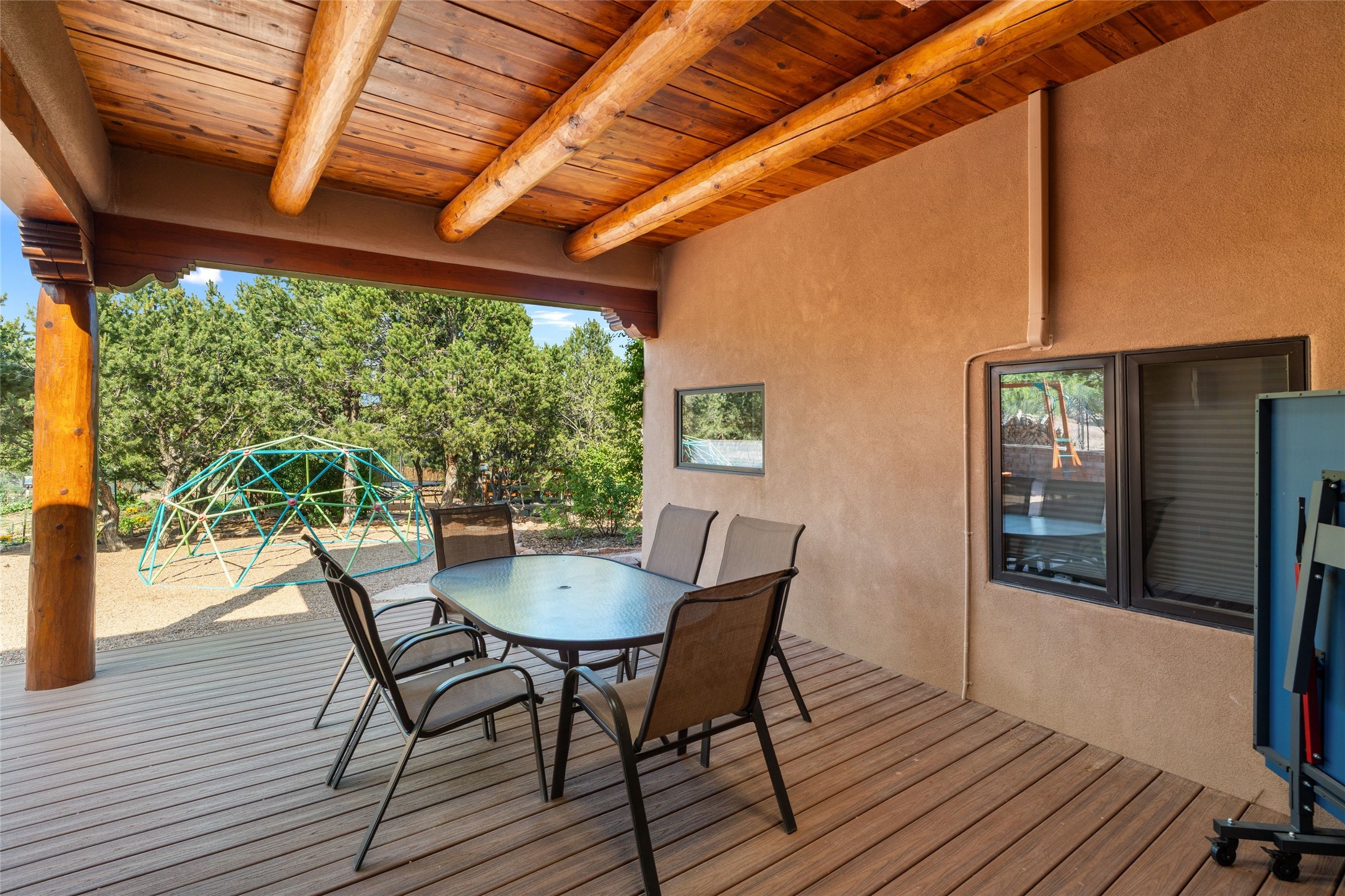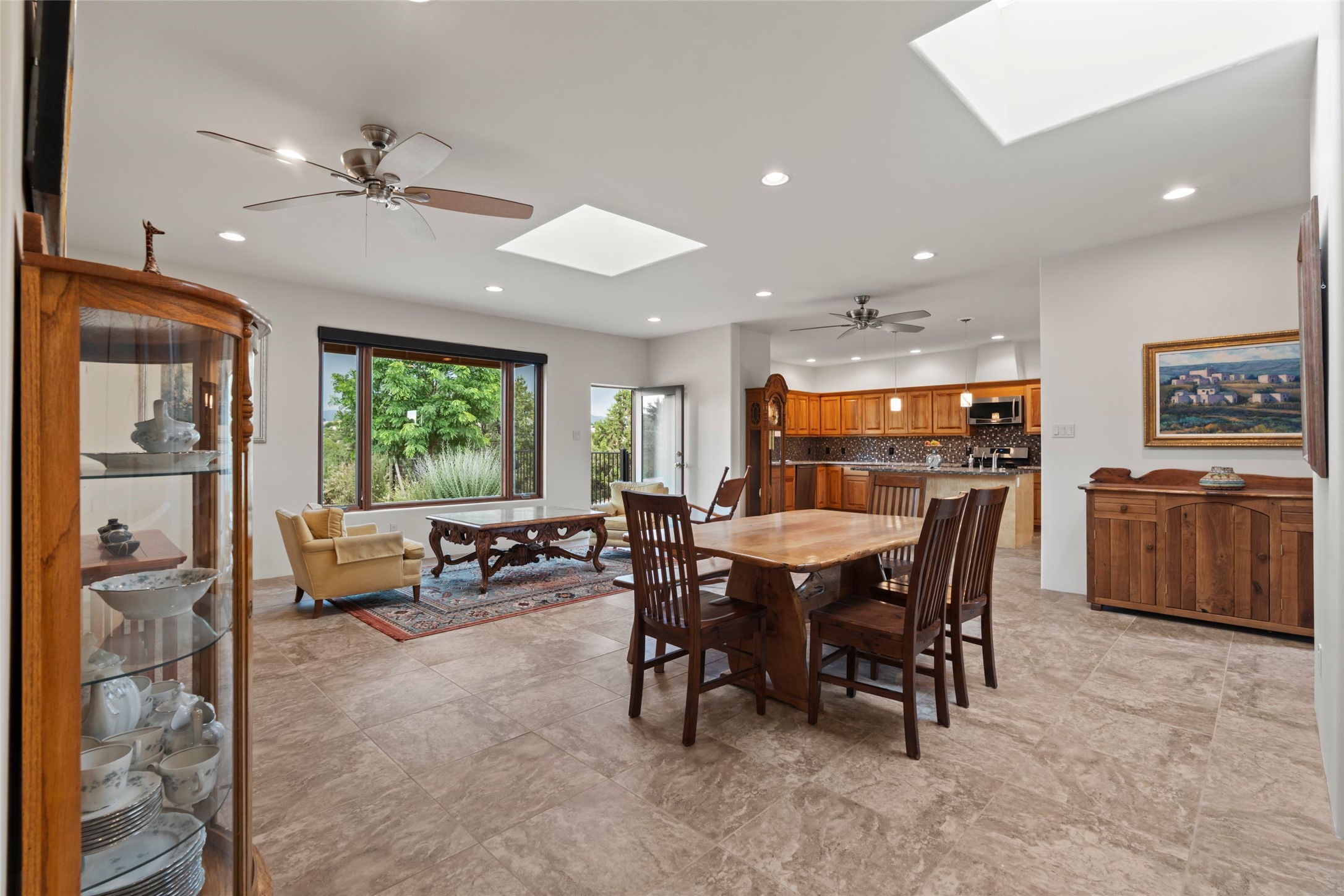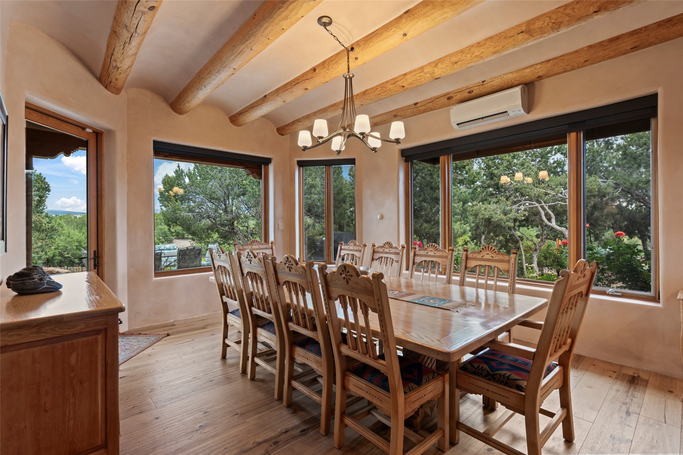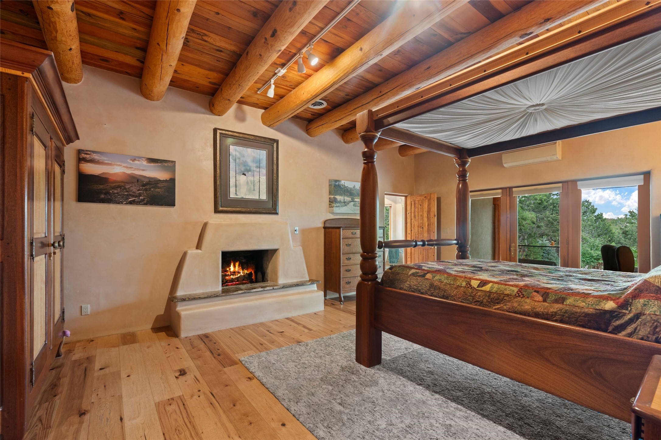 A true Santa Fe masterpiece, this luxurious estate seamlessly blends art, architecture, and nature on a serene 2.46-acre lot with breathtaking views of the Sangre de Cristo mountains. Designed for comfort, sustainability, and inspired living, this extraordinary property offers every amenity for the discerning homeowner.Notable features include double and single-car garages plus a large RV garage, ideal for car enthusiasts, adventure seekers or workshop. The 62-panel solar system and five 2,500-gallon interconnected buried cisterns support an eco-conscious lifestyle, while the extensive drip irrigation system nourishes a lush 1,000 sq. ft. irrigated vegetable garden, orchard (peach, apple, and plum trees), a berry patch bursting with blueberries, blackberries, and raspberries.Enjoy miles of hiking, biking, and horseback riding trails just across the street, or relax in your private oasis with green space bordering the eastern edge of the property, a tranquil water feature with Koi pond, and multiple covered outdoor entertaining spaces, including a plumbed gas fire pit and a fully insulated hot tub.Inside, comfort and luxury abound with radiant floor heating throughout, mini-split systems for cooling, and a security system with cameras. The heart of the home is the spectacular Great Hall, anchored by a gas fireplace, and offering soaring ceilings and an atmosphere of timeless elegance and opening to outdoor spaces. Additional highlights include a top-of-the-line chef's kitchen, butler's pantry, and a quilting/art studio.The estate also includes a charming 2-bedroom guest house and a spacious 2-bedroom studio, also with Sangre de Cristo mountains views. Perfect for guests, extended family, or creative workspaces.There is ample parking for guests and extra vehicles, this estate is ideal for entertaining or enjoying peaceful privacy and solitude. A rare opportunity to own a truly magical home that celebrates the best of indoor-outdoor living in Santa Fe.