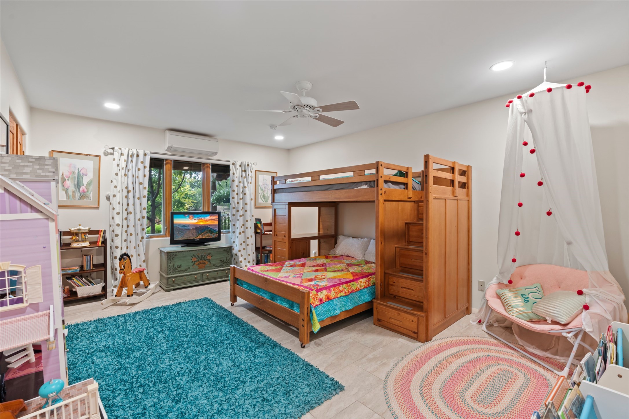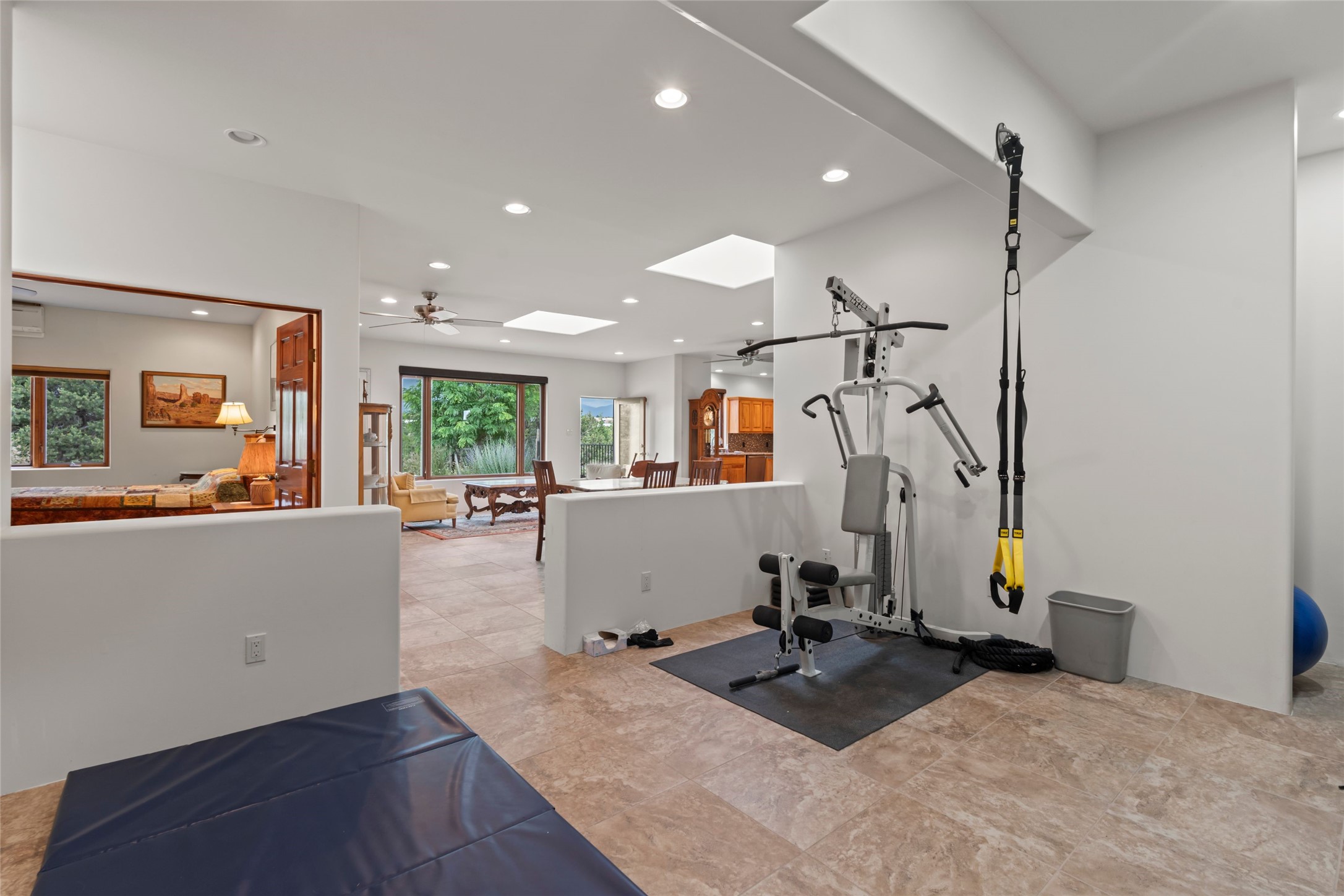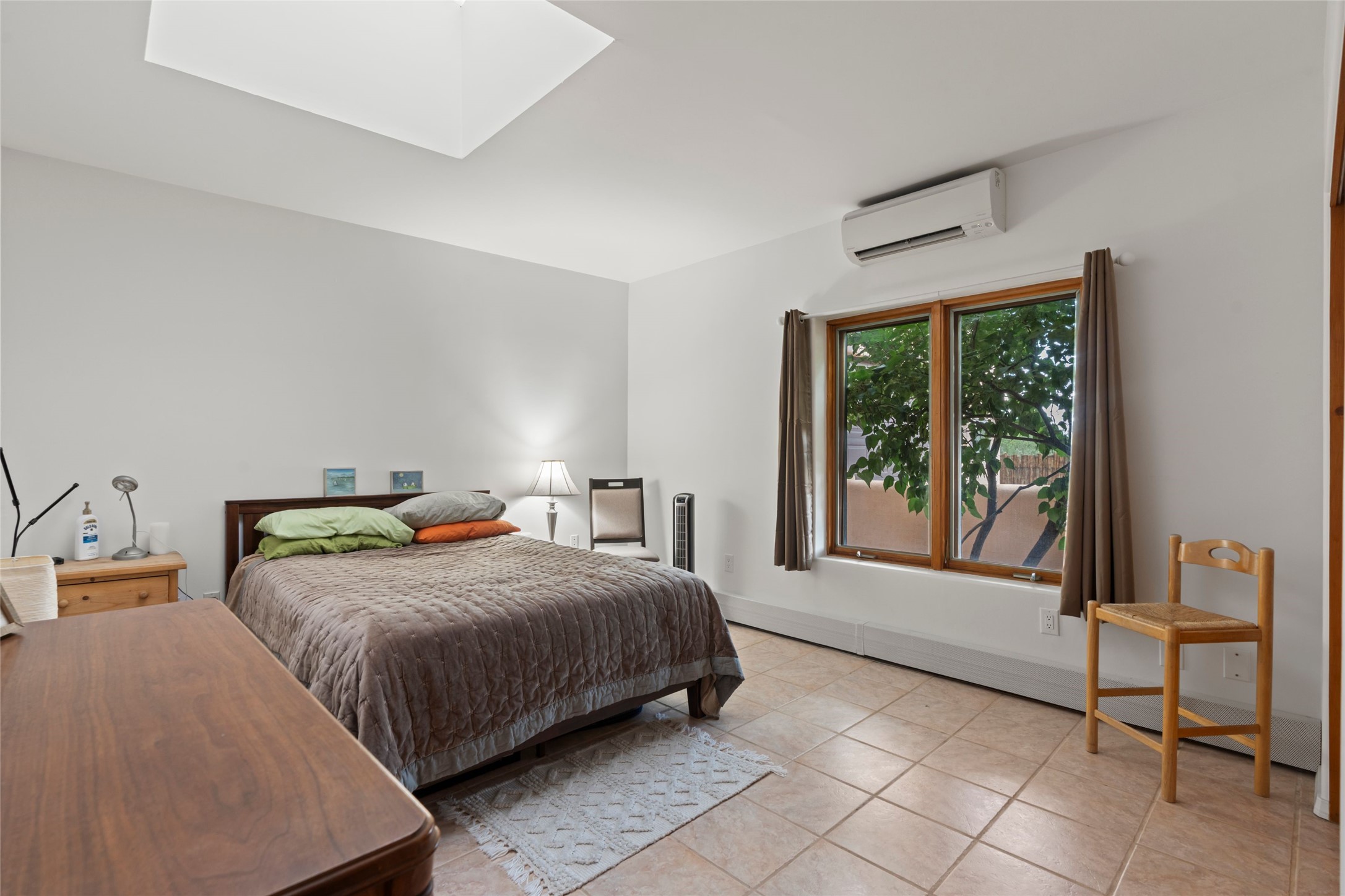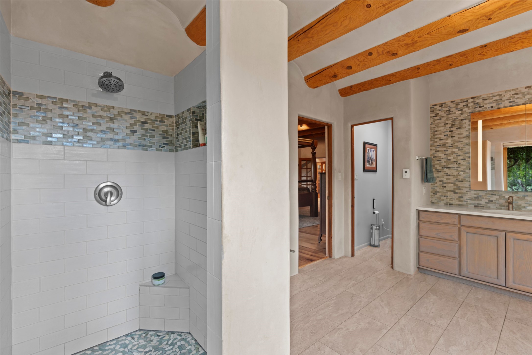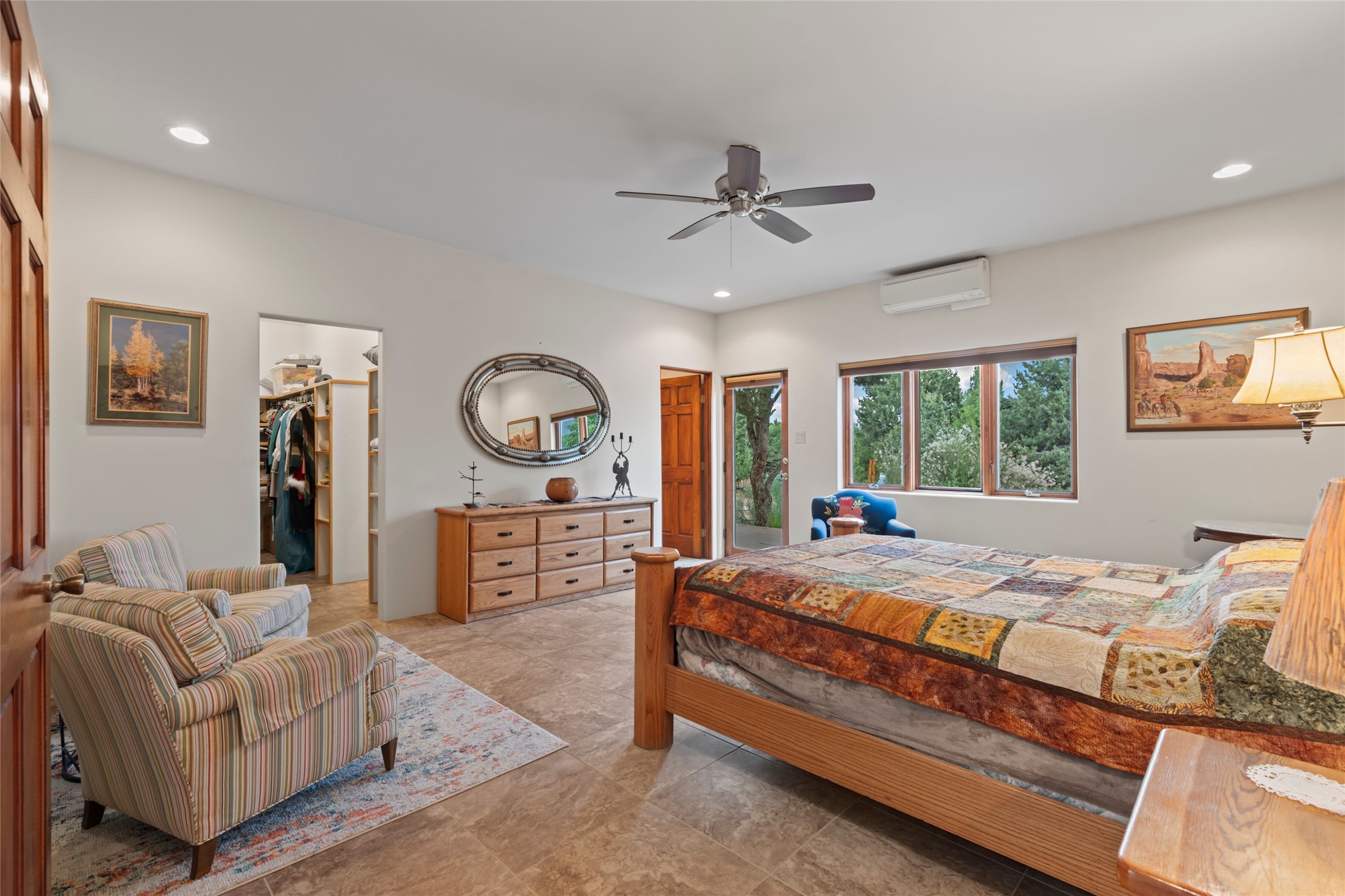 A true Santa Fe masterpiece, this luxurious estate seamlessly blends art, architecture, and nature on a serene 2.46-acre lot with breathtaking views of the Sangre de Cristo mountains. Designed for comfort, sustainability, and inspired living, this extraordinary property offers every amenity for the discerning homeowner.Notable features include double and single-car garages plus a large RV garage, ideal for car enthusiasts, adventure seekers or workshop. The 62-panel solar system and five 2,500-gallon interconnected buried cisterns support an eco-conscious lifestyle, while the extensive drip irrigation system nourishes a lush 1,000 sq. ft. irrigated vegetable garden, orchard (peach, apple, and plum trees), a berry patch bursting with blueberries, blackberries, and raspberries.Enjoy miles of hiking, biking, and horseback riding trails just across the street, or relax in your private oasis with green space bordering the eastern edge of the property, a tranquil water feature with Koi pond, and multiple covered outdoor entertaining spaces, including a plumbed gas fire pit and a fully insulated hot tub.Inside, comfort and luxury abound with radiant floor heating throughout, mini-split systems for cooling, and a security system with cameras. The heart of the home is the spectacular Great Hall, anchored by a gas fireplace, and offering soaring ceilings and an atmosphere of timeless elegance and opening to outdoor spaces. Additional highlights include a top-of-the-line chef's kitchen, butler's pantry, and a quilting/art studio.The estate also includes a charming 2-bedroom guest house and a spacious 2-bedroom studio, also with Sangre de Cristo mountains views. Perfect for guests, extended family, or creative workspaces.There is ample parking for guests and extra vehicles, this estate is ideal for entertaining or enjoying peaceful privacy and solitude. A rare opportunity to own a truly magical home that celebrates the best of indoor-outdoor living in Santa Fe.