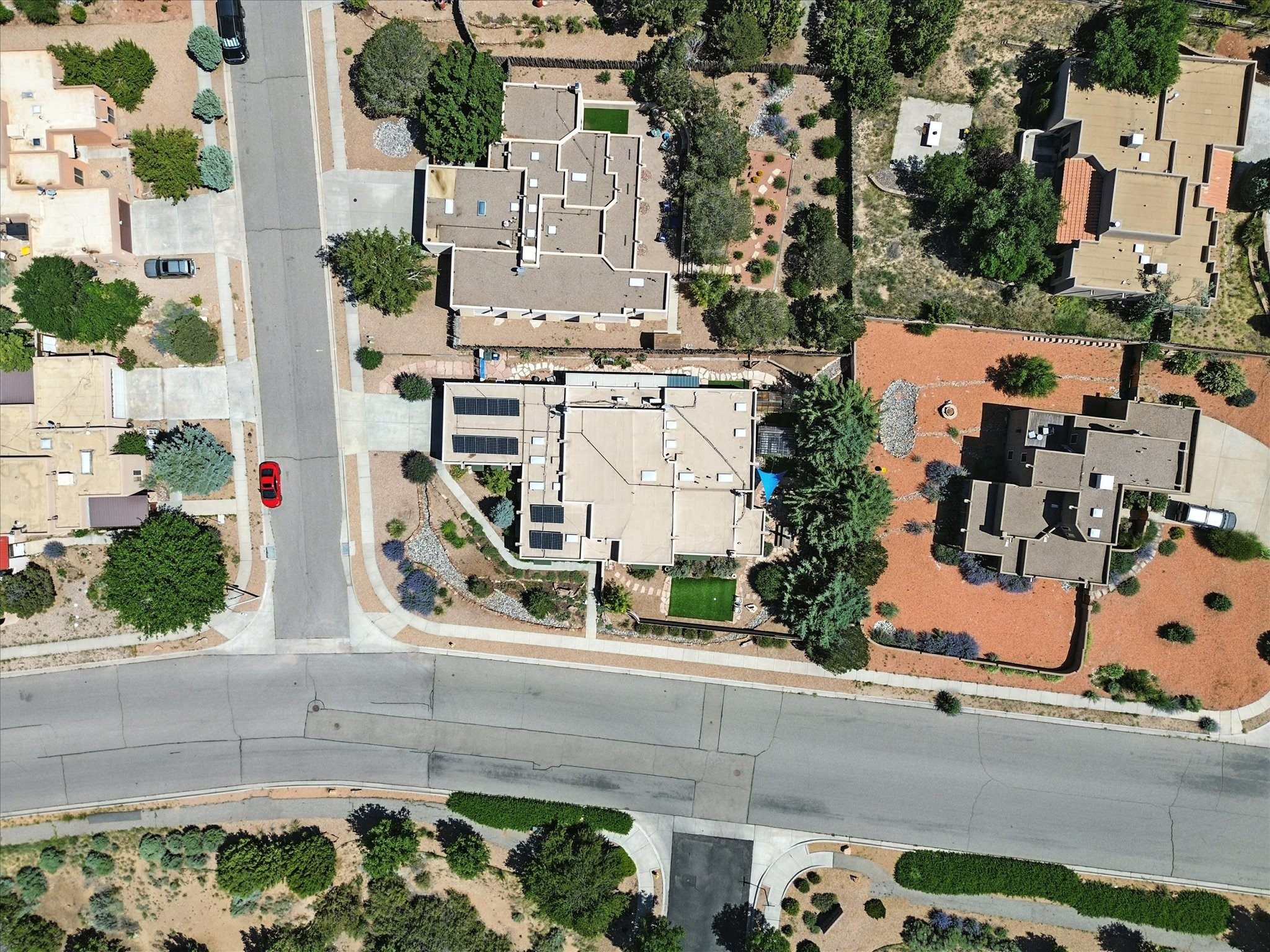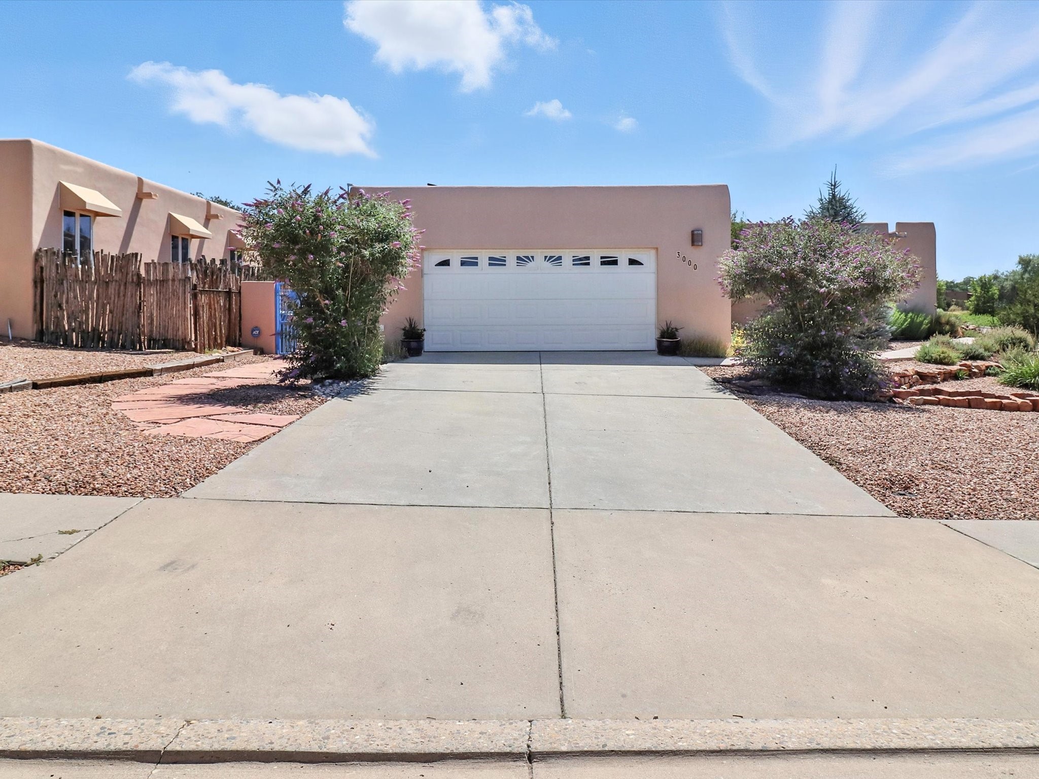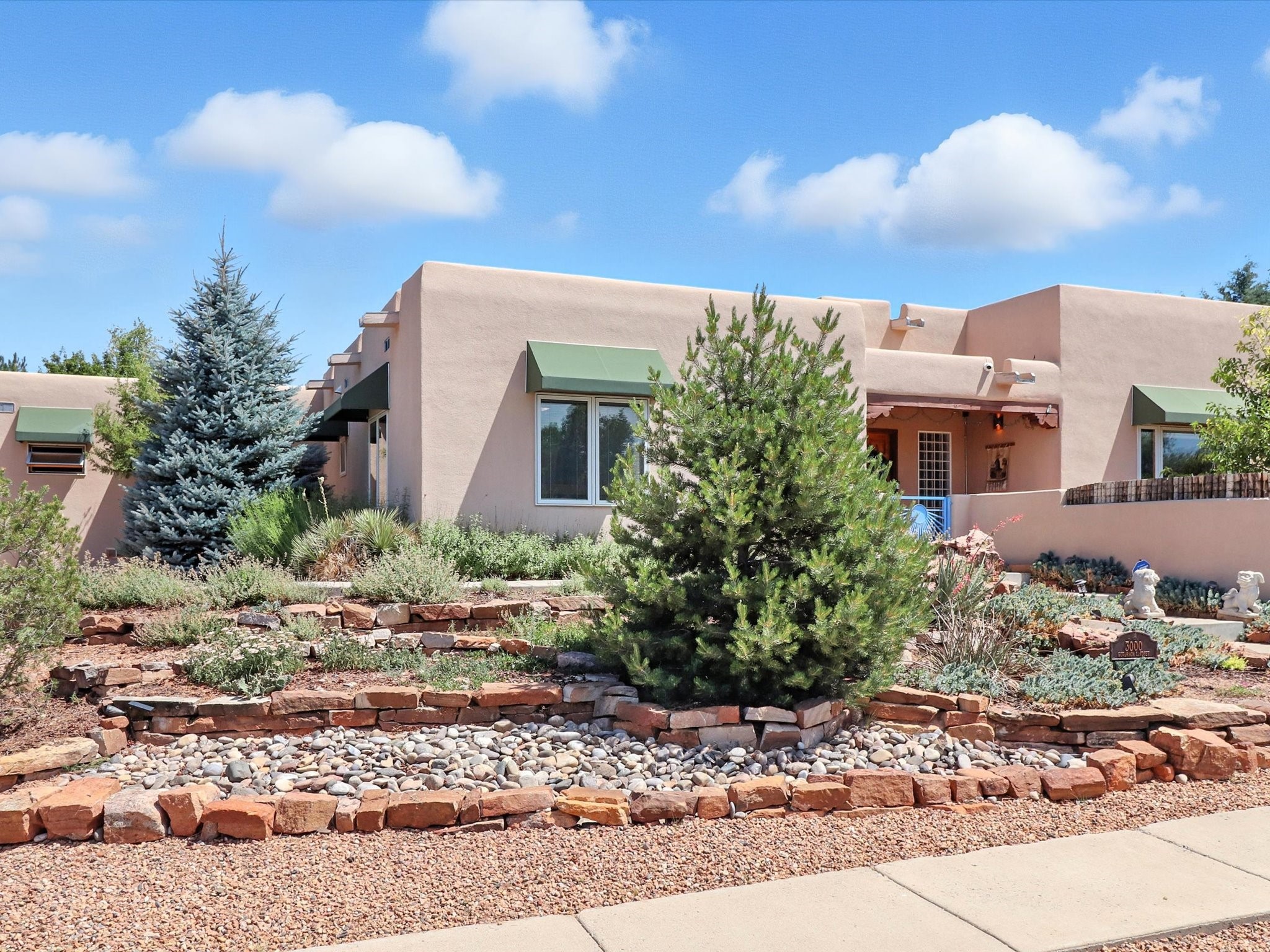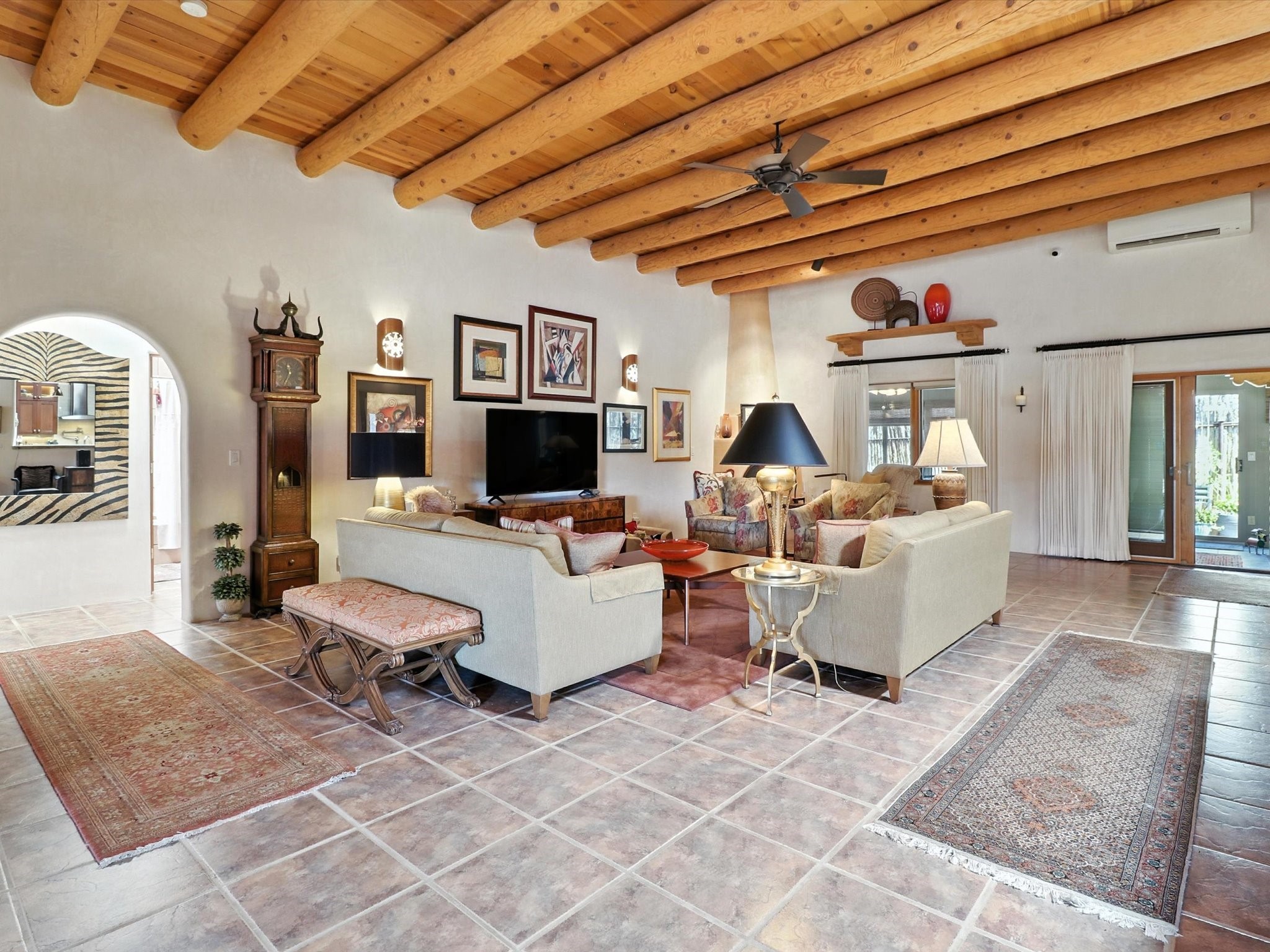 This beautifully maintained and thoughtfully updated home blends timeless Southwestern charm with refined, modern comfort. Spacious and gracefully proportioned rooms are enhanced by luxurious details throughout, including diamond finish plaster walls and elegant, large-format ceramic tile flooring. Step into the dramatic great room, where a soaring 12-foot viga ceiling and a cozy kiva fireplace create a stunning central gathering space. The fully remodeled kitchen is open to the living area and features slab granite countertops, stainless steel appliances, abundant custom cabinetry, and a sunny breakfast nook, perfect for everyday living and entertaining alike. The adjacent formal dining room, also crowned by a high viga ceiling, offers seamless flow for gatherings both intimate and celebratory.A separate den with a wood-burning kiva-style fireplace provides additional flexible living space and opens to a private rear patio and manicured outdoor area.The expansive owner's suite is thoughtfully positioned for privacy and serenity. It includes a peaceful sitting area, direct access to the heated sunroom, and a beautifully appointed updated bath featuring a glass brick wall that gently filters natural light. Two additional bedrooms are located at the opposite end of the home. One is currently serving as studio and office, the other a wonderful guest room, with both sharing a generous full bath. Additional features include: walled and gated yard with security cameras, attached oversized two-car garage, large walk-in closets in every bedroom, heated enclosed Portal Santa Fe room with adjoining covered BBQ area, 5 mini-split Mitsubishi systems for personalized cooling and supplemental heat w/ upgraded hyper compressors, 13 GPM tankless water heater, Toto Washlet toilets, 18 solar panel (owned), and a large in-town lot with all city utilities. This home has been a place of deep joy, creativity, & care, now ready to welcome its next chapter w/ warmth & grace.
