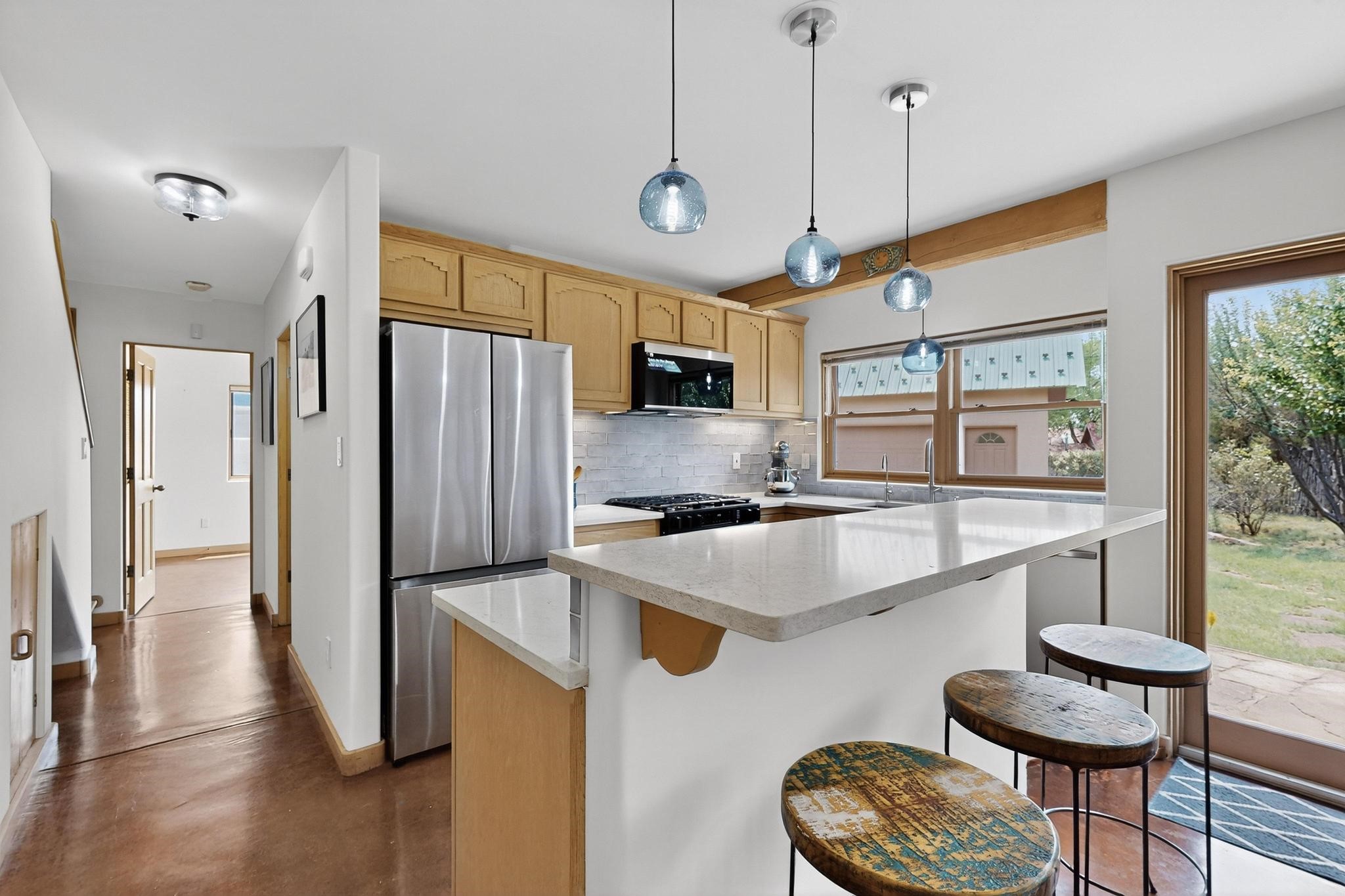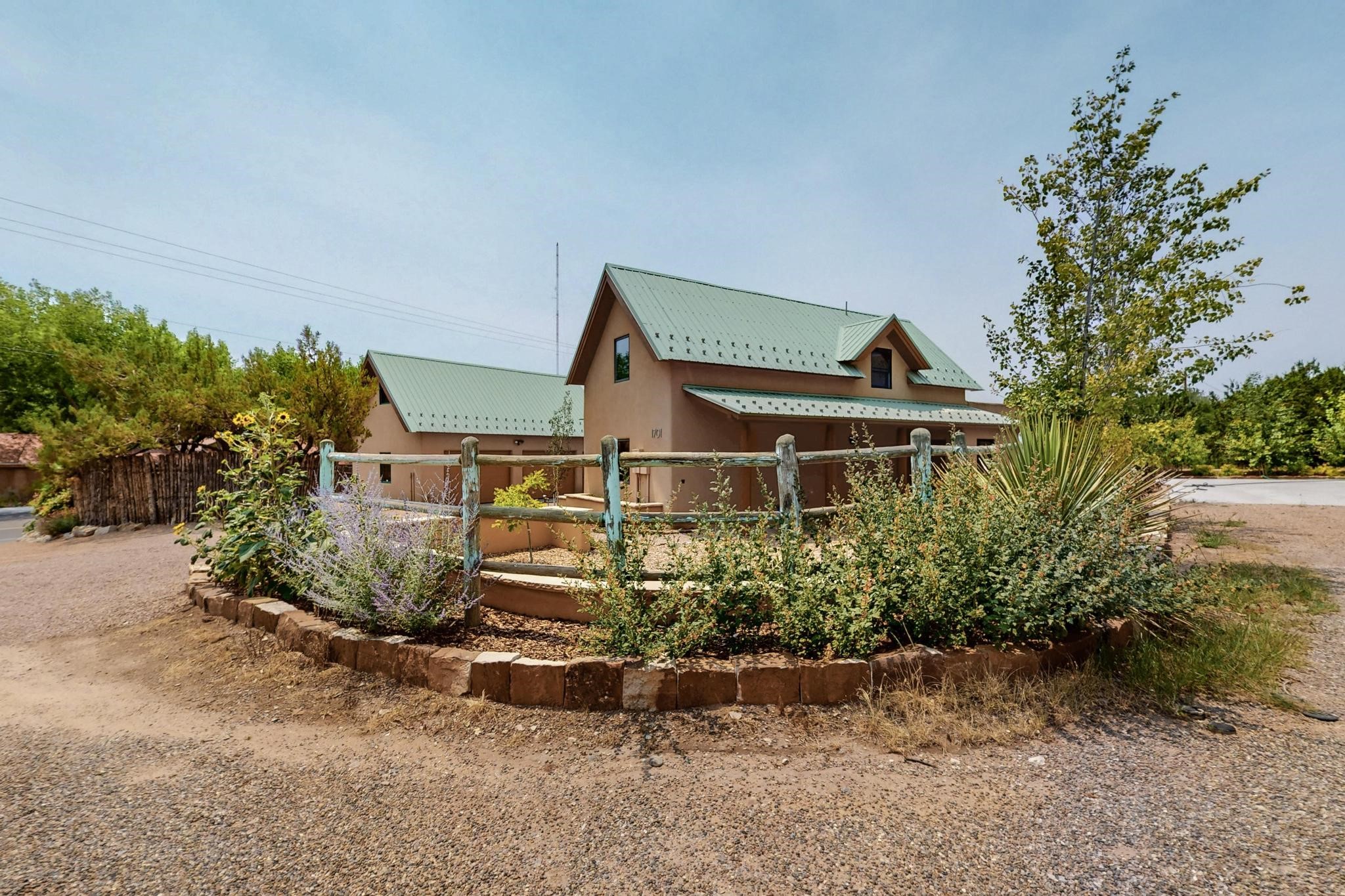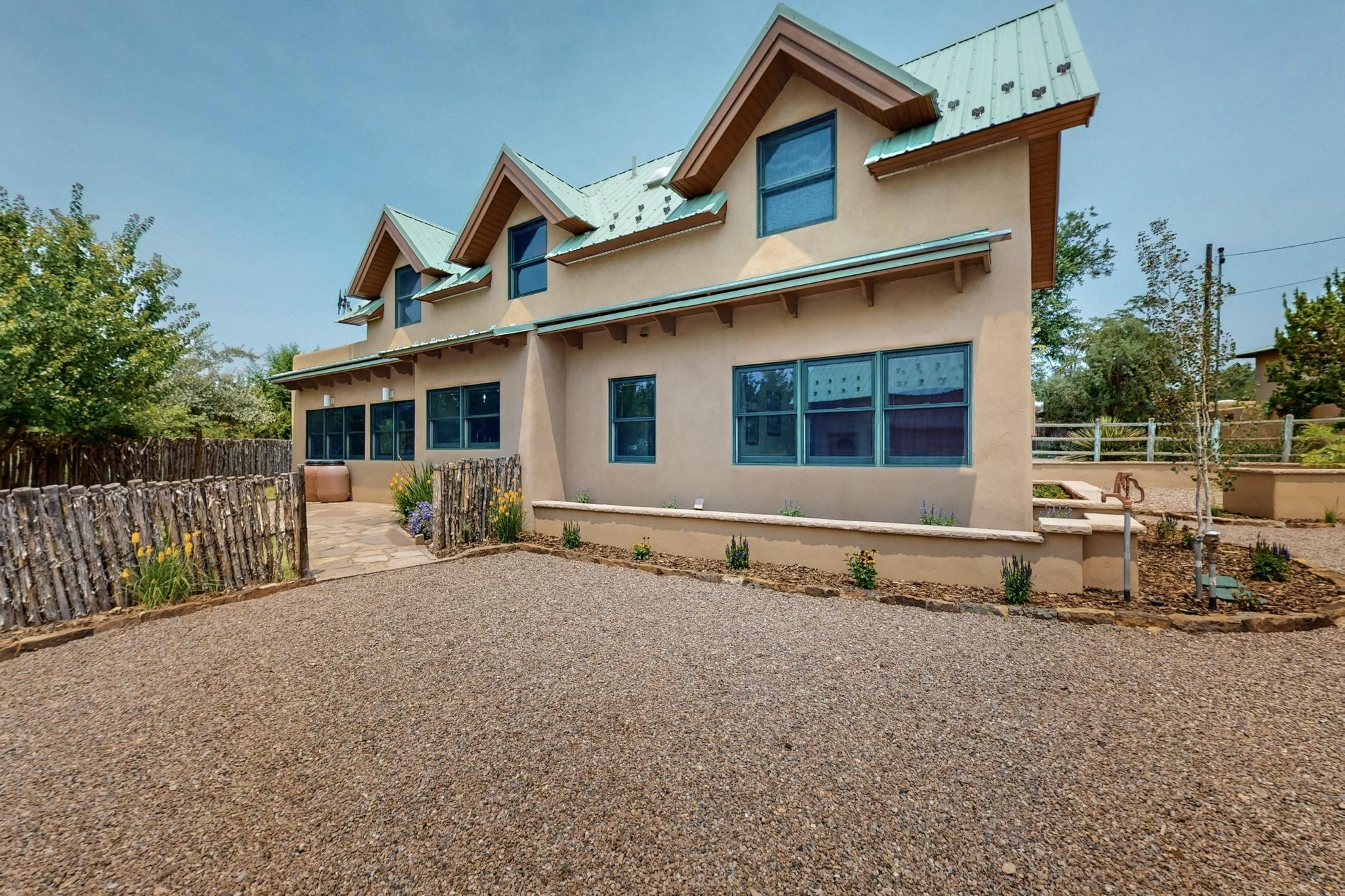 Smartly updated, Northern New Mexico Style, passive solar home. First Energy Starhome in New Mexico featuring high quality construction and outstanding efficiency!Inside you will find stained concrete radiant floors, new high-quality carpet upstairs andan abundance of beautiful natural light throughout the home. Tasteful finishes havebeen newly added to the kitchen and baths including new quartz countertops, sinks,matching faucets, lighting accents as well as brand new Wi-Fi ready Samsung StainlessSteel appliances. Other recent updates include a Lutron wireless automated lightingsystem, new smart smoke/CO detectors and thermostats, Moen Flow water leakdetection system and a filtered drinking water system. Feel at ease with brand newradiant heat boiler and control system as well as new domestic hot water heater. Thehome enjoys lovely Sangre de Cristo Mountain views from the primary upstairsbedroom with walk in closet. Outside you will find copious parking for guests and toys.The extensive low maintenance landscaping surrounding the property brings a pastoralfeeling with blue grama, Aspen trees and flowers amongst artful custom stone walls allautomatically watered with a Wi-Fi controlled irrigation and drip system. The detached580 sq/ft heated, insulated and finished garage could easily serve as an excellentworkshop, studio, or guest house. The garage also boasts a full, equally sized attic forextra storage or the option to finish. This would be a great location for the LANL commuter or someone looking for an ultra-convenient location just minutes from Plaza, the Railyard, and the Montanita Co-op. Enjoy a very short walk to the river trail, Frank Ortiz dog park and city open space trails, or a quick mountain bike ride from this hometo La Tierra trails and more. This home offers easy connection to all that Santa Fe has to offer!