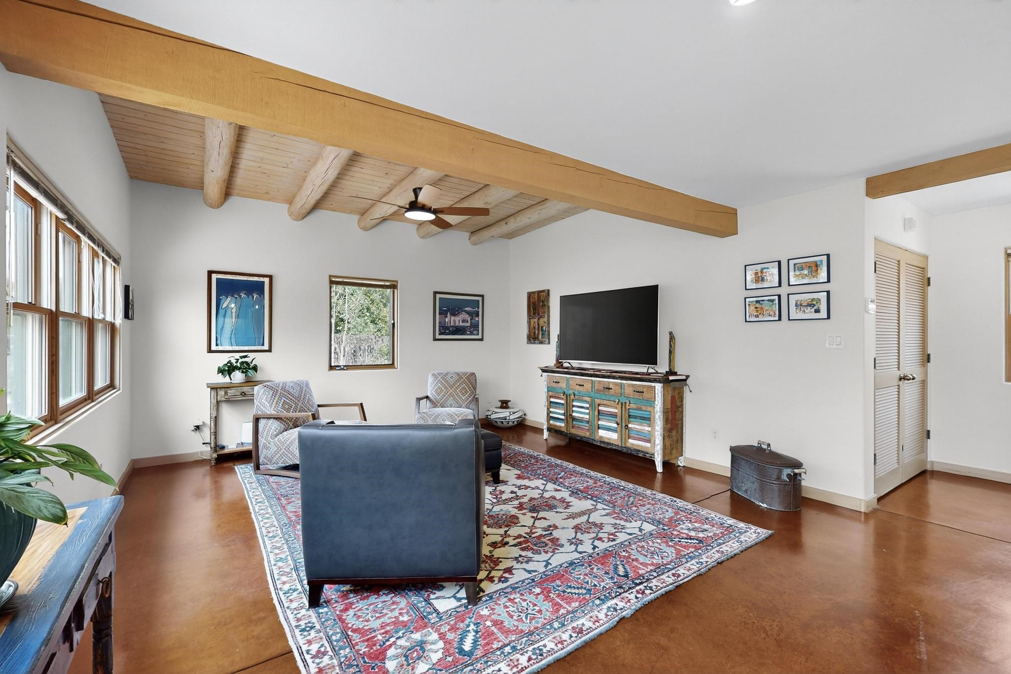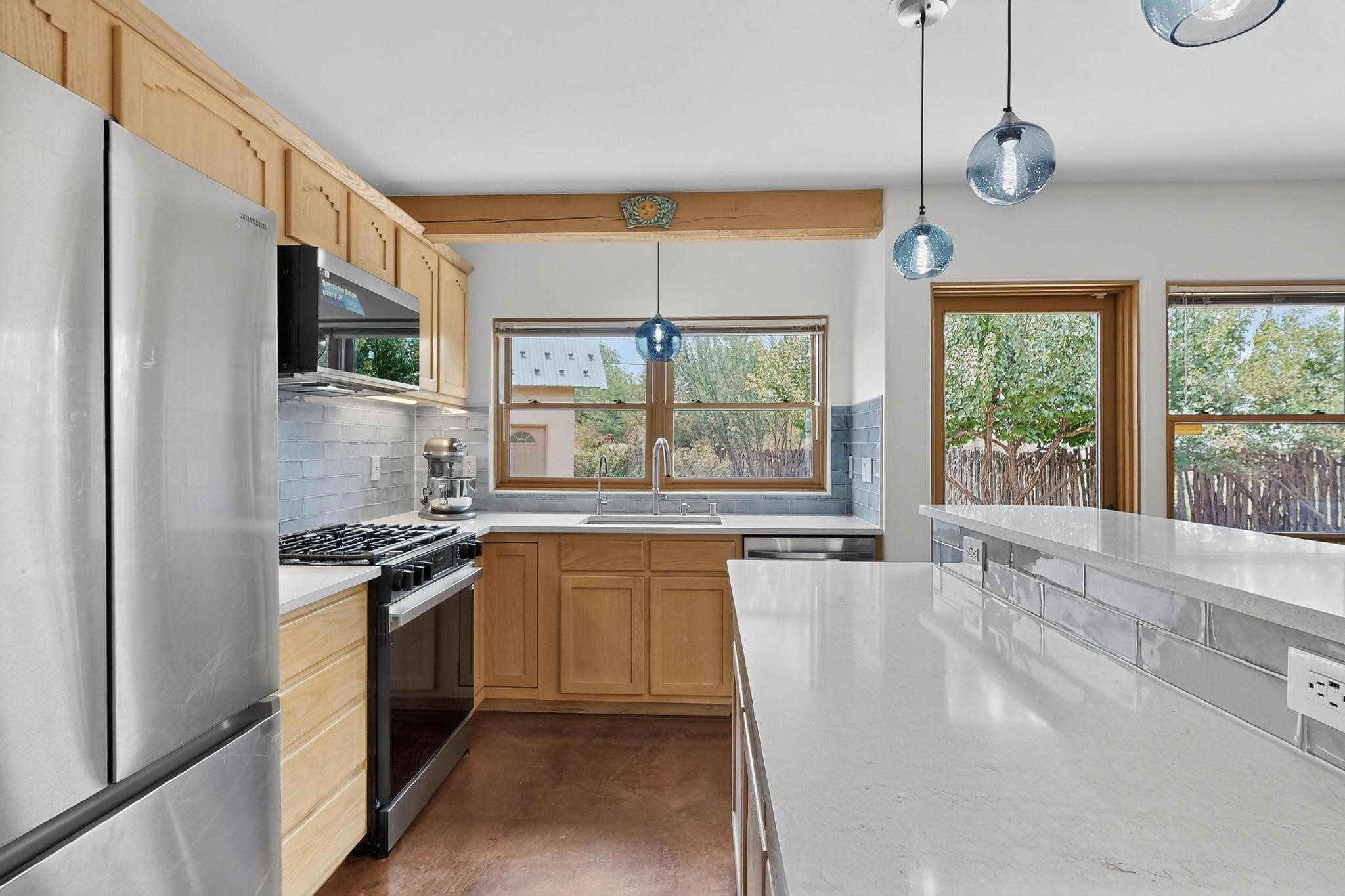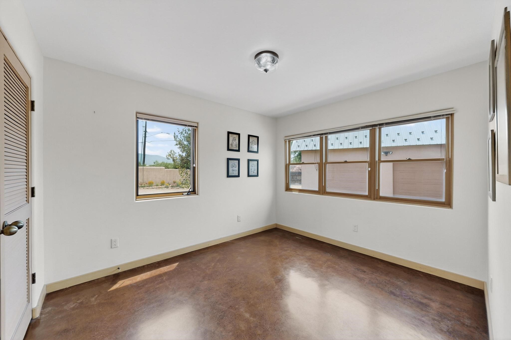 Smartly updated, Northern New Mexico Style, passive solar home. First Energy Starhome in New Mexico featuring high quality construction and outstanding efficiency!Inside you will find stained concrete radiant floors, new high-quality carpet upstairs andan abundance of beautiful natural light throughout the home. Tasteful finishes havebeen newly added to the kitchen and baths including new quartz countertops, sinks,matching faucets, lighting accents as well as brand new Wi-Fi ready Samsung StainlessSteel appliances. Other recent updates include a Lutron wireless automated lightingsystem, new smart smoke/CO detectors and thermostats, Moen Flow water leakdetection system and a filtered drinking water system. Feel at ease with brand newradiant heat boiler and control system as well as new domestic hot water heater. Thehome enjoys lovely Sangre de Cristo Mountain views from the primary upstairsbedroom with walk in closet. Outside you will find copious parking for guests and toys.The extensive low maintenance landscaping surrounding the property brings a pastoralfeeling with blue grama, Aspen trees and flowers amongst artful custom stone walls allautomatically watered with a Wi-Fi controlled irrigation and drip system. The detached580 sq/ft heated, insulated and finished garage could easily serve as an excellentworkshop, studio, or guest house. The garage also boasts a full, equally sized attic forextra storage or the option to finish. This would be a great location for the LANL commuter or someone looking for an ultra-convenient location just minutes from Plaza, the Railyard, and the Montanita Co-op. Enjoy a very short walk to the river trail, Frank Ortiz dog park and city open space trails, or a quick mountain bike ride from this hometo La Tierra trails and more. This home offers easy connection to all that Santa Fe has to offer!