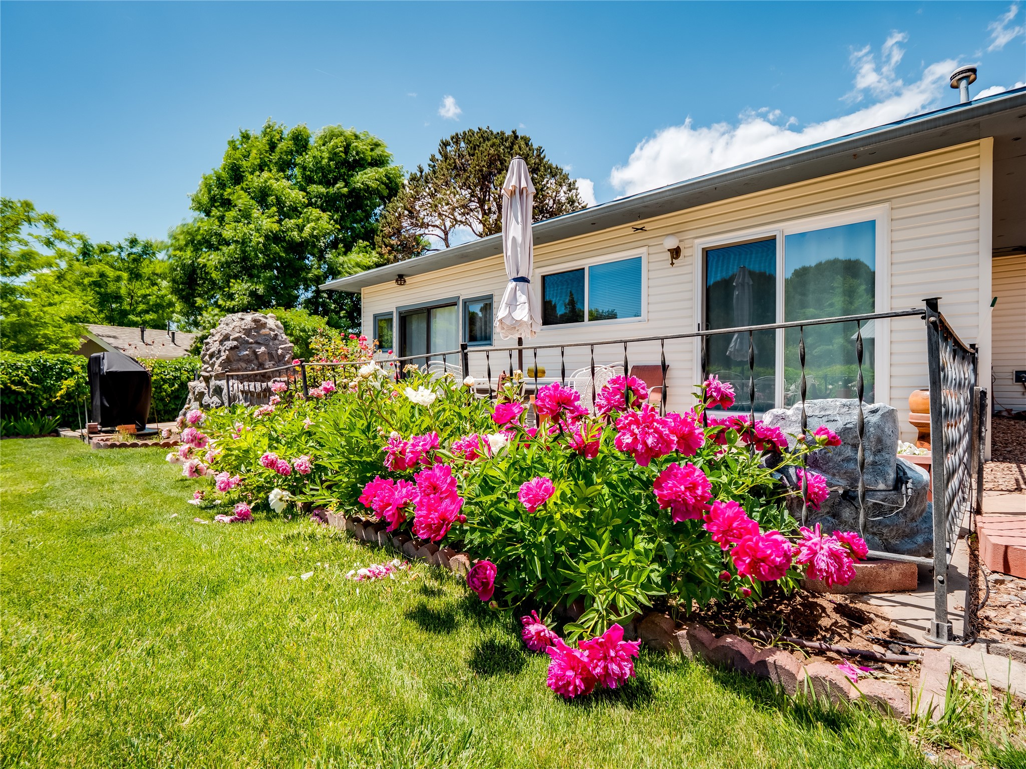 Welcome to this sensational ranch-style home in White Rock with beautiful curb appeal. A lush, green lawn and mature shade trees frame the front of the property, complemented by colorful flower beds that create a warm and inviting entrance. Step inside to find plush carpet flooring that runs throughout, adding comfort and continuity. Just off the entryway to the left is a versatile bonus room or den--ideal for a home office, study, or creative space--framed by elegant pillars that give the area a sense of separation and style. Continue forward into the cozy living room featuring a wood-burning fireplace, perfect for chilly evenings and relaxing with loved ones. The adjacent galley-style kitchen includes wood cabinets with chrome hardware and offers ample prep space, as well as a designated dining area for casual meals. Nearby is access to the two-car garage and a convenient laundry space, providing everyday functionality. Step down into the formal dining room, filled with natural light from the surrounding windows and glass sliders that lead directly to the back patio and yard. Connected to this space is a large family room, offering another access point to the backyard, a perfect setting for gatherings, movie nights, or game days. A beautifully renovated modern guest bathroom with a white single sink vanity and a fully tiled shower/tub combo. At the end of the hall, the spacious primary en-suite overlooks the peaceful backyard and includes a walk-in closet and a private bathroom with a tiled walk-in shower and single sink vanity. The expansive backyard is a true oasis, with a lush green lawn, vibrant flower gardens, and irrigated vegetable planters--perfect for any green thumb. There's also side-yard access to park a vehicle or RV. A large patio area is ideal for outdoor dining and entertaining under the open sky.