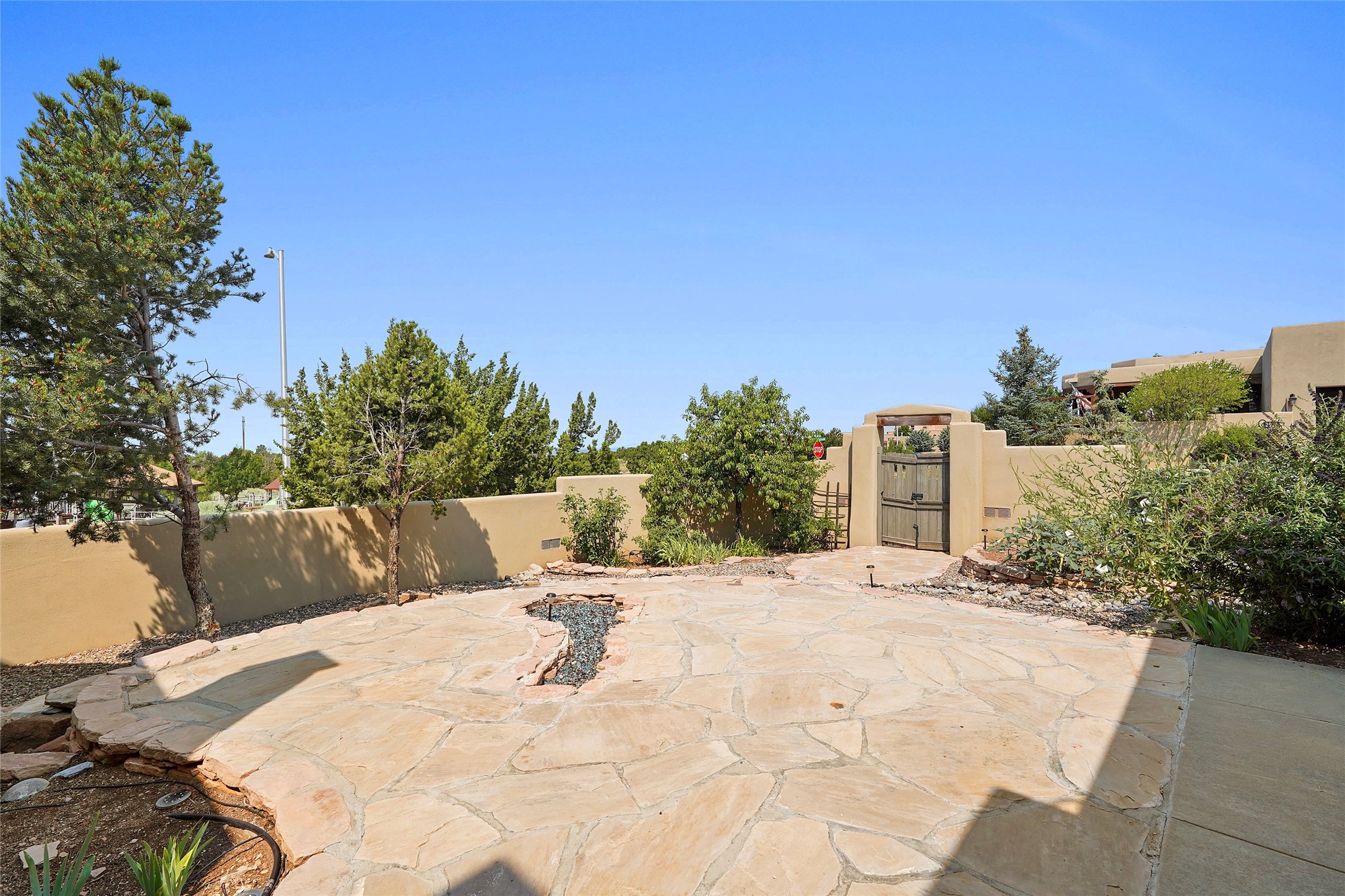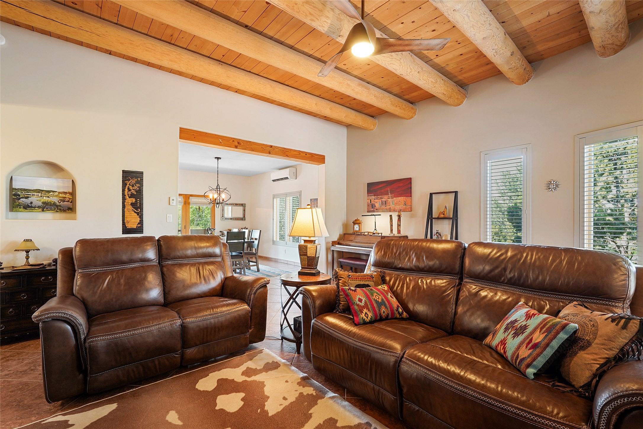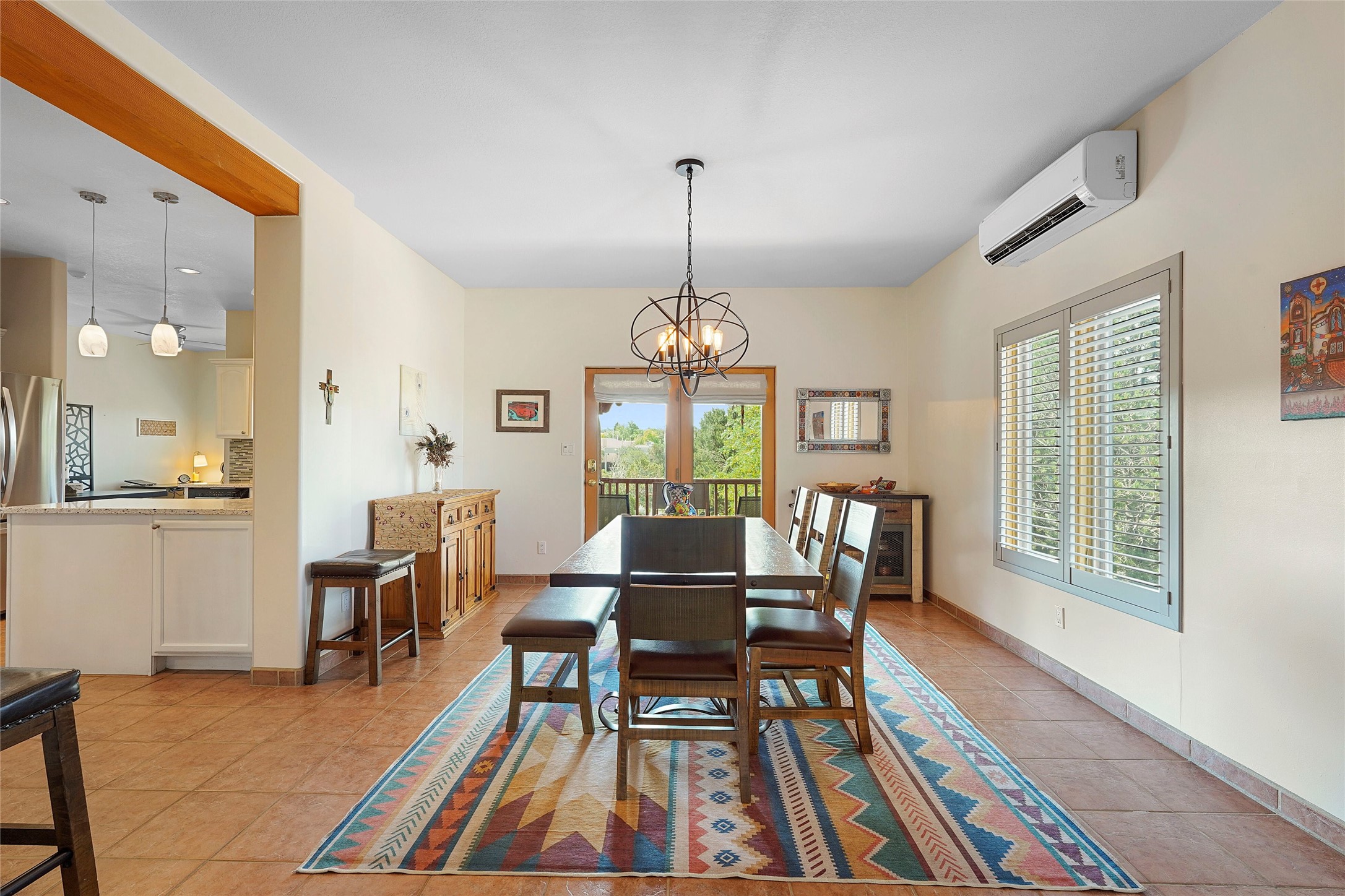 Welcome to this beautifully maintained home in the sought-after Pueblos de Sol subdivision, offering comfortable living and sweeping views. Recent upgrades include a modern kitchen with stainless steel appliances, granite countertops, and a spa-like primary bathroom with a standalone tub and custom stone tile. The primary suite also features a private deck with durable Trex decking. A TPO roof was installed in 2022. Enjoy year-round comfort with 5 mini-splits and radiant heating. Outdoor living shines with multiple decks, a charming courtyard, mature trees, and drip irrigation. A separate-entry studio/guesthouse with full bath offers rental or creative flexibility. Don't miss this Santa Fe gem! Trails and parks nearby!