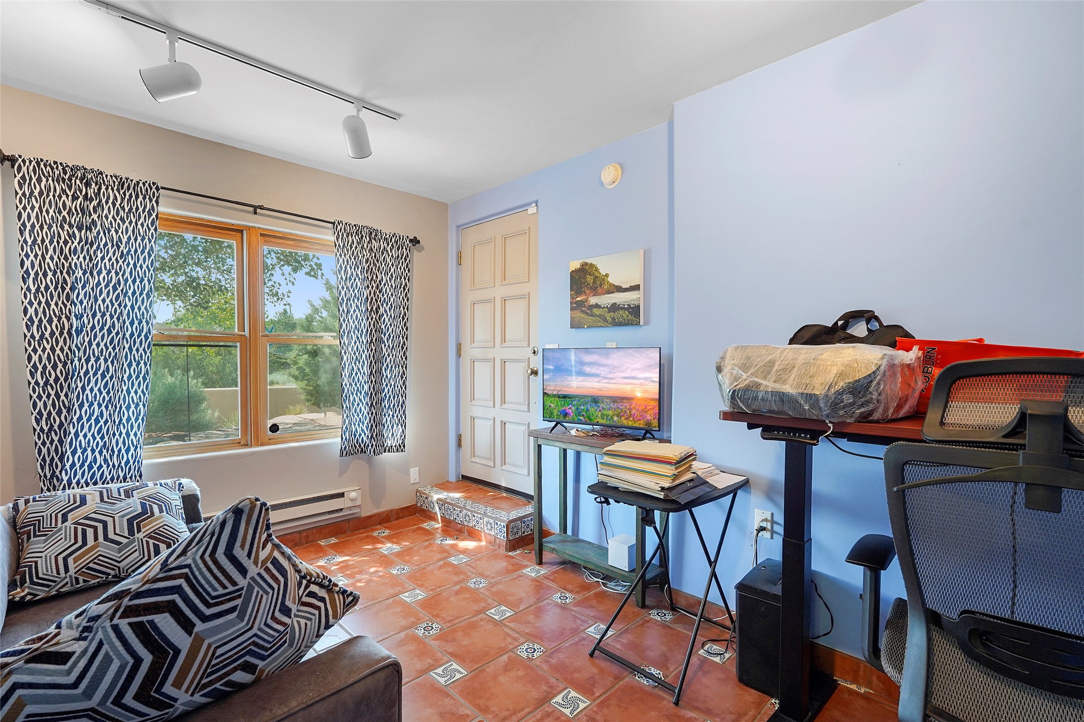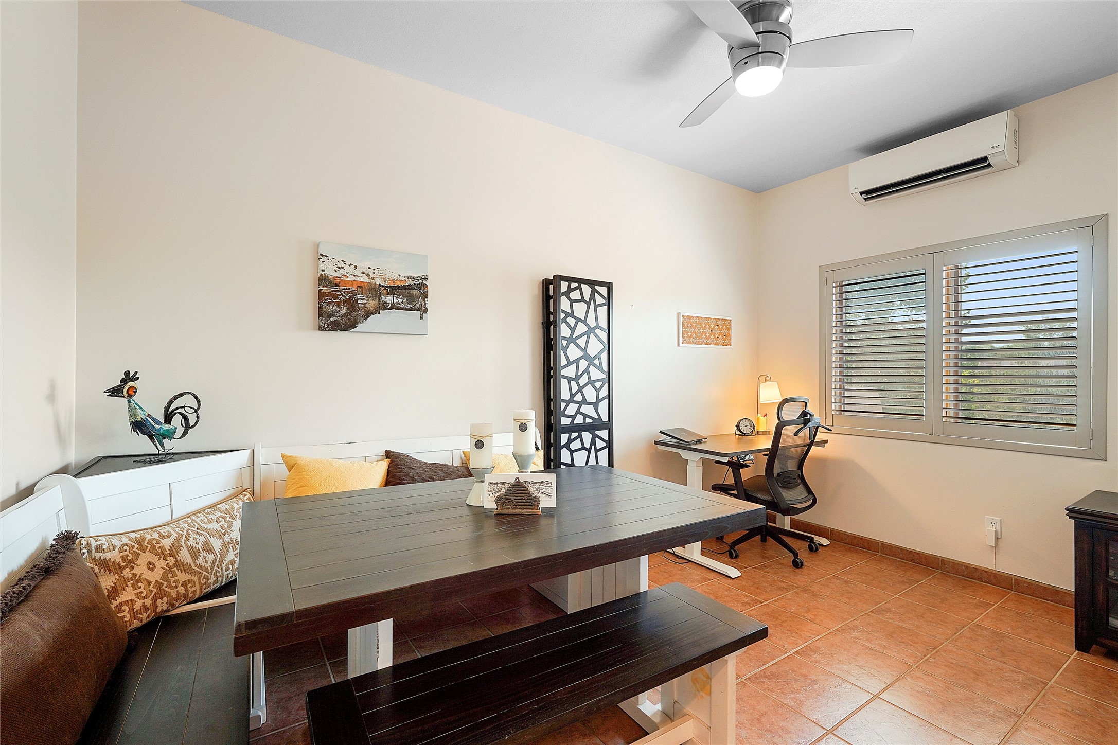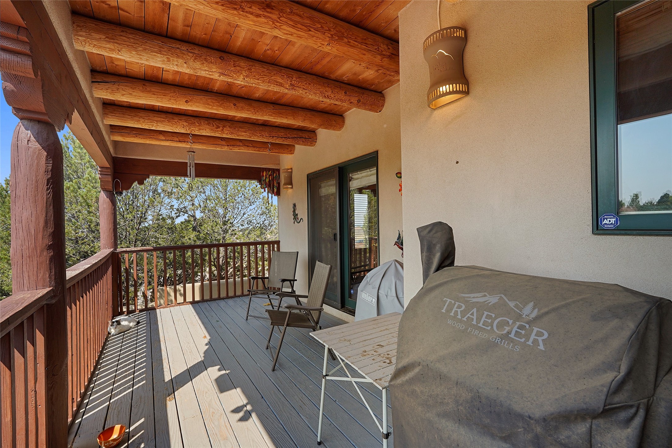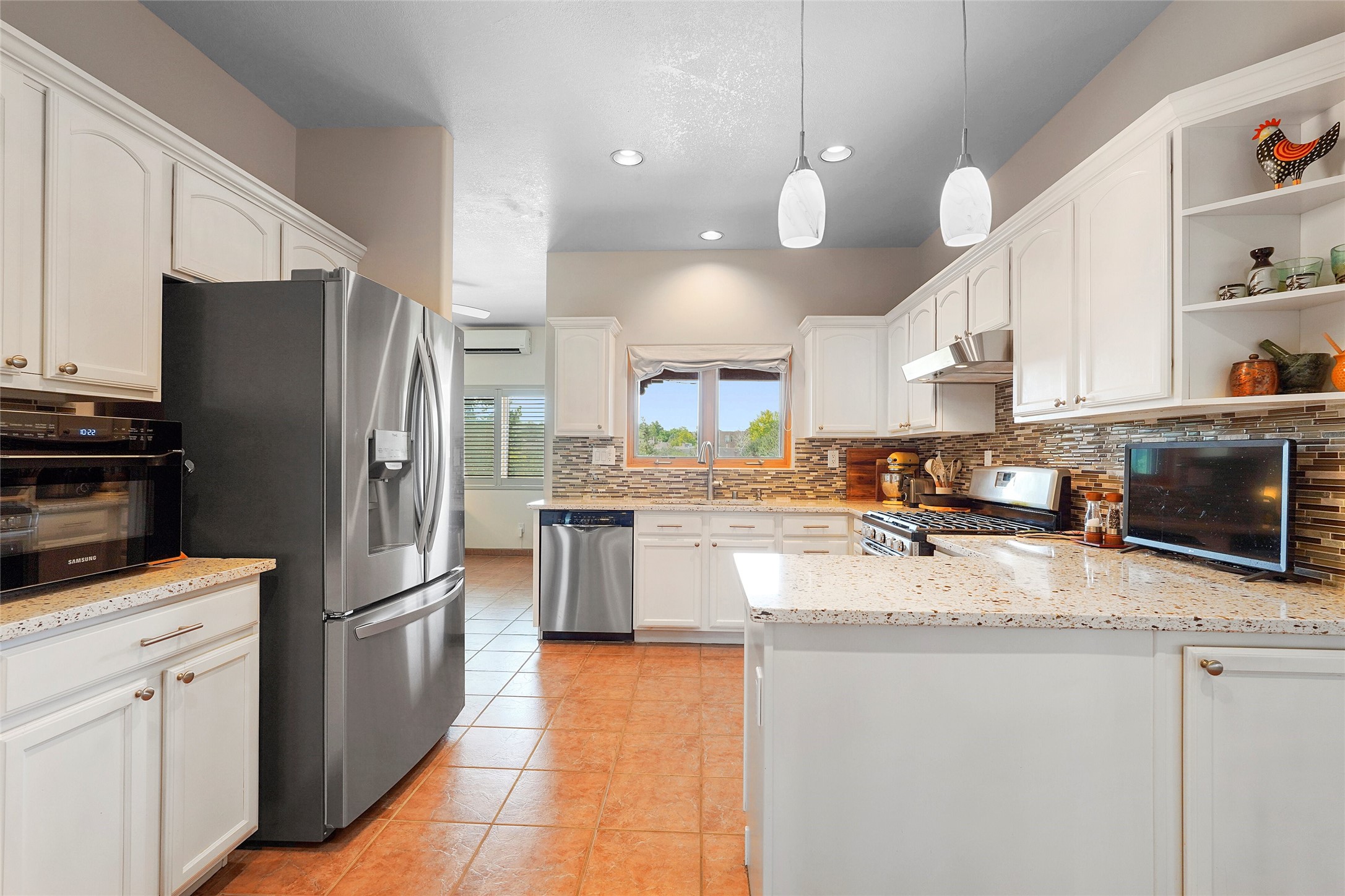 Welcome to this beautifully maintained home in the sought-after Pueblos de Sol subdivision, offering comfortable living and sweeping views. Recent upgrades include a modern kitchen with stainless steel appliances, granite countertops, and a spa-like primary bathroom with a standalone tub and custom stone tile. The primary suite also features a private deck with durable Trex decking. A TPO roof was installed in 2022. Enjoy year-round comfort with 5 mini-splits and radiant heating. Outdoor living shines with multiple decks, a charming courtyard, mature trees, and drip irrigation. A separate-entry studio/guesthouse with full bath offers rental or creative flexibility. Don't miss this Santa Fe gem! Trails and parks nearby!