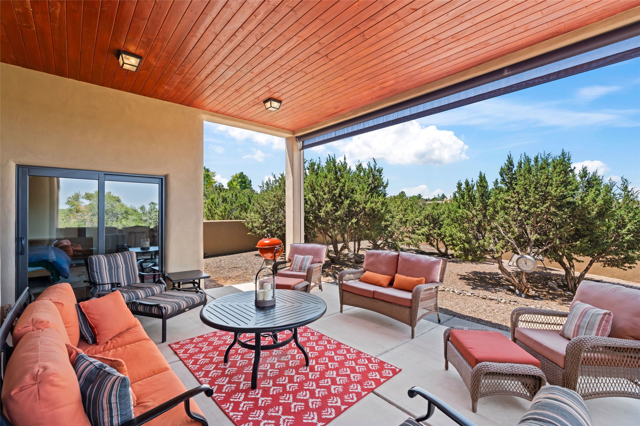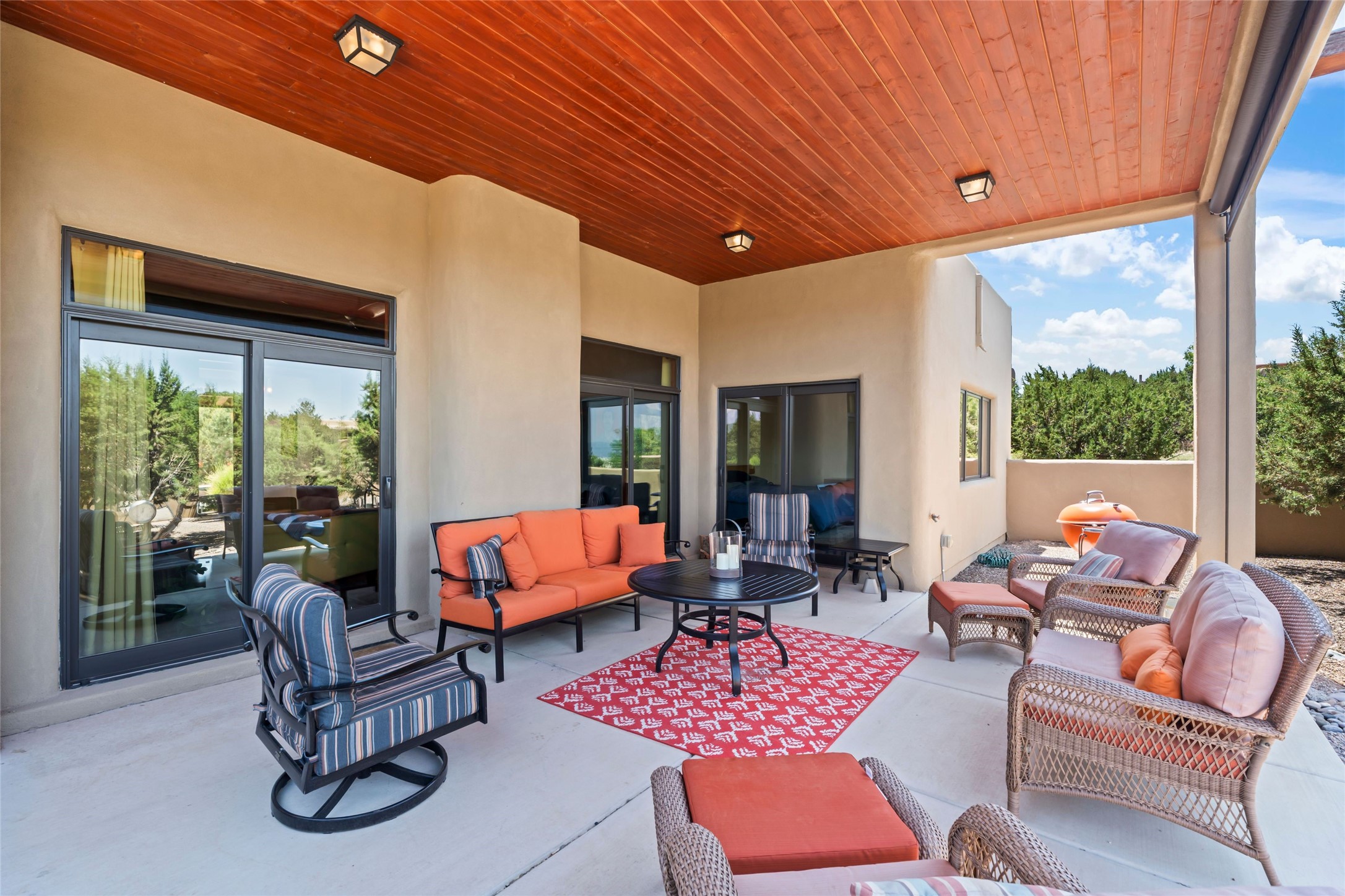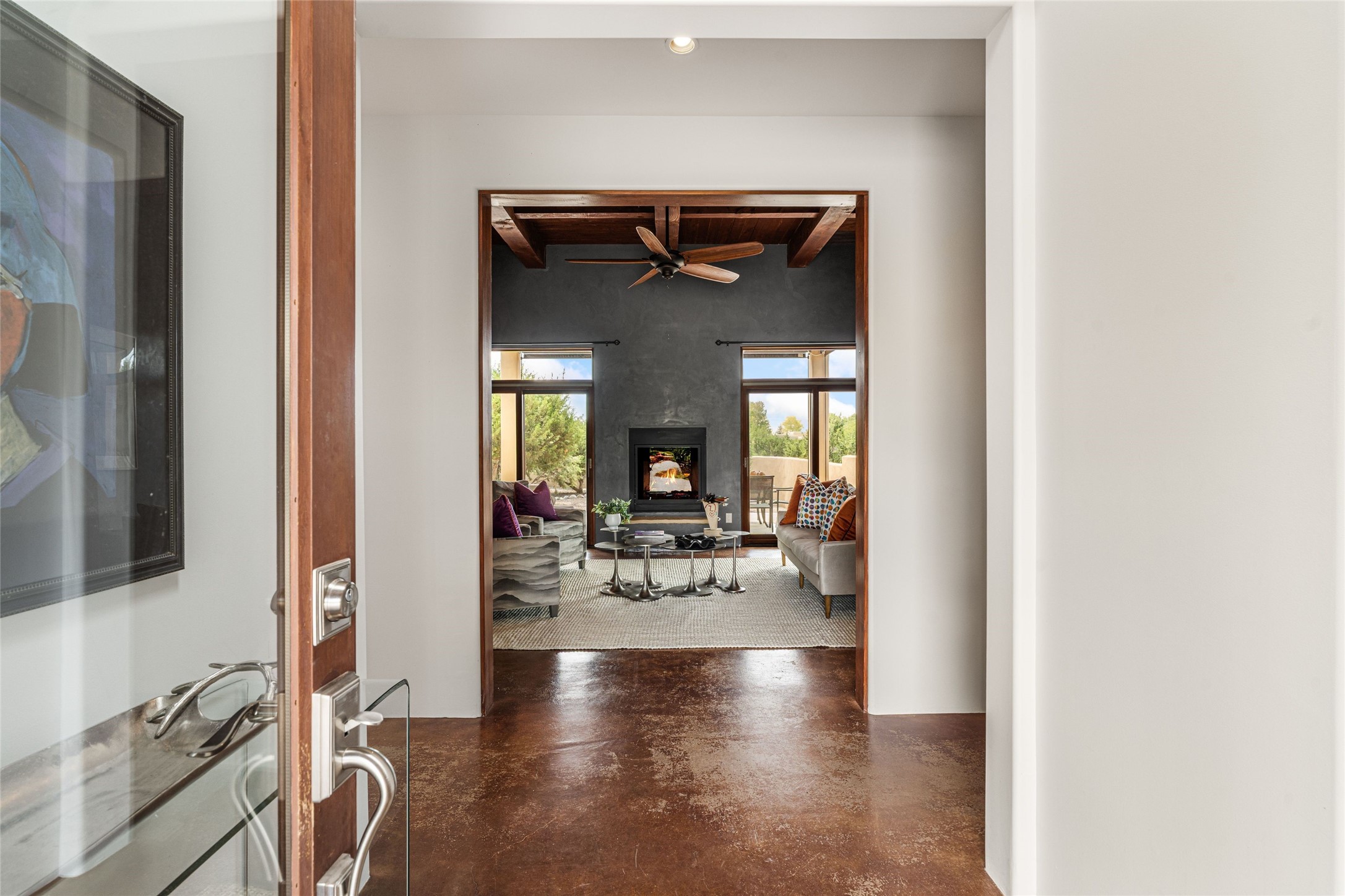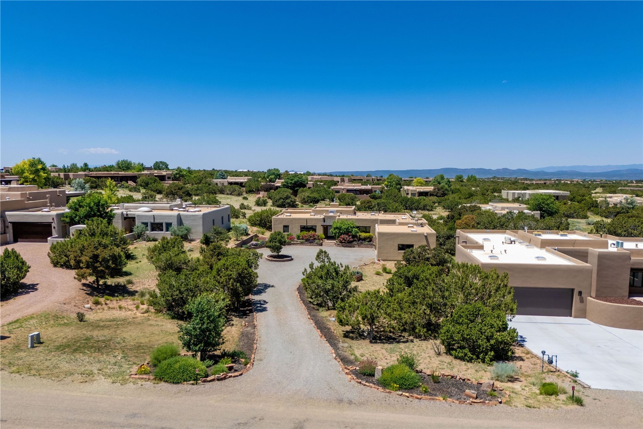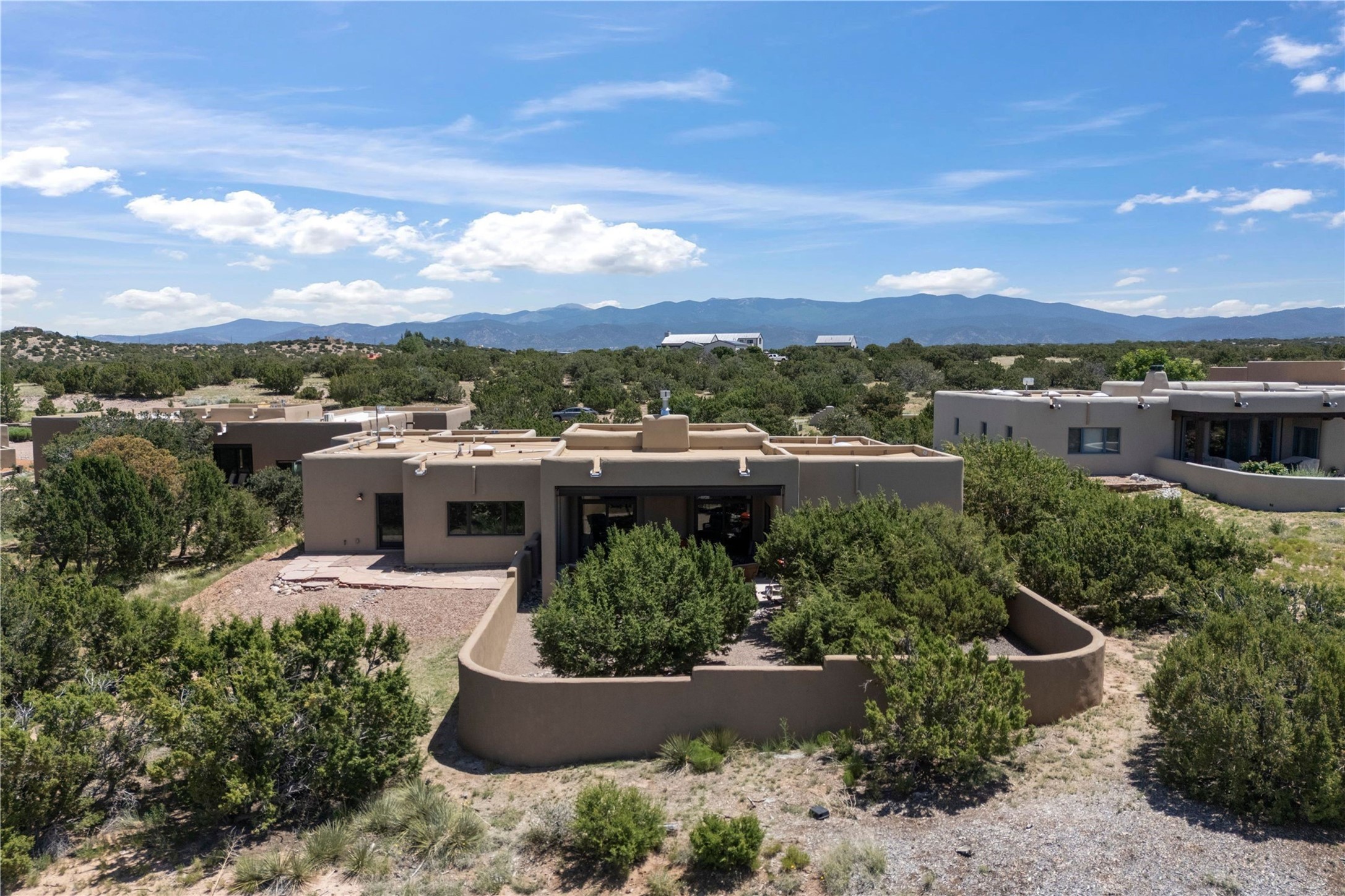 Heartstone community 3-bedroom, 3.5-bath soft contemporary home featuring sleek concrete floors, harmoniously paired with traditional Santa Fe elements, including iconic vigas and beams. Designed for convenience, this single-level property offers a spacious layout with no interior steps, making it accessible and easy to navigate. Enjoy the luxury of two living areas, ideal for relaxation and entertaining friends and family. The large kitchen and dining area provide the perfect backdrop for memorable gatherings. Step outside to the back portal, where a generous backyard awaits, offering sweeping views of the Jemez mountains that elevate outdoor living. In addition, enjoy Sangre de Cristo views from the front. Heartstone is characterized by half-acre lots, thoughtfully arranged around a shared meadow and many acres of permanently dedicated open space, fostering a connection to nature and tranquility. For those who enjoy an active lifestyle, the community is surrounded by a network of trails, granting access to the La Tierra Trails--a multi-use system featuring 25 miles of paths designed for hikers, cyclists, and equestrians alike. The community house serves as a venue for social gatherings and activities, complemented by exercise areas and a media room. Located in the desirable Tano Road area, this residence provides easy access to the vibrant Santa Fe Plaza, the artistic charm of Canyon Road, the Santa Fe's Farmer's Market, and the renowned Santa Fe Opera.