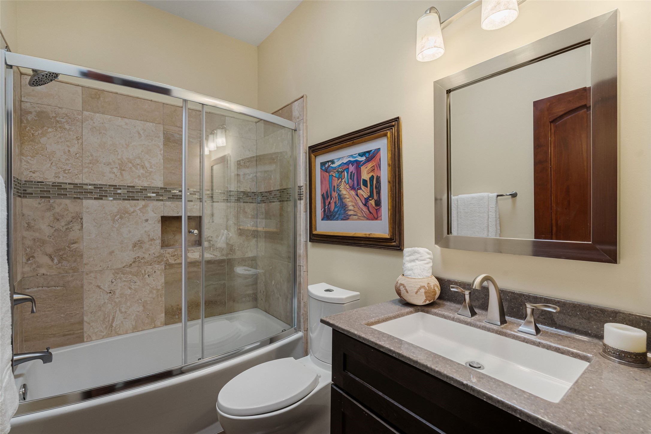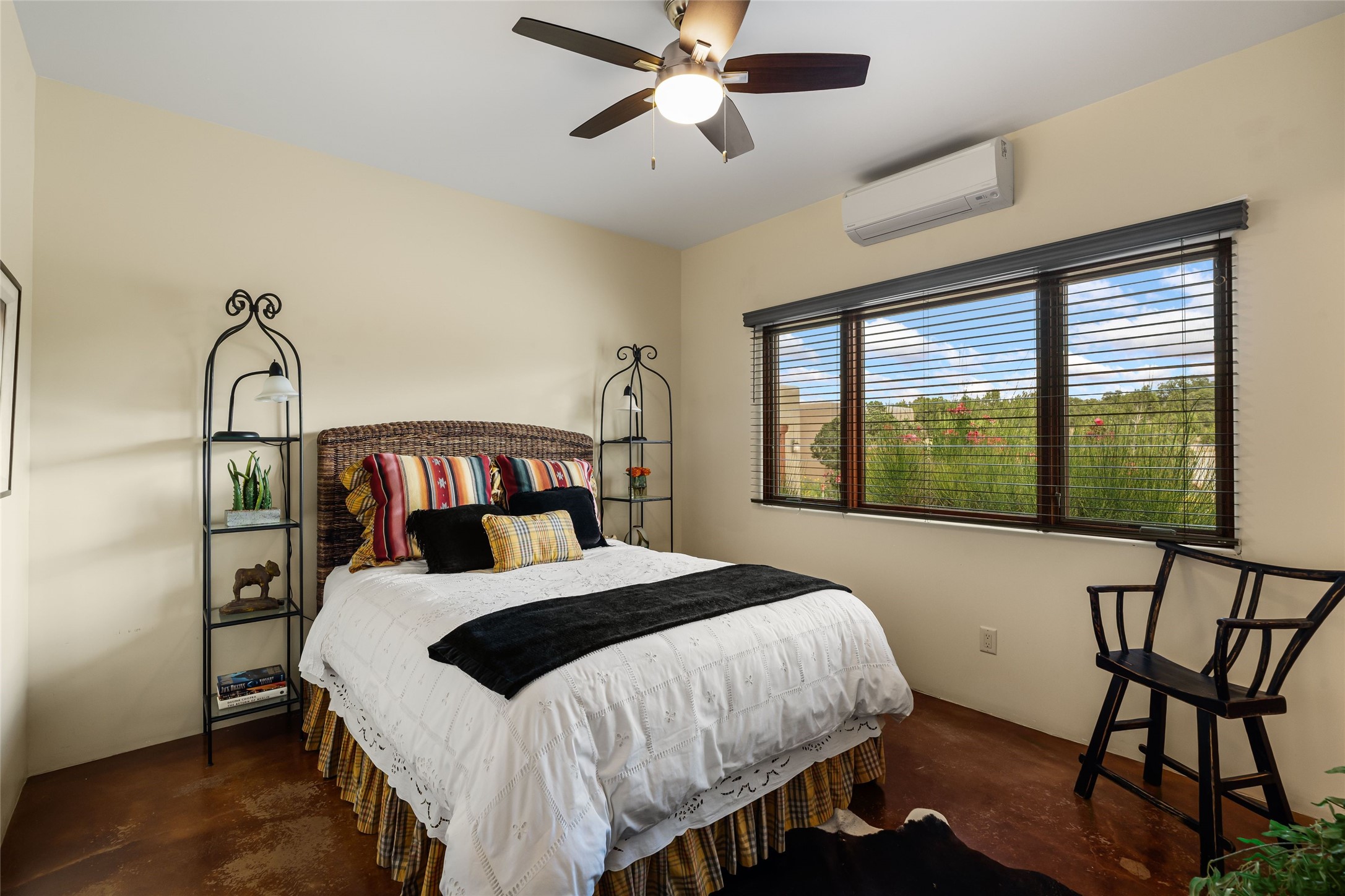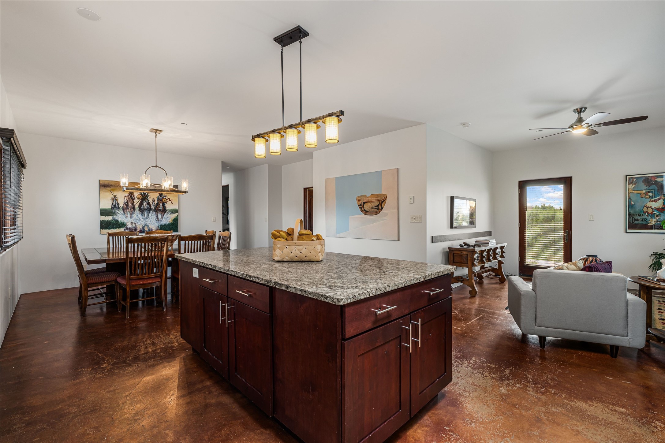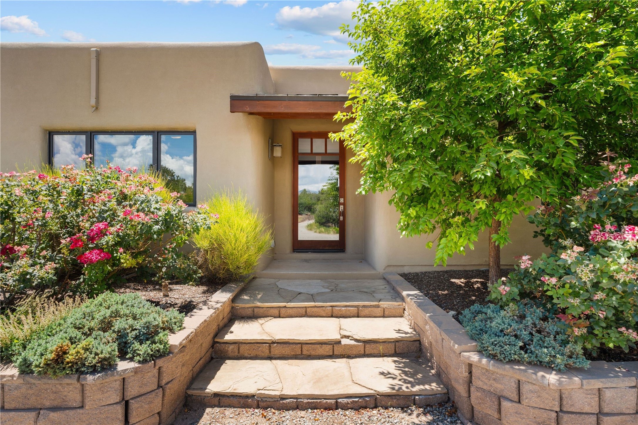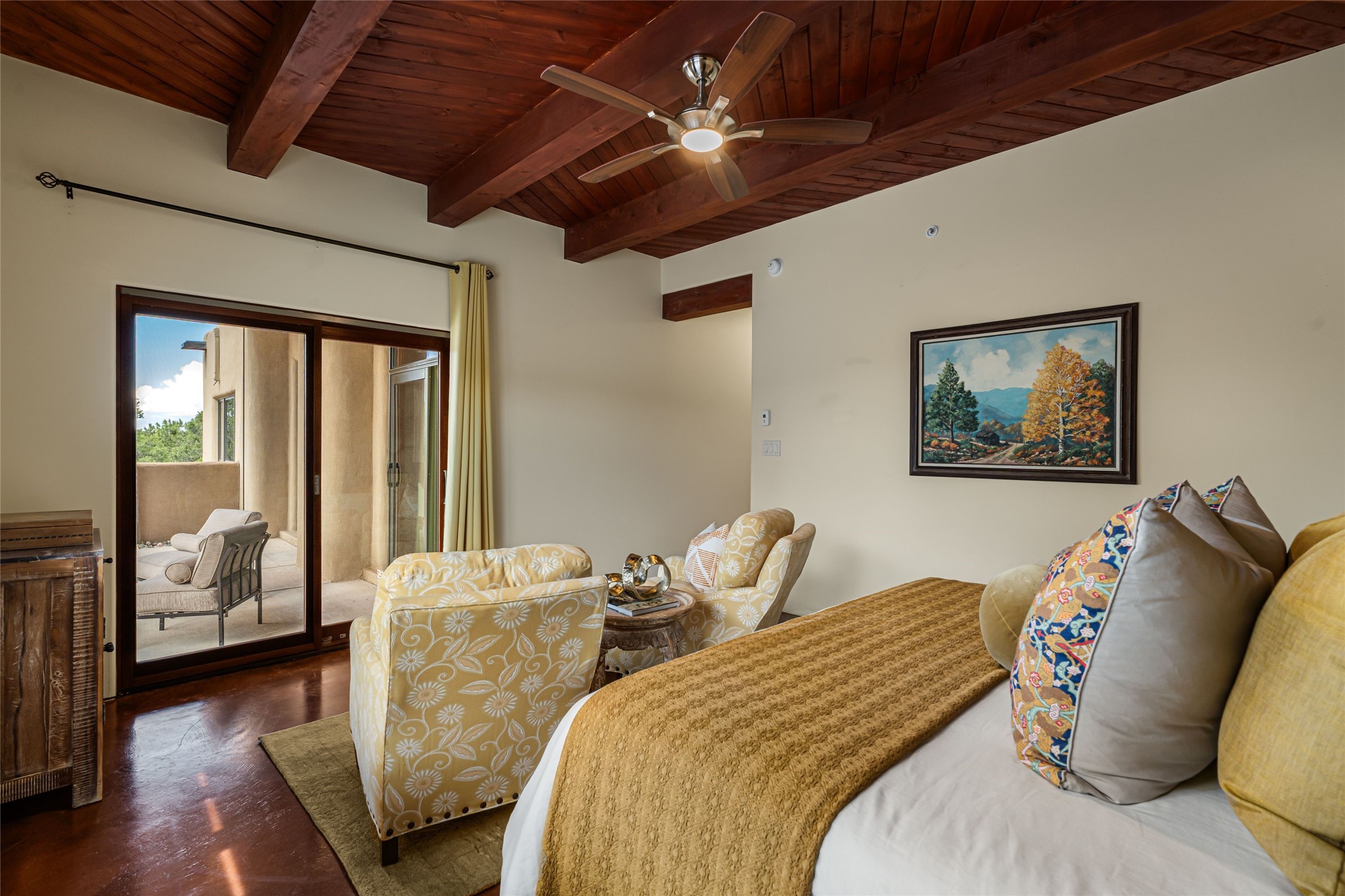 Heartstone community 3-bedroom, 3.5-bath soft contemporary home featuring sleek concrete floors, harmoniously paired with traditional Santa Fe elements, including iconic vigas and beams. Designed for convenience, this single-level property offers a spacious layout with no interior steps, making it accessible and easy to navigate. Enjoy the luxury of two living areas, ideal for relaxation and entertaining friends and family. The large kitchen and dining area provide the perfect backdrop for memorable gatherings. Step outside to the back portal, where a generous backyard awaits, offering sweeping views of the Jemez mountains that elevate outdoor living. In addition, enjoy Sangre de Cristo views from the front. Heartstone is characterized by half-acre lots, thoughtfully arranged around a shared meadow and many acres of permanently dedicated open space, fostering a connection to nature and tranquility. For those who enjoy an active lifestyle, the community is surrounded by a network of trails, granting access to the La Tierra Trails--a multi-use system featuring 25 miles of paths designed for hikers, cyclists, and equestrians alike. The community house serves as a venue for social gatherings and activities, complemented by exercise areas and a media room. Located in the desirable Tano Road area, this residence provides easy access to the vibrant Santa Fe Plaza, the artistic charm of Canyon Road, the Santa Fe's Farmer's Market, and the renowned Santa Fe Opera.