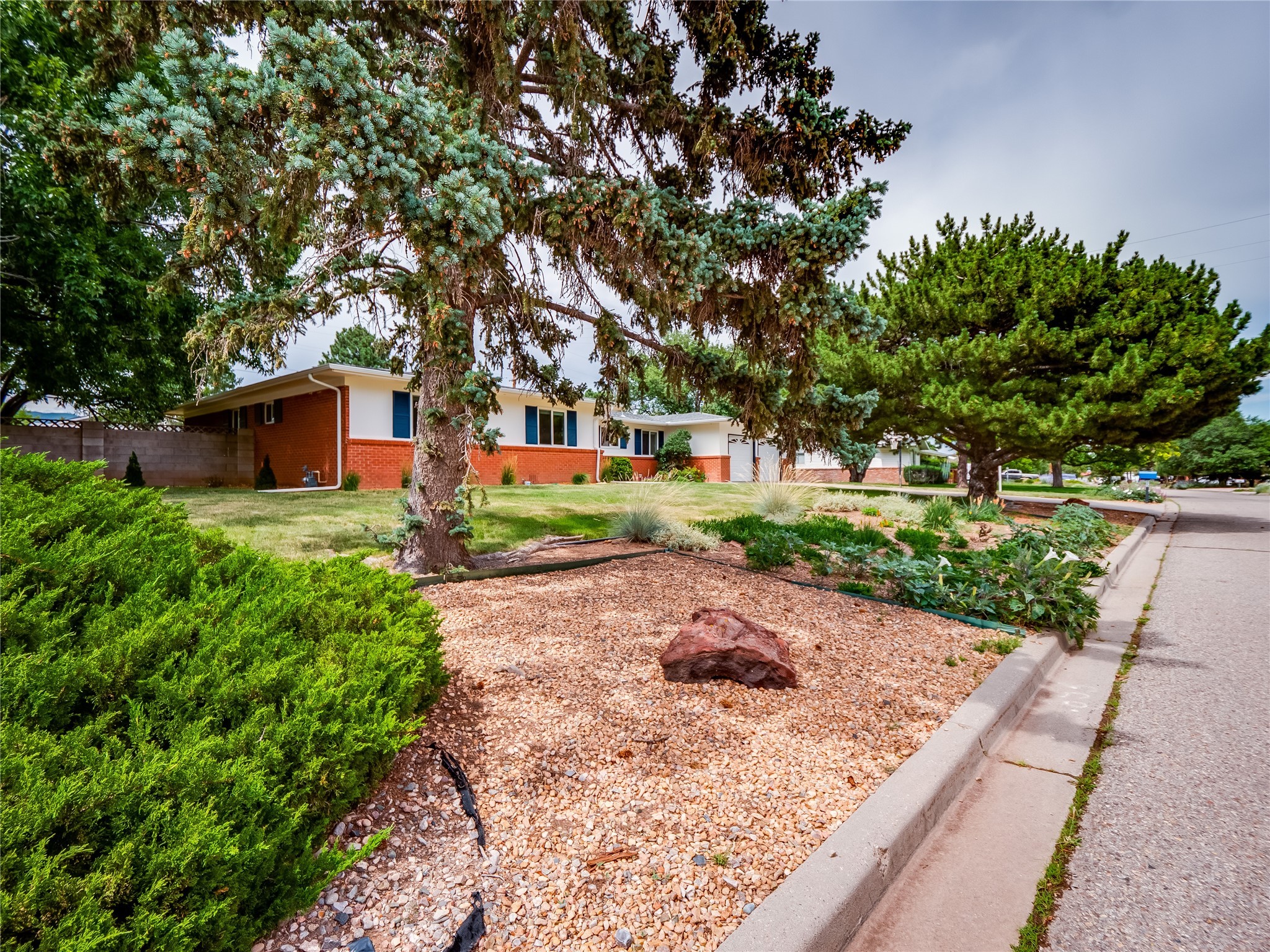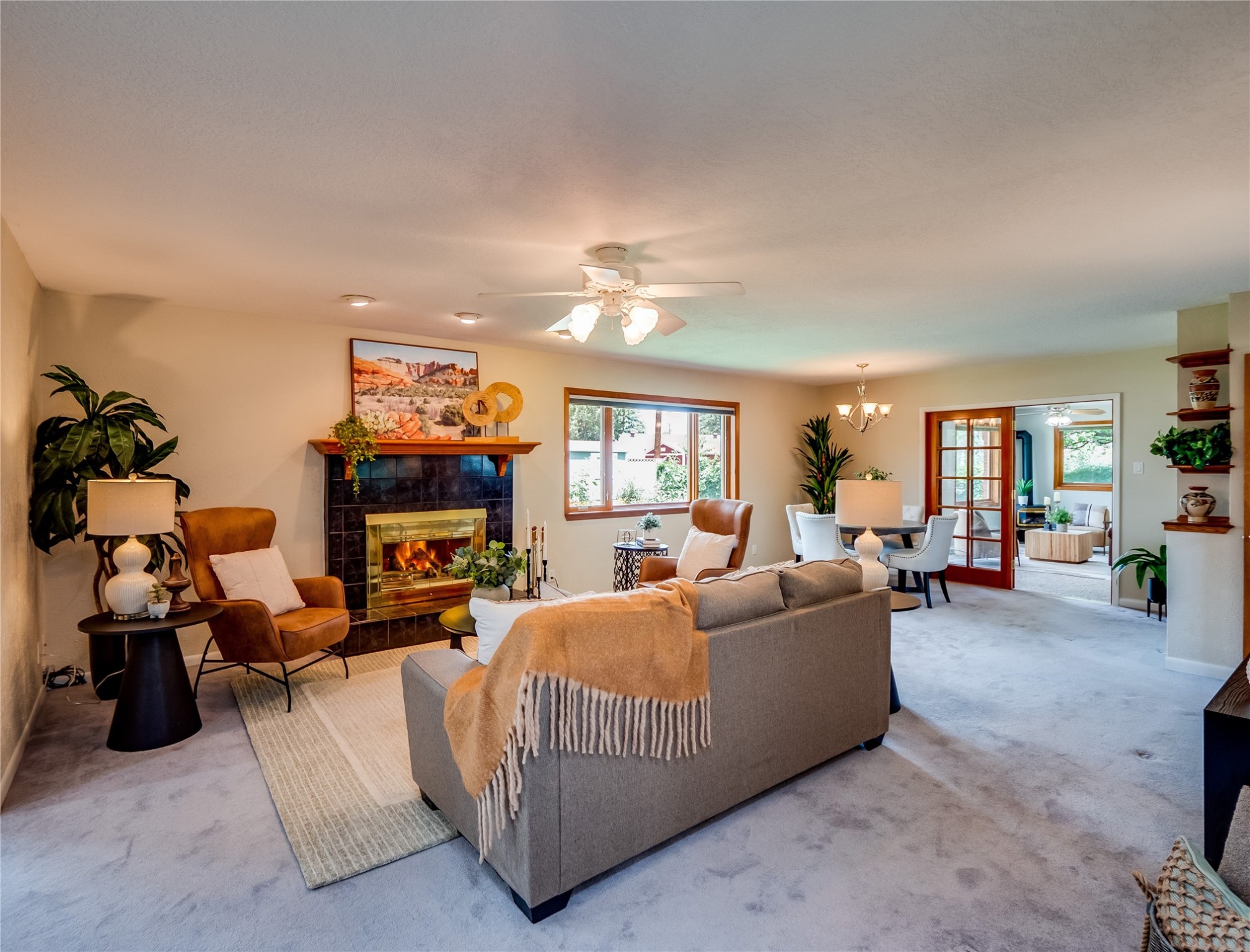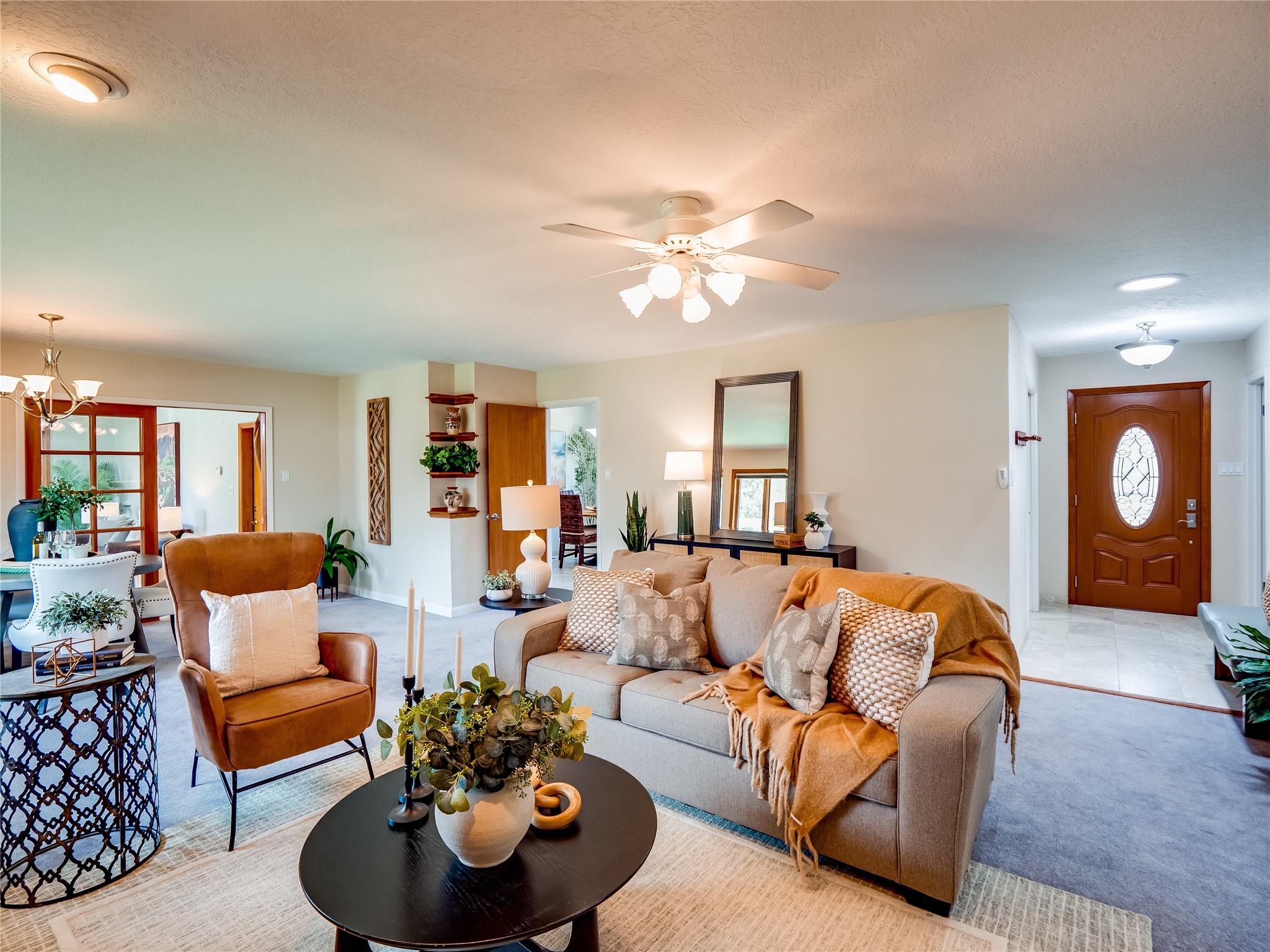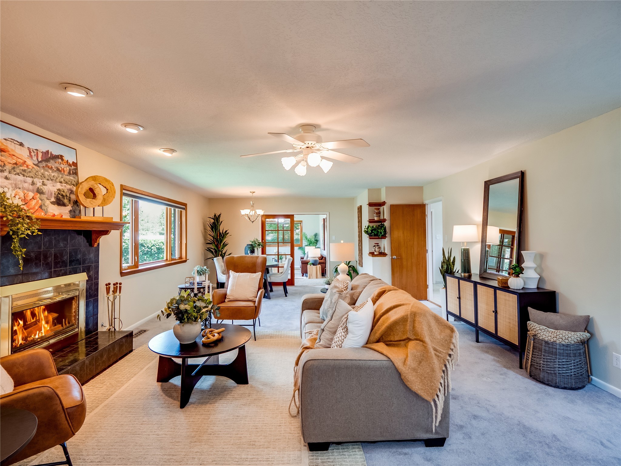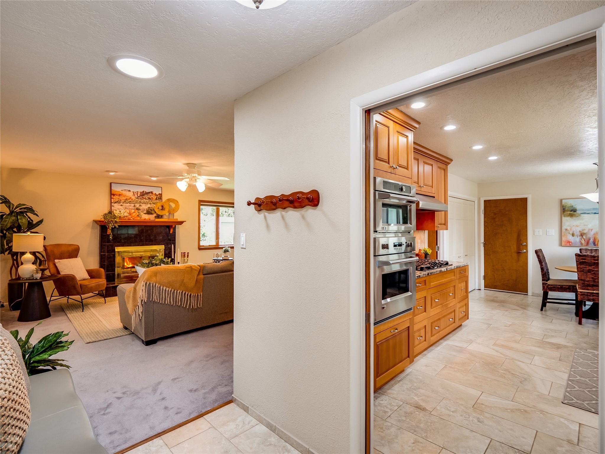 This beautifully remodeled custom Ranch-style home sits on a spacious corner lot with a meticulously maintained front yard. Step inside through the tiled foyer and into the expansive living and dining area, where plush carpeting and a wood-burning fireplace create a warm and inviting atmosphere. Just off the living space, a step-down family room with a cozy gas stove and sliding glass doors provides direct access to the backyard. The heart of the home is the gorgeous remodeled galley-style kitchen, complete with cherry wood cabinets and chrome hardware, granite counters, a travertine tile backsplash, and stainless steel appliances including a five-burner gas stove and double oven. Off the breakfast nook there's a hidden laundry closet with a stackable washer and dryer. Access to the two-car garage with a workbench, attic storage, and EV charging outlet. A private office/den sits just off the living area behind elegant glass pocket doors. Down the hall, you'll find two nicely sized guest bedrooms, and a beautifully appointed guest bathroom with a marble-topped single sink vanity and a soaking tub. The spacious primary en-suite is a true retreat, featuring a large closet, built-in drawers and cabinets, and a chandelier that adds a touch of sophistication. The spa-like bath includes a double sink vanity with granite counters and chrome fixtures, radiant floor heating, built-in cabinetry, and a beautifully tiled walk-in shower with a glass enclosure. This home has been thoughtfully upgraded with a new roof, updated electrical panel, central air conditioning and heating unit, a new water heater, and more. The expansive backyard is a private haven with a lush lawn, colorful flower garden beds, mature fruit trees, ideal for entertaining or quiet enjoyment. Multiple access gates, including a wide side gate with a concrete pad for RV parking and more. With thoughtful design, high-end finishes, and impressive upgrades throughout, this move-in-ready home is a rare find!