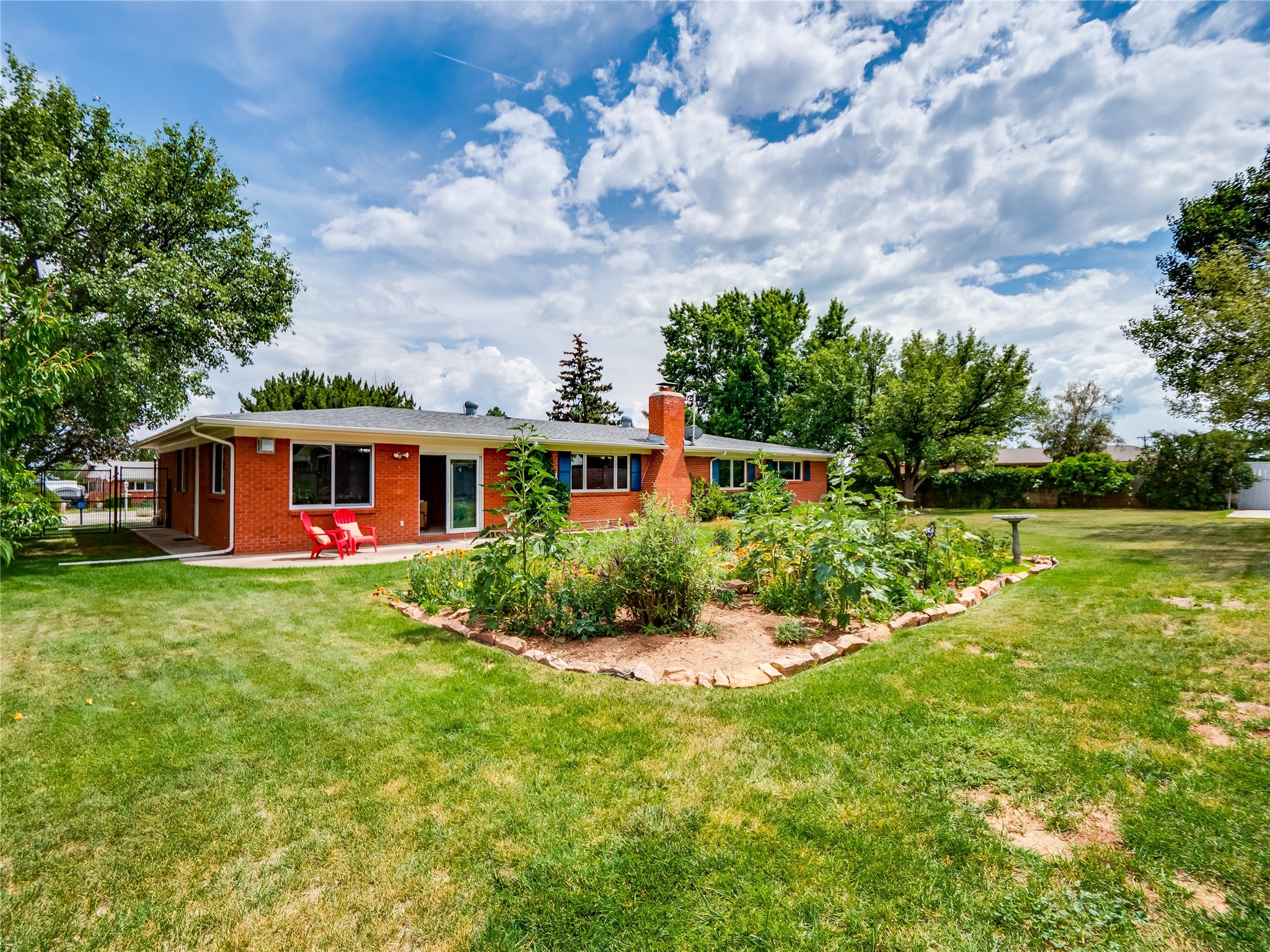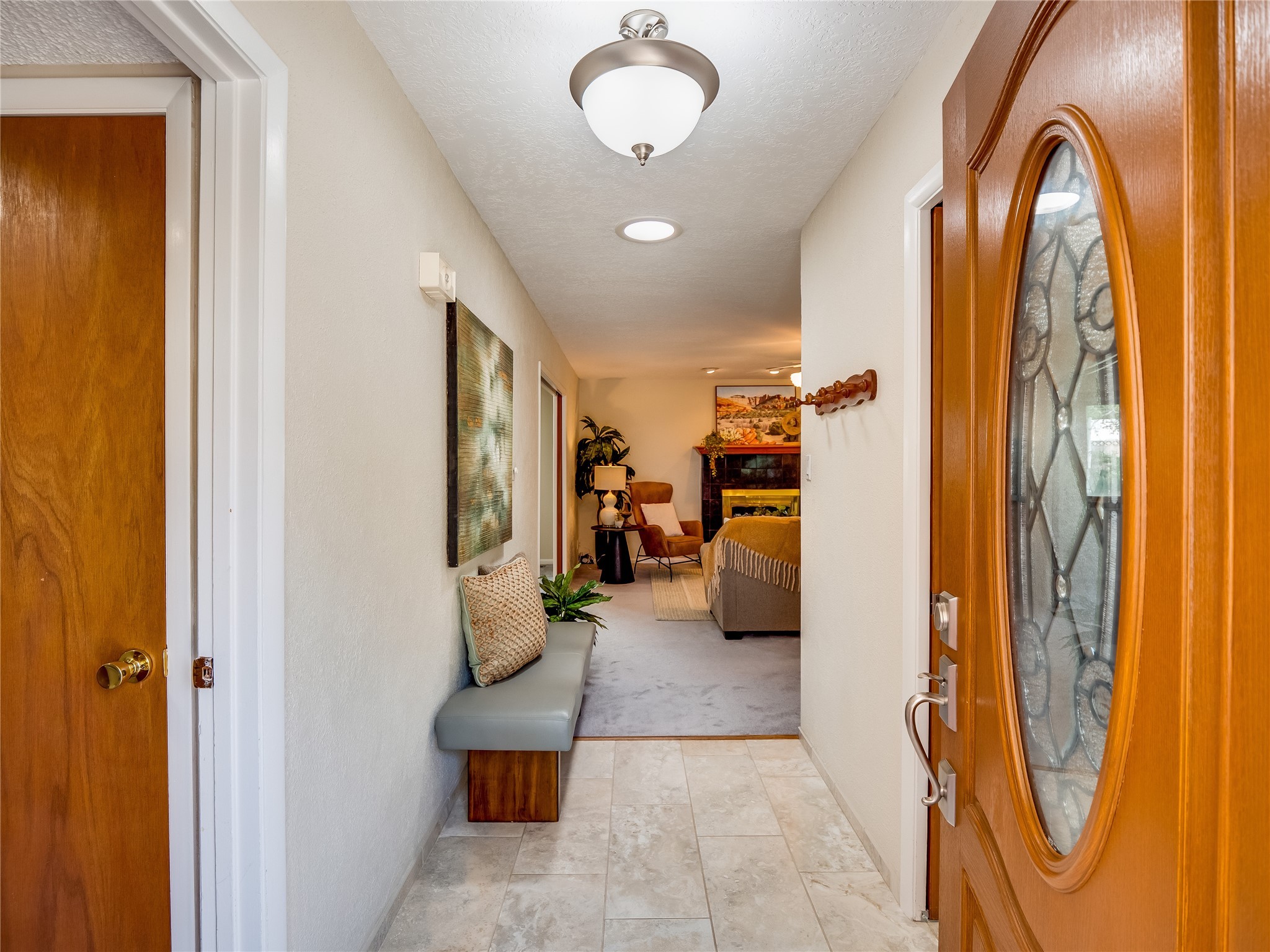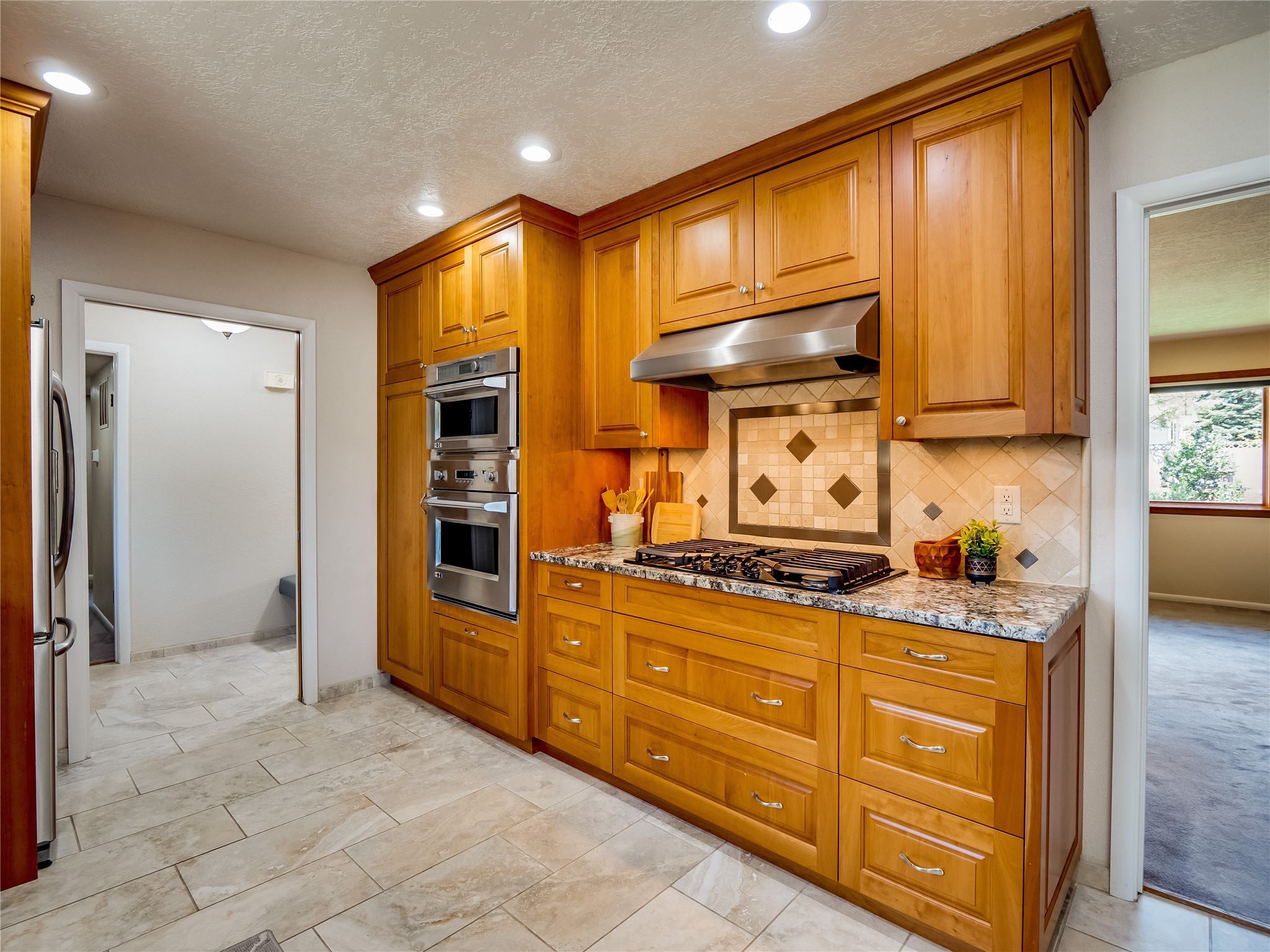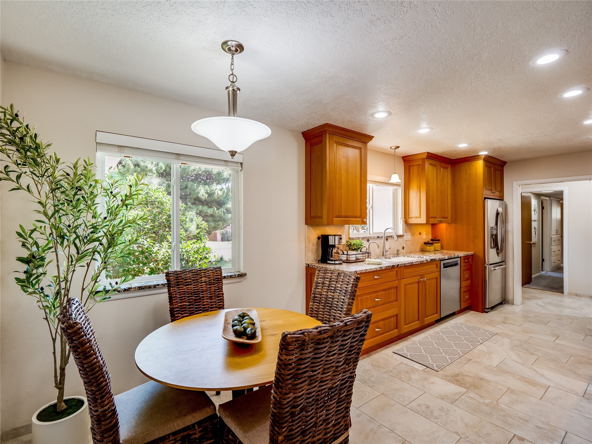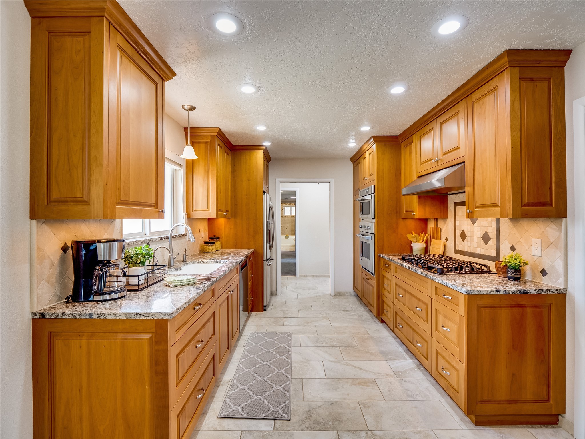 This beautifully remodeled custom Ranch-style home sits on a spacious corner lot with a meticulously maintained front yard. Step inside through the tiled foyer and into the expansive living and dining area, where plush carpeting and a wood-burning fireplace create a warm and inviting atmosphere. Just off the living space, a step-down family room with a cozy gas stove and sliding glass doors provides direct access to the backyard. The heart of the home is the gorgeous remodeled galley-style kitchen, complete with cherry wood cabinets and chrome hardware, granite counters, a travertine tile backsplash, and stainless steel appliances including a five-burner gas stove and double oven. Off the breakfast nook there's a hidden laundry closet with a stackable washer and dryer. Access to the two-car garage with a workbench, attic storage, and EV charging outlet. A private office/den sits just off the living area behind elegant glass pocket doors. Down the hall, you'll find two nicely sized guest bedrooms, and a beautifully appointed guest bathroom with a marble-topped single sink vanity and a soaking tub. The spacious primary en-suite is a true retreat, featuring a large closet, built-in drawers and cabinets, and a chandelier that adds a touch of sophistication. The spa-like bath includes a double sink vanity with granite counters and chrome fixtures, radiant floor heating, built-in cabinetry, and a beautifully tiled walk-in shower with a glass enclosure. This home has been thoughtfully upgraded with a new roof, updated electrical panel, central air conditioning and heating unit, a new water heater, and more. The expansive backyard is a private haven with a lush lawn, colorful flower garden beds, mature fruit trees, ideal for entertaining or quiet enjoyment. Multiple access gates, including a wide side gate with a concrete pad for RV parking and more. With thoughtful design, high-end finishes, and impressive upgrades throughout, this move-in-ready home is a rare find!