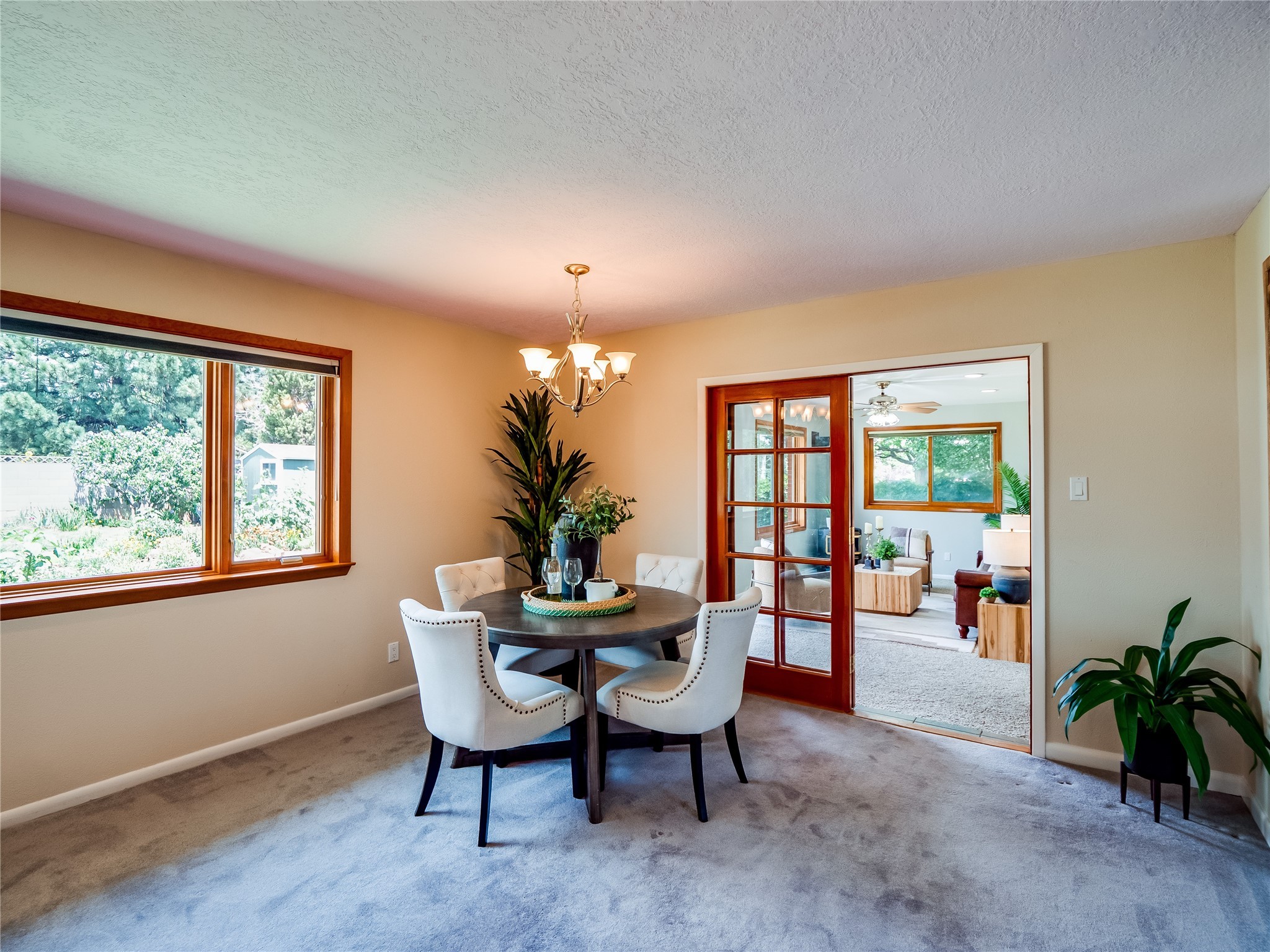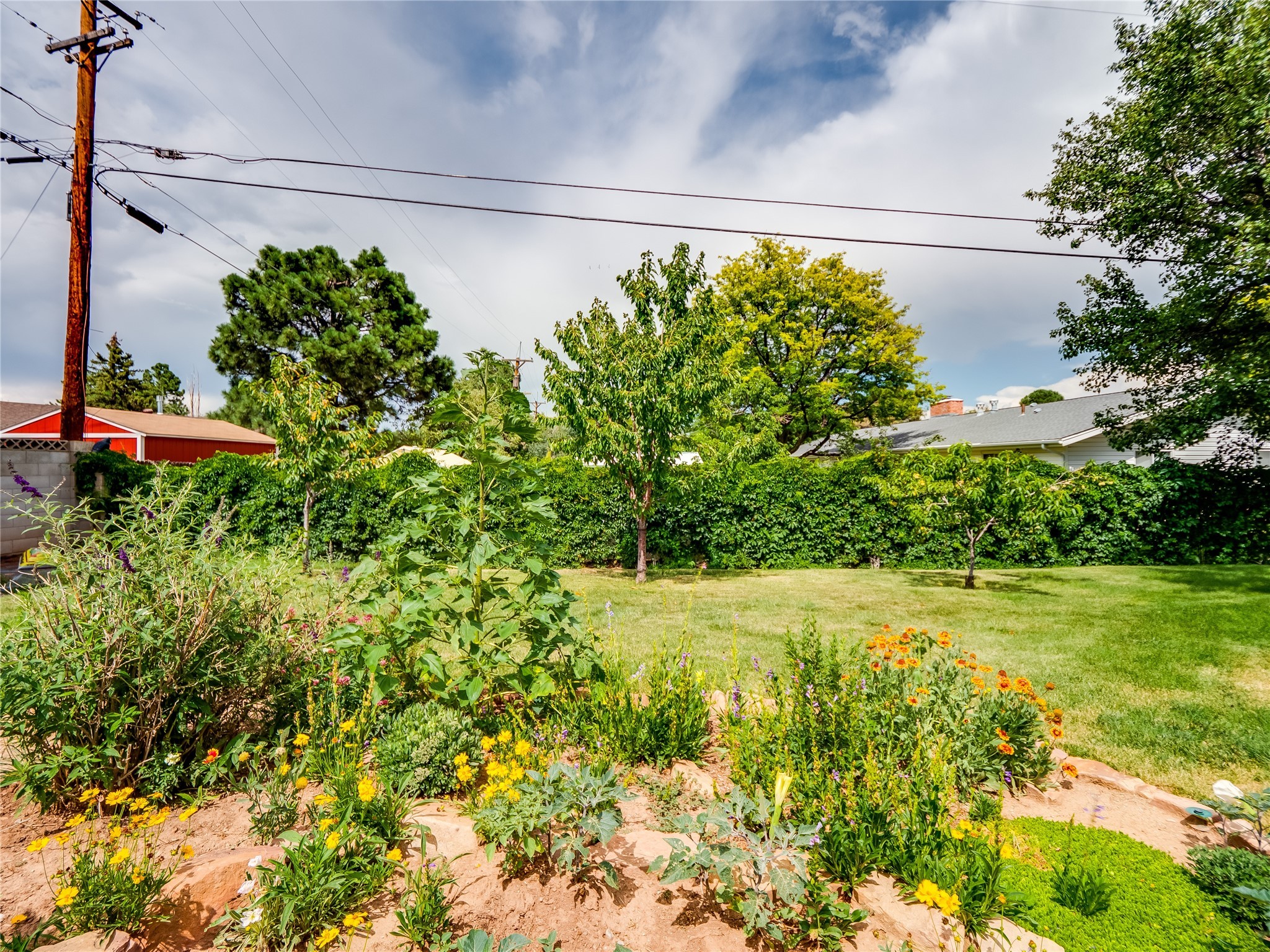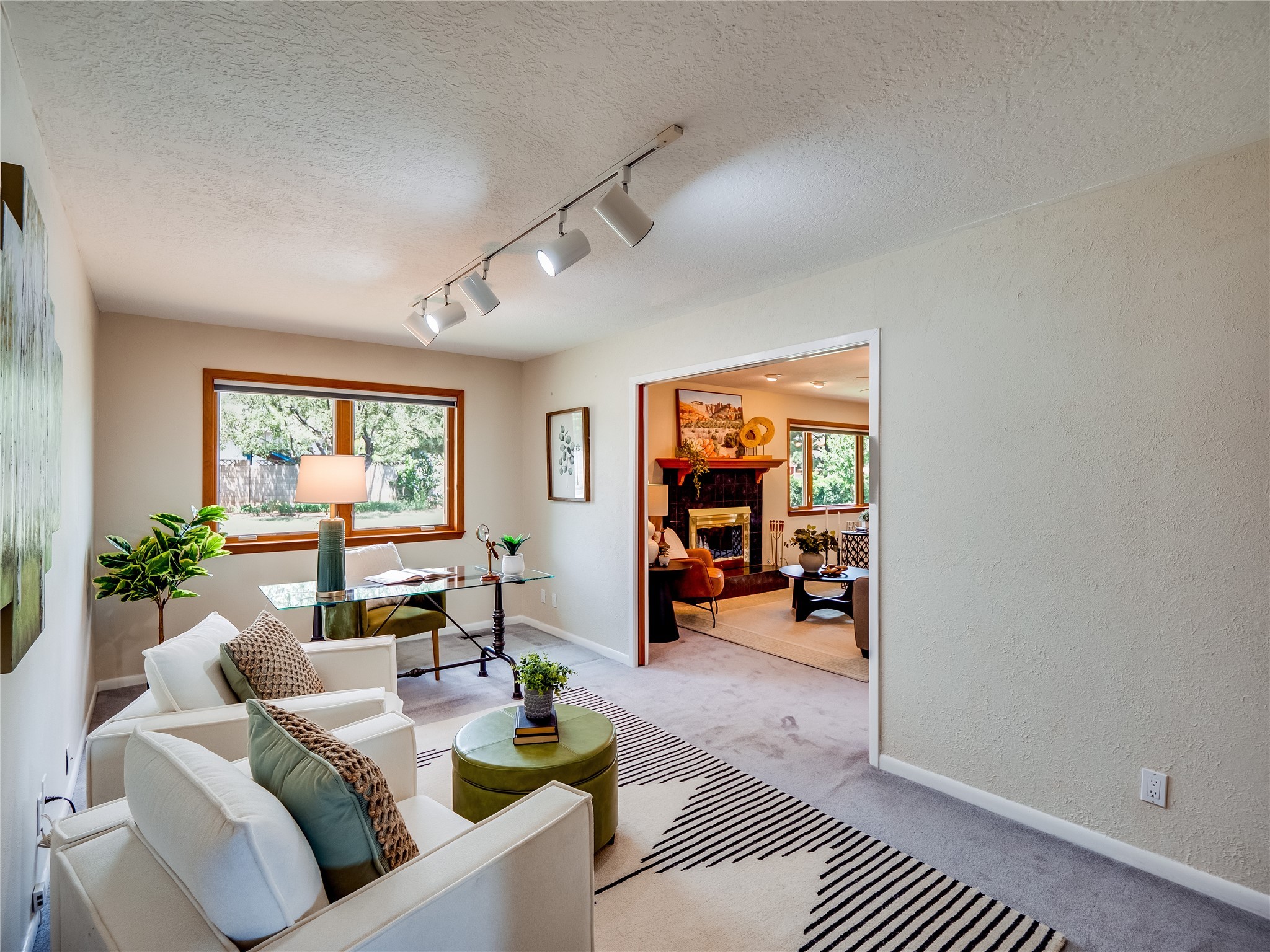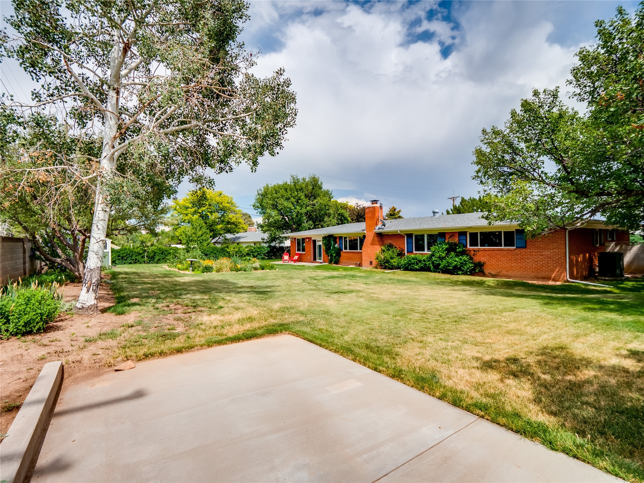 This beautifully remodeled custom Ranch-style home sits on a spacious corner lot with a meticulously maintained front yard. Step inside through the tiled foyer and into the expansive living and dining area, where plush carpeting and a wood-burning fireplace create a warm and inviting atmosphere. Just off the living space, a step-down family room with a cozy gas stove and sliding glass doors provides direct access to the backyard. The heart of the home is the gorgeous remodeled galley-style kitchen, complete with cherry wood cabinets and chrome hardware, granite counters, a travertine tile backsplash, and stainless steel appliances including a five-burner gas stove and double oven. Off the breakfast nook there's a hidden laundry closet with a stackable washer and dryer. Access to the two-car garage with a workbench, attic storage, and EV charging outlet. A private office/den sits just off the living area behind elegant glass pocket doors. Down the hall, you'll find two nicely sized guest bedrooms, and a beautifully appointed guest bathroom with a marble-topped single sink vanity and a soaking tub. The spacious primary en-suite is a true retreat, featuring a large closet, built-in drawers and cabinets, and a chandelier that adds a touch of sophistication. The spa-like bath includes a double sink vanity with granite counters and chrome fixtures, radiant floor heating, built-in cabinetry, and a beautifully tiled walk-in shower with a glass enclosure. This home has been thoughtfully upgraded with a new roof, updated electrical panel, central air conditioning and heating unit, a new water heater, and more. The expansive backyard is a private haven with a lush lawn, colorful flower garden beds, mature fruit trees, ideal for entertaining or quiet enjoyment. Multiple access gates, including a wide side gate with a concrete pad for RV parking and more. With thoughtful design, high-end finishes, and impressive upgrades throughout, this move-in-ready home is a rare find!