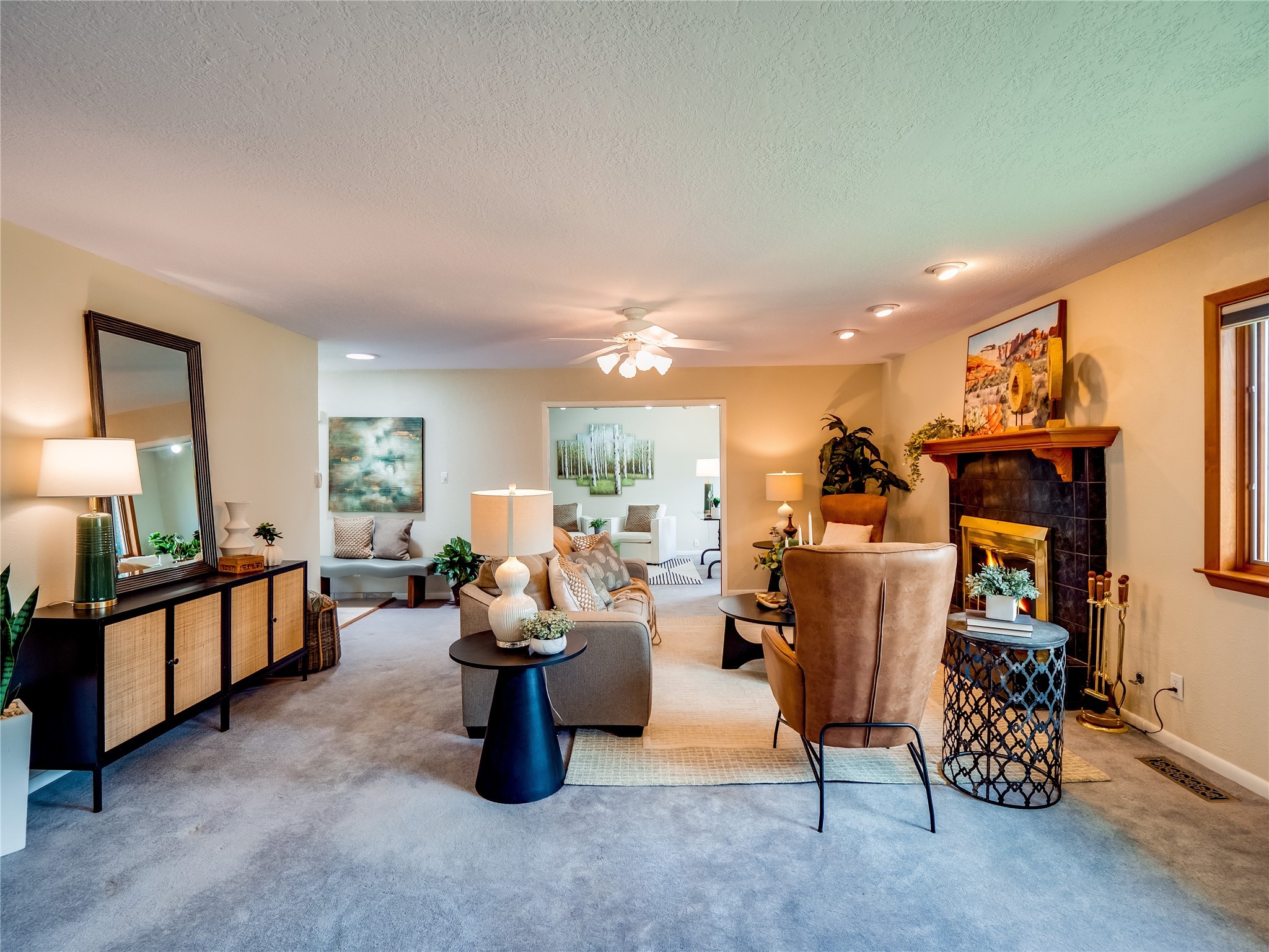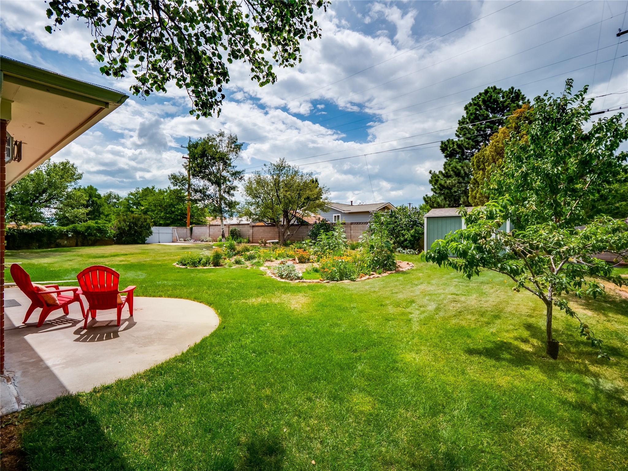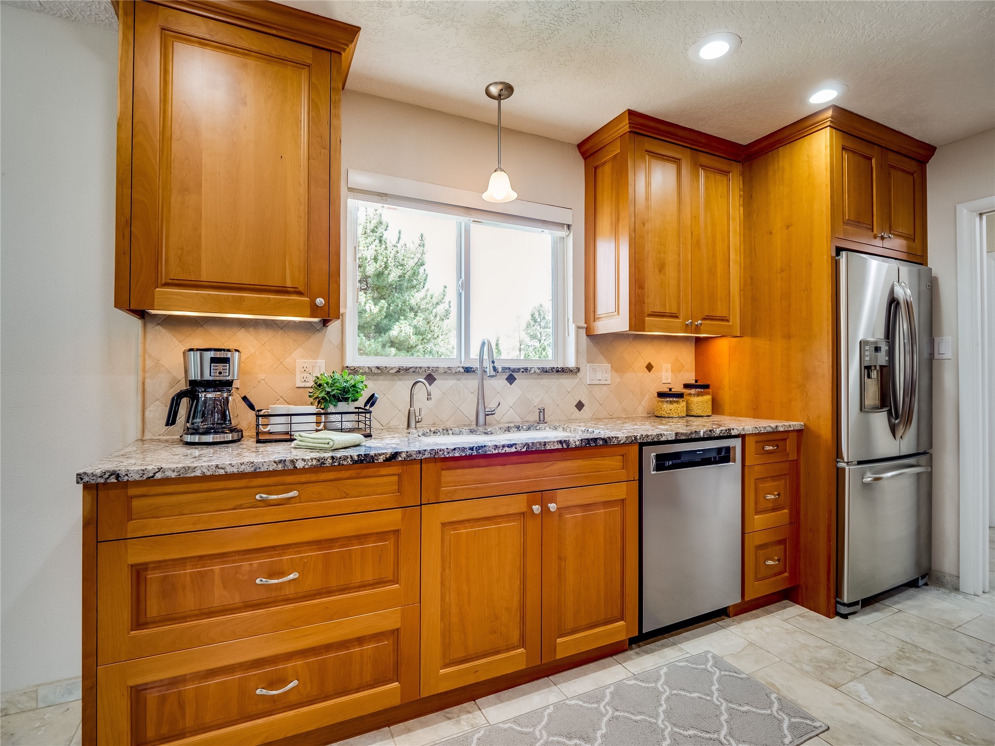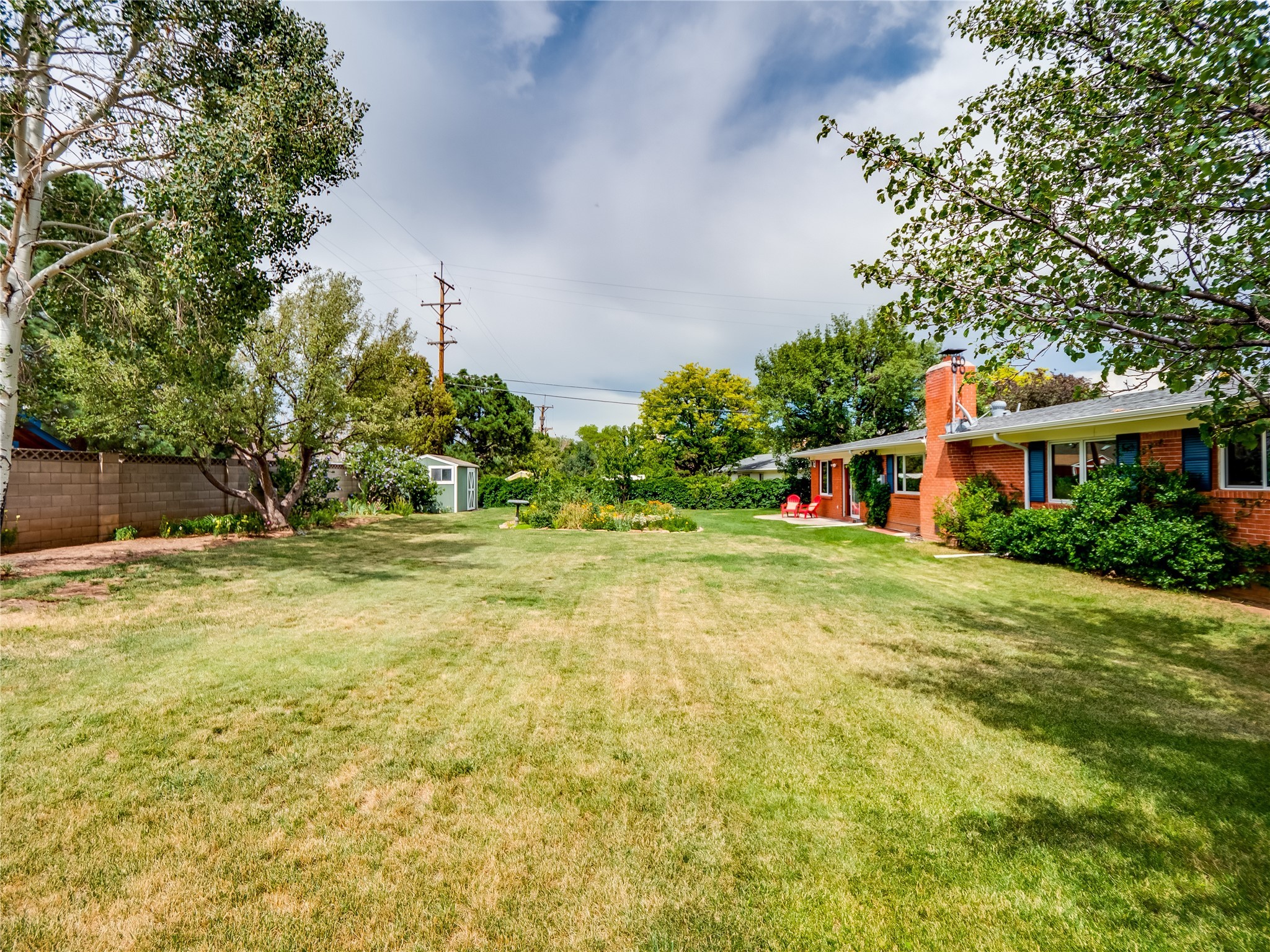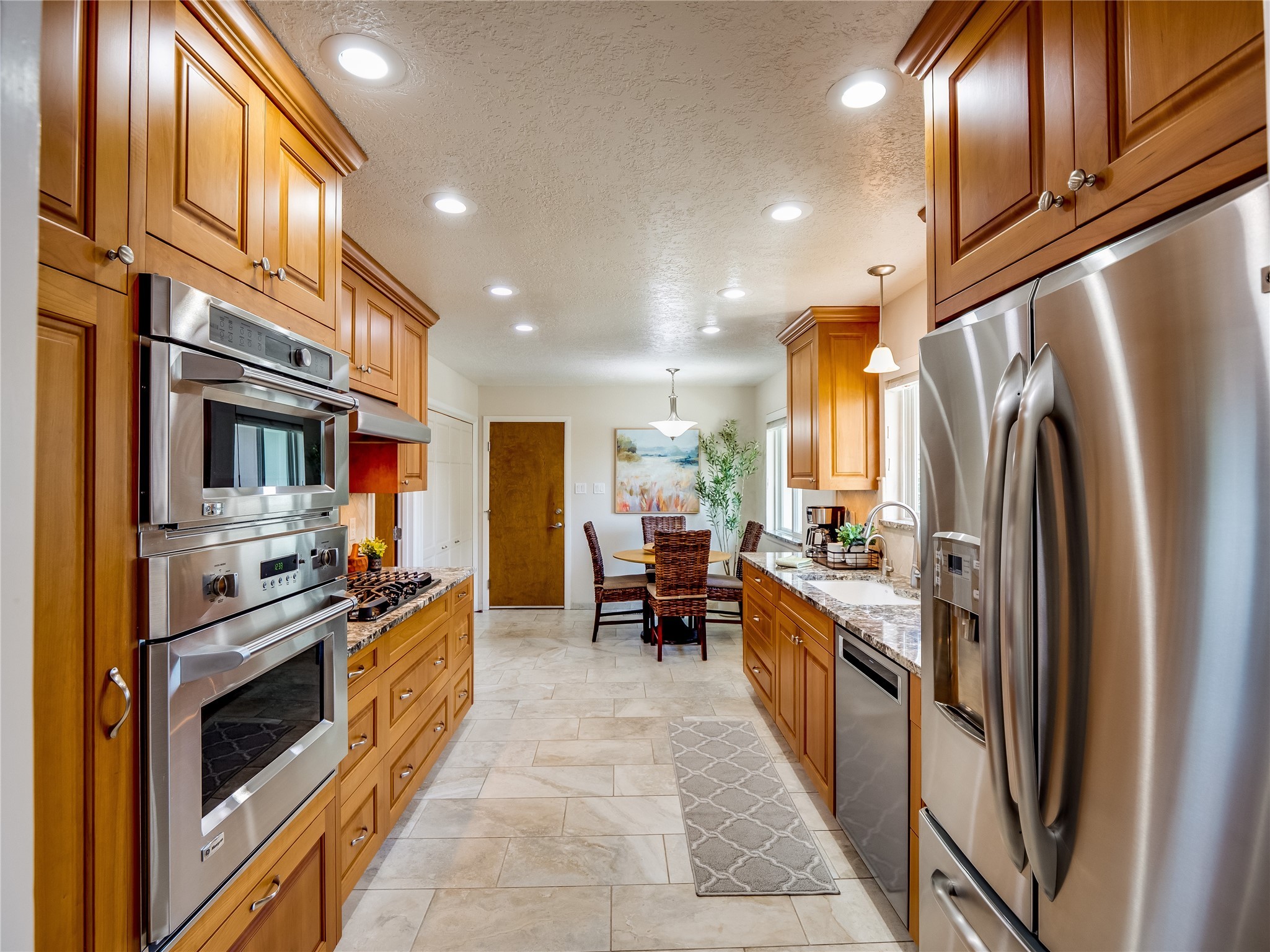 This beautifully remodeled custom Ranch-style home sits on a spacious corner lot with a meticulously maintained front yard. Step inside through the tiled foyer and into the expansive living and dining area, where plush carpeting and a wood-burning fireplace create a warm and inviting atmosphere. Just off the living space, a step-down family room with a cozy gas stove and sliding glass doors provides direct access to the backyard. The heart of the home is the gorgeous remodeled galley-style kitchen, complete with cherry wood cabinets and chrome hardware, granite counters, a travertine tile backsplash, and stainless steel appliances including a five-burner gas stove and double oven. Off the breakfast nook there's a hidden laundry closet with a stackable washer and dryer. Access to the two-car garage with a workbench, attic storage, and EV charging outlet. A private office/den sits just off the living area behind elegant glass pocket doors. Down the hall, you'll find two nicely sized guest bedrooms, and a beautifully appointed guest bathroom with a marble-topped single sink vanity and a soaking tub. The spacious primary en-suite is a true retreat, featuring a large closet, built-in drawers and cabinets, and a chandelier that adds a touch of sophistication. The spa-like bath includes a double sink vanity with granite counters and chrome fixtures, radiant floor heating, built-in cabinetry, and a beautifully tiled walk-in shower with a glass enclosure. This home has been thoughtfully upgraded with a new roof, updated electrical panel, central air conditioning and heating unit, a new water heater, and more. The expansive backyard is a private haven with a lush lawn, colorful flower garden beds, mature fruit trees, ideal for entertaining or quiet enjoyment. Multiple access gates, including a wide side gate with a concrete pad for RV parking and more. With thoughtful design, high-end finishes, and impressive upgrades throughout, this move-in-ready home is a rare find!