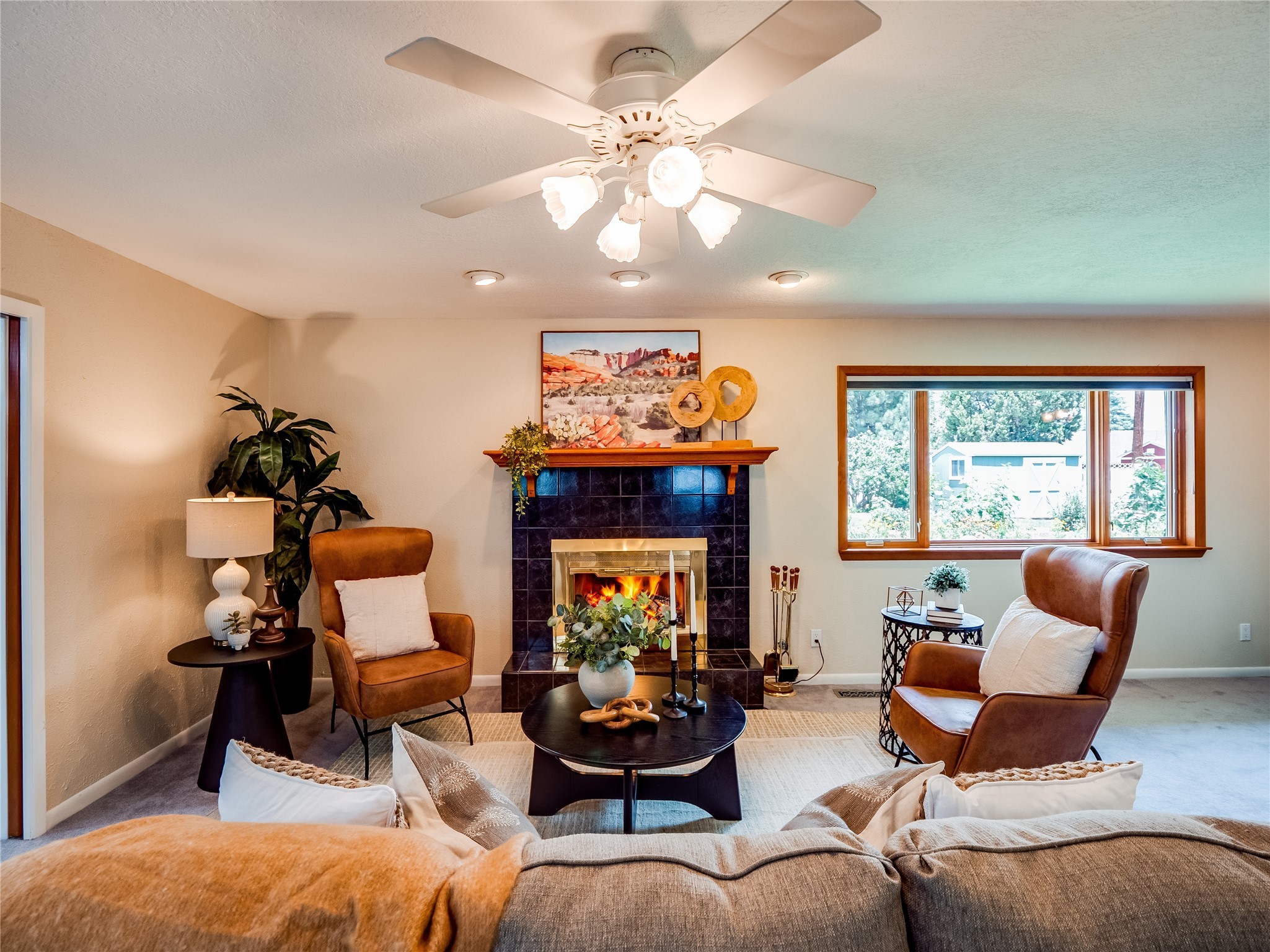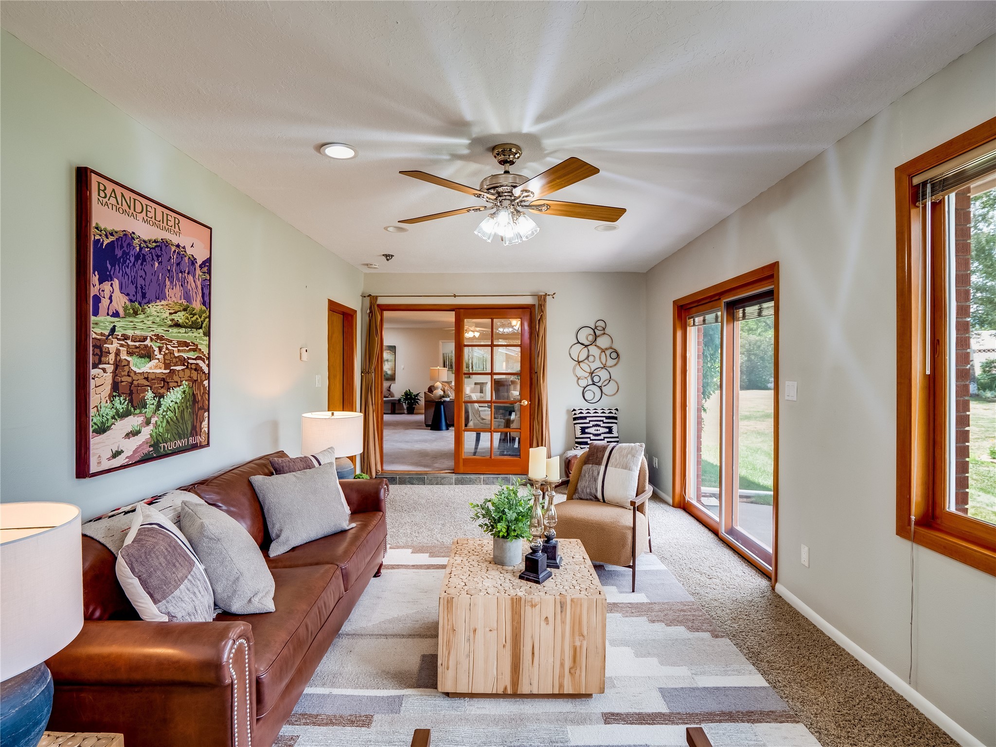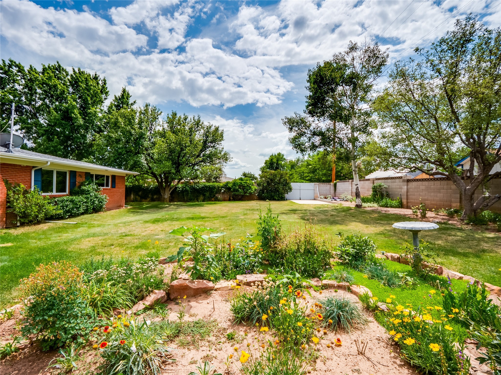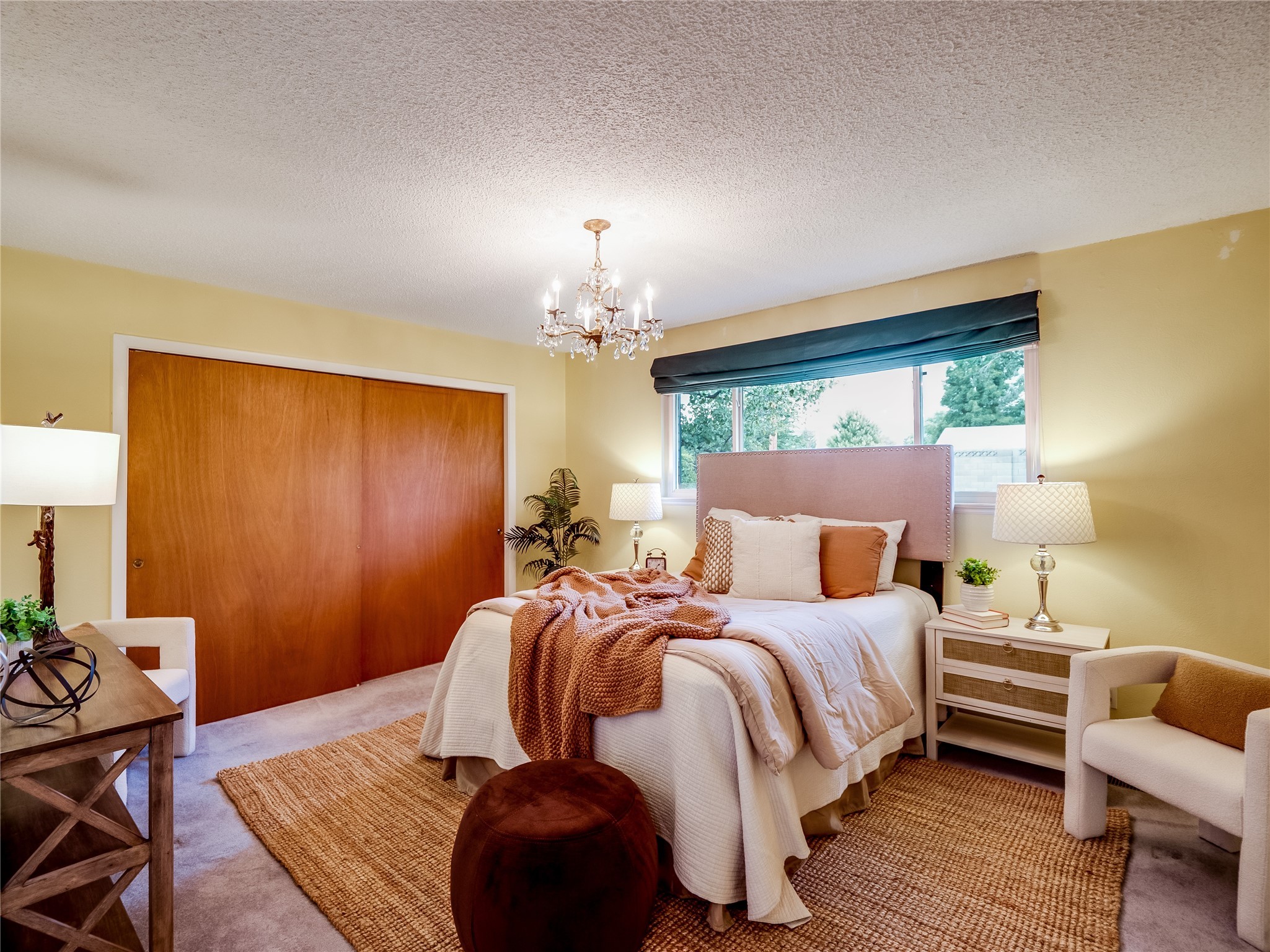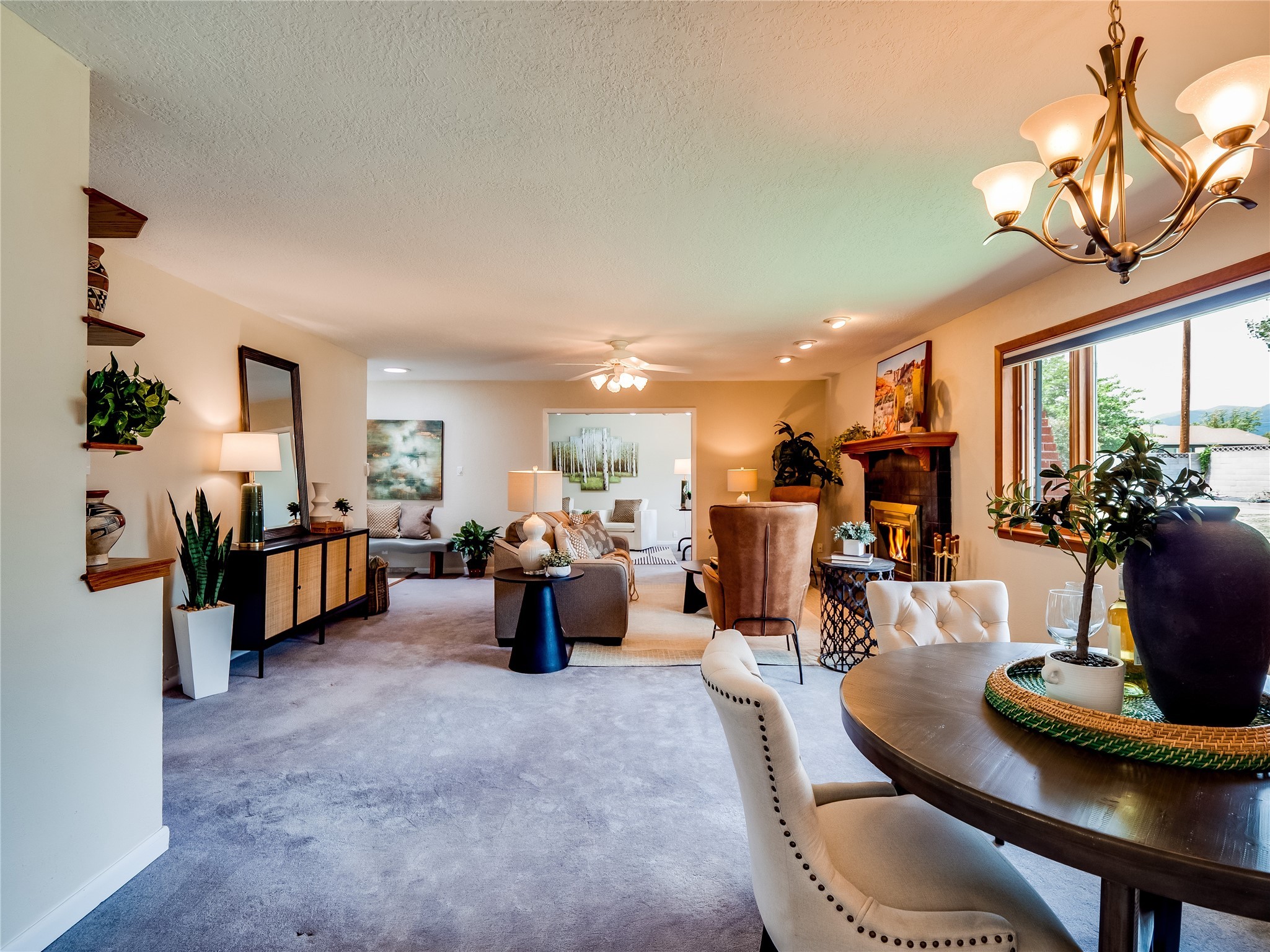 This beautifully remodeled custom Ranch-style home sits on a spacious corner lot with a meticulously maintained front yard. Step inside through the tiled foyer and into the expansive living and dining area, where plush carpeting and a wood-burning fireplace create a warm and inviting atmosphere. Just off the living space, a step-down family room with a cozy gas stove and sliding glass doors provides direct access to the backyard. The heart of the home is the gorgeous remodeled galley-style kitchen, complete with cherry wood cabinets and chrome hardware, granite counters, a travertine tile backsplash, and stainless steel appliances including a five-burner gas stove and double oven. Off the breakfast nook there's a hidden laundry closet with a stackable washer and dryer. Access to the two-car garage with a workbench, attic storage, and EV charging outlet. A private office/den sits just off the living area behind elegant glass pocket doors. Down the hall, you'll find two nicely sized guest bedrooms, and a beautifully appointed guest bathroom with a marble-topped single sink vanity and a soaking tub. The spacious primary en-suite is a true retreat, featuring a large closet, built-in drawers and cabinets, and a chandelier that adds a touch of sophistication. The spa-like bath includes a double sink vanity with granite counters and chrome fixtures, radiant floor heating, built-in cabinetry, and a beautifully tiled walk-in shower with a glass enclosure. This home has been thoughtfully upgraded with a new roof, updated electrical panel, central air conditioning and heating unit, a new water heater, and more. The expansive backyard is a private haven with a lush lawn, colorful flower garden beds, mature fruit trees, ideal for entertaining or quiet enjoyment. Multiple access gates, including a wide side gate with a concrete pad for RV parking and more. With thoughtful design, high-end finishes, and impressive upgrades throughout, this move-in-ready home is a rare find!