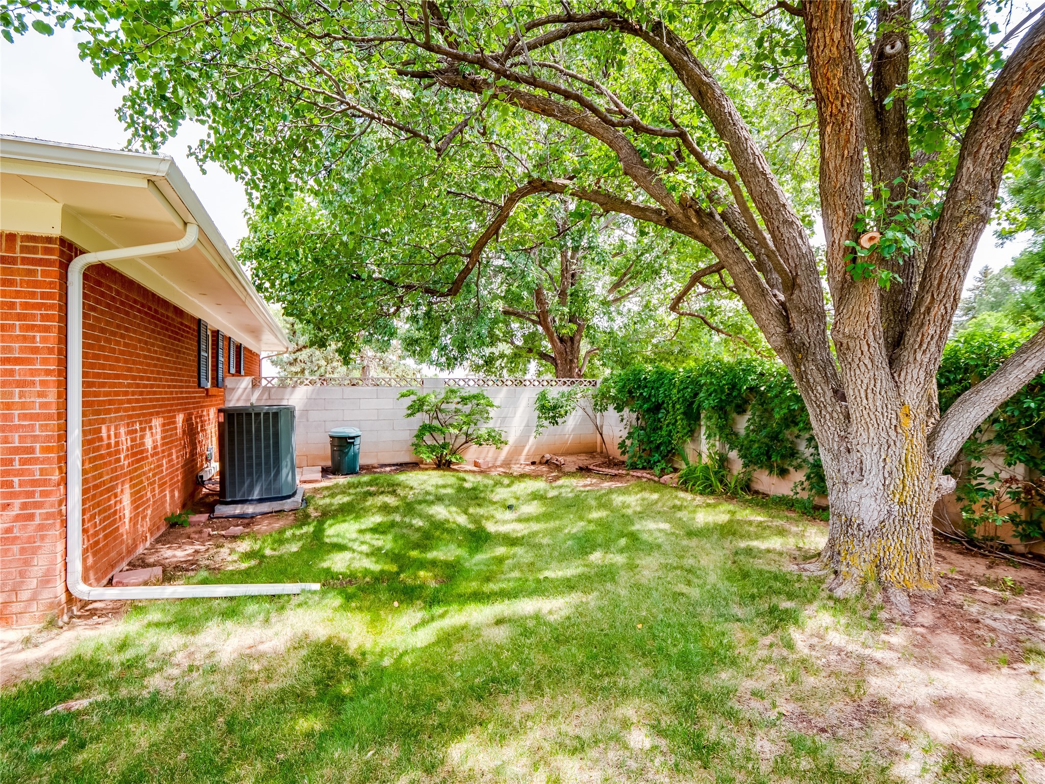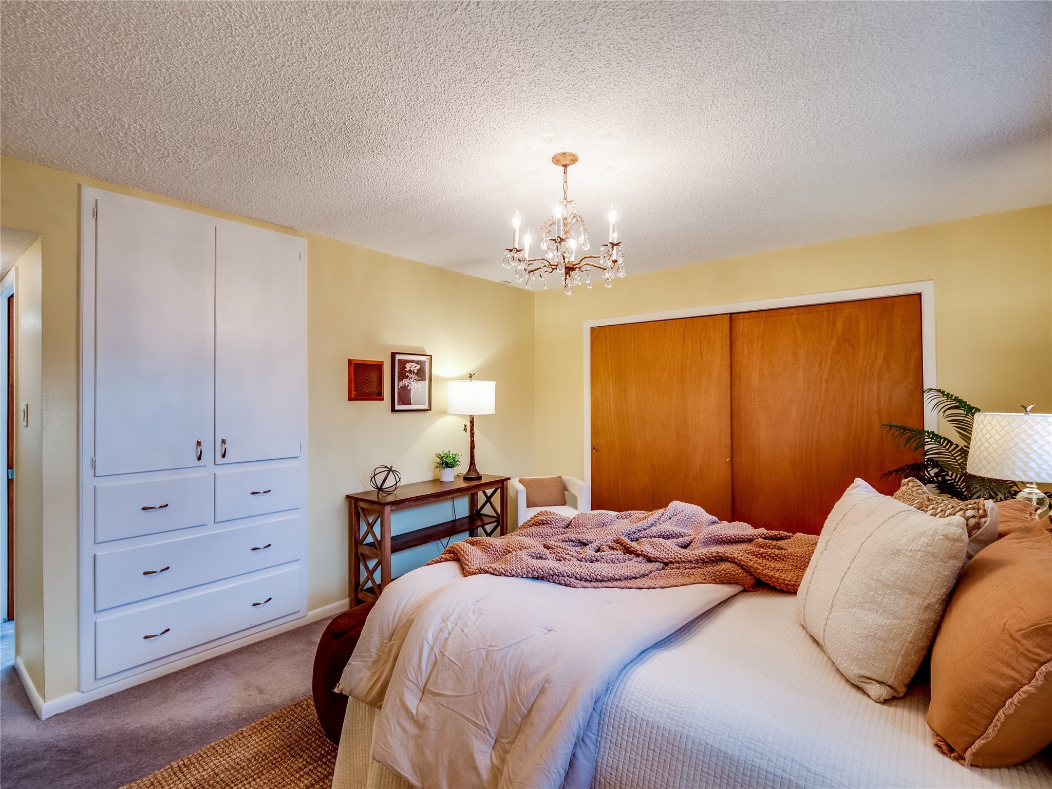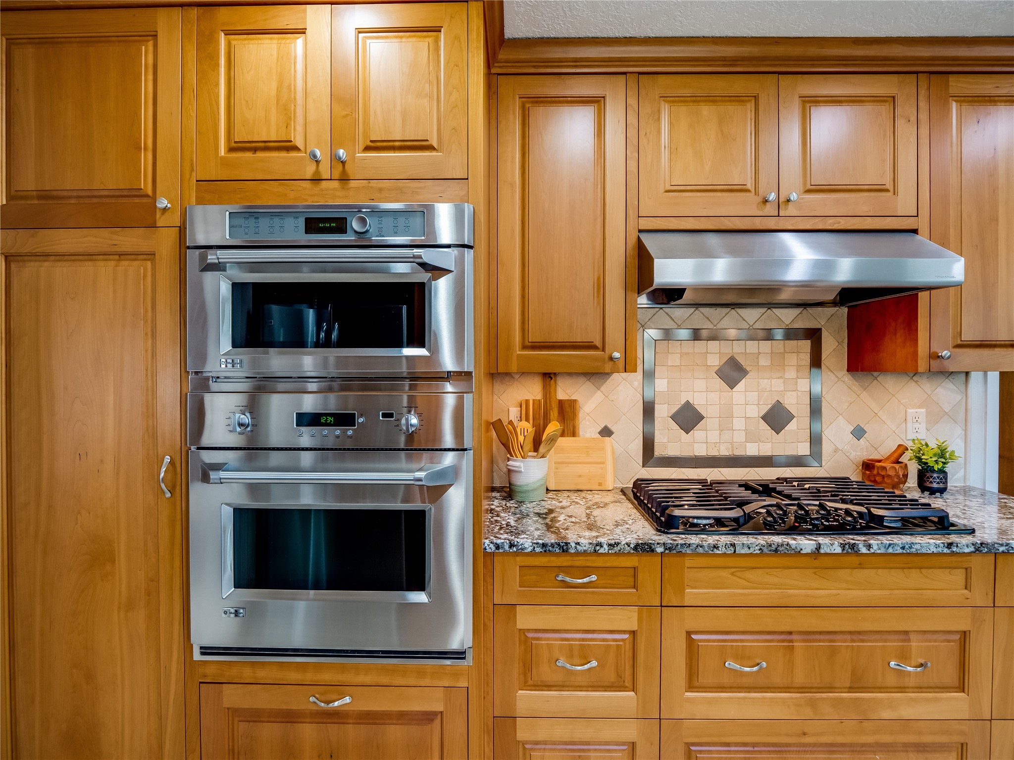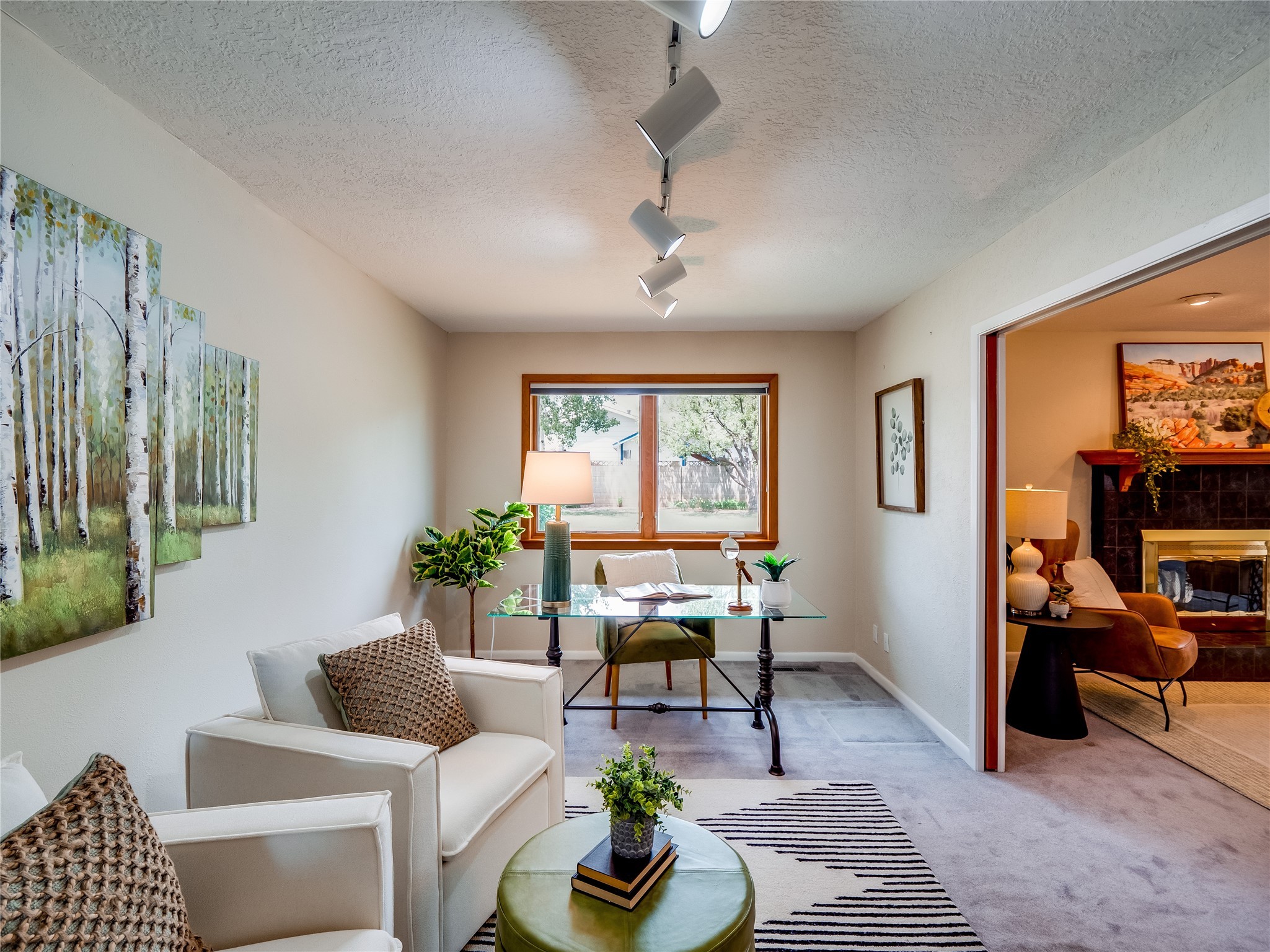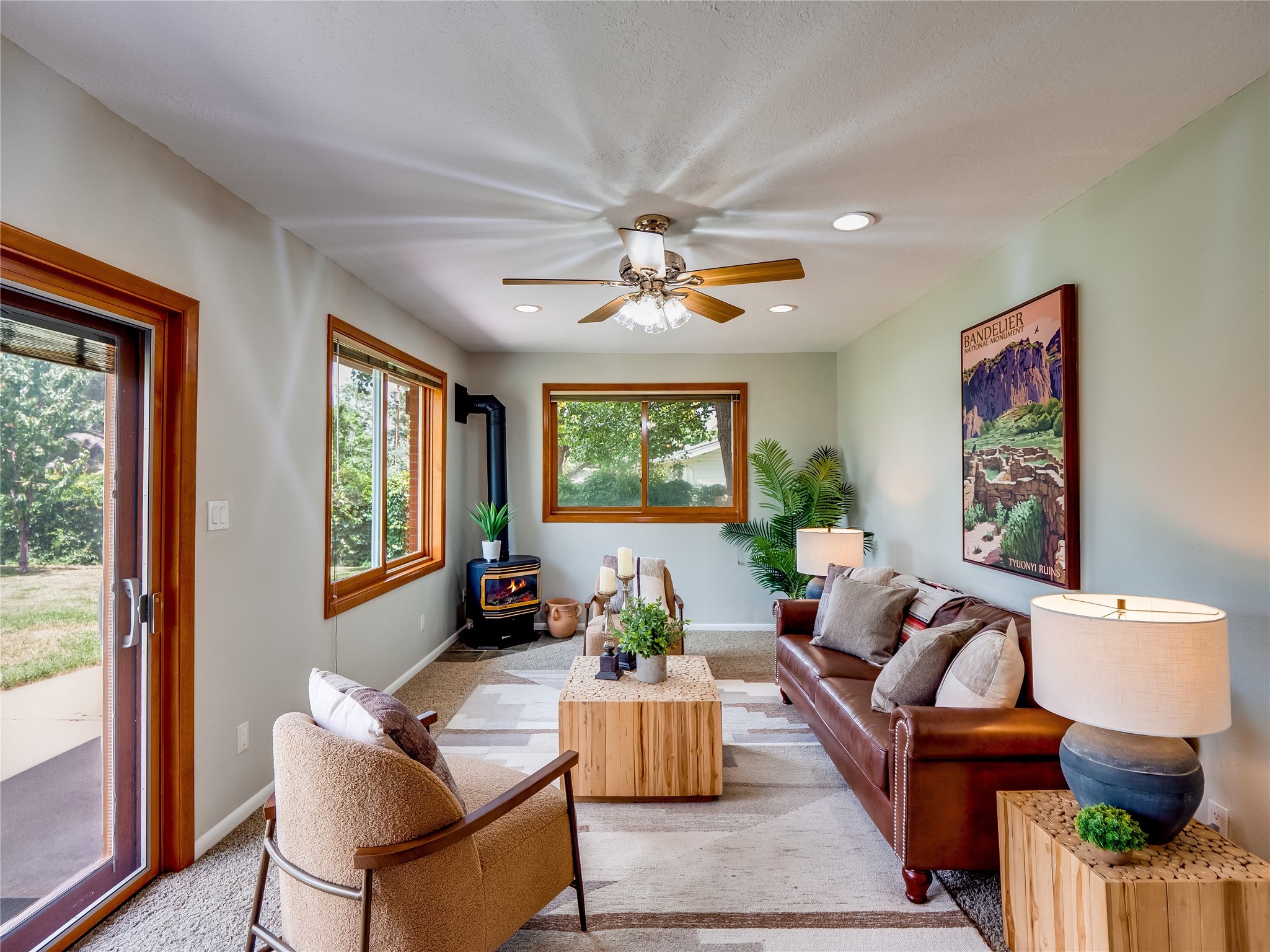 This beautifully remodeled custom Ranch-style home sits on a spacious corner lot with a meticulously maintained front yard. Step inside through the tiled foyer and into the expansive living and dining area, where plush carpeting and a wood-burning fireplace create a warm and inviting atmosphere. Just off the living space, a step-down family room with a cozy gas stove and sliding glass doors provides direct access to the backyard. The heart of the home is the gorgeous remodeled galley-style kitchen, complete with cherry wood cabinets and chrome hardware, granite counters, a travertine tile backsplash, and stainless steel appliances including a five-burner gas stove and double oven. Off the breakfast nook there's a hidden laundry closet with a stackable washer and dryer. Access to the two-car garage with a workbench, attic storage, and EV charging outlet. A private office/den sits just off the living area behind elegant glass pocket doors. Down the hall, you'll find two nicely sized guest bedrooms, and a beautifully appointed guest bathroom with a marble-topped single sink vanity and a soaking tub. The spacious primary en-suite is a true retreat, featuring a large closet, built-in drawers and cabinets, and a chandelier that adds a touch of sophistication. The spa-like bath includes a double sink vanity with granite counters and chrome fixtures, radiant floor heating, built-in cabinetry, and a beautifully tiled walk-in shower with a glass enclosure. This home has been thoughtfully upgraded with a new roof, updated electrical panel, central air conditioning and heating unit, a new water heater, and more. The expansive backyard is a private haven with a lush lawn, colorful flower garden beds, mature fruit trees, ideal for entertaining or quiet enjoyment. Multiple access gates, including a wide side gate with a concrete pad for RV parking and more. With thoughtful design, high-end finishes, and impressive upgrades throughout, this move-in-ready home is a rare find!