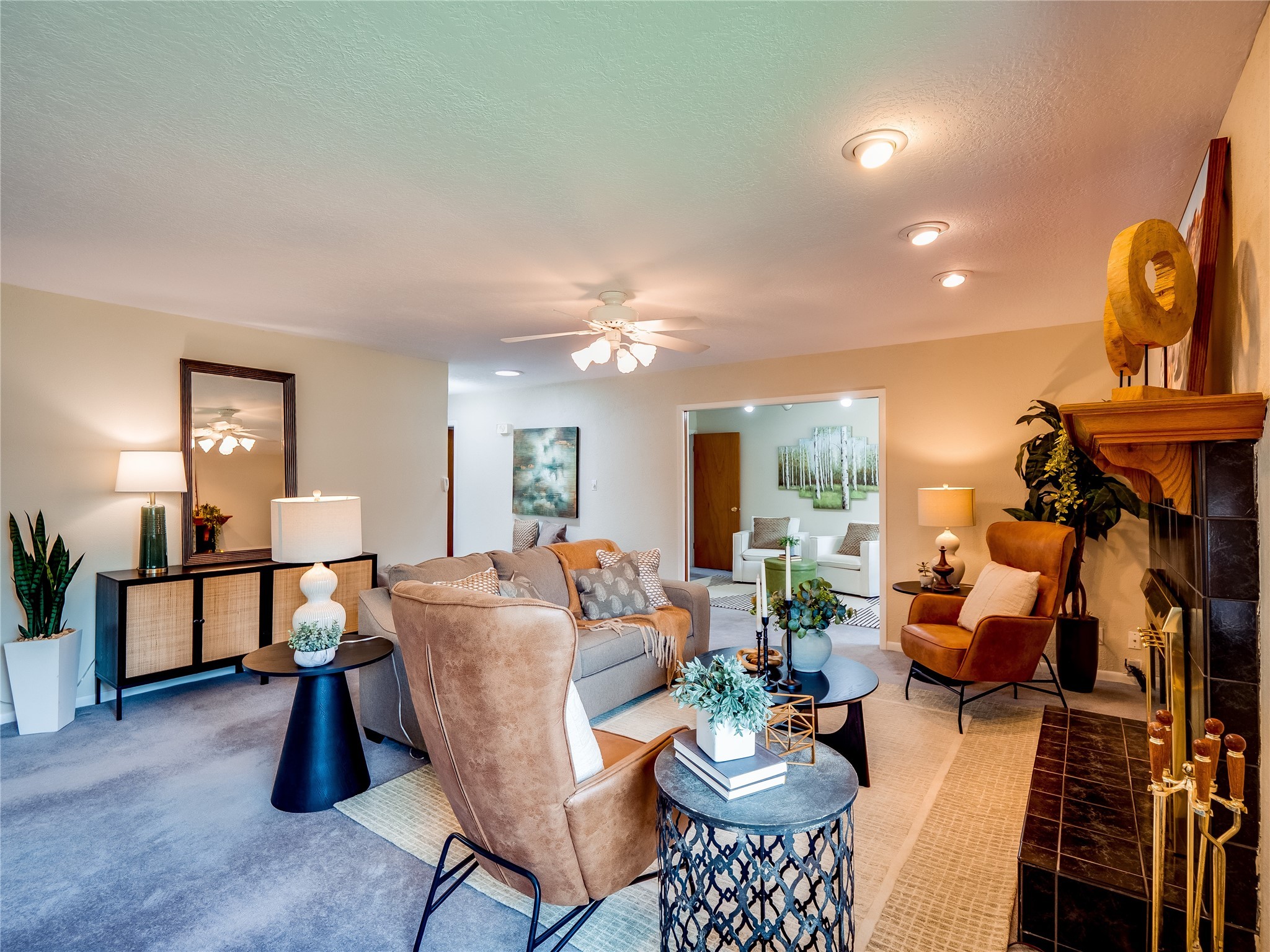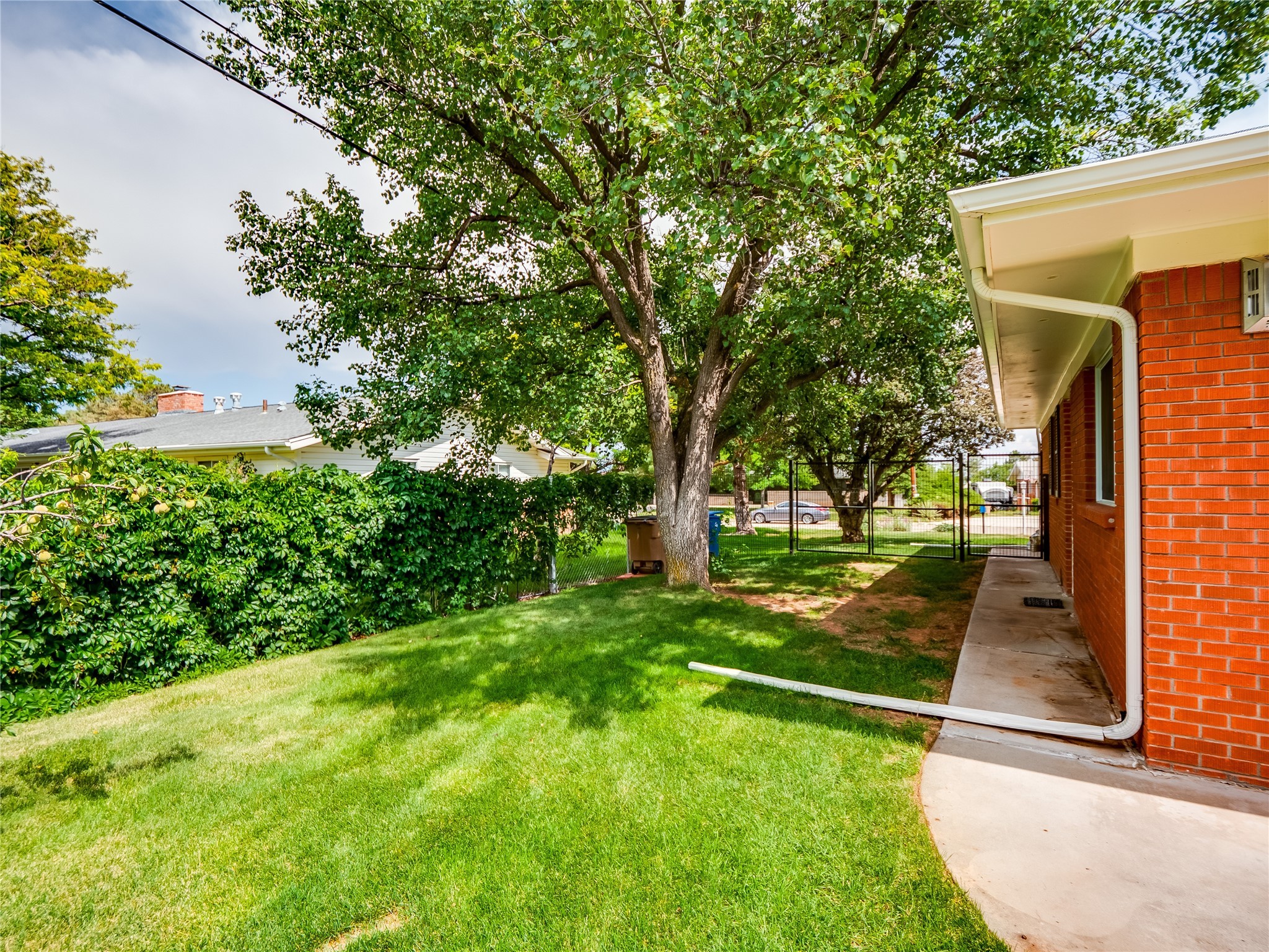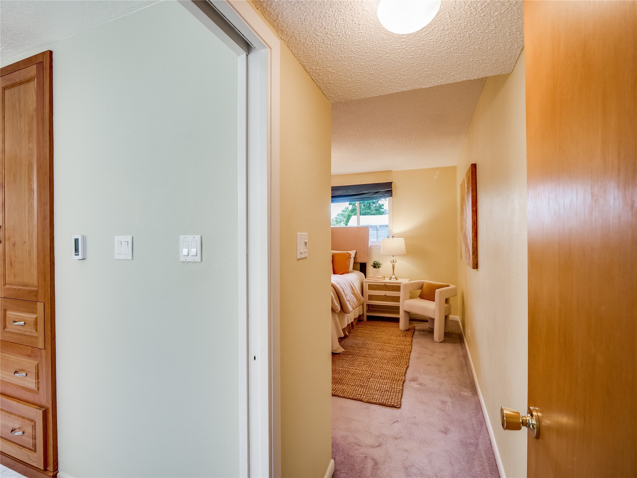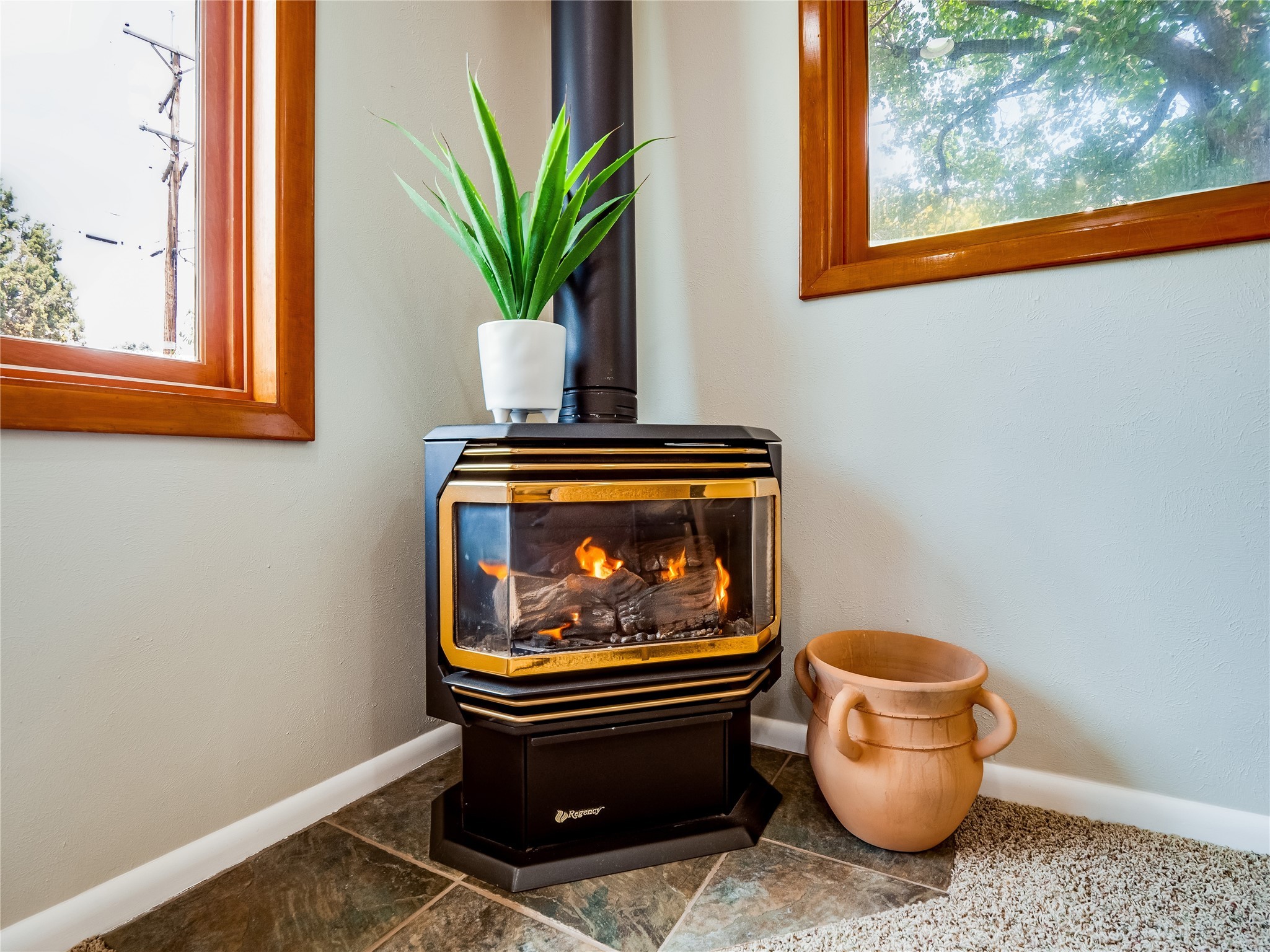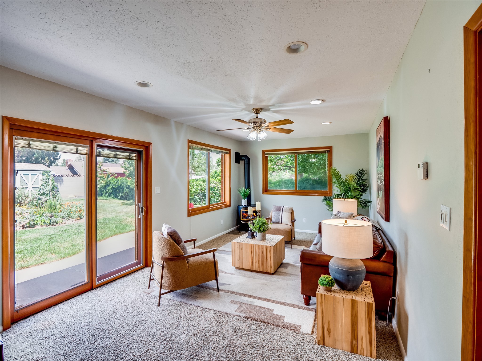 This beautifully remodeled custom Ranch-style home sits on a spacious corner lot with a meticulously maintained front yard. Step inside through the tiled foyer and into the expansive living and dining area, where plush carpeting and a wood-burning fireplace create a warm and inviting atmosphere. Just off the living space, a step-down family room with a cozy gas stove and sliding glass doors provides direct access to the backyard. The heart of the home is the gorgeous remodeled galley-style kitchen, complete with cherry wood cabinets and chrome hardware, granite counters, a travertine tile backsplash, and stainless steel appliances including a five-burner gas stove and double oven. Off the breakfast nook there's a hidden laundry closet with a stackable washer and dryer. Access to the two-car garage with a workbench, attic storage, and EV charging outlet. A private office/den sits just off the living area behind elegant glass pocket doors. Down the hall, you'll find two nicely sized guest bedrooms, and a beautifully appointed guest bathroom with a marble-topped single sink vanity and a soaking tub. The spacious primary en-suite is a true retreat, featuring a large closet, built-in drawers and cabinets, and a chandelier that adds a touch of sophistication. The spa-like bath includes a double sink vanity with granite counters and chrome fixtures, radiant floor heating, built-in cabinetry, and a beautifully tiled walk-in shower with a glass enclosure. This home has been thoughtfully upgraded with a new roof, updated electrical panel, central air conditioning and heating unit, a new water heater, and more. The expansive backyard is a private haven with a lush lawn, colorful flower garden beds, mature fruit trees, ideal for entertaining or quiet enjoyment. Multiple access gates, including a wide side gate with a concrete pad for RV parking and more. With thoughtful design, high-end finishes, and impressive upgrades throughout, this move-in-ready home is a rare find!