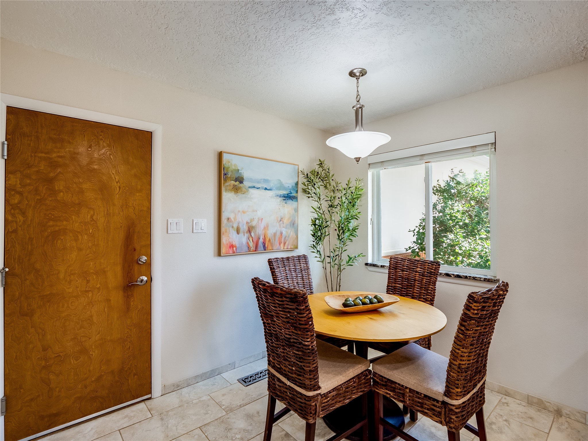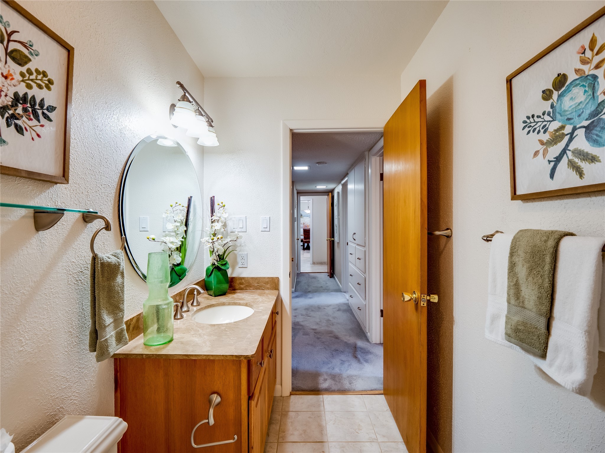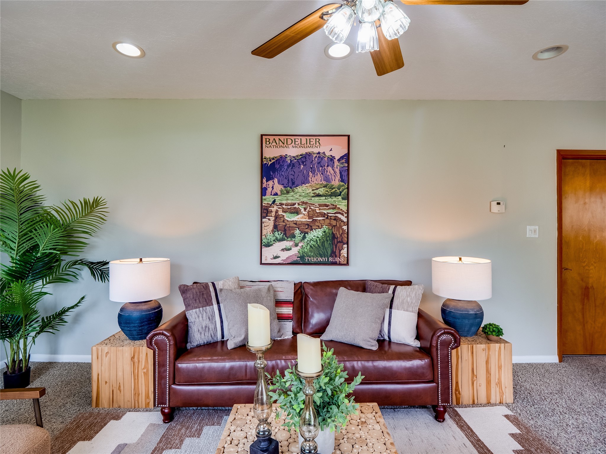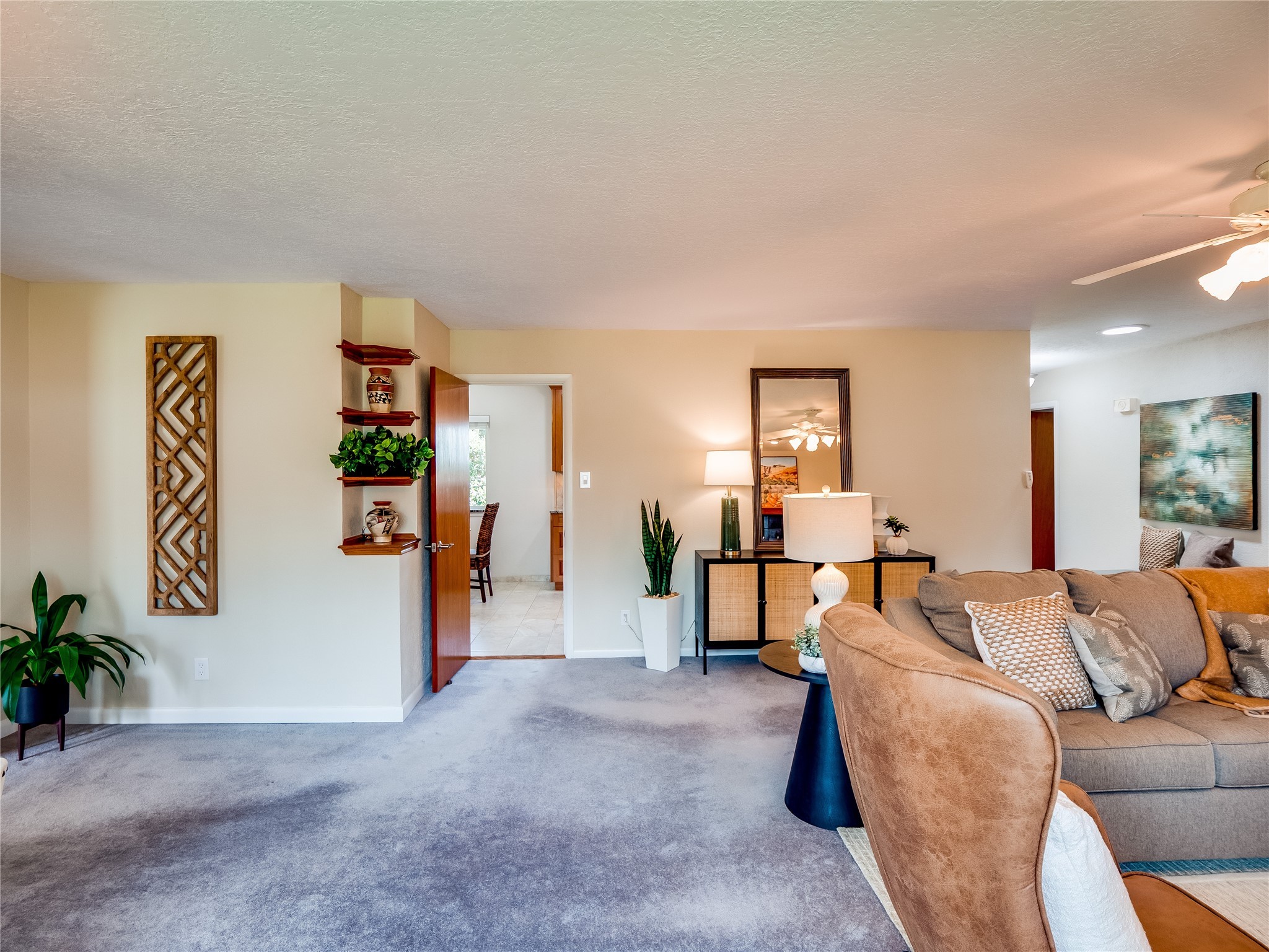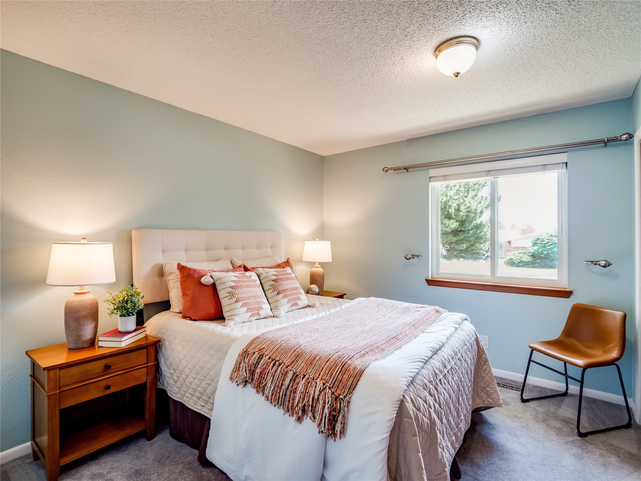 This beautifully remodeled custom Ranch-style home sits on a spacious corner lot with a meticulously maintained front yard. Step inside through the tiled foyer and into the expansive living and dining area, where plush carpeting and a wood-burning fireplace create a warm and inviting atmosphere. Just off the living space, a step-down family room with a cozy gas stove and sliding glass doors provides direct access to the backyard. The heart of the home is the gorgeous remodeled galley-style kitchen, complete with cherry wood cabinets and chrome hardware, granite counters, a travertine tile backsplash, and stainless steel appliances including a five-burner gas stove and double oven. Off the breakfast nook there's a hidden laundry closet with a stackable washer and dryer. Access to the two-car garage with a workbench, attic storage, and EV charging outlet. A private office/den sits just off the living area behind elegant glass pocket doors. Down the hall, you'll find two nicely sized guest bedrooms, and a beautifully appointed guest bathroom with a marble-topped single sink vanity and a soaking tub. The spacious primary en-suite is a true retreat, featuring a large closet, built-in drawers and cabinets, and a chandelier that adds a touch of sophistication. The spa-like bath includes a double sink vanity with granite counters and chrome fixtures, radiant floor heating, built-in cabinetry, and a beautifully tiled walk-in shower with a glass enclosure. This home has been thoughtfully upgraded with a new roof, updated electrical panel, central air conditioning and heating unit, a new water heater, and more. The expansive backyard is a private haven with a lush lawn, colorful flower garden beds, mature fruit trees, ideal for entertaining or quiet enjoyment. Multiple access gates, including a wide side gate with a concrete pad for RV parking and more. With thoughtful design, high-end finishes, and impressive upgrades throughout, this move-in-ready home is a rare find!