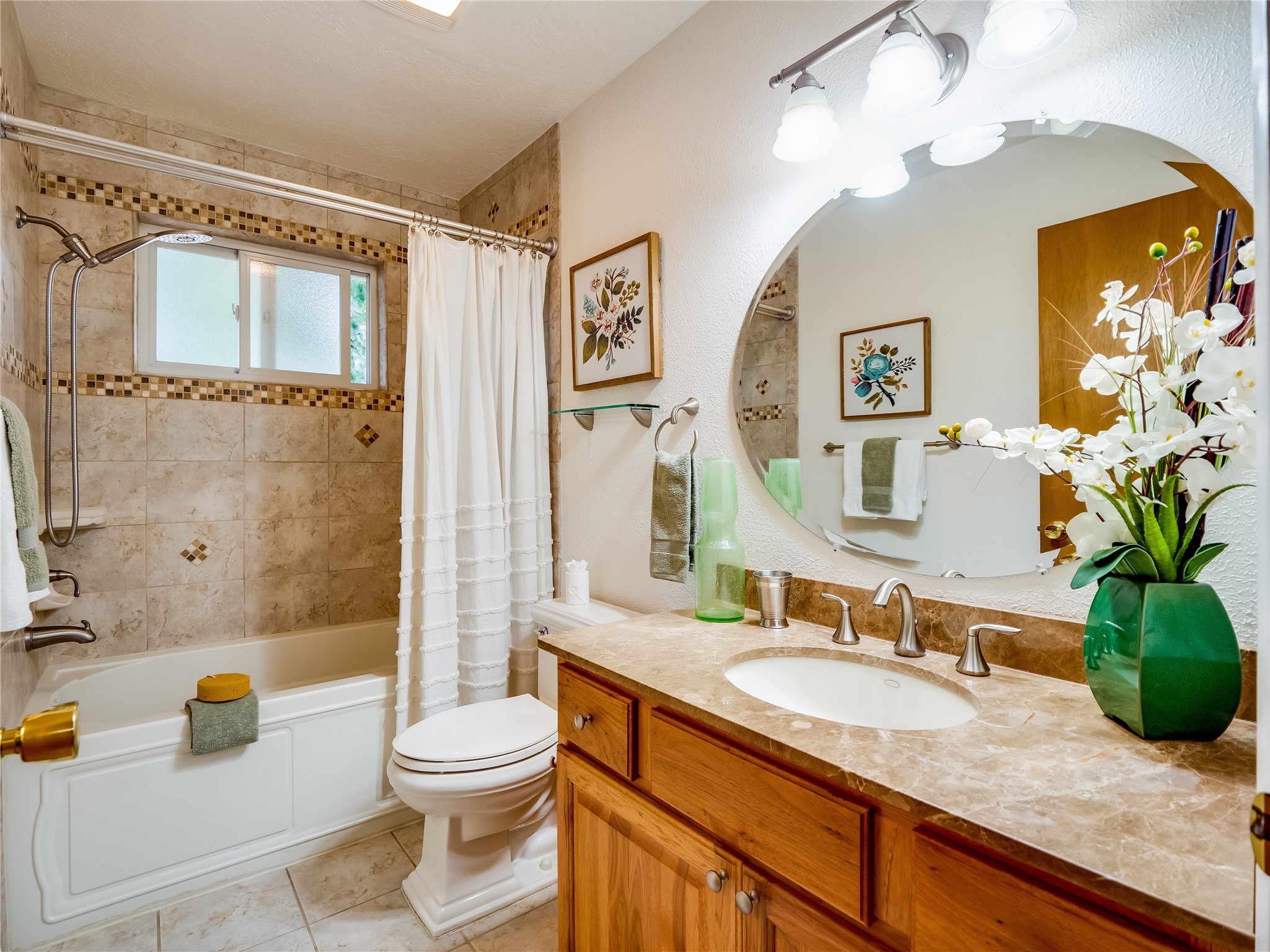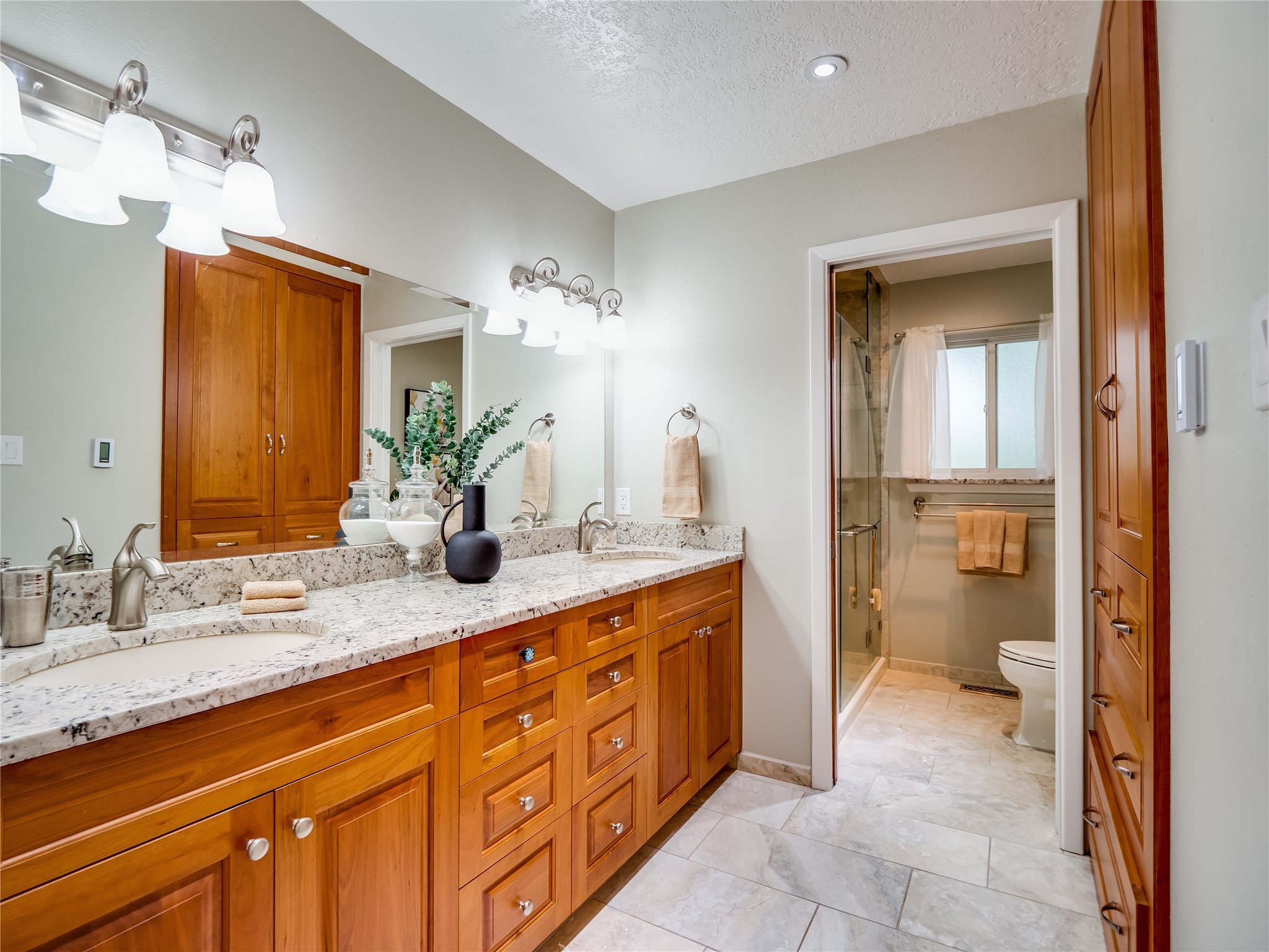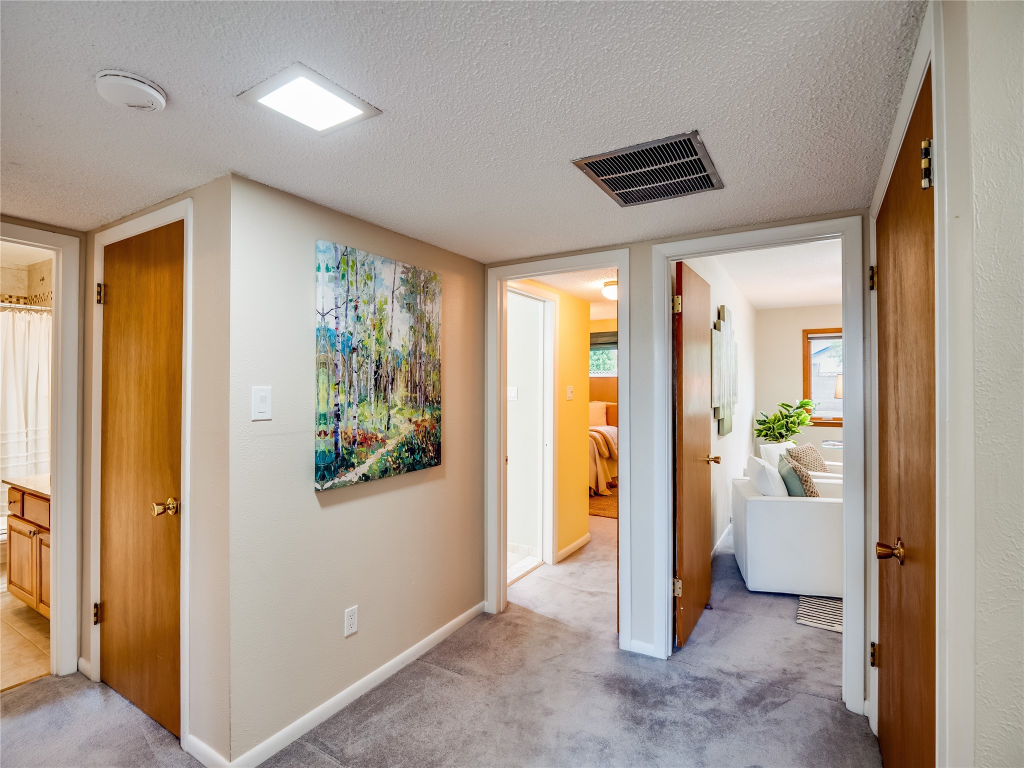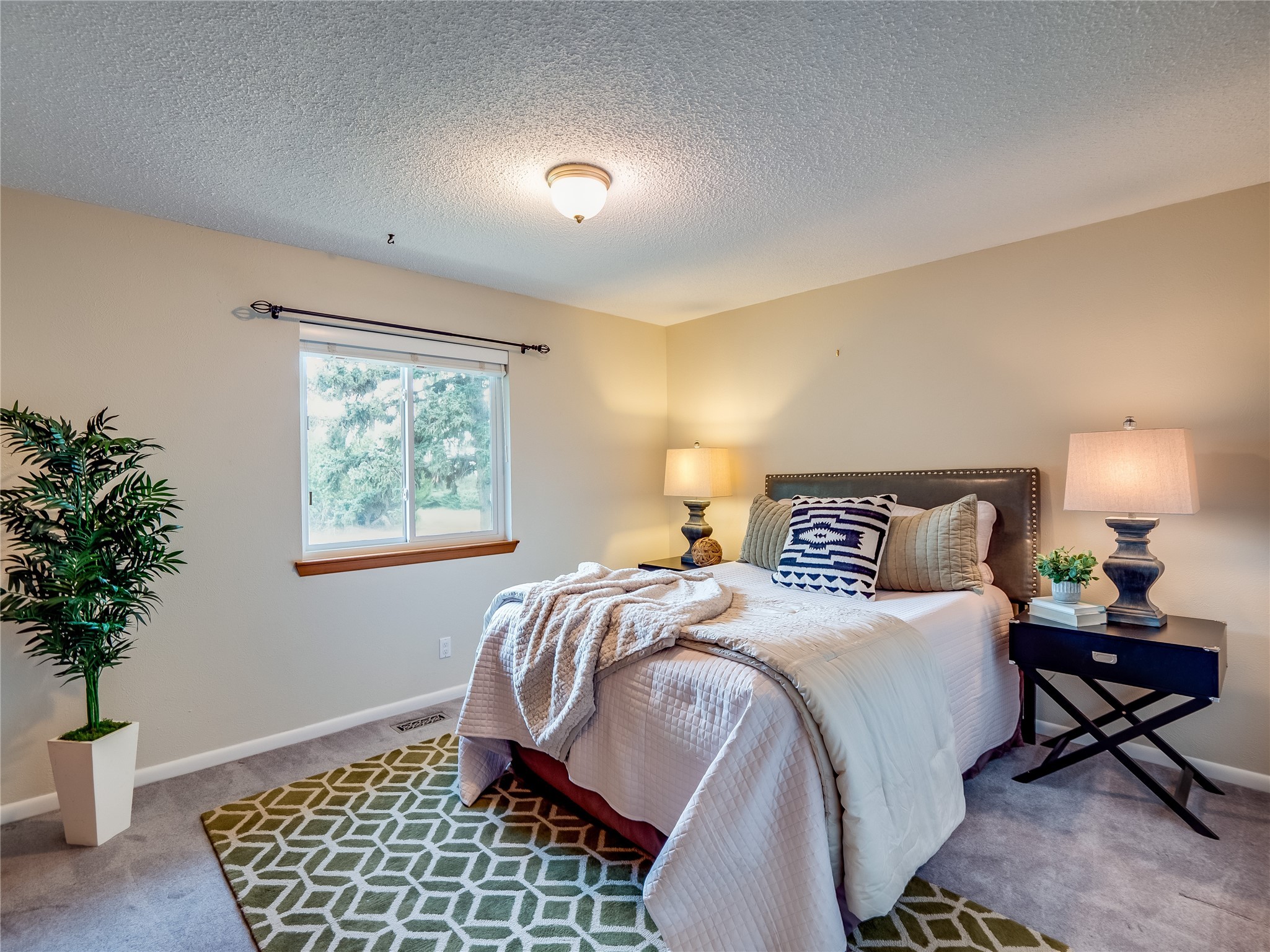 This beautifully remodeled custom Ranch-style home sits on a spacious corner lot with a meticulously maintained front yard. Step inside through the tiled foyer and into the expansive living and dining area, where plush carpeting and a wood-burning fireplace create a warm and inviting atmosphere. Just off the living space, a step-down family room with a cozy gas stove and sliding glass doors provides direct access to the backyard. The heart of the home is the gorgeous remodeled galley-style kitchen, complete with cherry wood cabinets and chrome hardware, granite counters, a travertine tile backsplash, and stainless steel appliances including a five-burner gas stove and double oven. Off the breakfast nook there's a hidden laundry closet with a stackable washer and dryer. Access to the two-car garage with a workbench, attic storage, and EV charging outlet. A private office/den sits just off the living area behind elegant glass pocket doors. Down the hall, you'll find two nicely sized guest bedrooms, and a beautifully appointed guest bathroom with a marble-topped single sink vanity and a soaking tub. The spacious primary en-suite is a true retreat, featuring a large closet, built-in drawers and cabinets, and a chandelier that adds a touch of sophistication. The spa-like bath includes a double sink vanity with granite counters and chrome fixtures, radiant floor heating, built-in cabinetry, and a beautifully tiled walk-in shower with a glass enclosure. This home has been thoughtfully upgraded with a new roof, updated electrical panel, central air conditioning and heating unit, a new water heater, and more. The expansive backyard is a private haven with a lush lawn, colorful flower garden beds, mature fruit trees, ideal for entertaining or quiet enjoyment. Multiple access gates, including a wide side gate with a concrete pad for RV parking and more. With thoughtful design, high-end finishes, and impressive upgrades throughout, this move-in-ready home is a rare find!