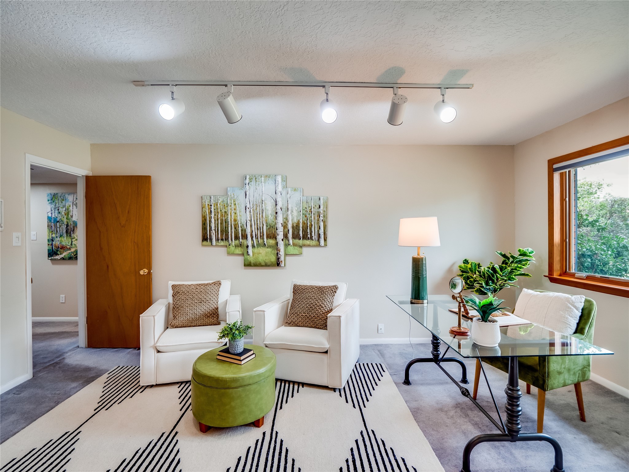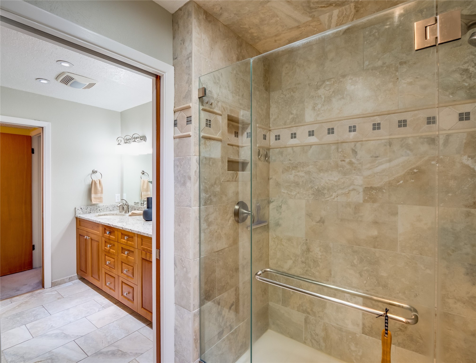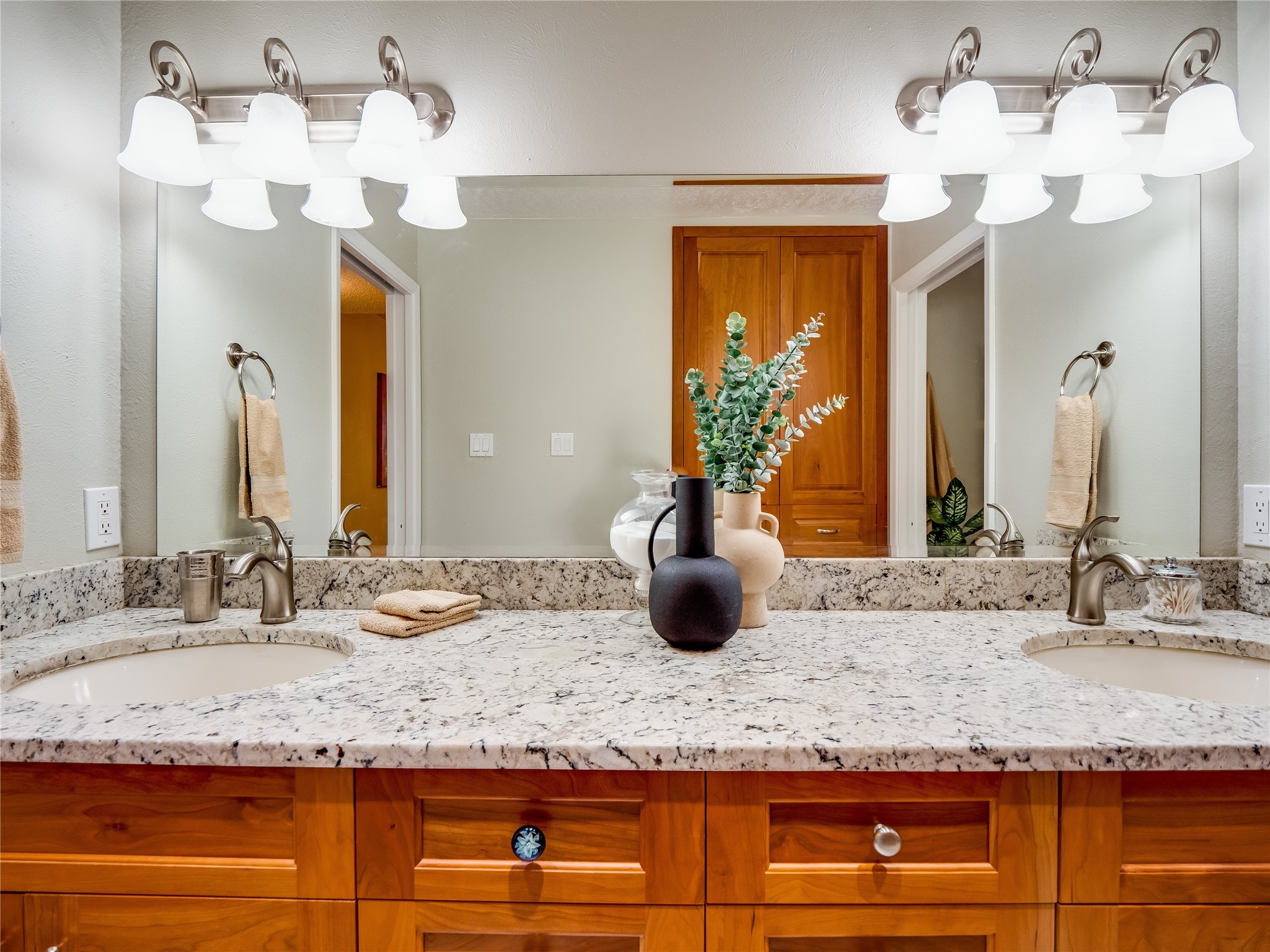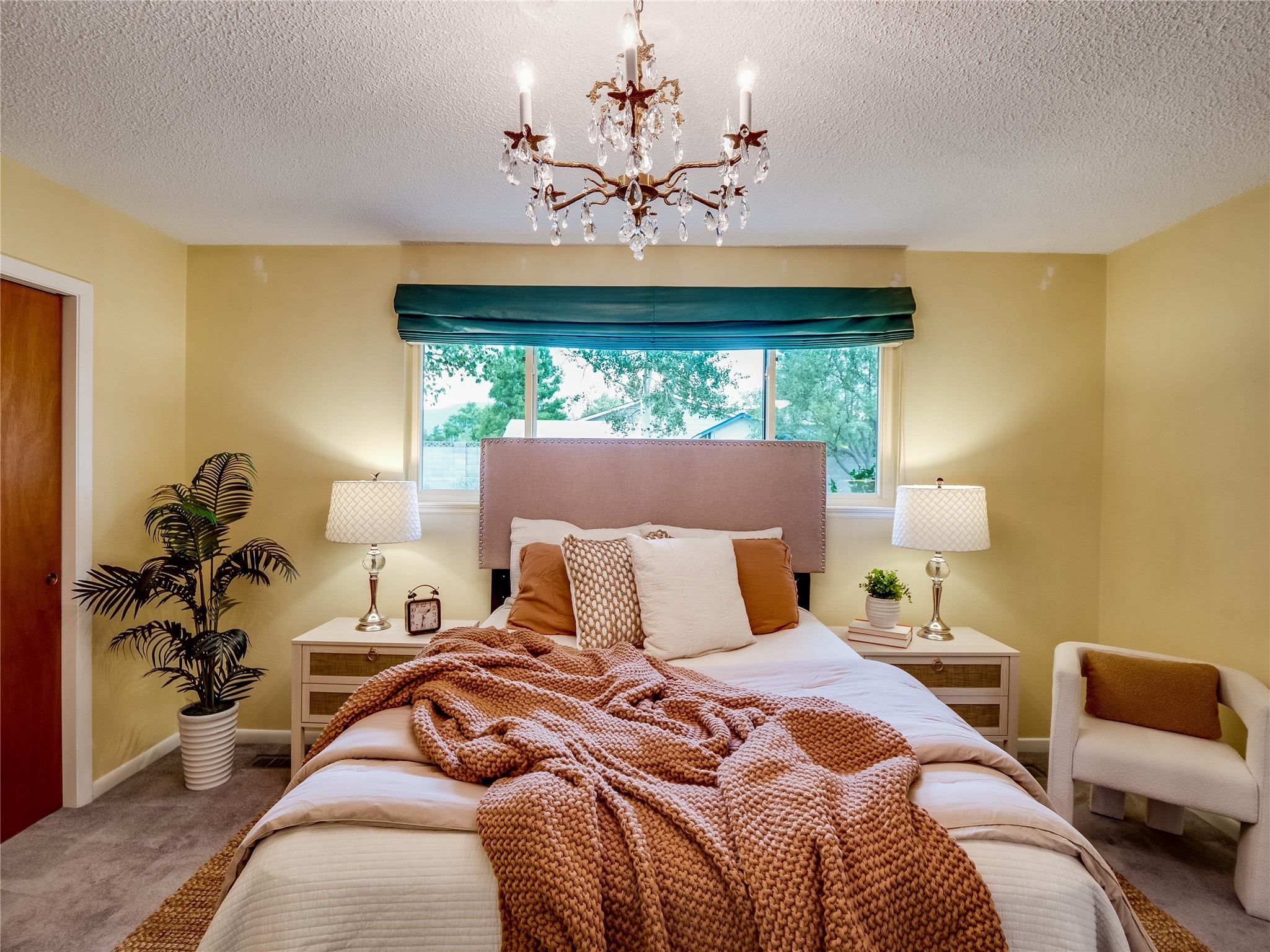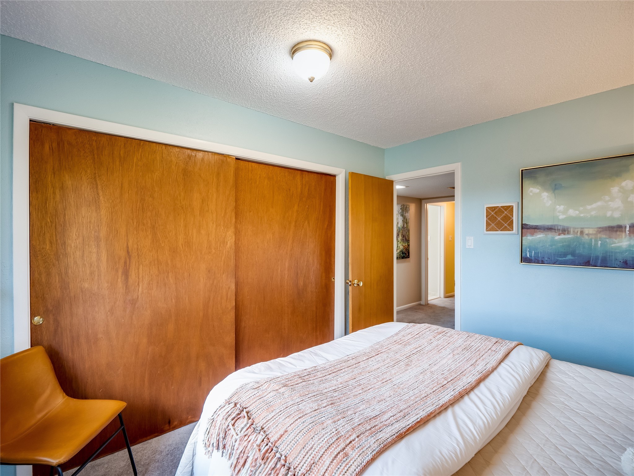 This beautifully remodeled custom Ranch-style home sits on a spacious corner lot with a meticulously maintained front yard. Step inside through the tiled foyer and into the expansive living and dining area, where plush carpeting and a wood-burning fireplace create a warm and inviting atmosphere. Just off the living space, a step-down family room with a cozy gas stove and sliding glass doors provides direct access to the backyard. The heart of the home is the gorgeous remodeled galley-style kitchen, complete with cherry wood cabinets and chrome hardware, granite counters, a travertine tile backsplash, and stainless steel appliances including a five-burner gas stove and double oven. Off the breakfast nook there's a hidden laundry closet with a stackable washer and dryer. Access to the two-car garage with a workbench, attic storage, and EV charging outlet. A private office/den sits just off the living area behind elegant glass pocket doors. Down the hall, you'll find two nicely sized guest bedrooms, and a beautifully appointed guest bathroom with a marble-topped single sink vanity and a soaking tub. The spacious primary en-suite is a true retreat, featuring a large closet, built-in drawers and cabinets, and a chandelier that adds a touch of sophistication. The spa-like bath includes a double sink vanity with granite counters and chrome fixtures, radiant floor heating, built-in cabinetry, and a beautifully tiled walk-in shower with a glass enclosure. This home has been thoughtfully upgraded with a new roof, updated electrical panel, central air conditioning and heating unit, a new water heater, and more. The expansive backyard is a private haven with a lush lawn, colorful flower garden beds, mature fruit trees, ideal for entertaining or quiet enjoyment. Multiple access gates, including a wide side gate with a concrete pad for RV parking and more. With thoughtful design, high-end finishes, and impressive upgrades throughout, this move-in-ready home is a rare find!