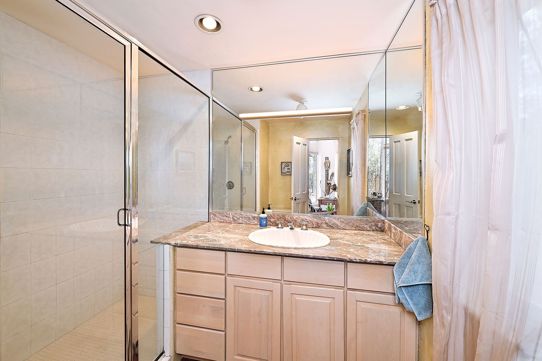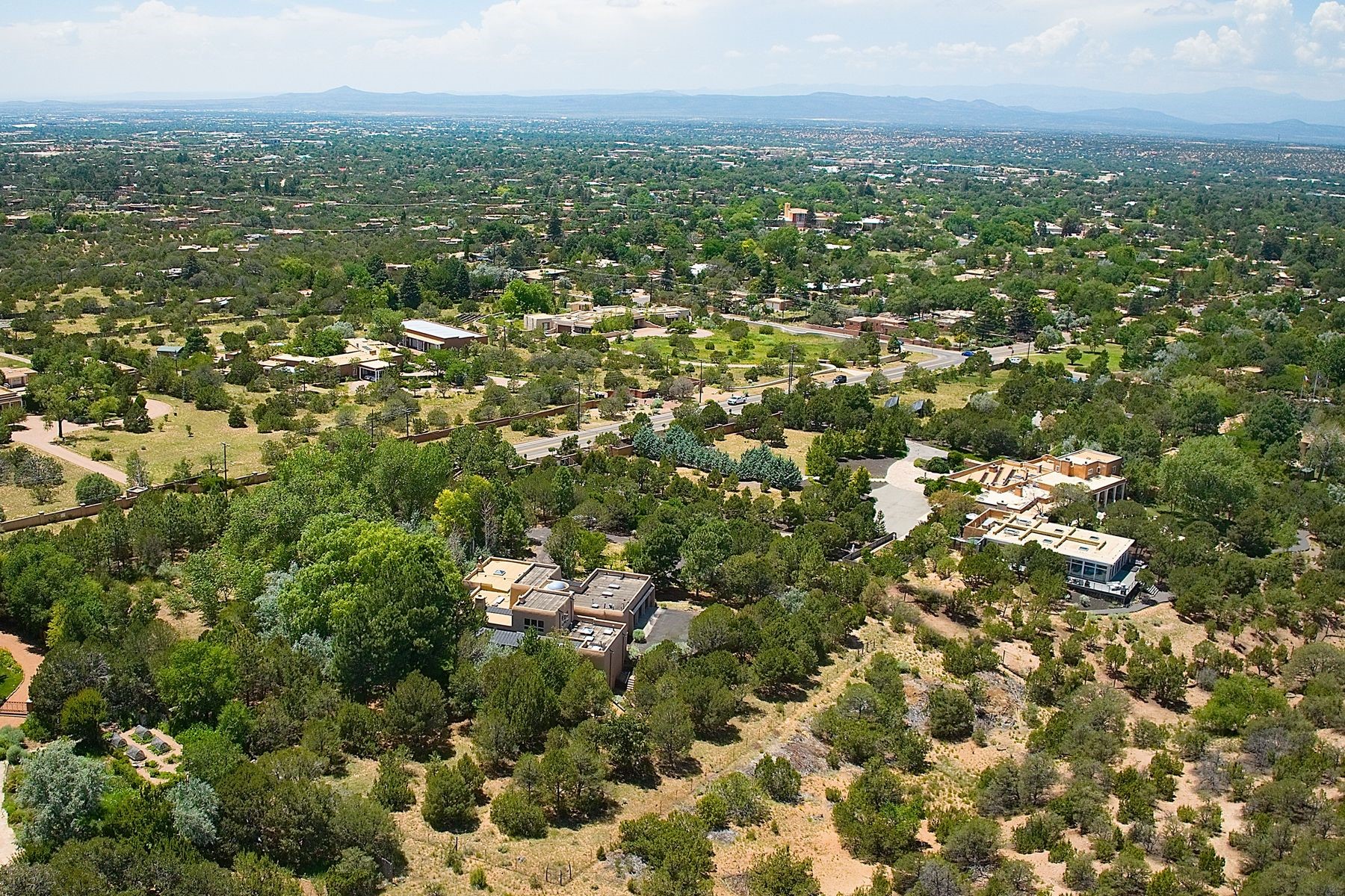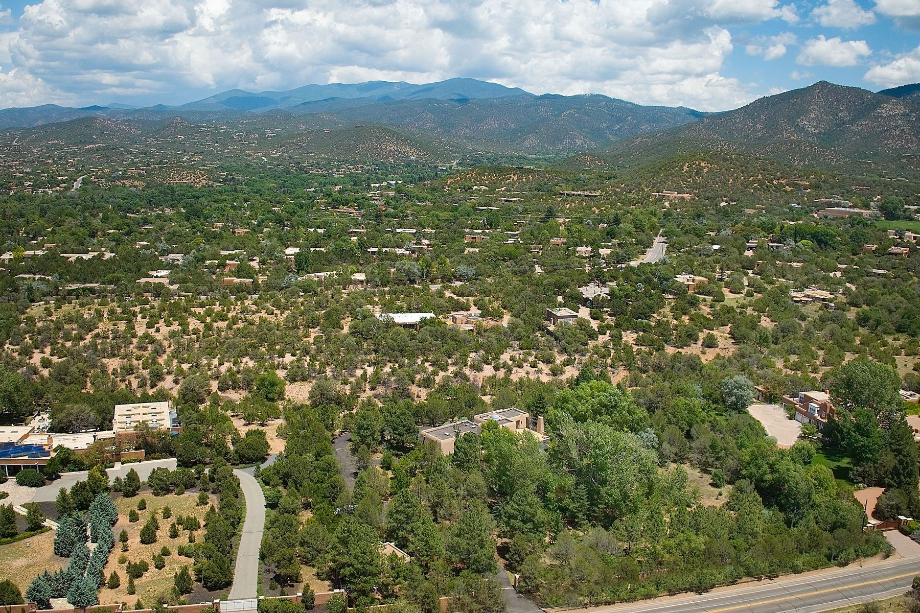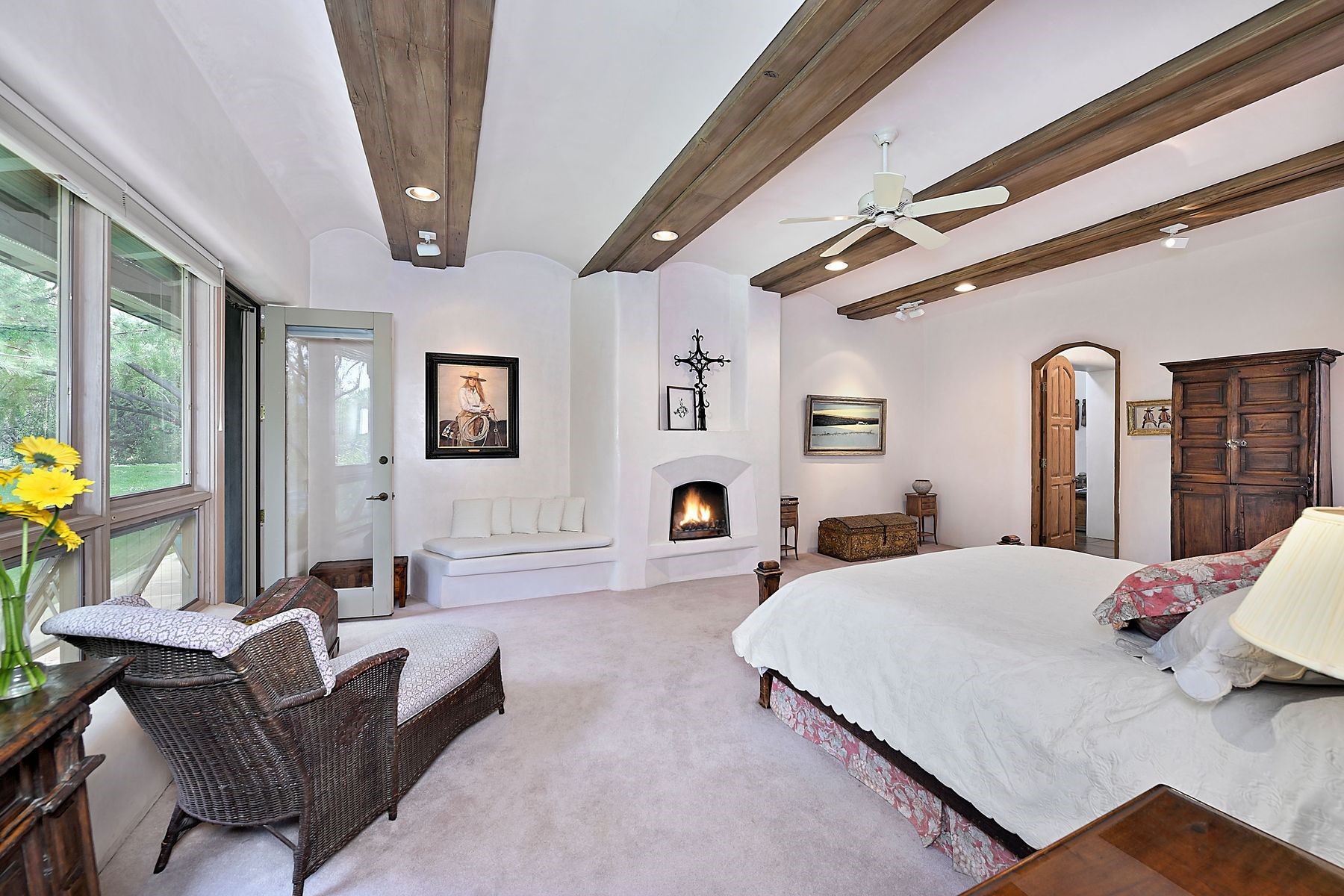 In recent years, much has been made about the treasure of Forrest Fenn, but perhaps the most meaningful treasure the renowned art dealer and author ever possessed was this idyllic oasis off the historic Old Santa Fe Trail in the capital city of New Mexico. Occupying 2.65 remarkably verdant acres, the gated estate is a hidden green gem, lush with trees, aspens, cottonwoods, pines, pinons, and a towering weeping willow that thrive alongside apricot, pear, apple, cherry, and peach trees as well as grape vines, flourishing lawn and wild grasses, and flowering plants and vines, all maintained by an irrigation system fed by a private well. The heart of the property is a warm, welcoming 4,596 square-foot residence custom-designed featuring handsome Beijing slate floors, soaring ceilings recalling an Old World chapel, diamond-finish plaster walls, vintage Spanish Colonial doors, a plethora of oversized windows and French doors, clever built-ins designed for the display of collectibles, a striking spiral staircase crowned by a skylight, and a wraparound portal. A portion of this breezy, relaxing outdoor space overlooks another rarity, a pond and waterfall fed by a recirculating stream. An ecosystem for fish, frogs, turtles, and all manner of wild birds, including ducks. Near the property gates is a 645 square-foot guest casita or studio with soaring ceilings, floods of light, a kitchenette, a bath, and storage space. A paved drive leads through the grounds to the finished three-car garage, which includes additional storage and benefits from a heated threshold. While the property is lush, private, secure, and quiet, extending away from the road across an arroyo, the attractions and amenities of Museum Hill, Canyon Road, and the historic Plaza are mere moments away.