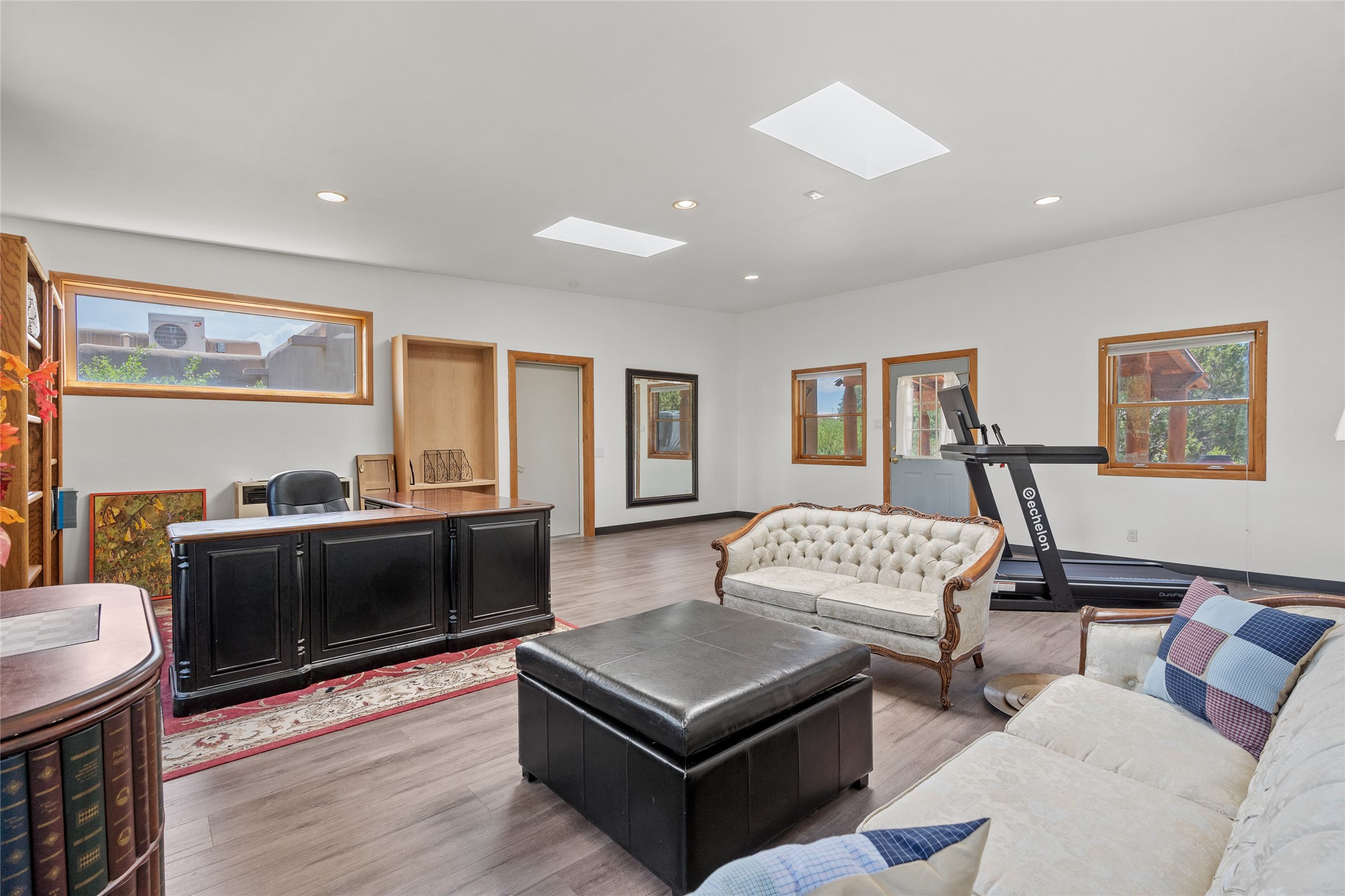Located on over an acre with unbeatable access to all that Santa Fe has to offer, this beautifully updated home offers views of Sun andMoon Mountains and an open, flexible layout ideal for modern living. Tongue-and-groove ceilings with recessed lighting run throughout themain living areas, complementing the abundant natural light that pours in through large windows. The updated kitchen features new granitecountertops, newer Bosch and Samsung appliances, plus a RO filtration in the kitchen. The kitchen flows seamlessly into the open-conceptliving and dining spaces. Two cozy fireplaces create warmth and ambiance, while radiant heating and mini splits provide efficient heatingand cooling year-round. With three spacious bedrooms--including two that function well as primary suites. A standout feature is theattached studio with its own entrance, carport, skylights, and plentiful windows--perfect for an art space, home office, or guest retreat.Outside, the expansive lot offers endless possibilities for gardening, recreation, or expansion. Just a 5-minute walk from Christus St.Vincent Regional Medical Center and only 10 minutes to the historic Santa Fe Plaza, this home combines peaceful privacy with centralconvenience. Don't miss this rare opportunity to own a flexible, light-filled property in one of Santa Fe's most desirable locations.