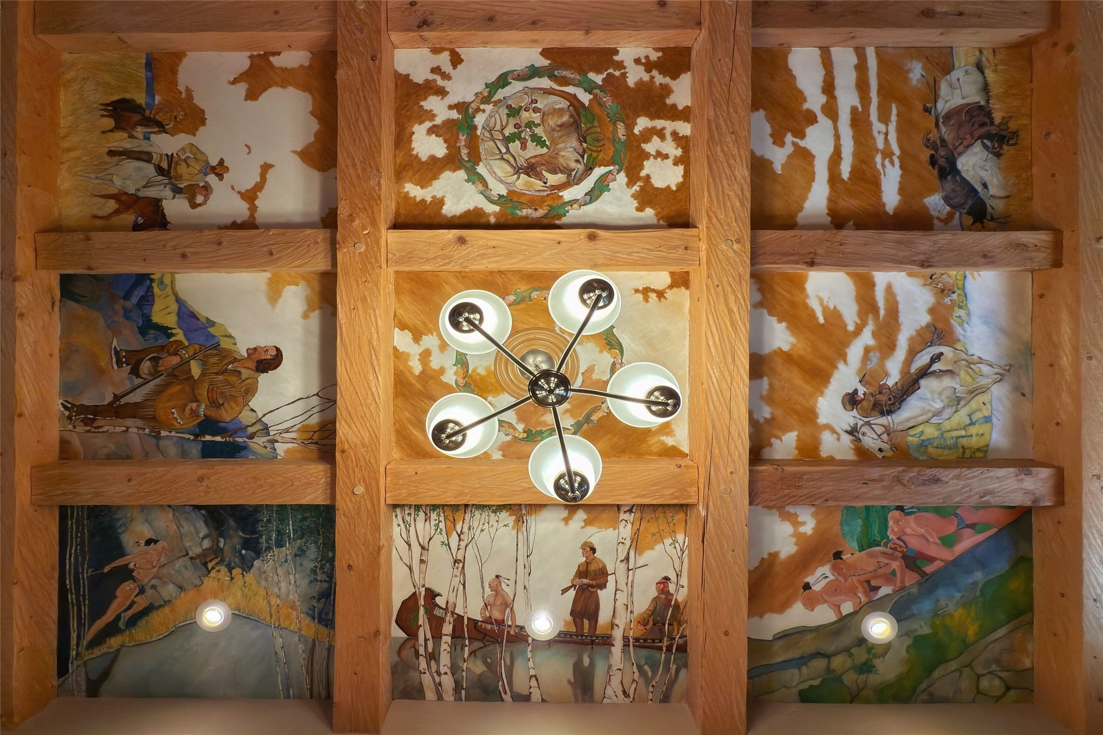 Old World elegance meets Santa Fe charm in this beautifully crafted 3 bed/3 bath in a prized location. The residence blends timeless design elements with thoughtful modern touches across a layout that is both sophisticated and comfortable. From the moment you step into the dramatic foyer, featuring carved wooden doors, crystal chandelier, and antique sconce, you're greeted by exquisite craftsmanship and distinctive character. The main living area is anchored by a large stone fireplace. Raw wood vigas enhance the design while venetian plaster walls, art display lighting, and elegant finishes create an ideal setting for both entertaining and relaxation. The dining room boasts a hand-painted Western motif ceiling while the chef's kitchen features cherry cabinetry, handmade tile backsplash, granite countertops, butler's pantry, and a wet bar with Italian tile and a wine fridge. Hidden storage adds functionality, and the kitchen opens to the main portal and garden. The first floor includes a versatile flex room/office with patio access and a stunning bathroom with a hand-carved Mexican vanity with bone inlay and copper basin. Upstairs, the family room includes another large stone gas fireplace, entertainment unit, expansive windows showcasing downtown views, and a wrap-around deck with oversized shaded lounge chair. The primary suite offers privacy and luxury with double doors, deck access, a hidden storage wall, and a spa-like bath with silver-leaf dome lighting, hand-made ceramic inlays, travertine finishes, and granite vanities. Outdoor living is elevated with a lush back garden with waterfall pond, tiled fresco wall, gas grill, and a dining portal shaded by mature trees. An attached casita welcomes you with a water feature at the private entrance, Saltillo tile, vigas, and kitchenette, perfect for guests or rental income. Truly a work of art, this turn-key home, includes all of the pictured furnishings, and captures the essence of Santa Fe living in every detail.