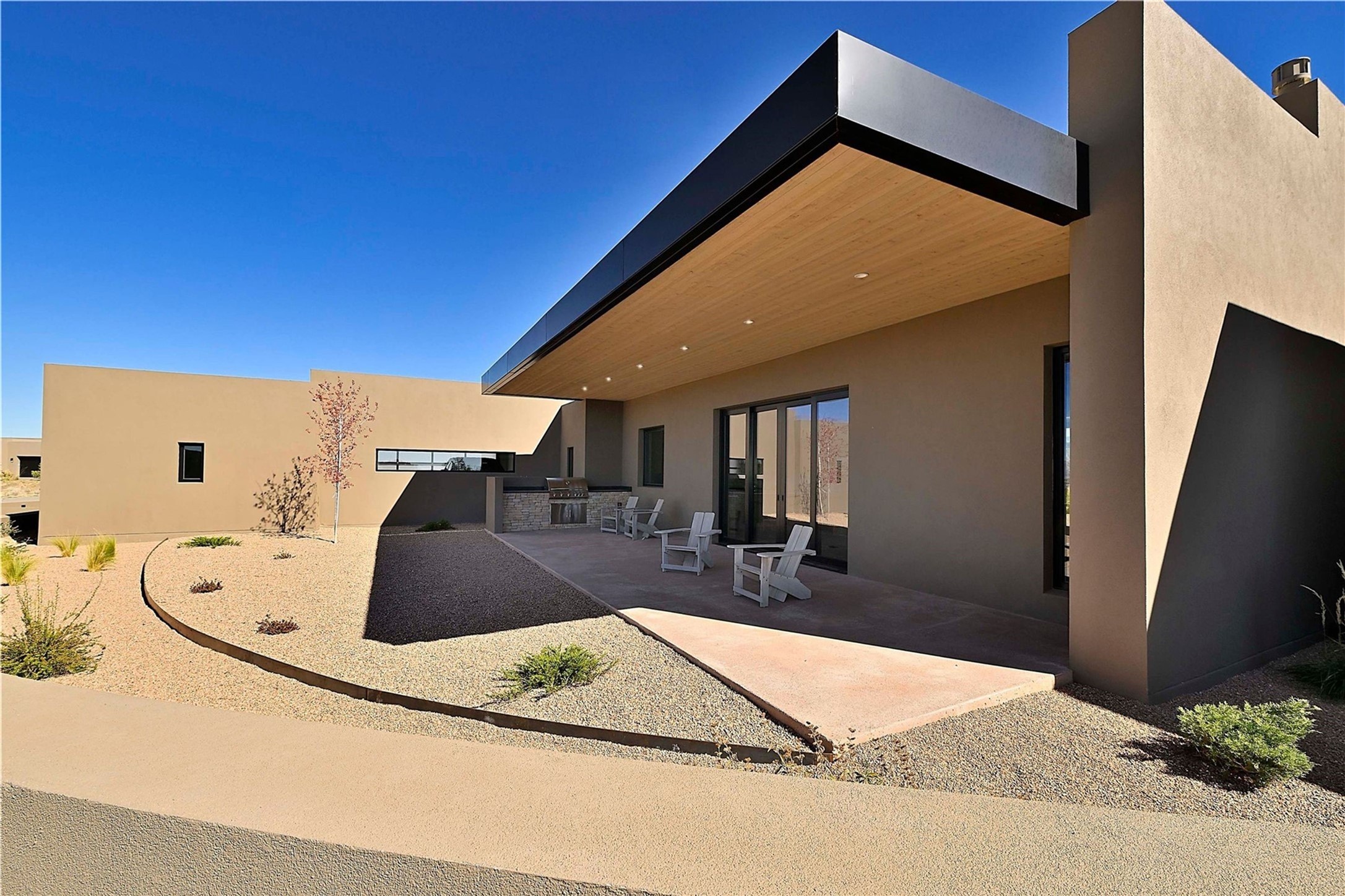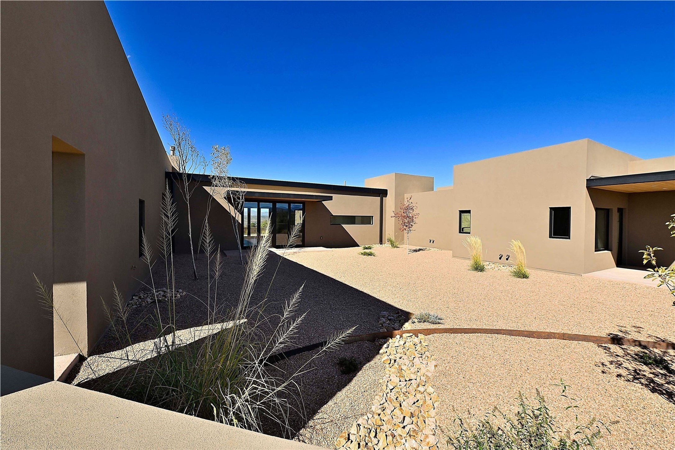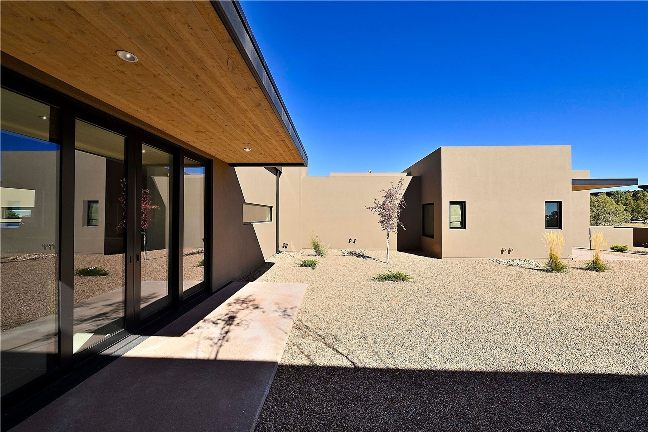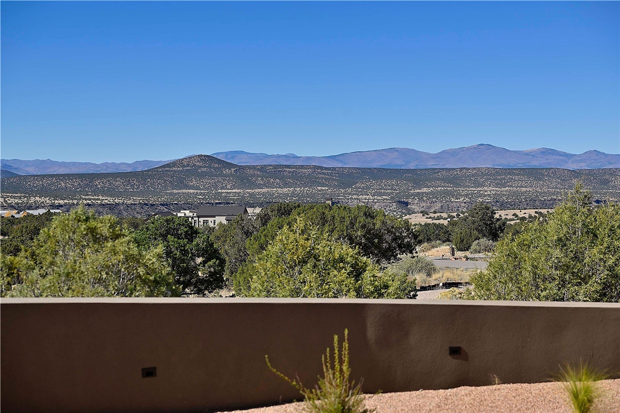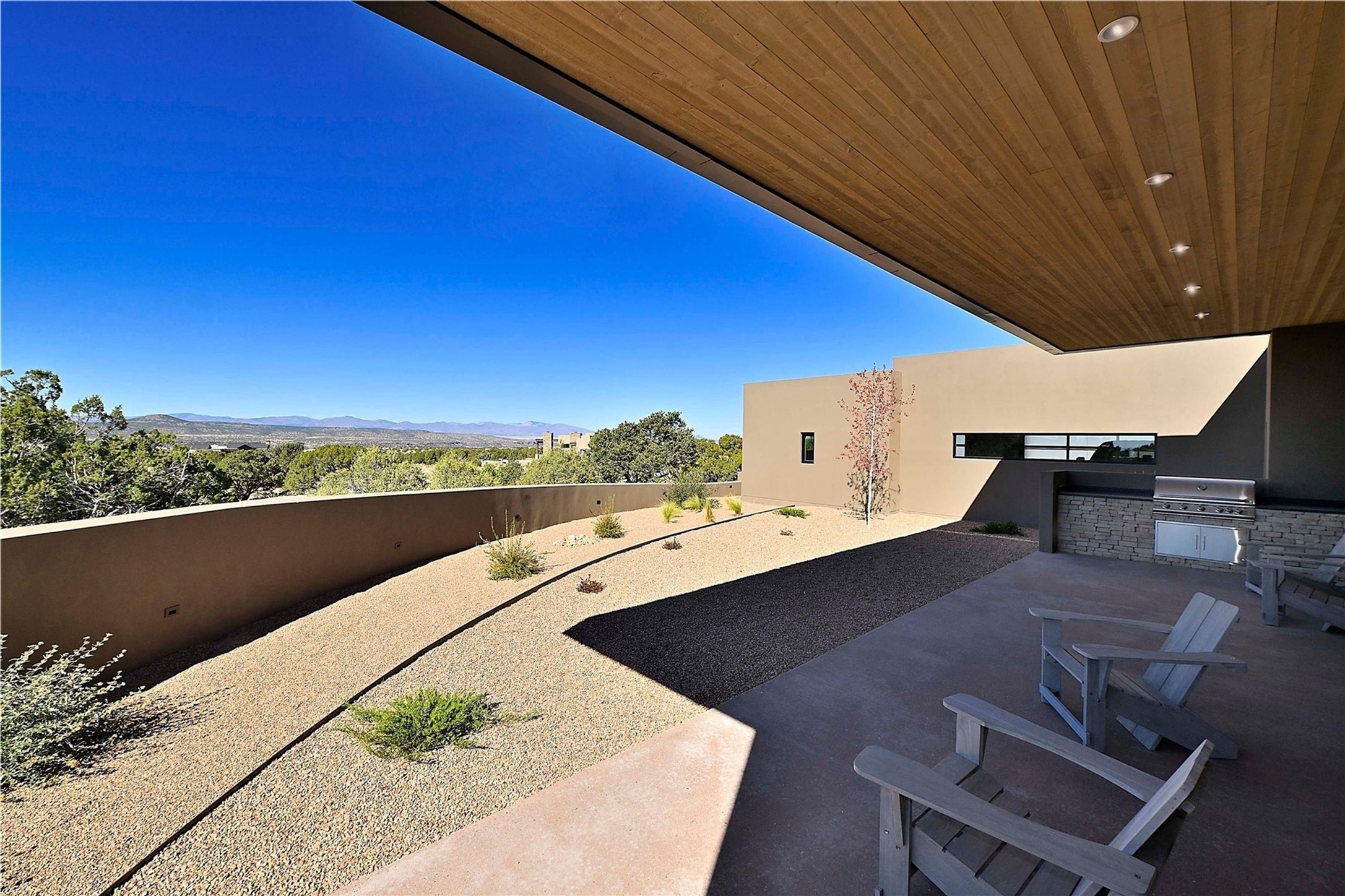 Exceptional single-level contemporary masterpiece built in 2024 by the award-winning Boss Builders. Designed to maximize stunning views of both the Sangre de Cristo and Jemez Mountains, this residence features luxury designer finishes throughout, including beautiful wood and natural stone flooring, soft white plaster walls in the main living areas, and striking custom steel accents. The exquisite finishes were handpicked by renowned local designer Yuki Murata. The open-concept living room and dining area seamlessly connect to a state-of-the-art island kitchen, perfect for entertaining. This culinary haven includes custom cabinetry, walk-in pantry, and top-of-the-line Wolf/Subzero appliances, all framed by panoramic mountain vistas. The generous primary suite, with its own private outdoor area, contains a spa-like bathroom with a walk-in shower, a tranquil soaking tub encased in glass, and an expansive walk-in closet. Adjacent to the owner's suite is a private media room or office.The thoughtfully designed independent guest wing features three en-suite bedrooms that share a cozy living room, ensuring privacy for guests. Two generous outdoor living areas embrace the ultimate indoor-outdoor lifestyle. Located within proximity to The Club at Las Campanas and BLM land.