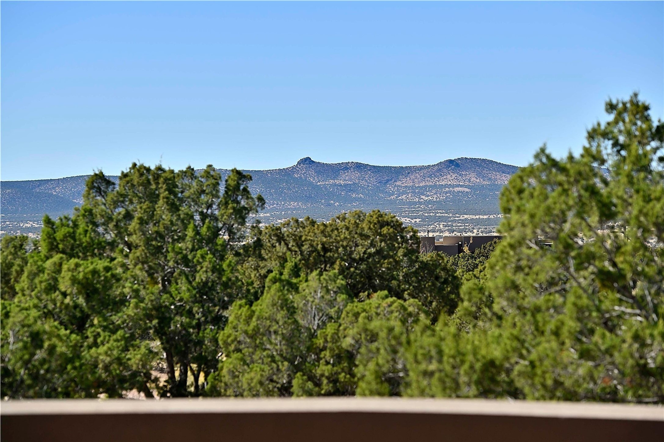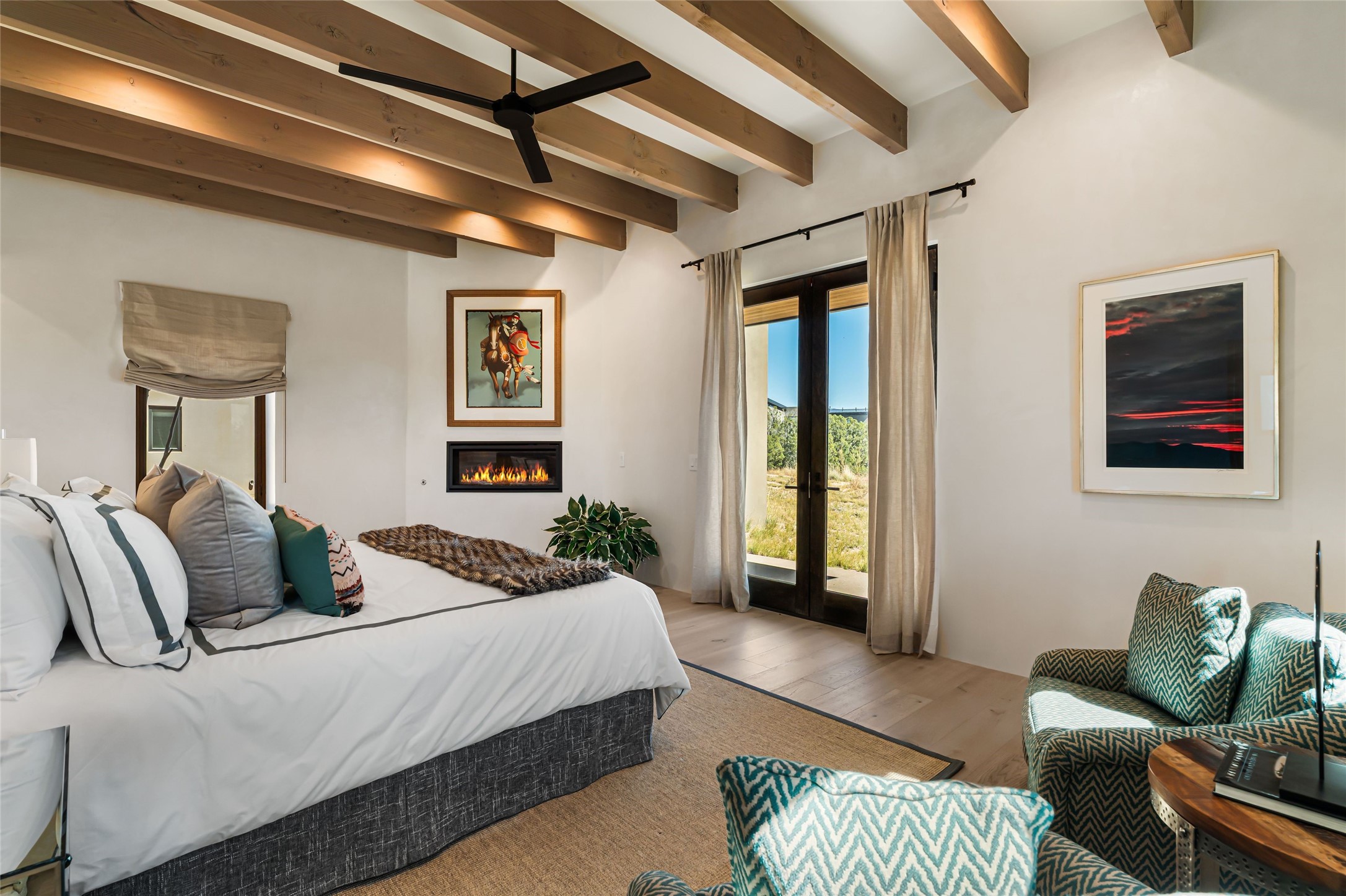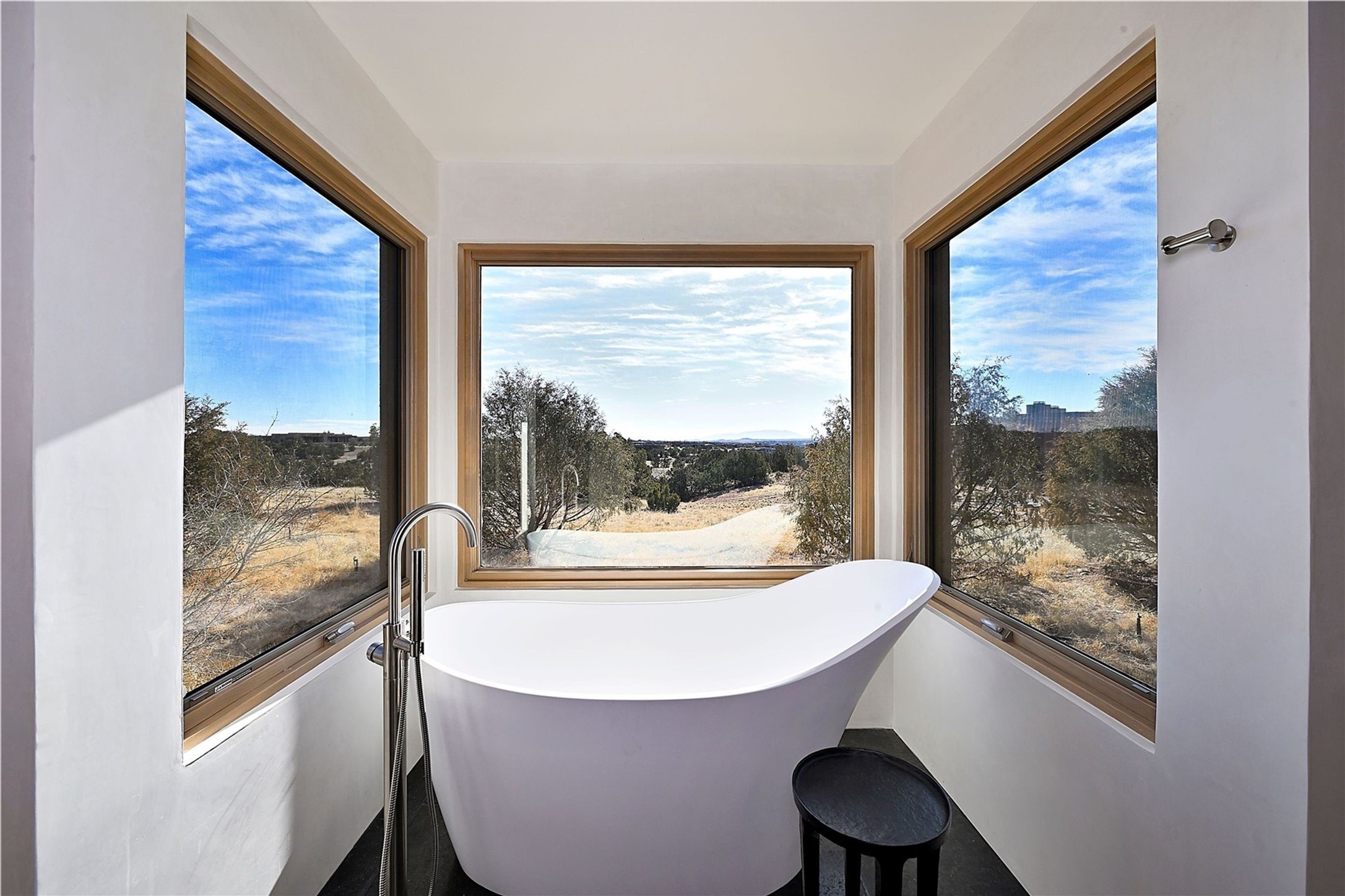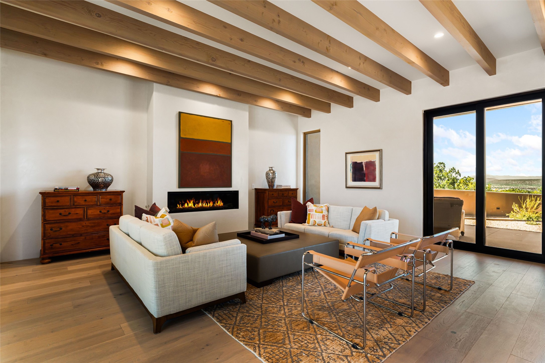 Exceptional single-level contemporary masterpiece built in 2024 by the award-winning Boss Builders. Designed to maximize stunning views of both the Sangre de Cristo and Jemez Mountains, this residence features luxury designer finishes throughout, including beautiful wood and natural stone flooring, soft white plaster walls in the main living areas, and striking custom steel accents. The exquisite finishes were handpicked by renowned local designer Yuki Murata. The open-concept living room and dining area seamlessly connect to a state-of-the-art island kitchen, perfect for entertaining. This culinary haven includes custom cabinetry, walk-in pantry, and top-of-the-line Wolf/Subzero appliances, all framed by panoramic mountain vistas. The generous primary suite, with its own private outdoor area, contains a spa-like bathroom with a walk-in shower, a tranquil soaking tub encased in glass, and an expansive walk-in closet. Adjacent to the owner's suite is a private media room or office.The thoughtfully designed independent guest wing features three en-suite bedrooms that share a cozy living room, ensuring privacy for guests. Two generous outdoor living areas embrace the ultimate indoor-outdoor lifestyle. Located within proximity to The Club at Las Campanas and BLM land.