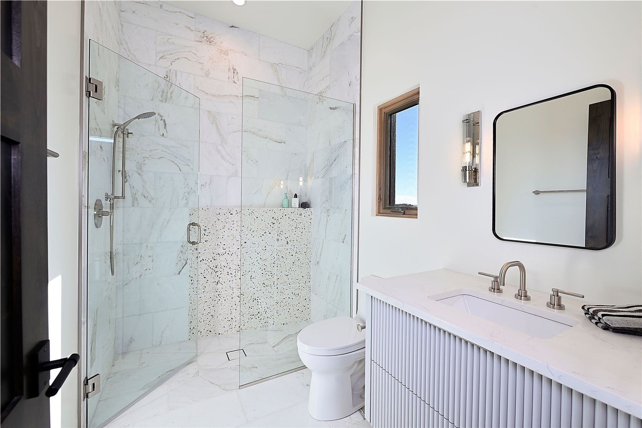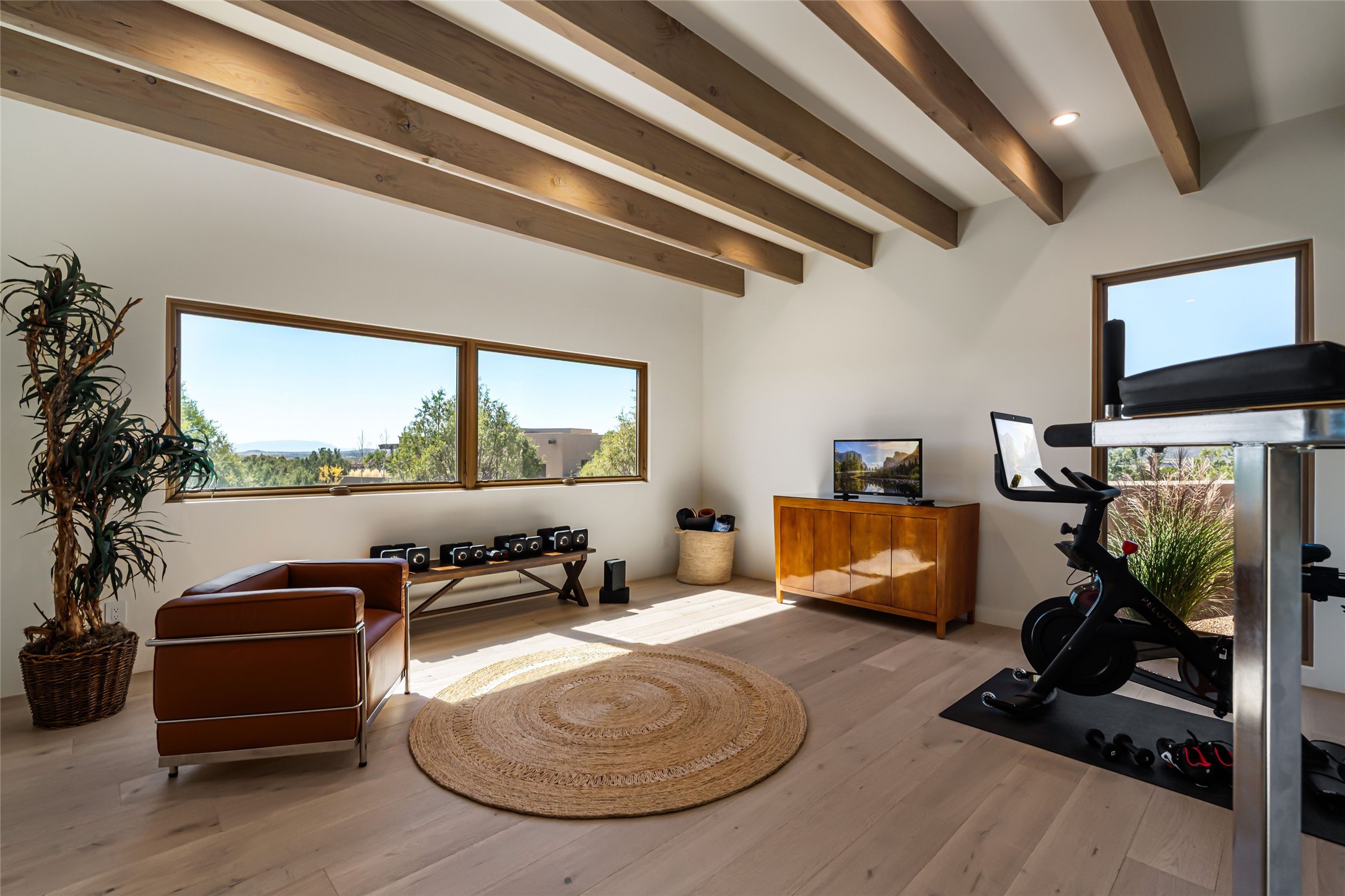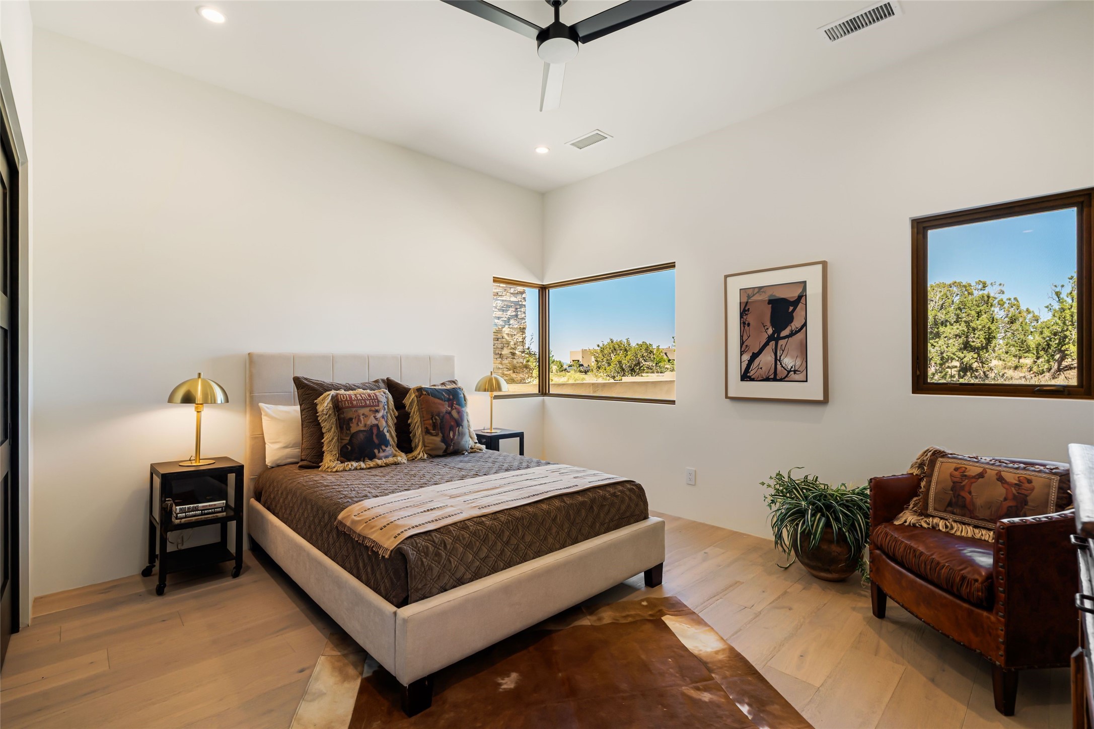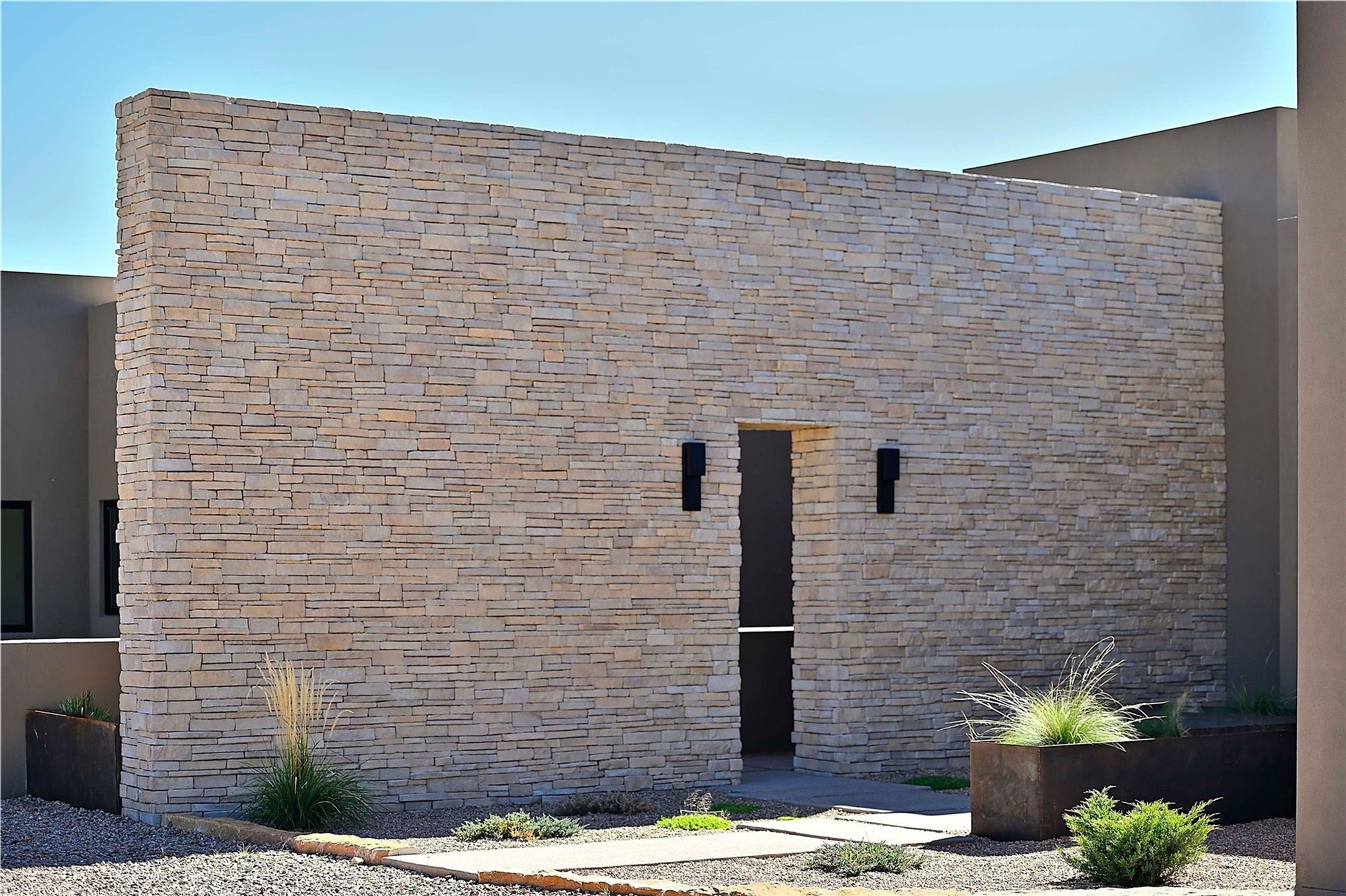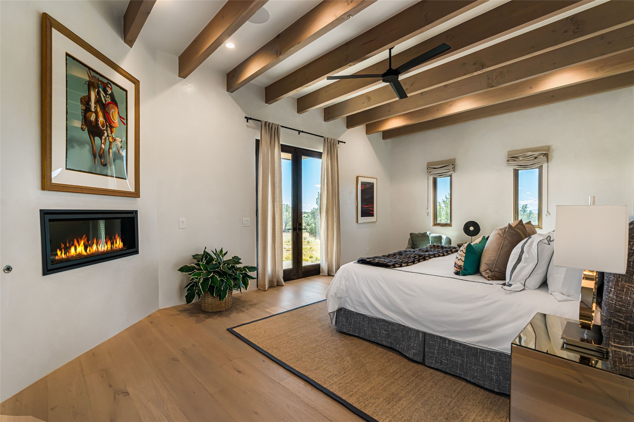 Exceptional single-level contemporary masterpiece built in 2024 by the award-winning Boss Builders. Designed to maximize stunning views of both the Sangre de Cristo and Jemez Mountains, this residence features luxury designer finishes throughout, including beautiful wood and natural stone flooring, soft white plaster walls in the main living areas, and striking custom steel accents. The exquisite finishes were handpicked by renowned local designer Yuki Murata. The open-concept living room and dining area seamlessly connect to a state-of-the-art island kitchen, perfect for entertaining. This culinary haven includes custom cabinetry, walk-in pantry, and top-of-the-line Wolf/Subzero appliances, all framed by panoramic mountain vistas. The generous primary suite, with its own private outdoor area, contains a spa-like bathroom with a walk-in shower, a tranquil soaking tub encased in glass, and an expansive walk-in closet. Adjacent to the owner's suite is a private media room or office.The thoughtfully designed independent guest wing features three en-suite bedrooms that share a cozy living room, ensuring privacy for guests. Two generous outdoor living areas embrace the ultimate indoor-outdoor lifestyle. Located within proximity to The Club at Las Campanas and BLM land.