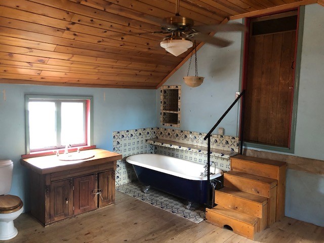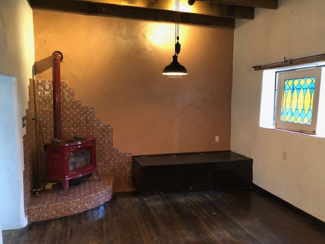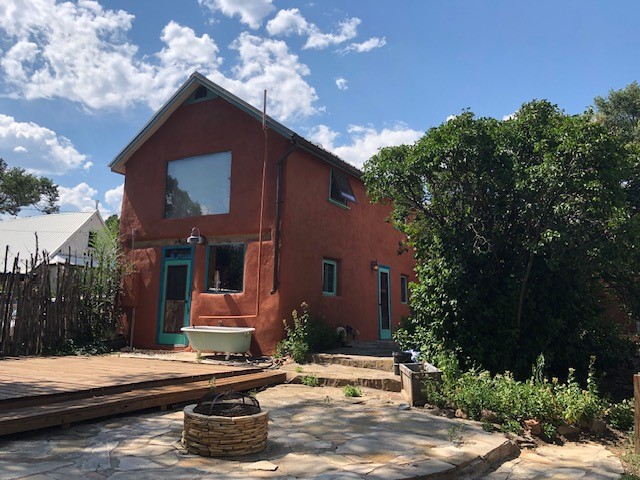 This one-of-a-kind adobe house has a fascinating history. It was built as a "bounty house" after the Civil War: soldiers could have a piece of land for free if they built a certain minimum size house on it. The bounty house is the living room of this house - a large room with wood floor and high ceiling made of vigas and latillas. With a red enamel gas stove at the far end, a built-in bookcase near the front door, and Mexican light fixtures, it is a charming entry to the house. The rest of the house was built onto this structure later and includes a bathroom with walk-in tub, a laundry area, and a large homey kitchen downstairs. The kitchen has a large 5-burner gas stove and large matching refrigerator and freezer. A spiral staircase leads upstairs to the bedroom, which has bathroom facilities in it (sink, toilet, and claw-foot tub), and a walk-in closet. The lot is 0.29 acres, green and lush and graced with large old trees. There is a large storage shed with slab floor and a couple of patios off the house. The whole property is walled or fenced, and there is an electric gate. Truly a special property.