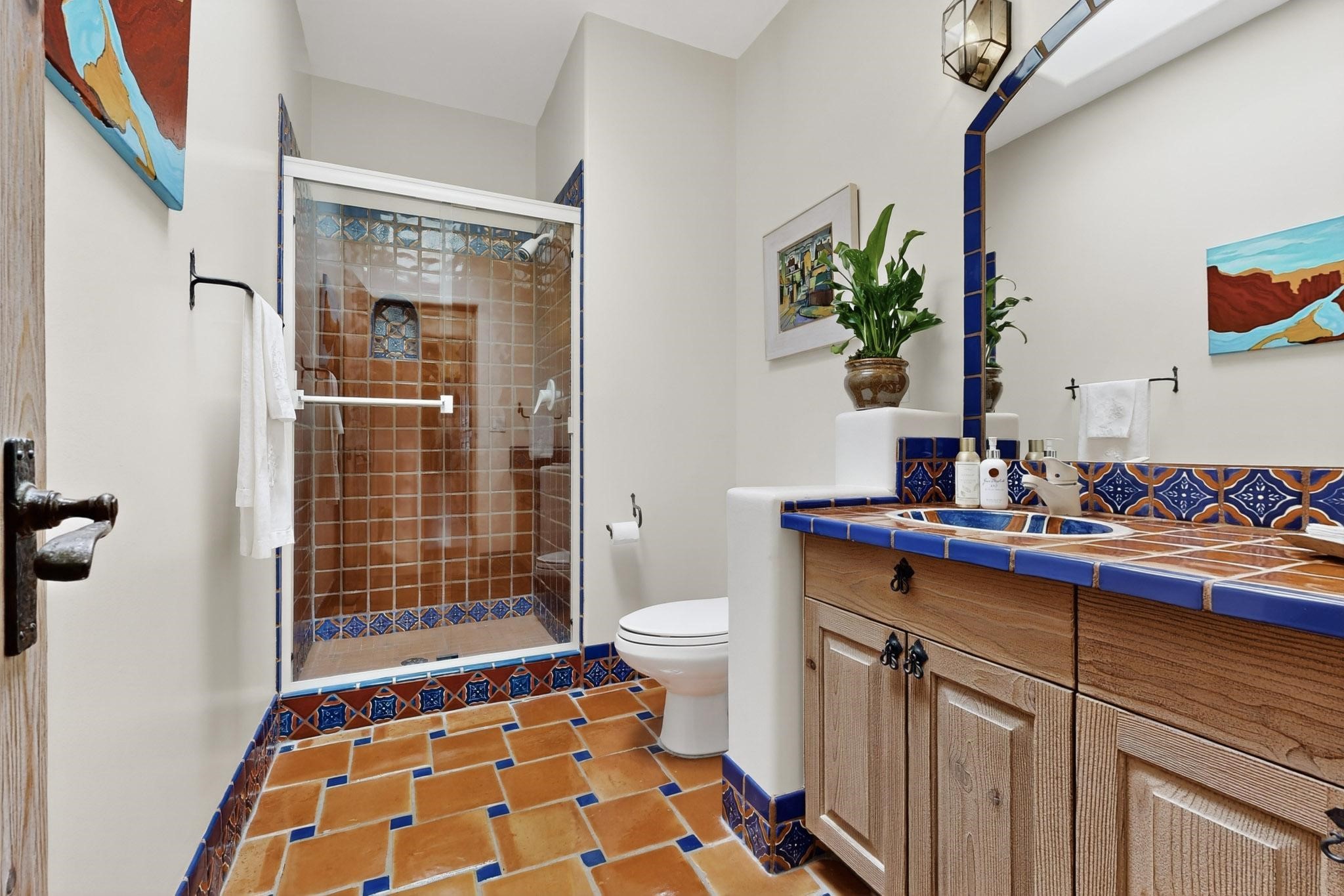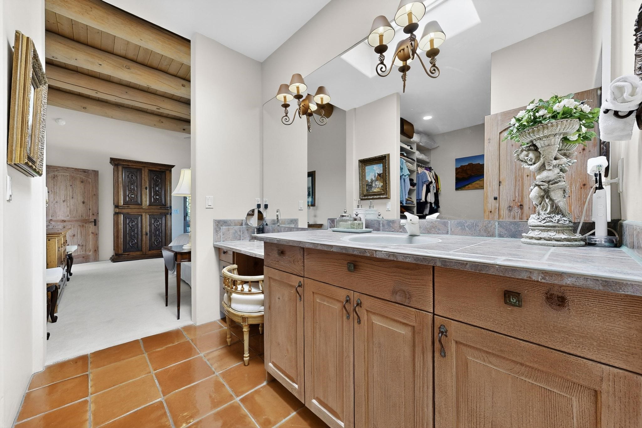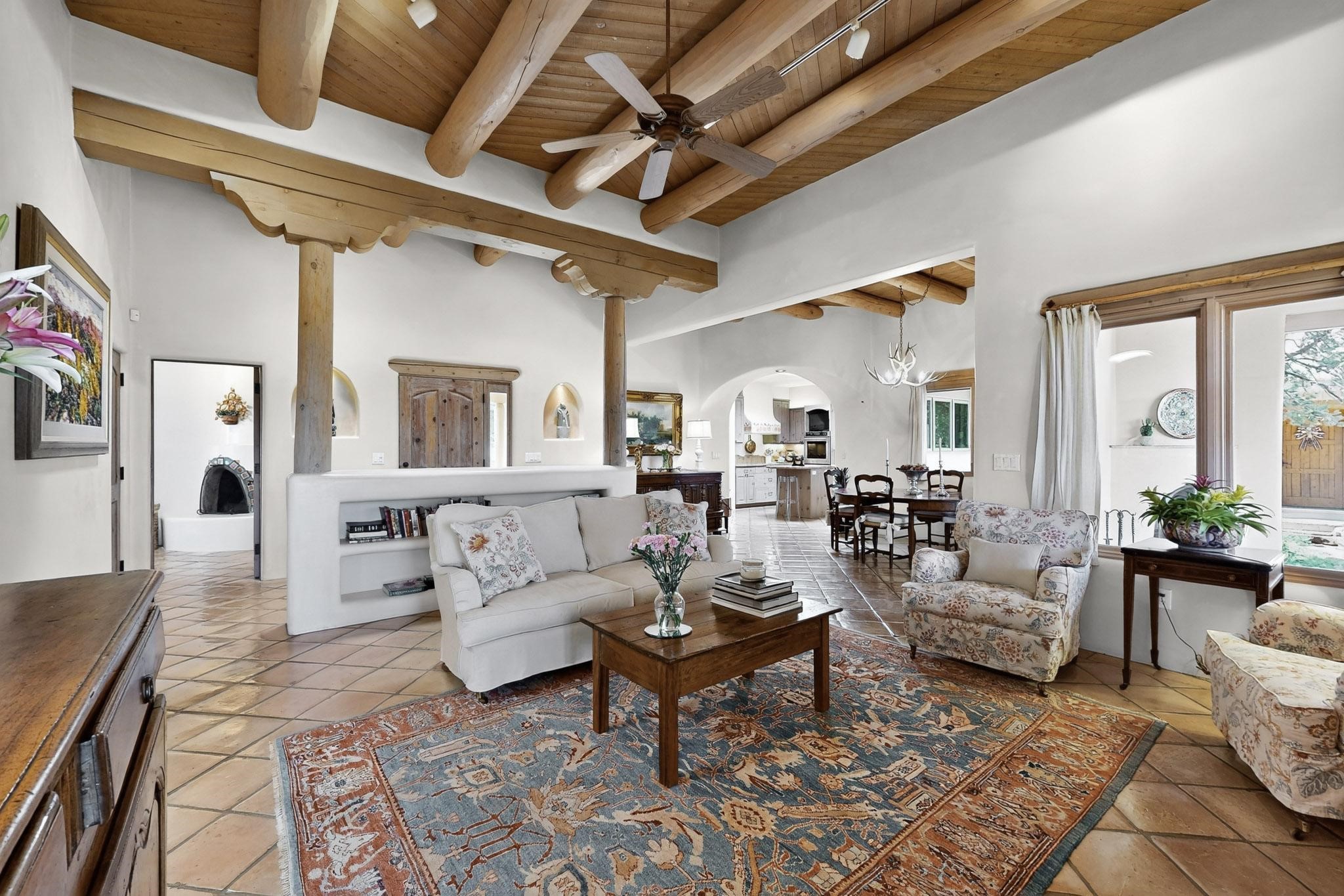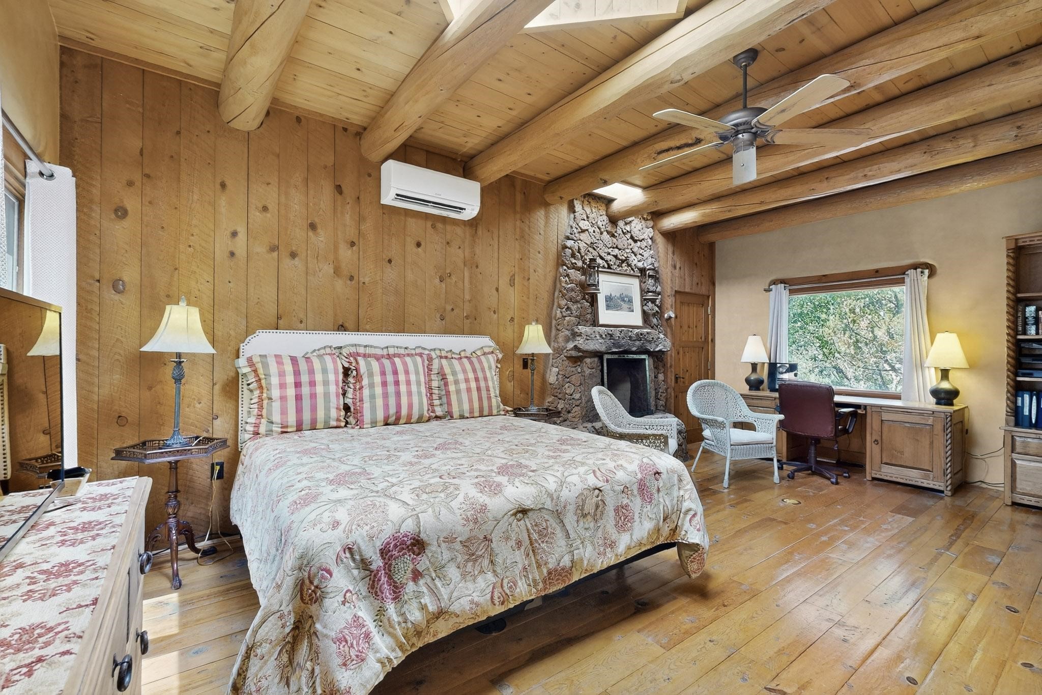 Vast sweeping panoramic western views define this exceptional property. The main house includes a primary bedroom suite with a fireplace, comfortable sitting area and a spa bath for relaxation. Large windows showcase the expansive western vistas, and doors lead to the portal. An additional room serves as either a TV room/office or bedroom and features its own fireplace and stunning views of the Sangres. The open floor plan seamlessly connects the living room, dining room, and kitchen, all centered around the fireplace. A unique and charming casita complements the main residence, equipped with a kitchenette, bath, and a cozy fireplace, making it ideal for guests or extended living. The wraparound portal, featuring a fireplace, showcases sweeping western views, offering the ideal setting to enjoy breathtaking sunsets. Relax to the soothing sounds of the stone fountain and enjoy watching the birds and butterflies in the fragrant colorful garden. A large patio area including a built-in grill, features additional space for relaxing and entertaining. The rooftop deck offers spectacular 360-degree views and the gated and walled property offers privacy.