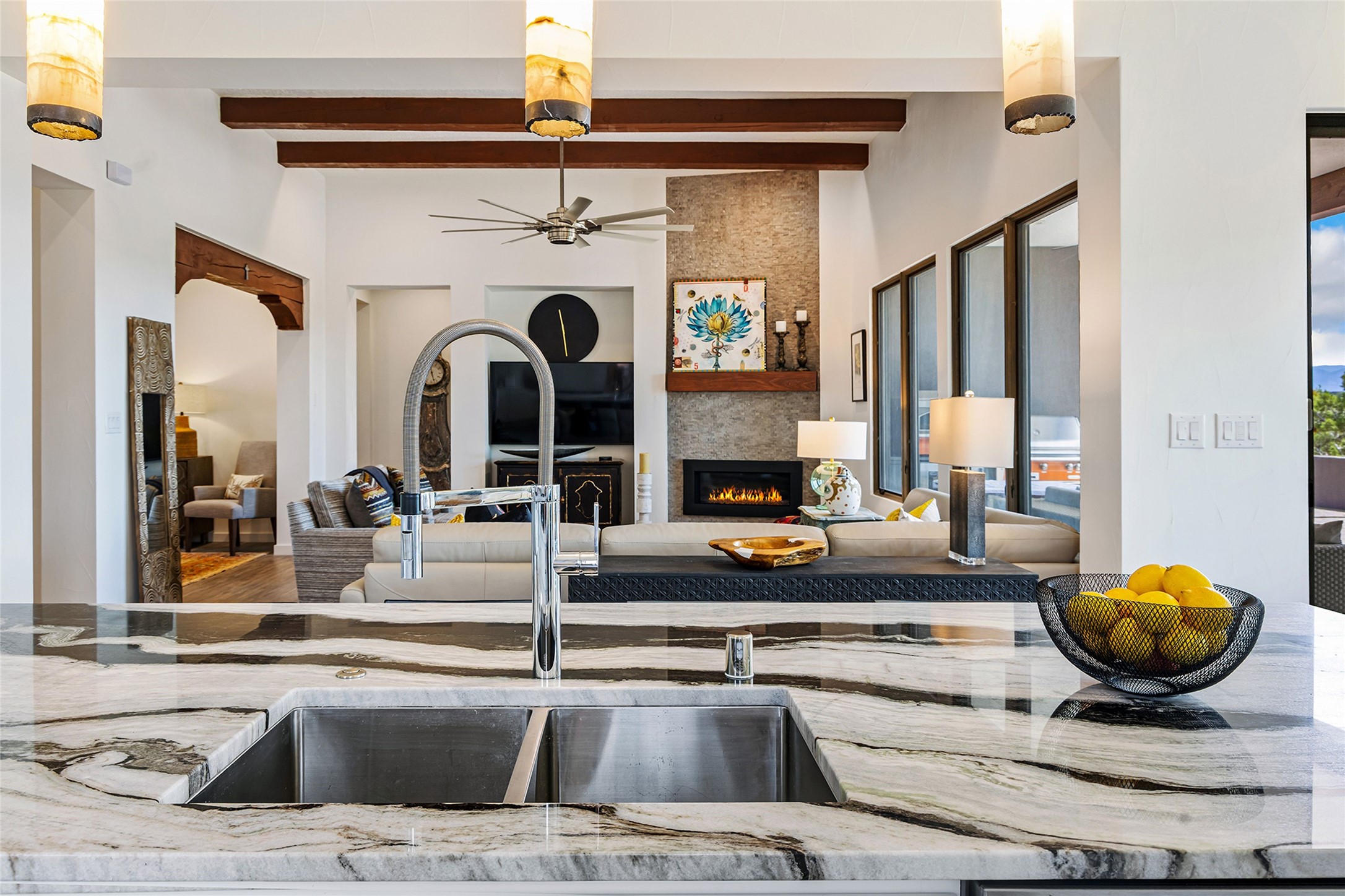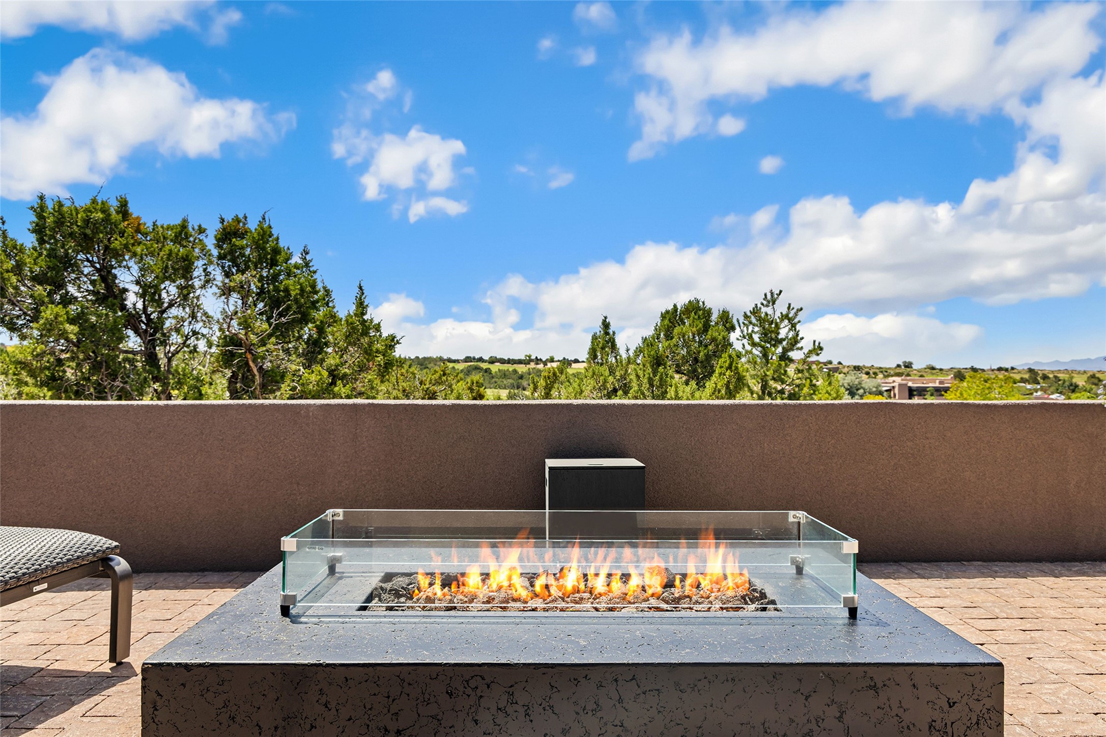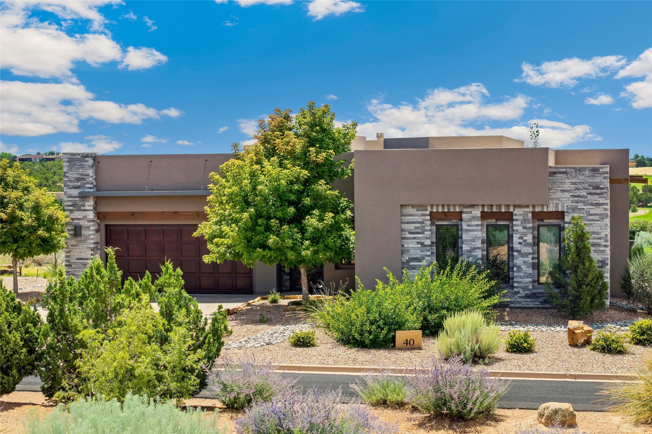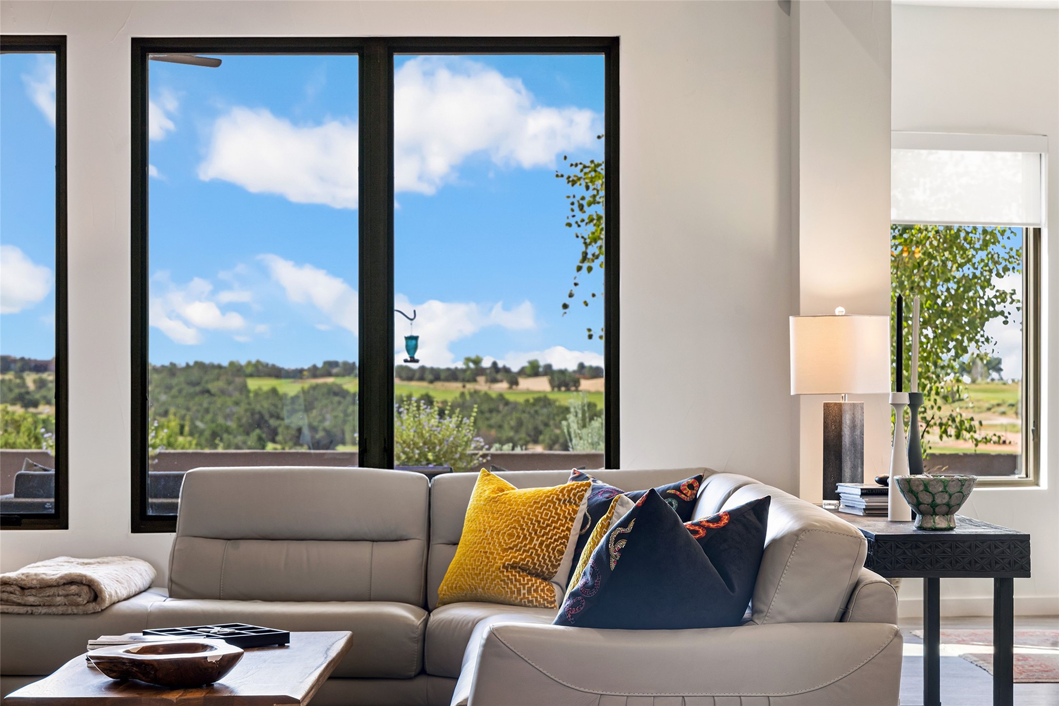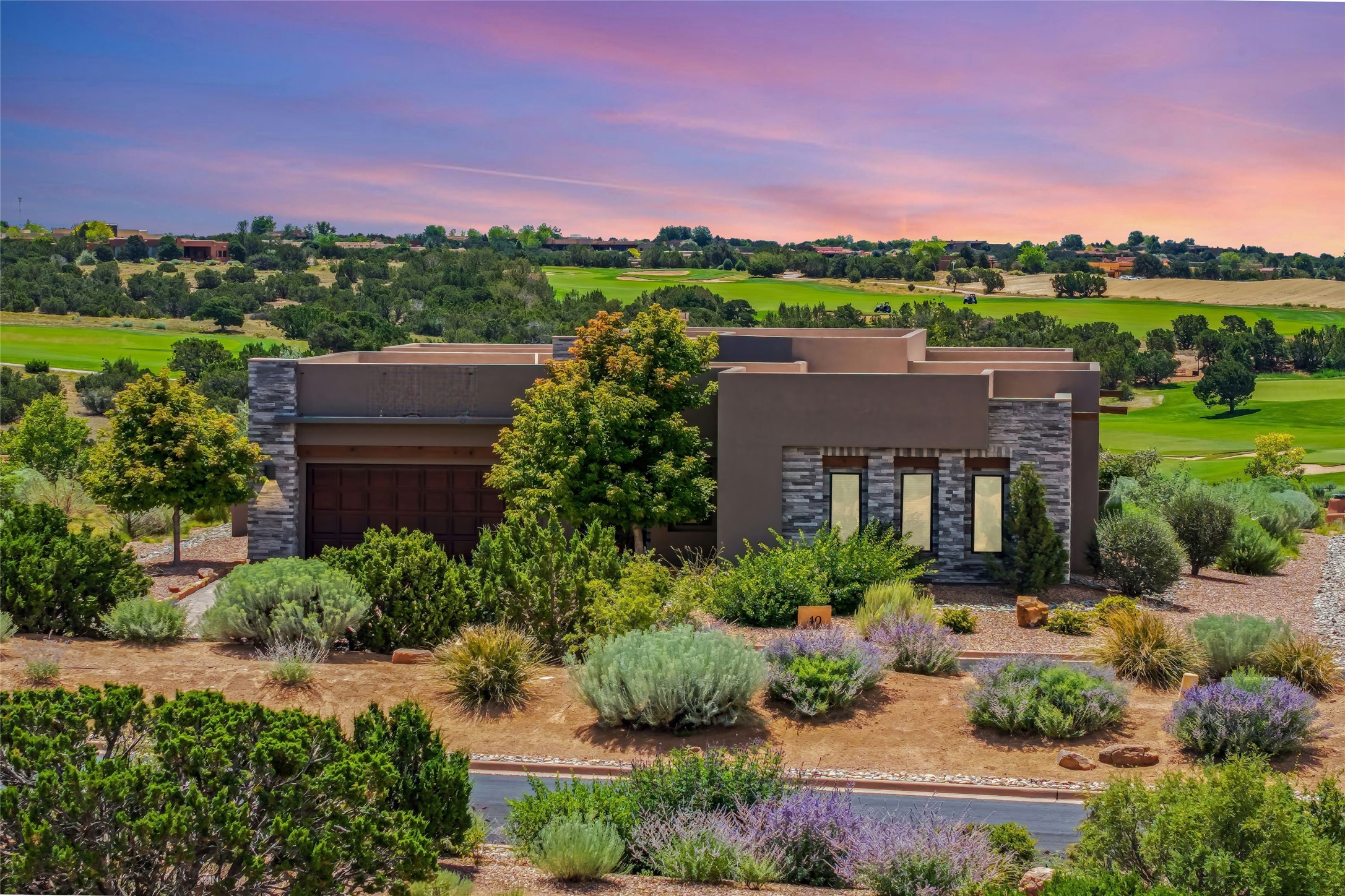 Experience the ultimate Las Campanas lifestyle with stunning golf course views and just a short walk to The Club at Las Campanas! Elevated above it all, this beautifully upgraded and custom-designed Santa Fe retreat offers four bedrooms and four bathrooms in a turnkey package, including all furnishings and artwork. Boasting exceptional golf course and sunset views, this exciting home seamlessly combines contemporary architecture with Santa Fe warmth. Sited on an elevated view lot, the residence welcomes you through a private, gated front courtyard featuring a tranquil fountain. Inside, the spacious, open-concept great room showcases breathtaking golf course views, a gas fireplace with stone accents, and a generous dining area. The newly updated chef's kitchen is a culinary dream, with natural stone countertops, an expansive island, a walk-in pantry, top-of-the-line appliances, and a casual dining space.The luxurious owner's suite offers a curved wall of windows framing the stunning views, along with a renovated en-suite bath featuring dual vanities, a soaking tub, walk-in shower, and a spacious walk-in closet. The separate guest wing provides three additional bedrooms for complete privacy from the main living areas.Step outside to an exceptional outdoor living space, one of the finest in Las Campanas, overlooking dual golf fairways and the newly opened Jemez Putting Course. Entertain effortlessly with a newly installed pizza oven, built-in BBQ grill, covered portal, and enclosed courtyard--perfect for pets and privacy.This defines excellence and offers an incredible and immediate opportunity to start enjoying the Santa Fe lifestyle. The owner's Equity Golf Membership to The Club at Las Campanas is also available for purchase separately.
