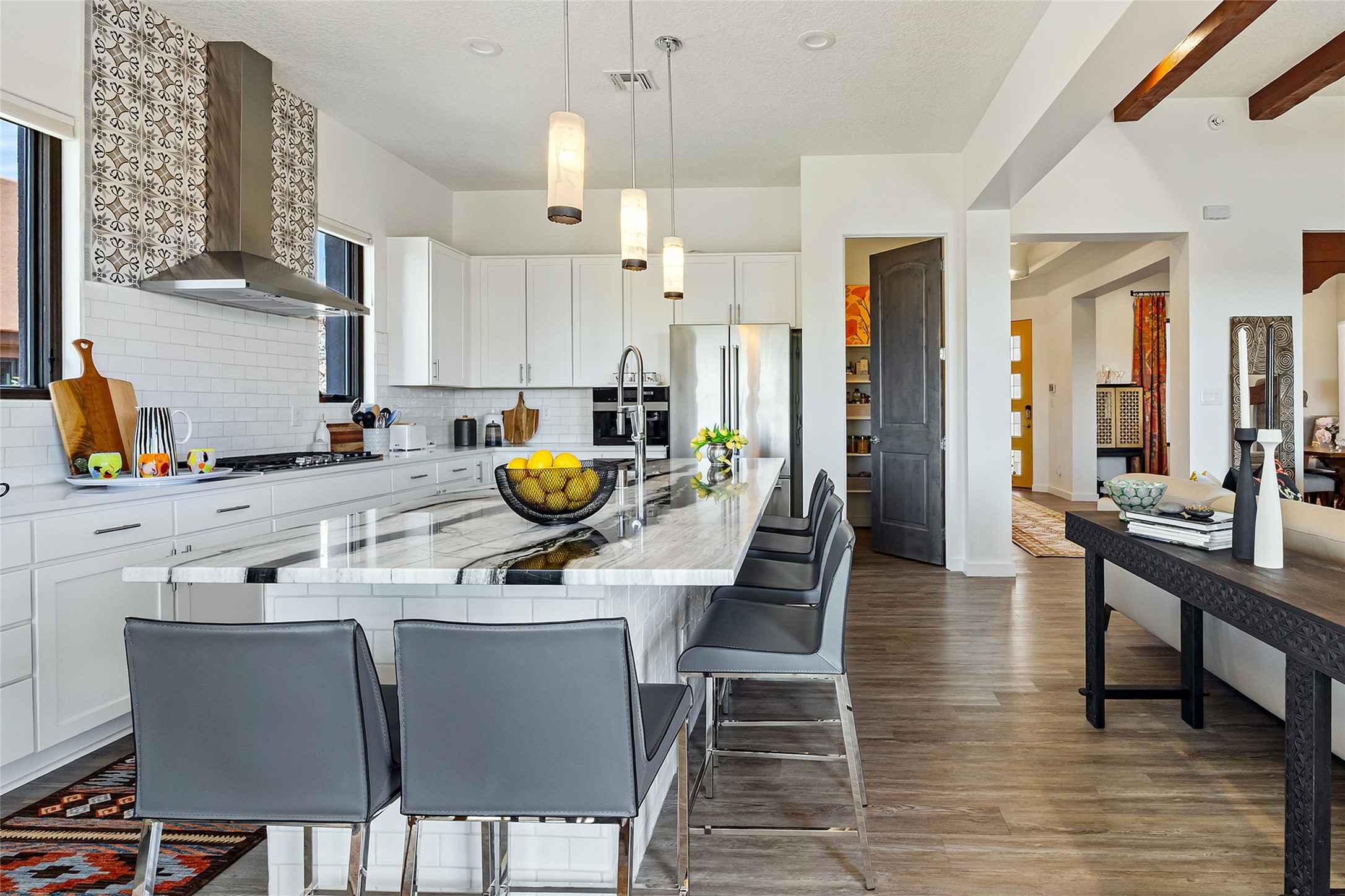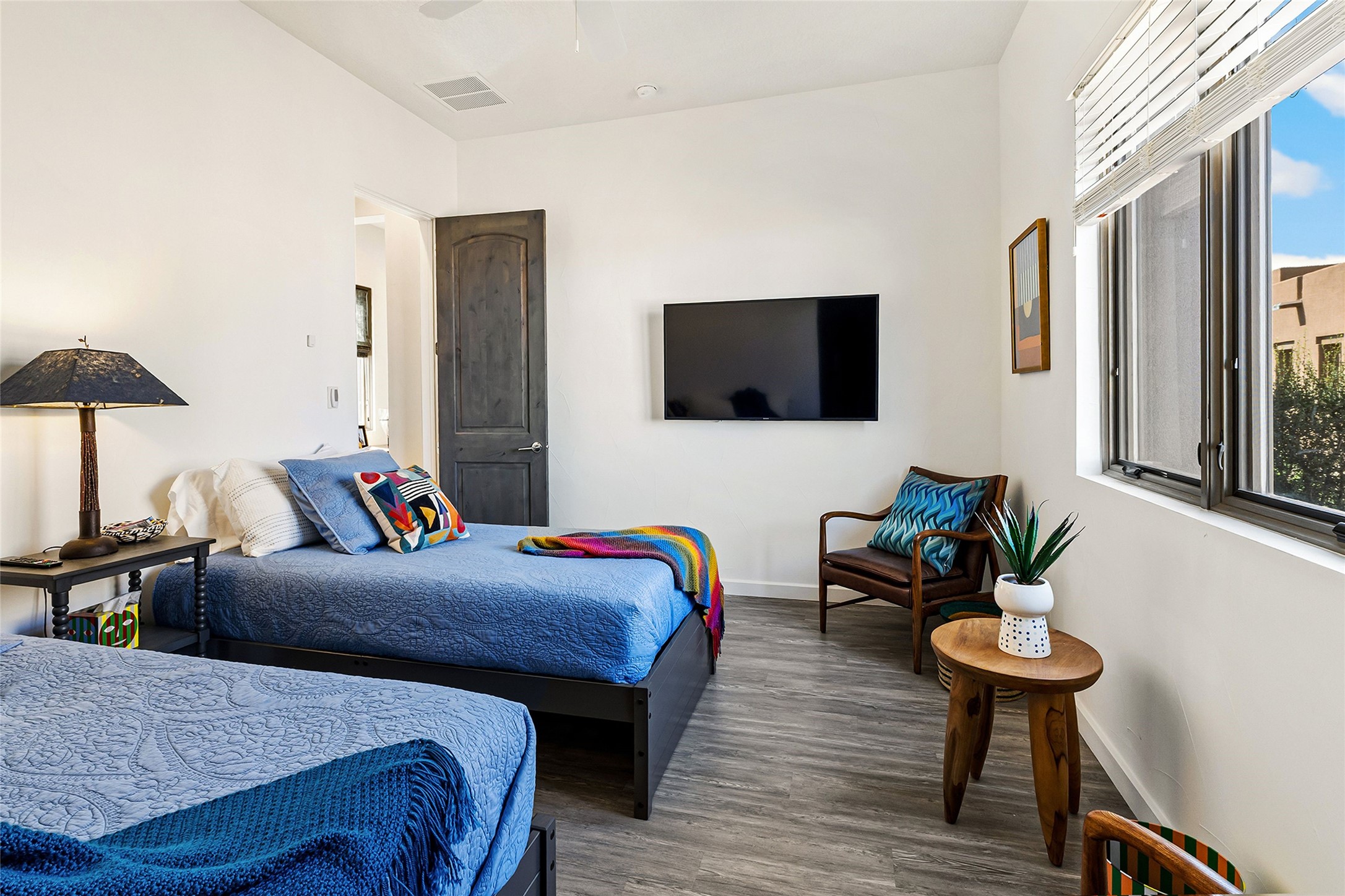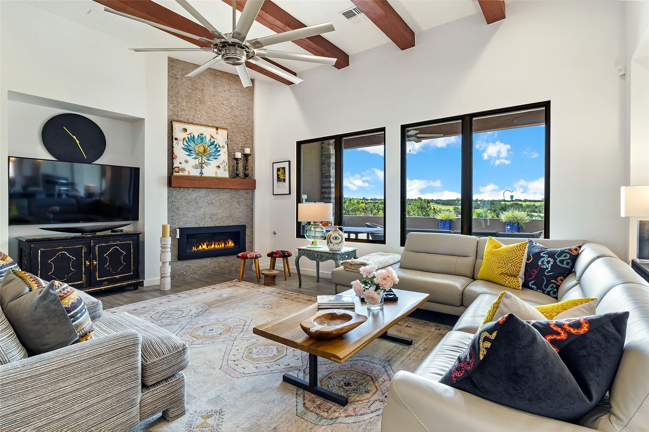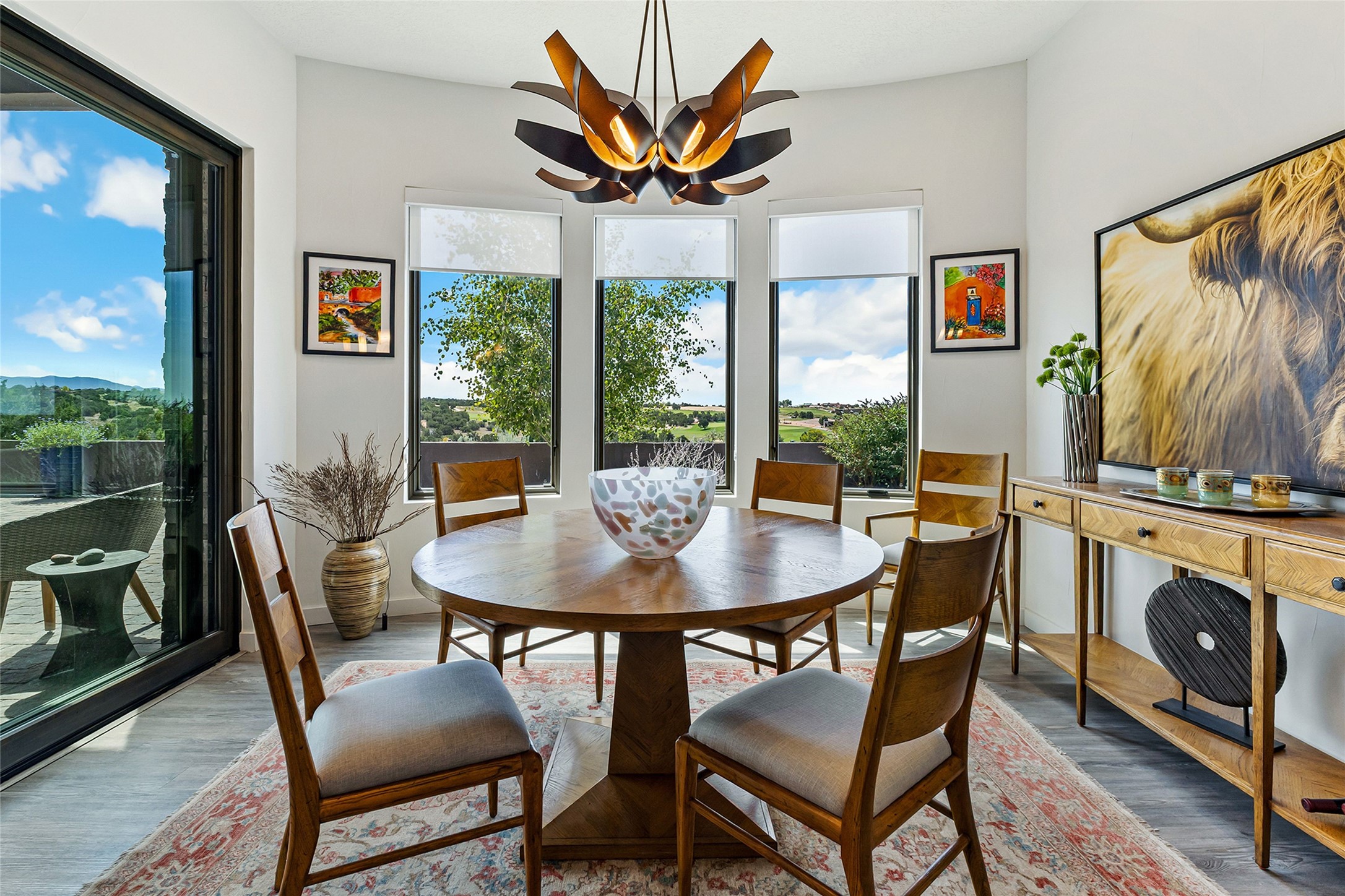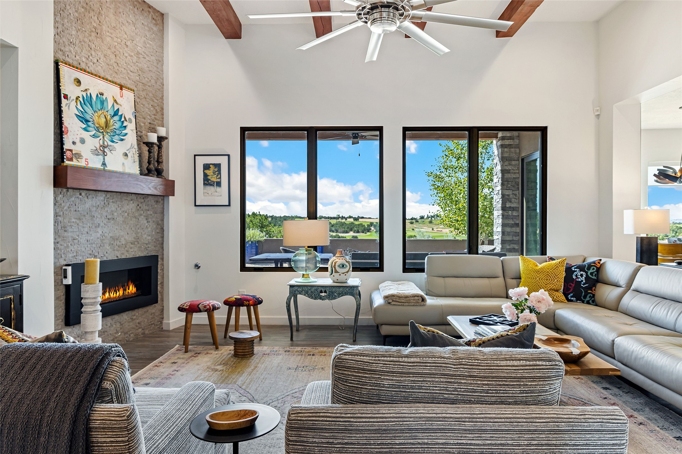 Experience the ultimate Las Campanas lifestyle with stunning golf course views and just a short walk to The Club at Las Campanas! Elevated above it all, this beautifully upgraded and custom-designed Santa Fe retreat offers four bedrooms and four bathrooms in a turnkey package, including all furnishings and artwork. Boasting exceptional golf course and sunset views, this exciting home seamlessly combines contemporary architecture with Santa Fe warmth. Sited on an elevated view lot, the residence welcomes you through a private, gated front courtyard featuring a tranquil fountain. Inside, the spacious, open-concept great room showcases breathtaking golf course views, a gas fireplace with stone accents, and a generous dining area. The newly updated chef's kitchen is a culinary dream, with natural stone countertops, an expansive island, a walk-in pantry, top-of-the-line appliances, and a casual dining space.The luxurious owner's suite offers a curved wall of windows framing the stunning views, along with a renovated en-suite bath featuring dual vanities, a soaking tub, walk-in shower, and a spacious walk-in closet. The separate guest wing provides three additional bedrooms for complete privacy from the main living areas.Step outside to an exceptional outdoor living space, one of the finest in Las Campanas, overlooking dual golf fairways and the newly opened Jemez Putting Course. Entertain effortlessly with a newly installed pizza oven, built-in BBQ grill, covered portal, and enclosed courtyard--perfect for pets and privacy.This defines excellence and offers an incredible and immediate opportunity to start enjoying the Santa Fe lifestyle. The owner's Equity Golf Membership to The Club at Las Campanas is also available for purchase separately.