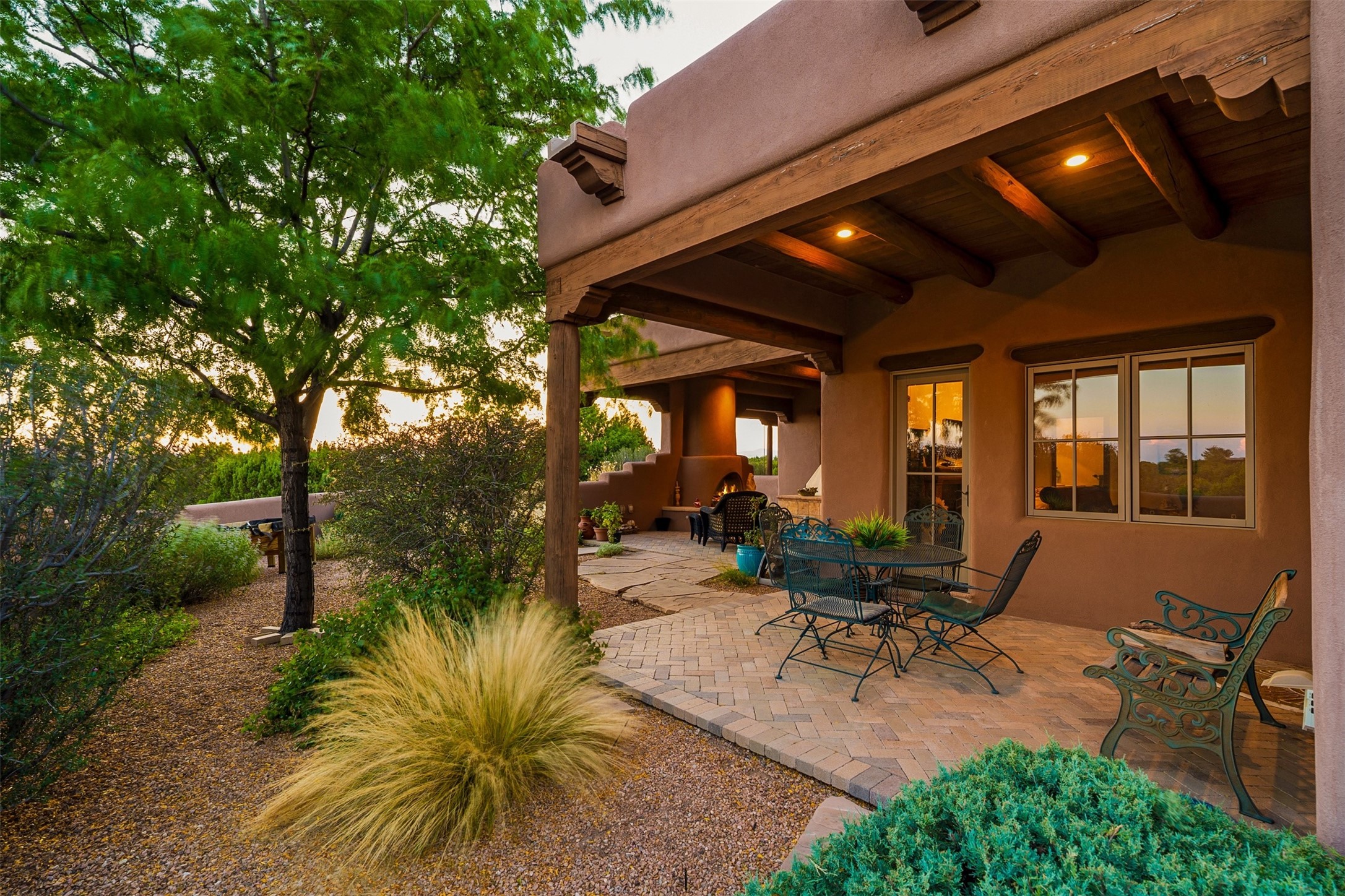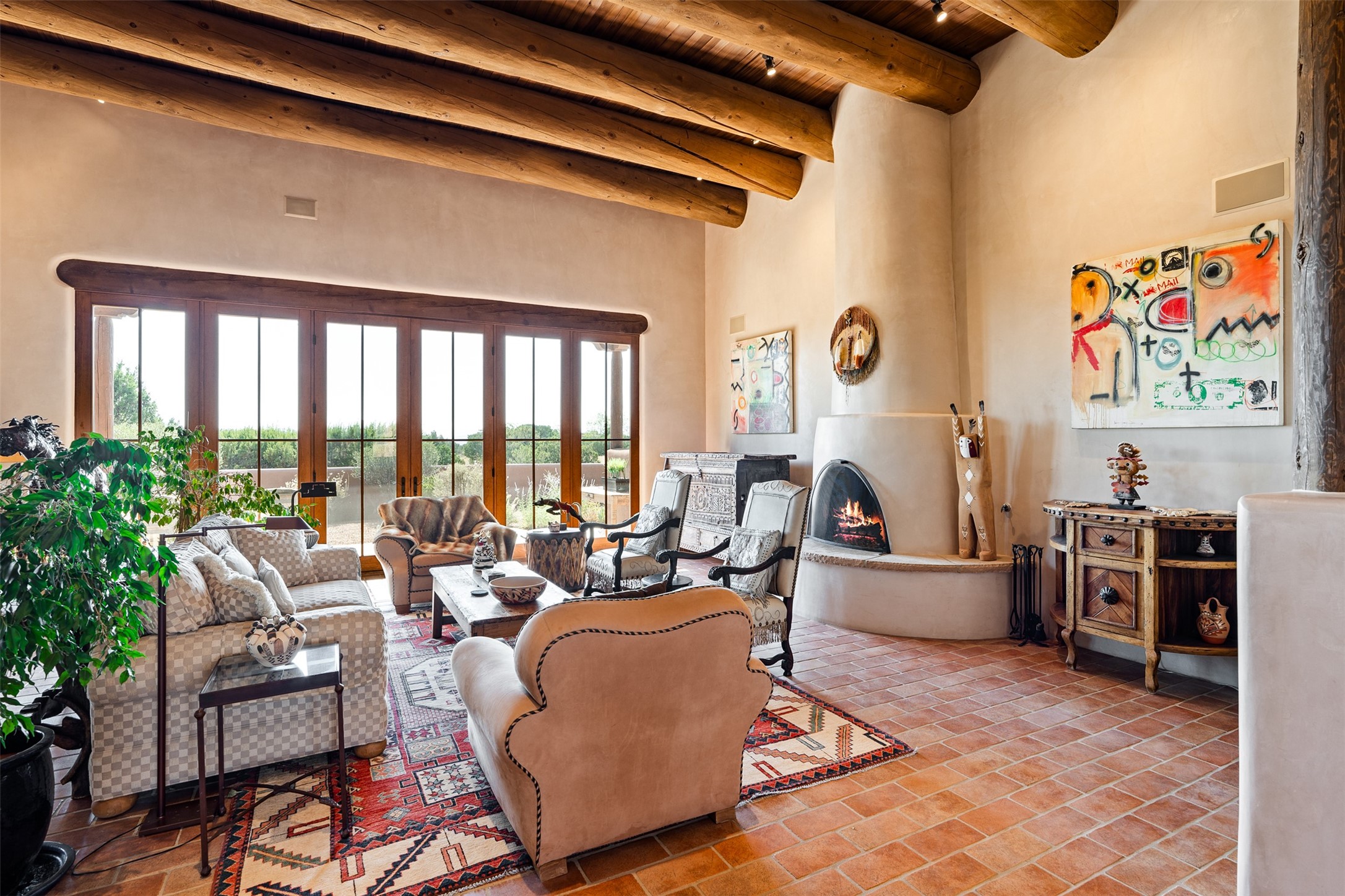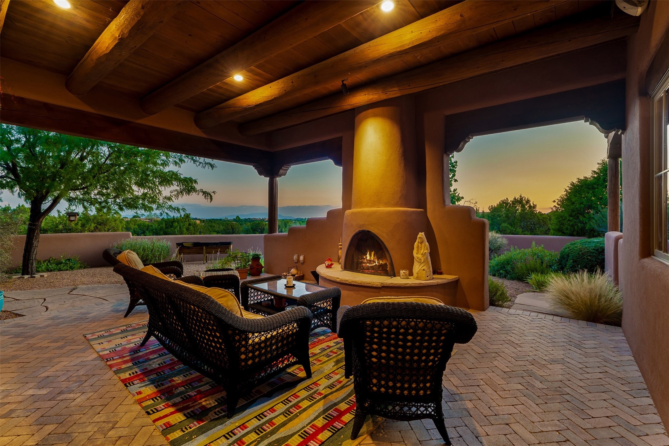 Experience Timeless Santa Fe Elegance in Las Campanas. Approach this exceptional Las Campanas residence through a walled courtyard shaded by mature aspens and graced with fruit trees. Step through the grand rustic wood double doors into a spacious, light-filled central living area that seamlessly unites the living room, dining space, gourmet kitchen, and breakfast nook. The home's layout offers perfect privacy: the primary suite and office are thoughtfully situated in one wing, while two guest suites occupy the opposite side. Throughout, traditional Santa Fe craftsmanship shines--diamond plaster walls, vigas, carved corbels, and built-in shelving and nichos that invite you to showcase art and treasured objects. The living room centers around a large kiva fireplace and frames views of the Jemez Mountains. Glass doors open to an expansive portale, ideal for entertaining or simply savoring the views. The gourmet kitchen features a six-burner Wolf range, wine cooler, granite countertops, center island, and connects to a charming breakfast nook with its own kiva fireplace. The primary suite is a serene retreat with a kiva fireplace, two large walk-in California Closets with built-in storage, and a luxurious bathroom featuring a bidet toilet, steam shower, and jetted tub. Step directly from the suite onto a private portale for morning coffee or evening stargazing. A spacious office with a built-in double desk completes this private wing. Each guest suite offers an en-suite bathroom, and access to a shaded portale; one bathroom includes a double vanity and jetted tub. Outdoor living is enhanced by large, shaded portales with high viga ceilings. The main portale features a built-in gas grill and automated shades. Mature aspens, fruit trees, and lush landscaping create a peaceful, private sanctuary. This home blends the soul of traditional Santa Fe design with the comfort and functionality of modern luxury--all in the heart of Las Campanas.