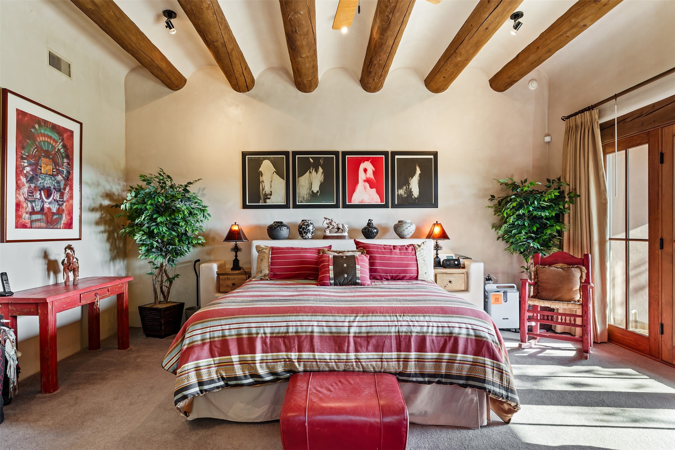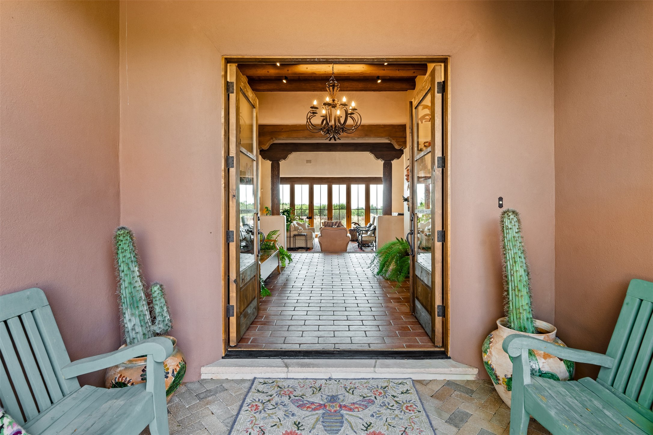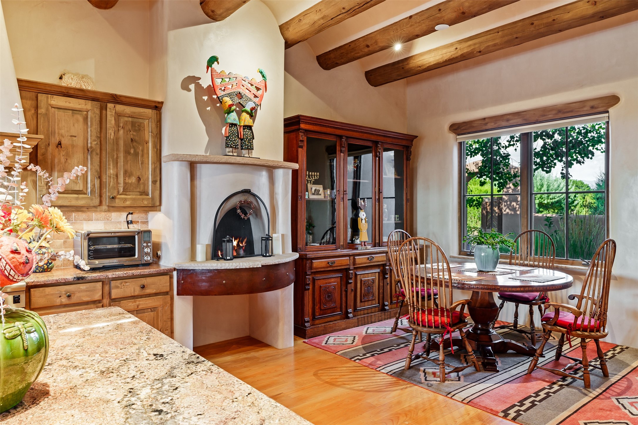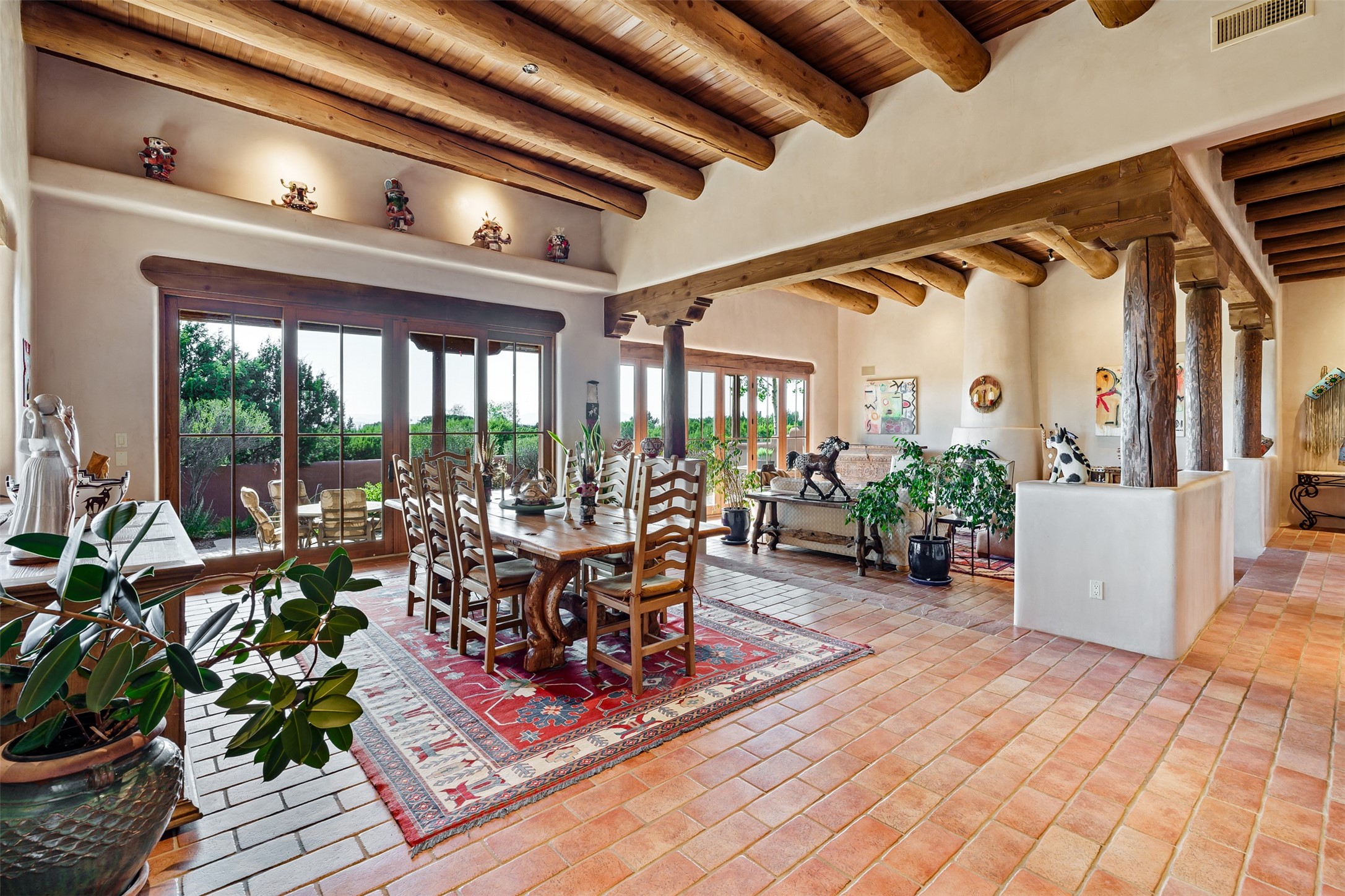 Experience Timeless Santa Fe Elegance in Las Campanas. Approach this exceptional Las Campanas residence through a walled courtyard shaded by mature aspens and graced with fruit trees. Step through the grand rustic wood double doors into a spacious, light-filled central living area that seamlessly unites the living room, dining space, gourmet kitchen, and breakfast nook. The home's layout offers perfect privacy: the primary suite and office are thoughtfully situated in one wing, while two guest suites occupy the opposite side. Throughout, traditional Santa Fe craftsmanship shines--diamond plaster walls, vigas, carved corbels, and built-in shelving and nichos that invite you to showcase art and treasured objects. The living room centers around a large kiva fireplace and frames views of the Jemez Mountains. Glass doors open to an expansive portale, ideal for entertaining or simply savoring the views. The gourmet kitchen features a six-burner Wolf range, wine cooler, granite countertops, center island, and connects to a charming breakfast nook with its own kiva fireplace. The primary suite is a serene retreat with a kiva fireplace, two large walk-in California Closets with built-in storage, and a luxurious bathroom featuring a bidet toilet, steam shower, and jetted tub. Step directly from the suite onto a private portale for morning coffee or evening stargazing. A spacious office with a built-in double desk completes this private wing. Each guest suite offers an en-suite bathroom, and access to a shaded portale; one bathroom includes a double vanity and jetted tub. Outdoor living is enhanced by large, shaded portales with high viga ceilings. The main portale features a built-in gas grill and automated shades. Mature aspens, fruit trees, and lush landscaping create a peaceful, private sanctuary. This home blends the soul of traditional Santa Fe design with the comfort and functionality of modern luxury--all in the heart of Las Campanas.