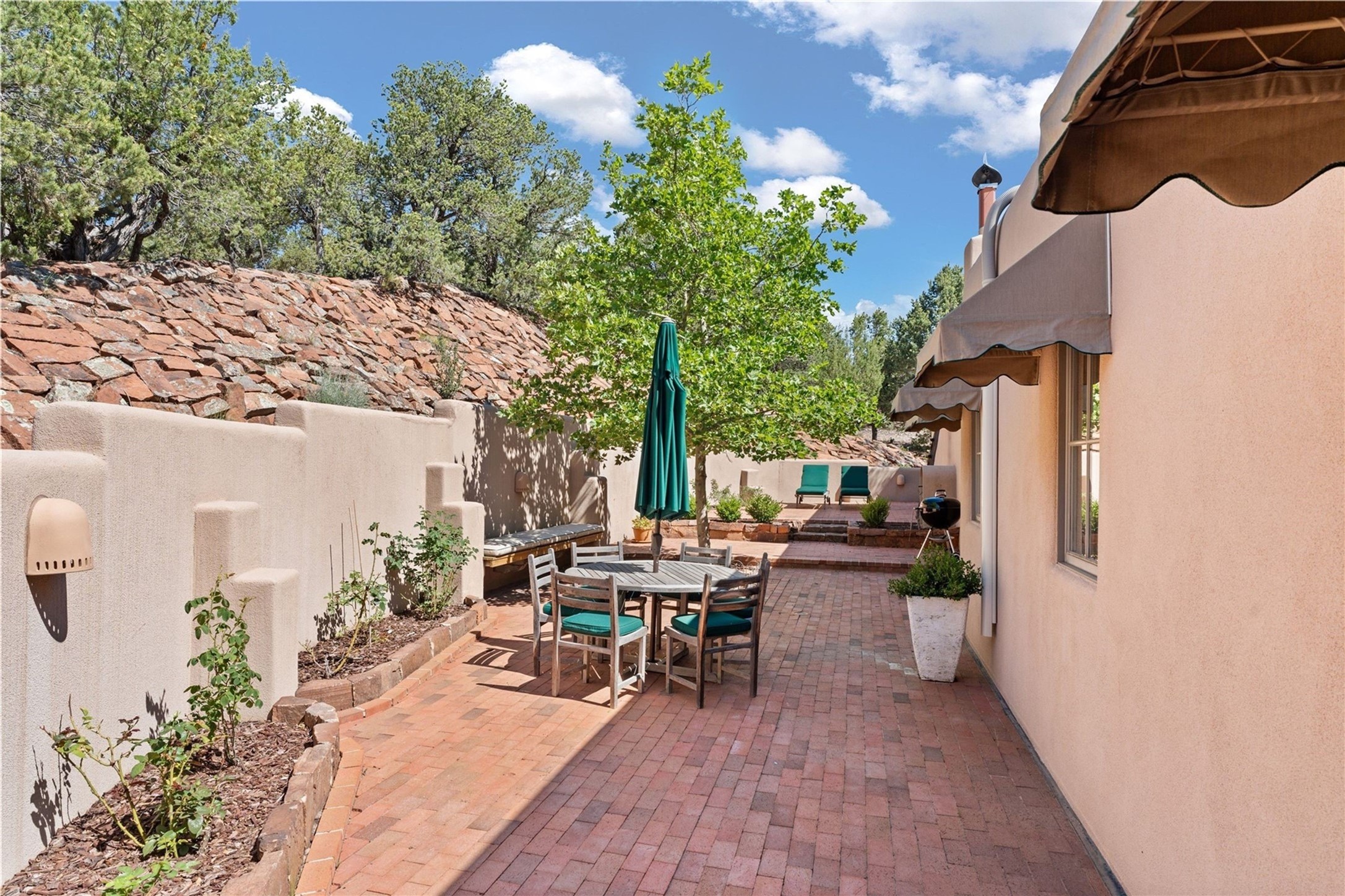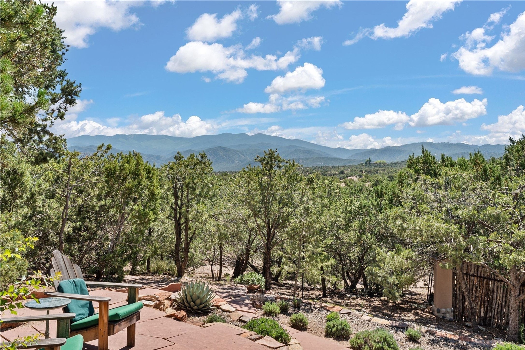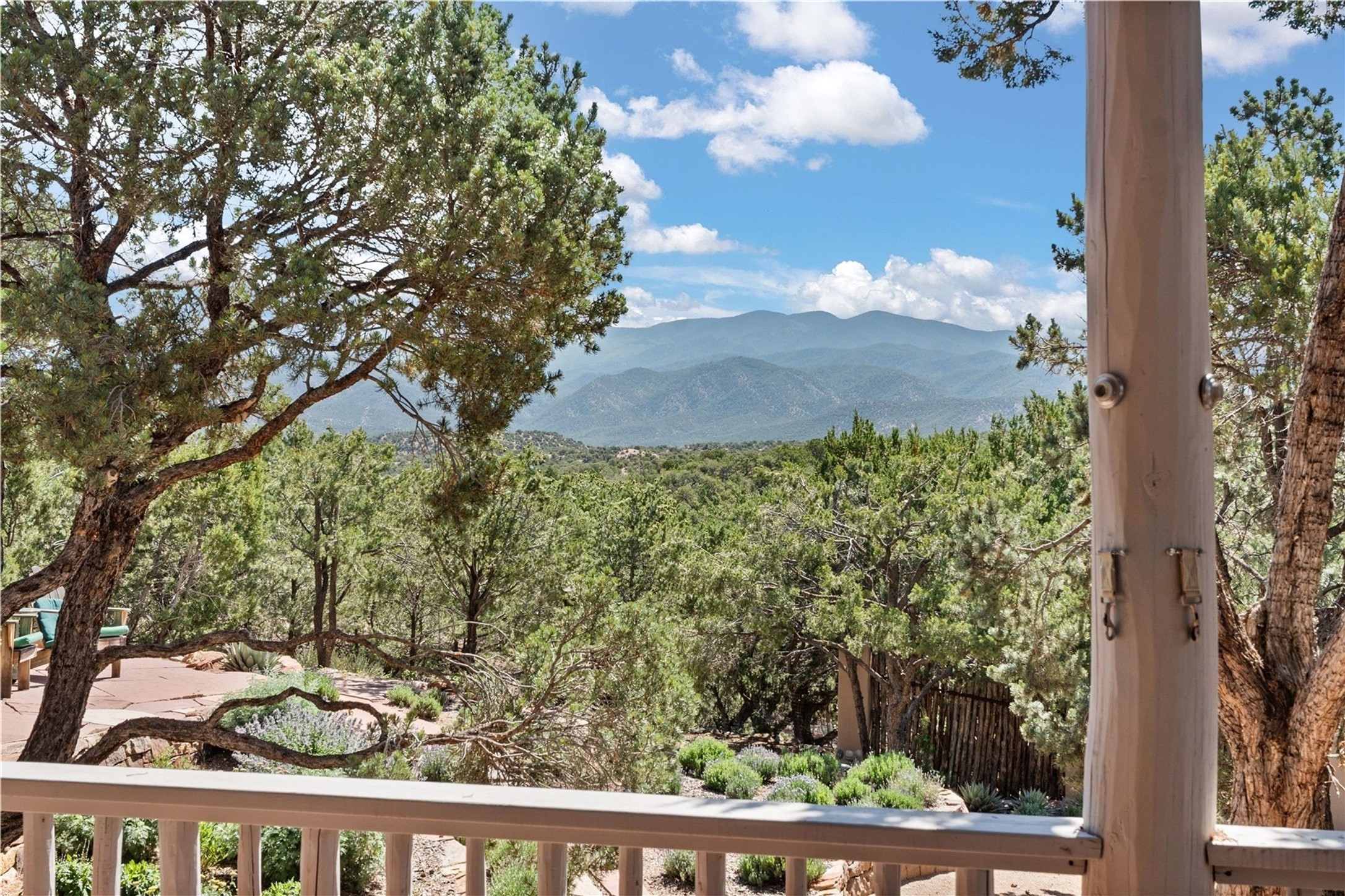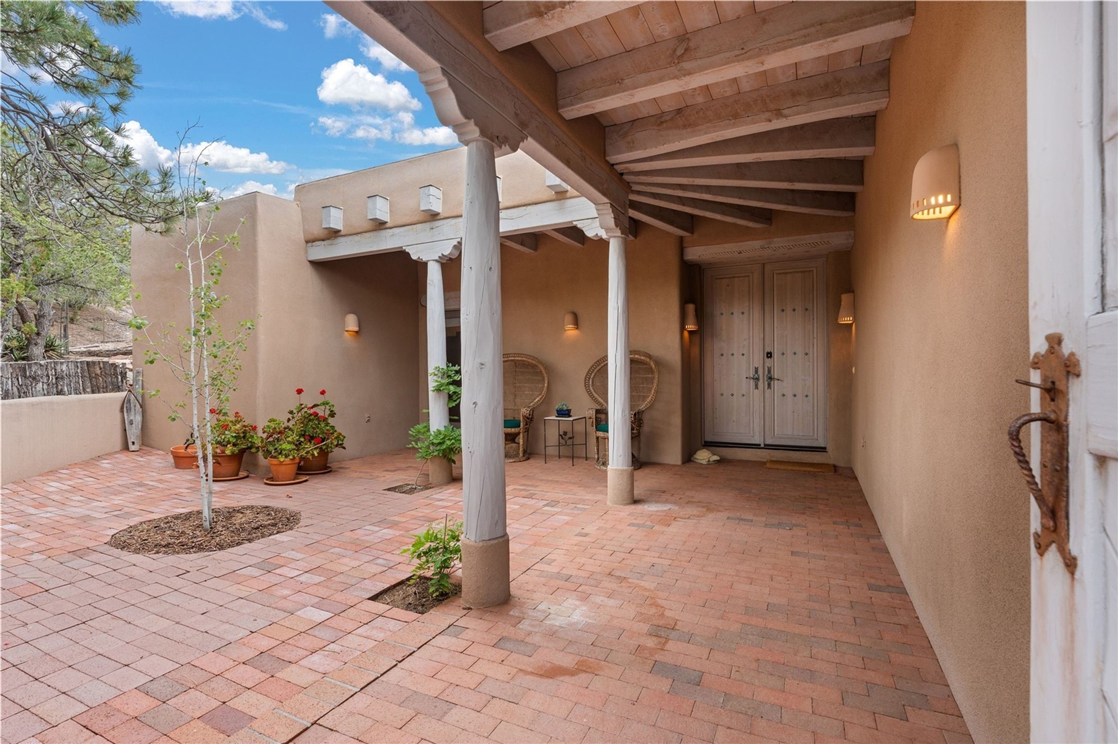 Gated Sangre de Cristo Estates 3 bedroom, 3.5 bath, single level, custom-built home with spectacular Sangre de Cristo Mountain views. Quality design features throughout include high ceilings, spacious rooms, vigas and beams, wood and brick floors, diamond finish plaster walls and arched doorways. Many recent improvements such as new (2023) membrane roof, completely renovated kitchen and baths, and brick driveways. Light and airy living room with stately fireplace. Spacious gourmet kitchen with high-end Bosch appliances, center island with Wolf gas range top, plentiful cabinetry and an informal breakfast room. Dining room with French doors and built in cabinetry. Dedicated personal library with a wood burning kiva fireplace and French doors to the outside in addition to a second living area or media room. There are 3-bedroom suites set apart from one another. Primary suite includes a kiva fireplace, sitting area and a wall of doors to the outside. Bonus flex space can be a personal gym or office. 2-car attached garage. The deep portals provide space for large events or leisurely relaxation in a secluded setting among mature pions and aspens, established landscaping, and sweeping mountain views. Conveniently located with easy access to 84/285 and only minutes away from the Santa Fe Opera and the historic downtown Plaza.
