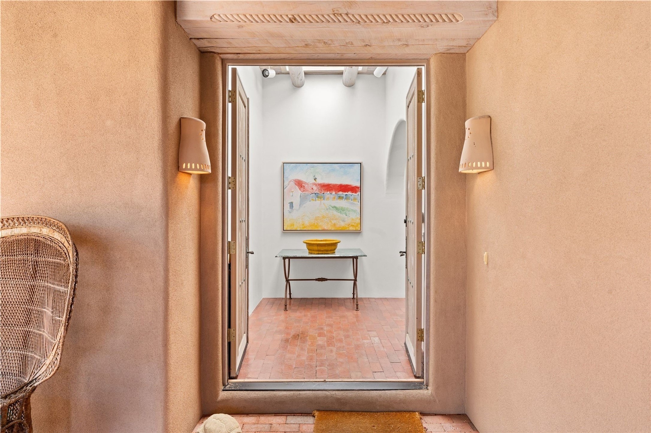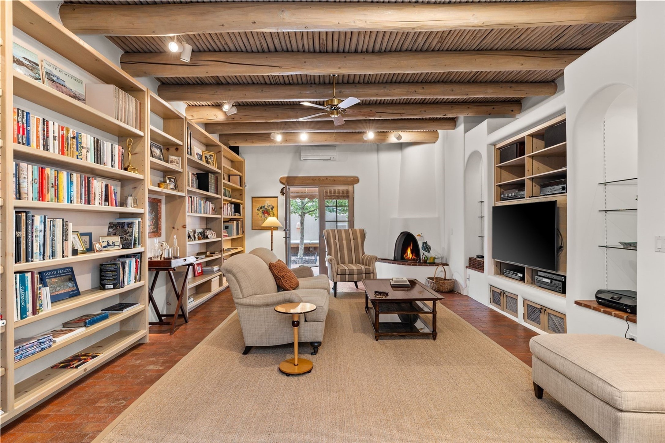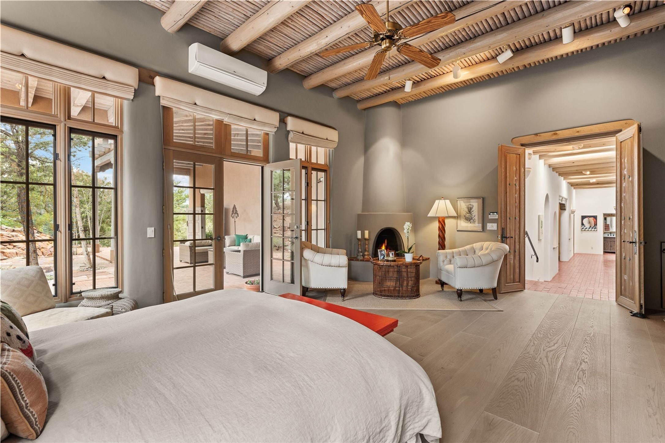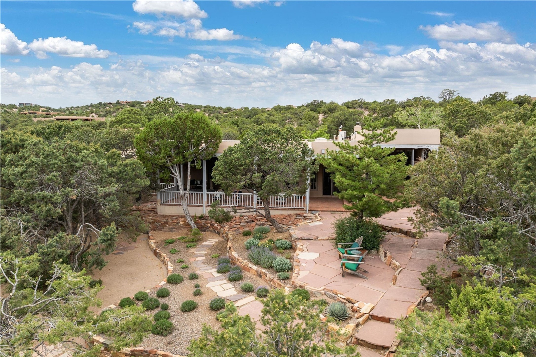 Gated Sangre de Cristo Estates 3 bedroom, 3.5 bath, single level, custom-built home with spectacular Sangre de Cristo Mountain views. Quality design features throughout include high ceilings, spacious rooms, vigas and beams, wood and brick floors, diamond finish plaster walls and arched doorways. Many recent improvements such as new (2023) membrane roof, completely renovated kitchen and baths, and brick driveways. Light and airy living room with stately fireplace. Spacious gourmet kitchen with high-end Bosch appliances, center island with Wolf gas range top, plentiful cabinetry and an informal breakfast room. Dining room with French doors and built in cabinetry. Dedicated personal library with a wood burning kiva fireplace and French doors to the outside in addition to a second living area or media room. There are 3-bedroom suites set apart from one another. Primary suite includes a kiva fireplace, sitting area and a wall of doors to the outside. Bonus flex space can be a personal gym or office. 2-car attached garage. The deep portals provide space for large events or leisurely relaxation in a secluded setting among mature pions and aspens, established landscaping, and sweeping mountain views. Conveniently located with easy access to 84/285 and only minutes away from the Santa Fe Opera and the historic downtown Plaza.