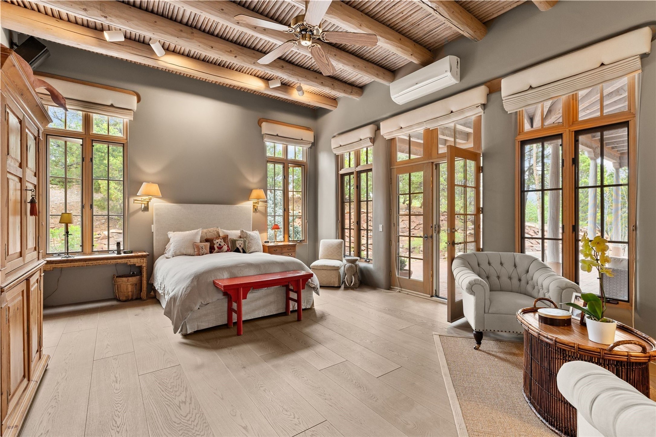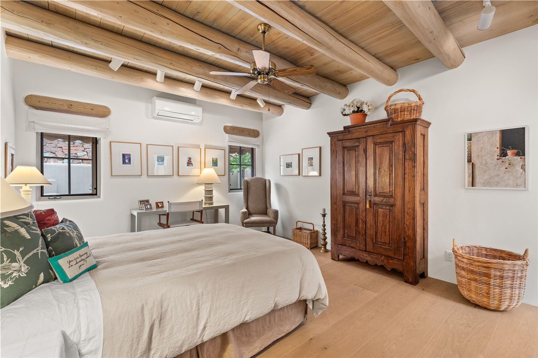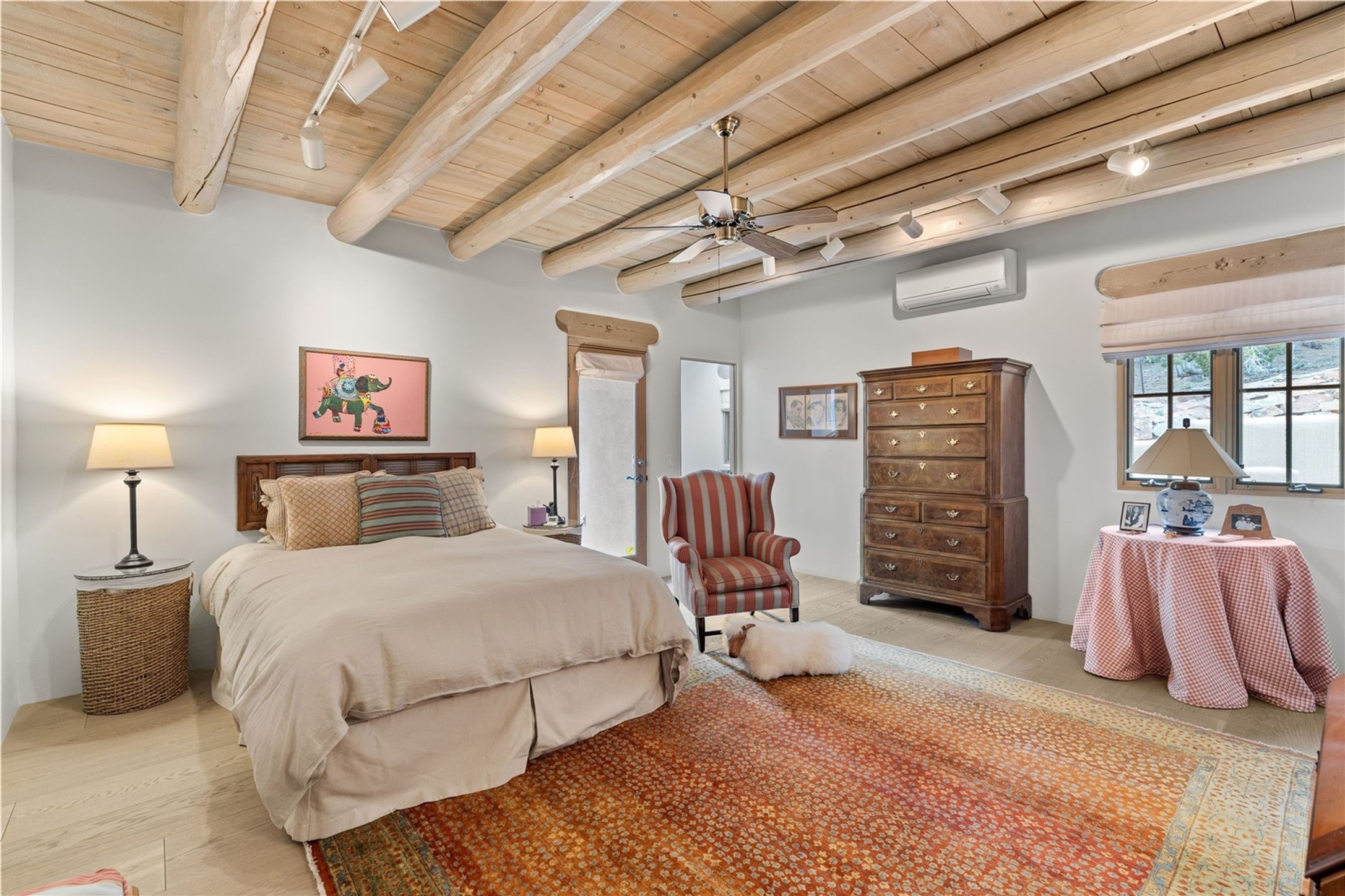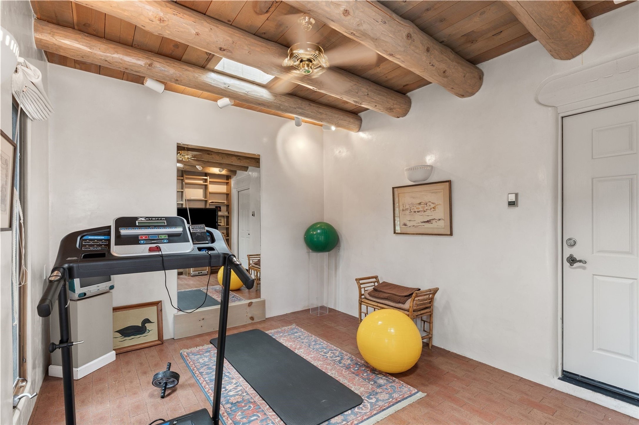 Gated Sangre de Cristo Estates 3 bedroom, 3.5 bath, single level, custom-built home with spectacular Sangre de Cristo Mountain views. Quality design features throughout include high ceilings, spacious rooms, vigas and beams, wood and brick floors, diamond finish plaster walls and arched doorways. Many recent improvements such as new (2023) membrane roof, completely renovated kitchen and baths, and brick driveways. Light and airy living room with stately fireplace. Spacious gourmet kitchen with high-end Bosch appliances, center island with Wolf gas range top, plentiful cabinetry and an informal breakfast room. Dining room with French doors and built in cabinetry. Dedicated personal library with a wood burning kiva fireplace and French doors to the outside in addition to a second living area or media room. There are 3-bedroom suites set apart from one another. Primary suite includes a kiva fireplace, sitting area and a wall of doors to the outside. Bonus flex space can be a personal gym or office. 2-car attached garage. The deep portals provide space for large events or leisurely relaxation in a secluded setting among mature pions and aspens, established landscaping, and sweeping mountain views. Conveniently located with easy access to 84/285 and only minutes away from the Santa Fe Opera and the historic downtown Plaza.