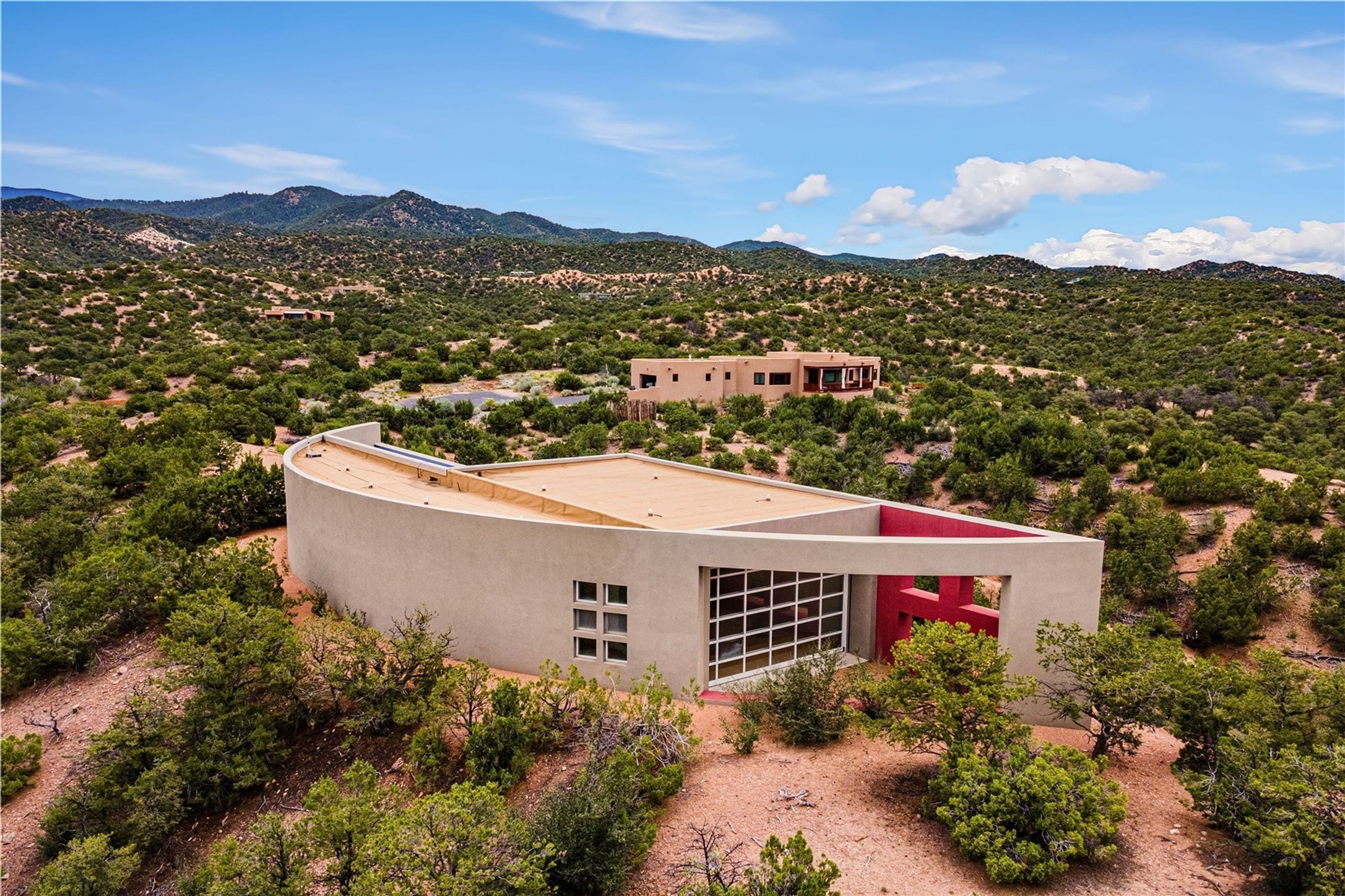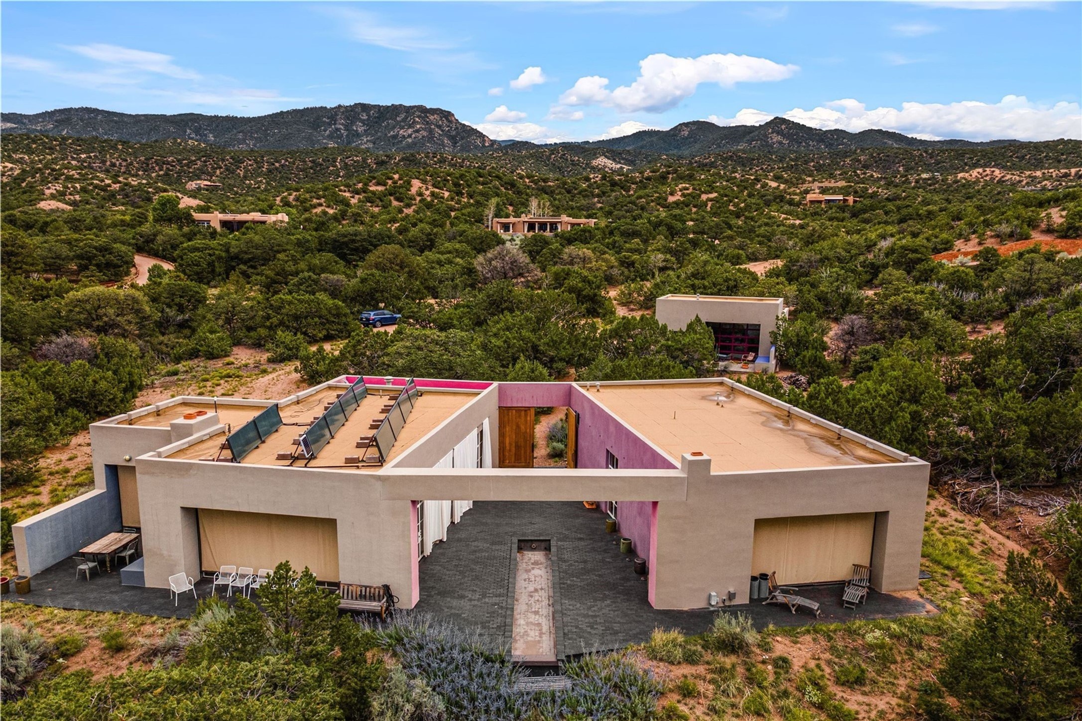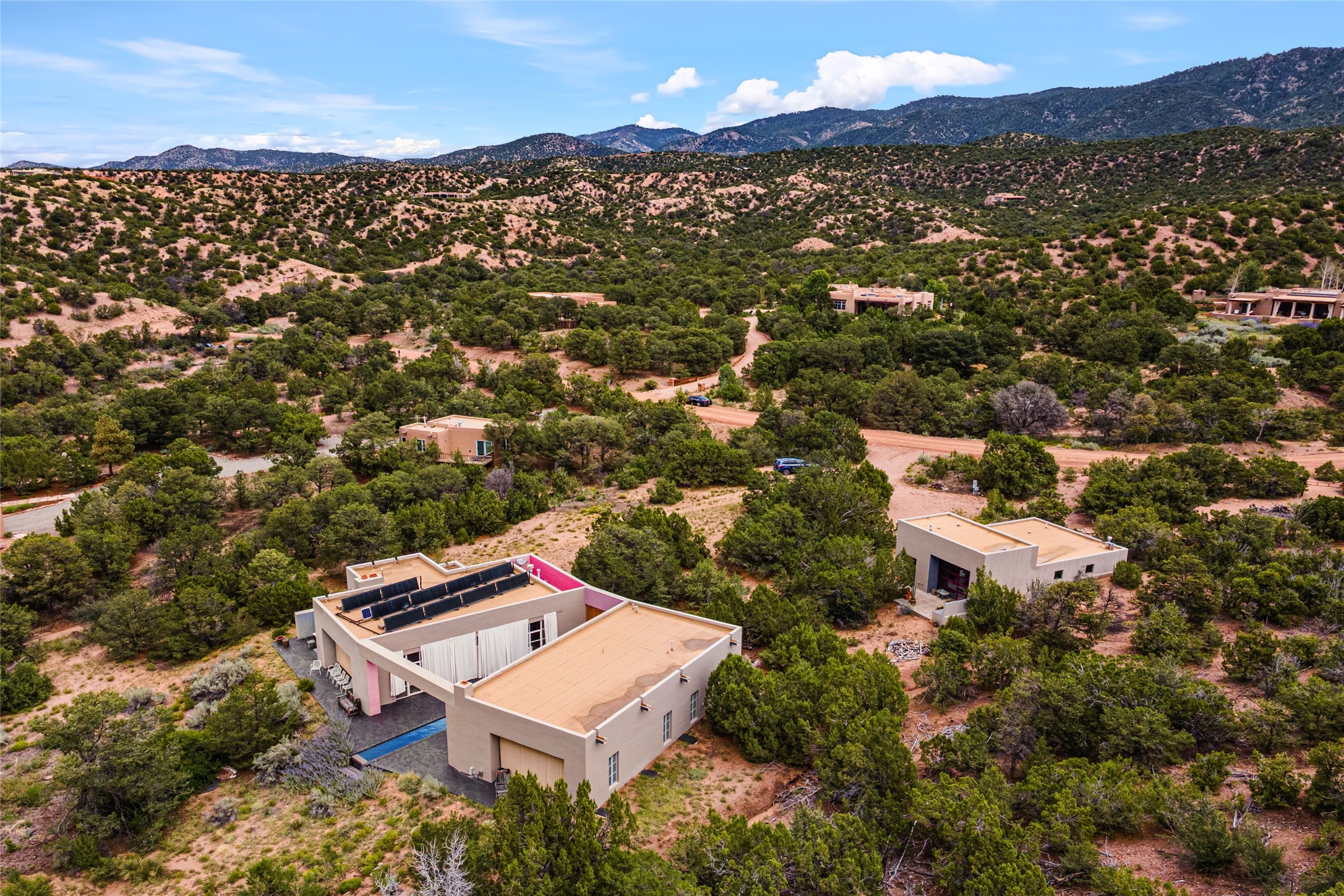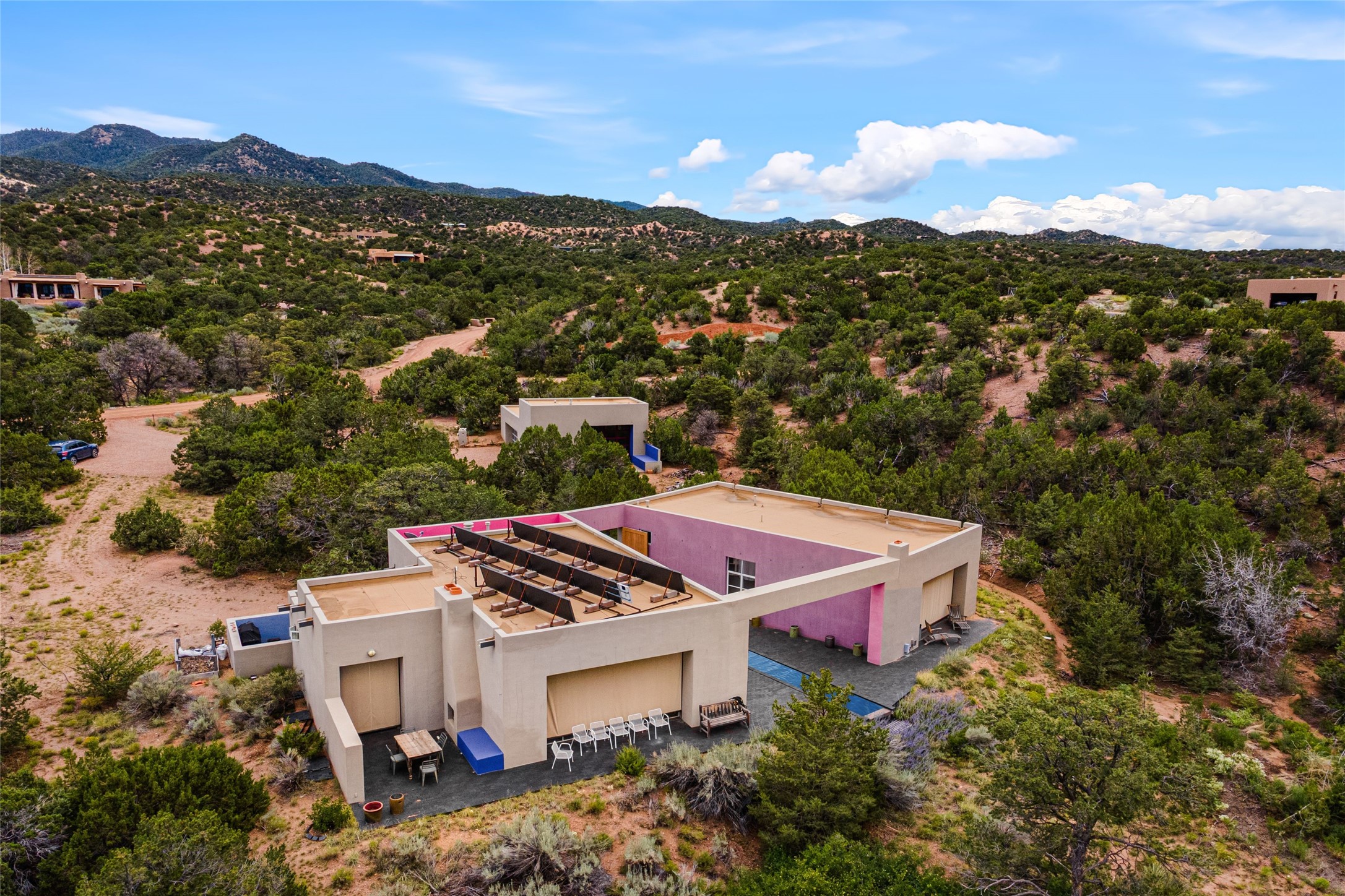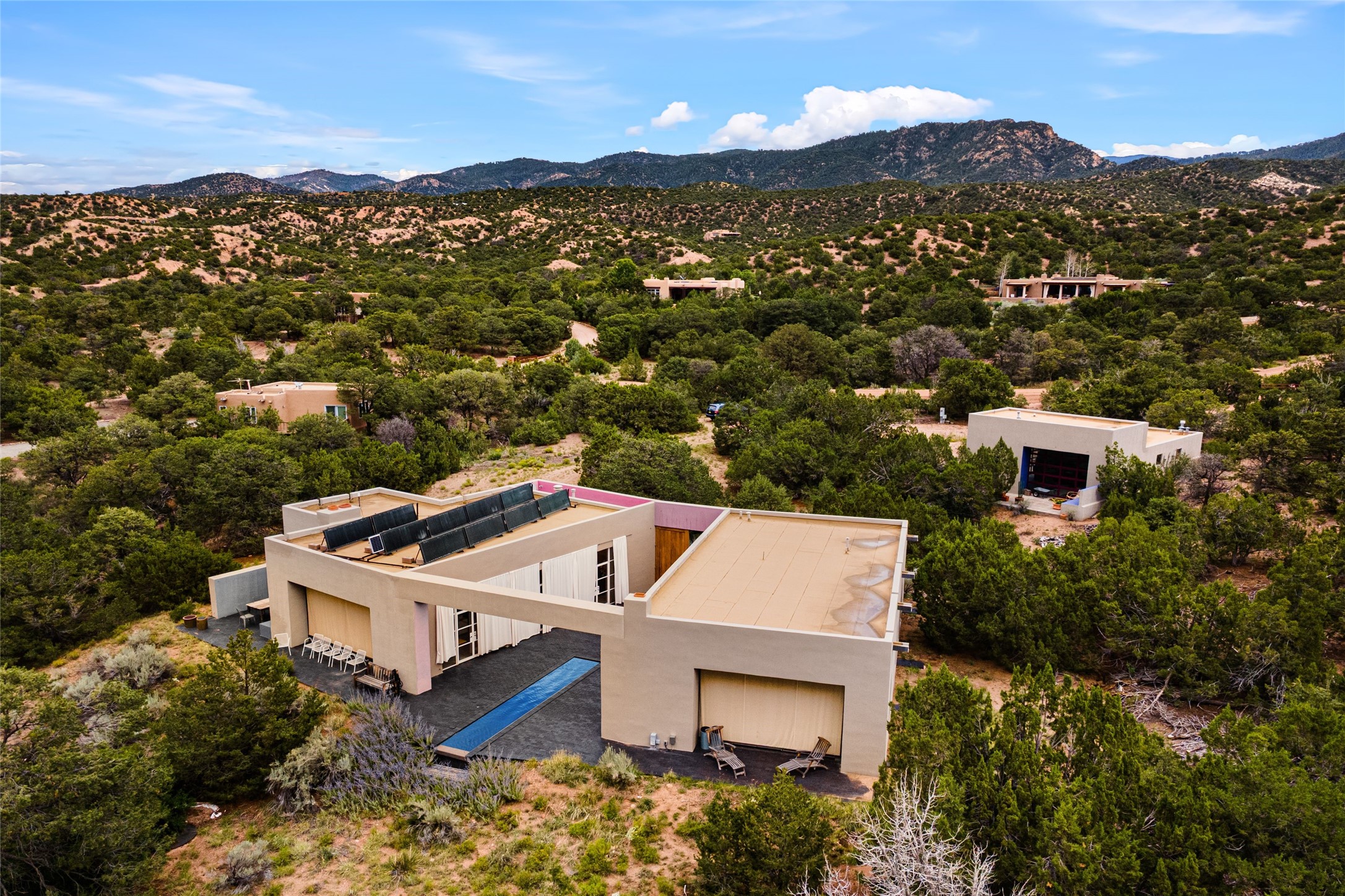 Stunning Modernist artist retreat in Tesuque located on a heavily wooded 7+/- acre view lot. Conceived by the owner as a private residence including a spectacular professional studio high on a ridge above the residence, the living quarters are divided into two structures separated by a spacious bricked patio.The larger of the two structures includes a well-equipped kitchen featuring an Aga stove, zinc counters that separate the dining area which leads to the living area. Open concept design, 12 foot ceilings throughout, surrounded by 10' glass walls on two sides, there are polished concrete floors, in-floor radiant heat, all adding to a great sense of volume and space. In intimate study that functions as a occasional guest bedroom includes a 3/4 bath. There is passive solar heating assistAccoss the bricked patio is the second structure including a massive bedroom, a large walk-in closet and full bath with jetted tub, twin sinks and shower compartment. 12' ceilings, diamond plastered walls and polished concrete floors with in-floor radiant heat and 10' glass walls.On the ridge above is an amazing professional studio that has been used for photography. A full dark room is included. There are polished concrete floors with radiant heat, 12' ceilings and a huge glass wall with a roll-up glass door. Also there is a guest space that includes a kitchen, a 3/4 bath and sleeping loft. Adjacent but completely separate is a stunning 65' long gallery and library with 10' high wood grid bookshelves.