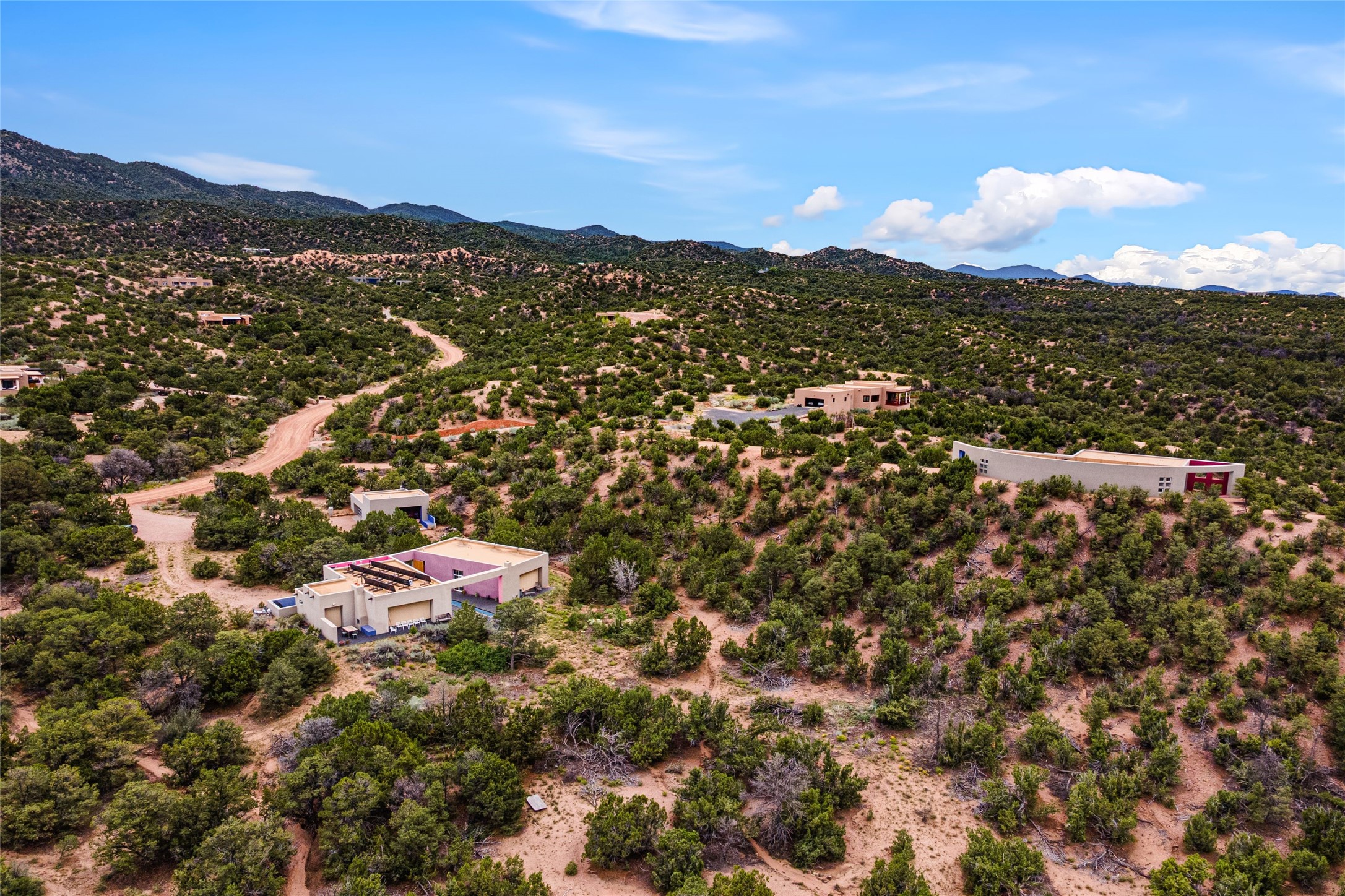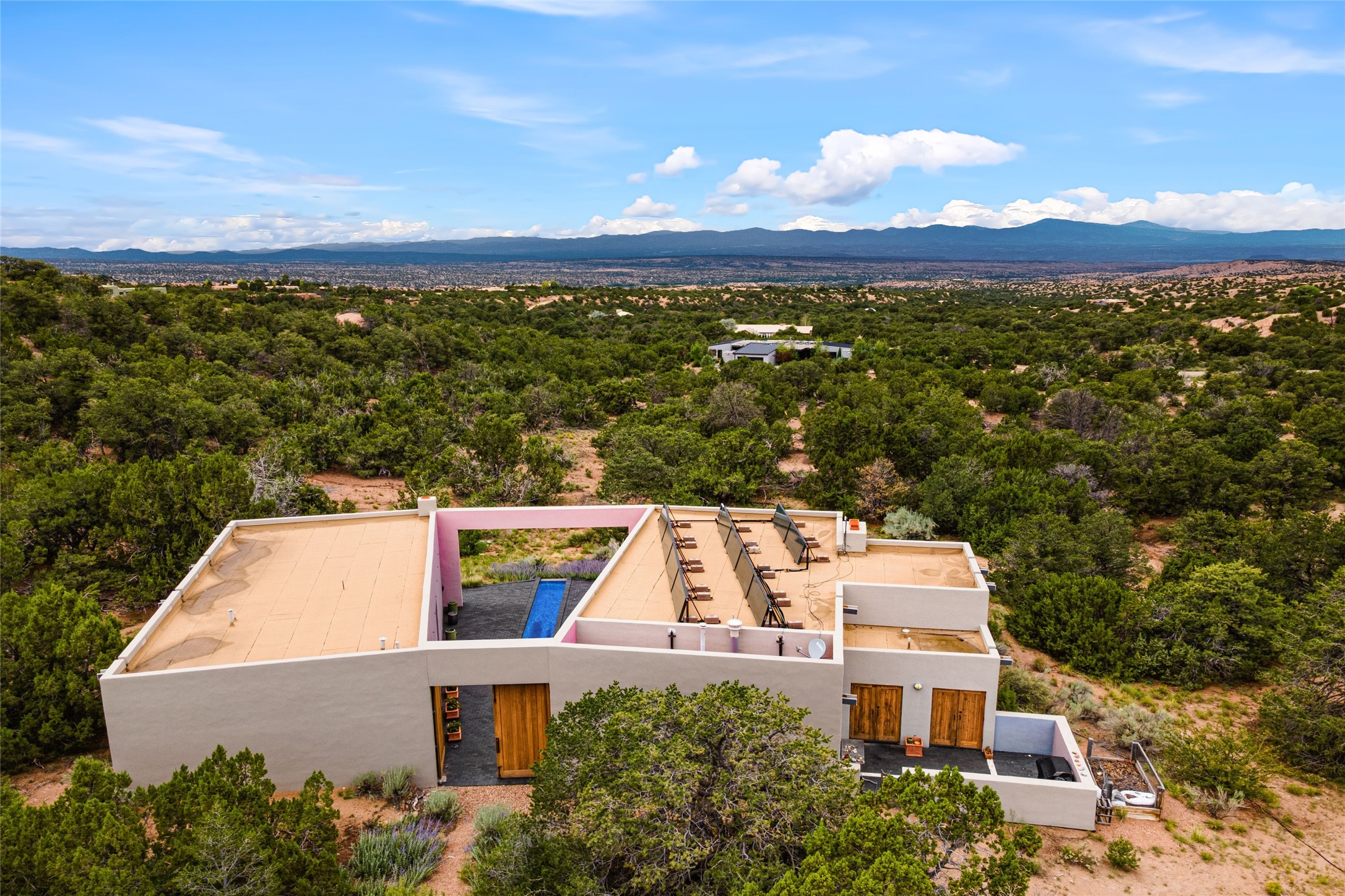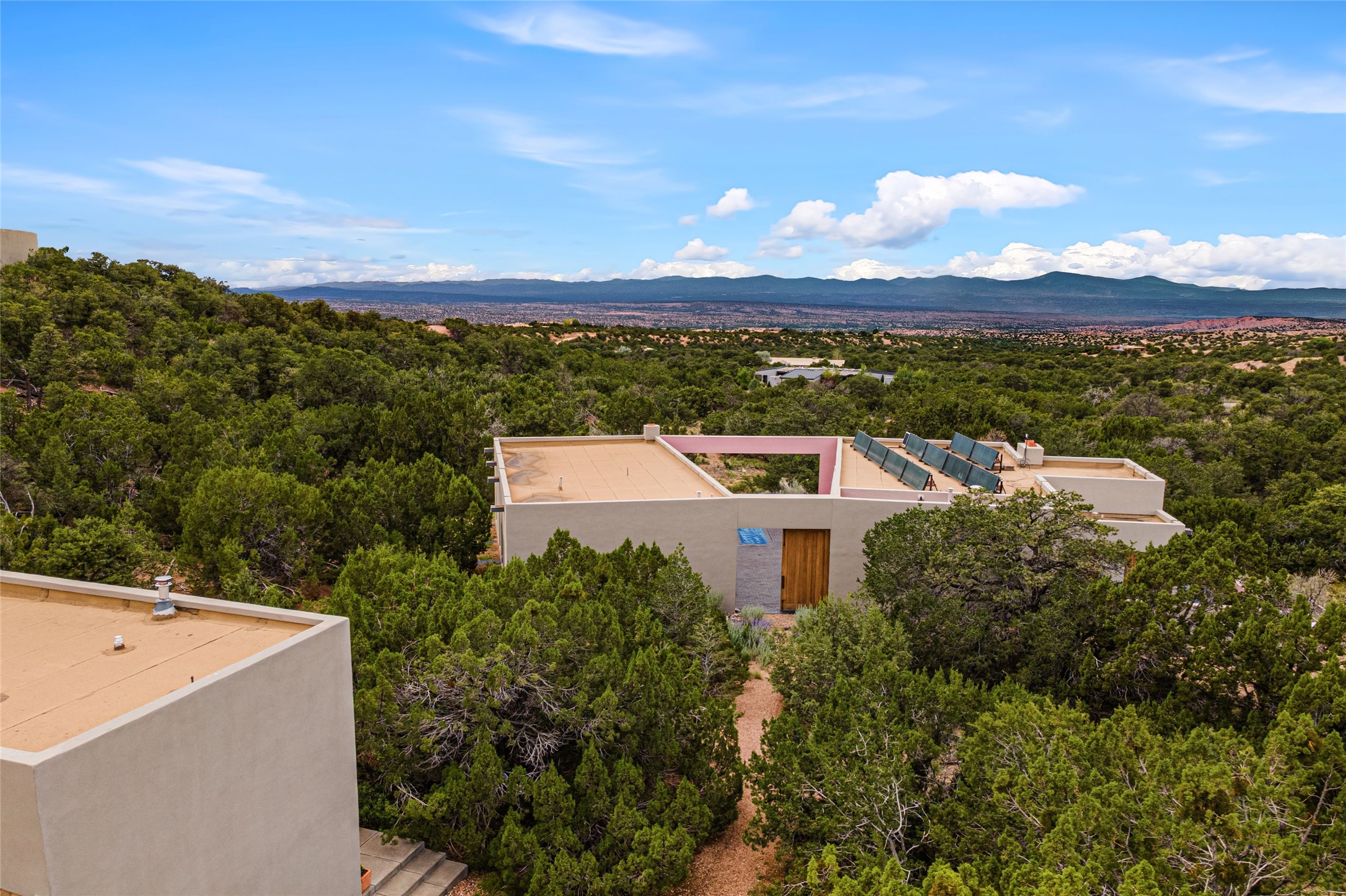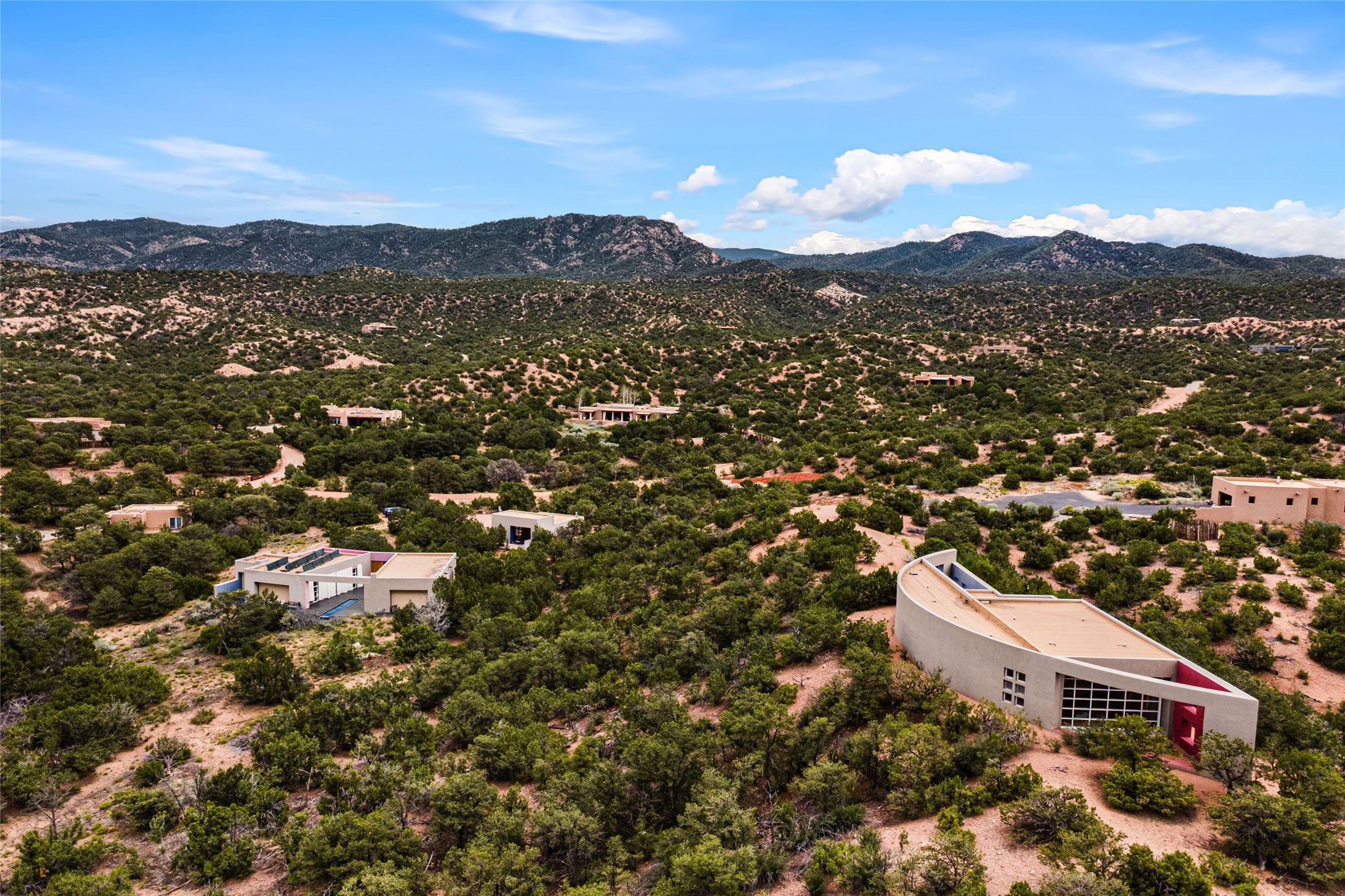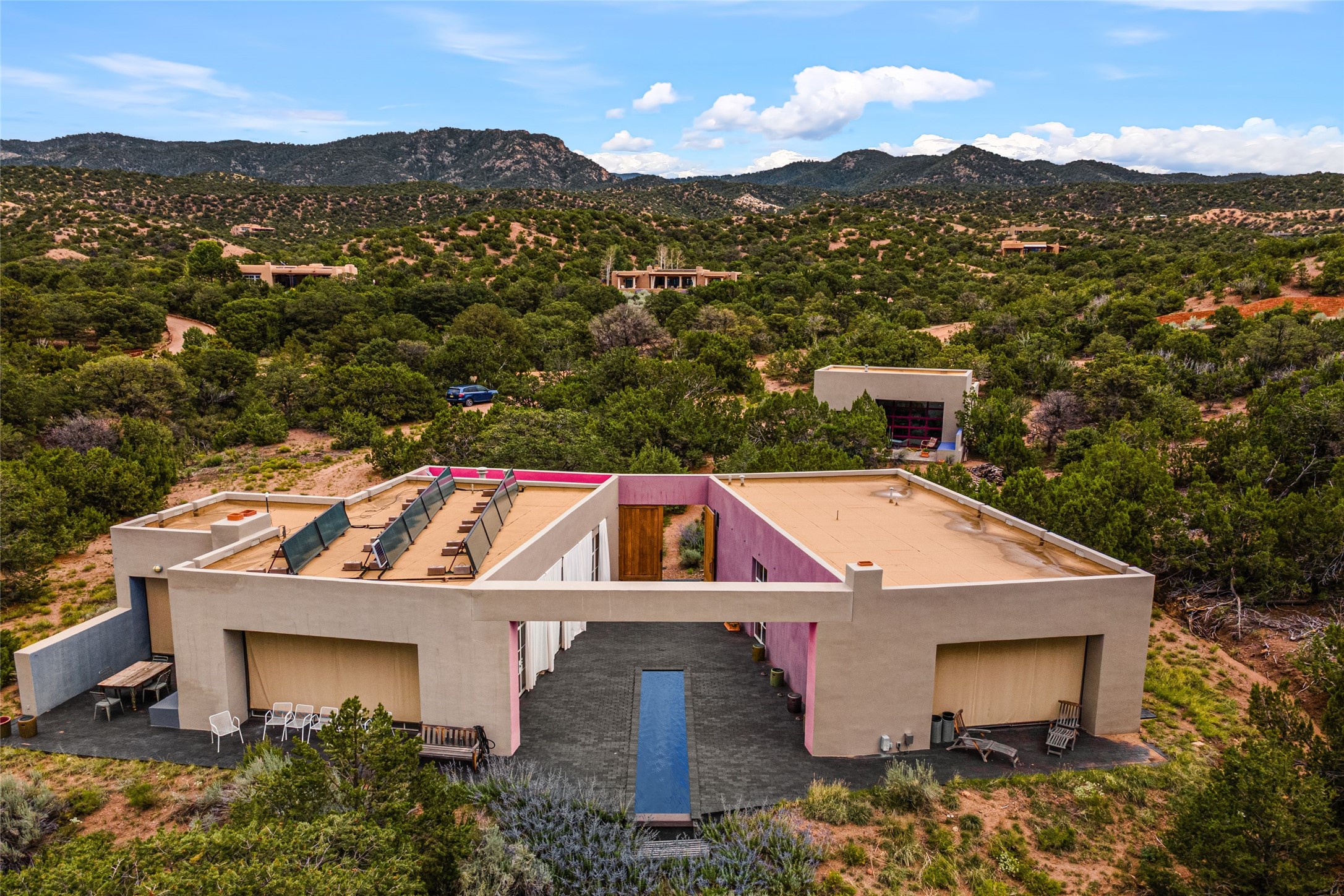 Stunning Modernist artist retreat in Tesuque located on a heavily wooded 7+/- acre view lot. Conceived by the owner as a private residence including a spectacular professional studio high on a ridge above the residence, the living quarters are divided into two structures separated by a spacious bricked patio.The larger of the two structures includes a well-equipped kitchen featuring an Aga stove, zinc counters that separate the dining area which leads to the living area. Open concept design, 12 foot ceilings throughout, surrounded by 10' glass walls on two sides, there are polished concrete floors, in-floor radiant heat, all adding to a great sense of volume and space. In intimate study that functions as a occasional guest bedroom includes a 3/4 bath. There is passive solar heating assistAccoss the bricked patio is the second structure including a massive bedroom, a large walk-in closet and full bath with jetted tub, twin sinks and shower compartment. 12' ceilings, diamond plastered walls and polished concrete floors with in-floor radiant heat and 10' glass walls.On the ridge above is an amazing professional studio that has been used for photography. A full dark room is included. There are polished concrete floors with radiant heat, 12' ceilings and a huge glass wall with a roll-up glass door. Also there is a guest space that includes a kitchen, a 3/4 bath and sleeping loft. Adjacent but completely separate is a stunning 65' long gallery and library with 10' high wood grid bookshelves.