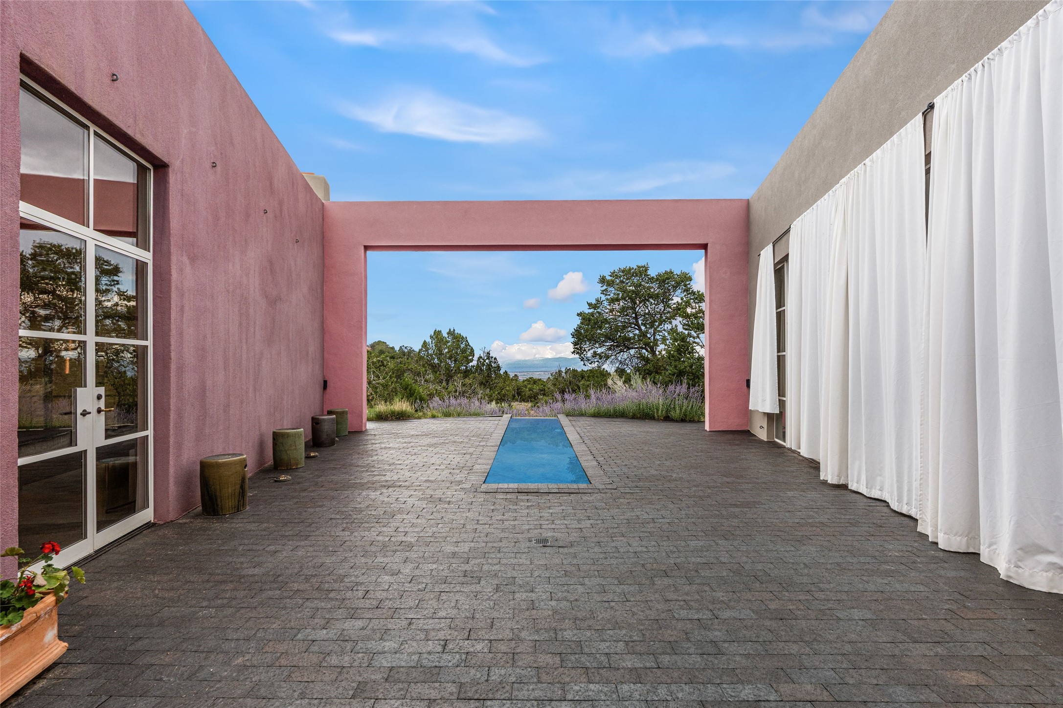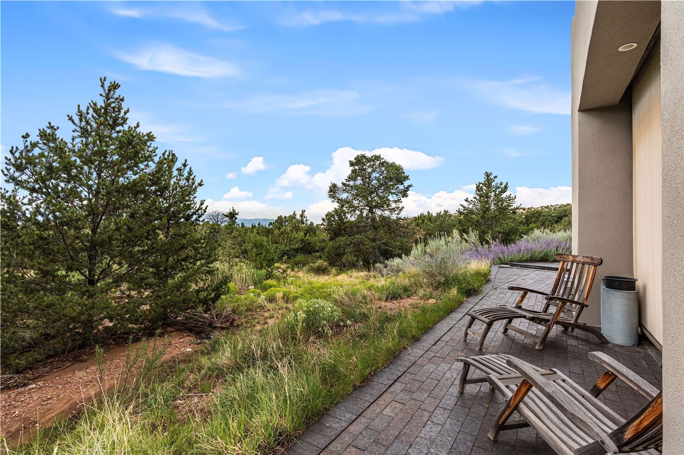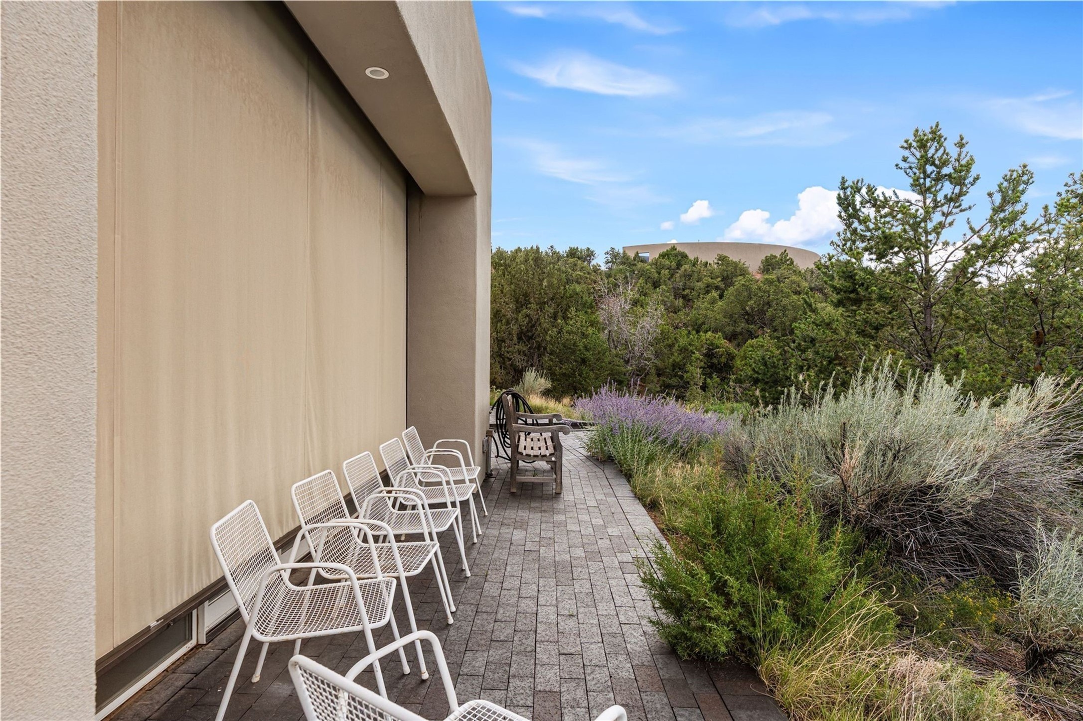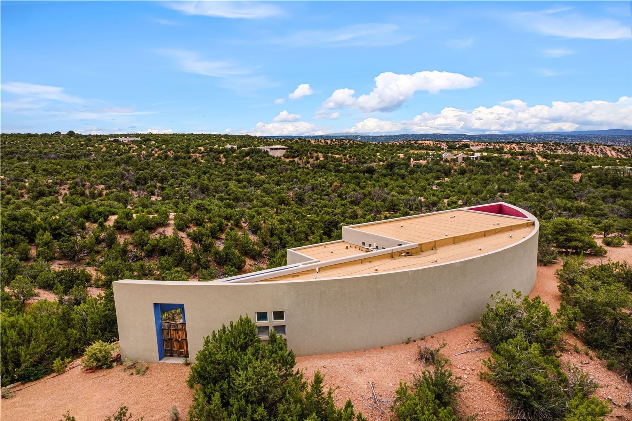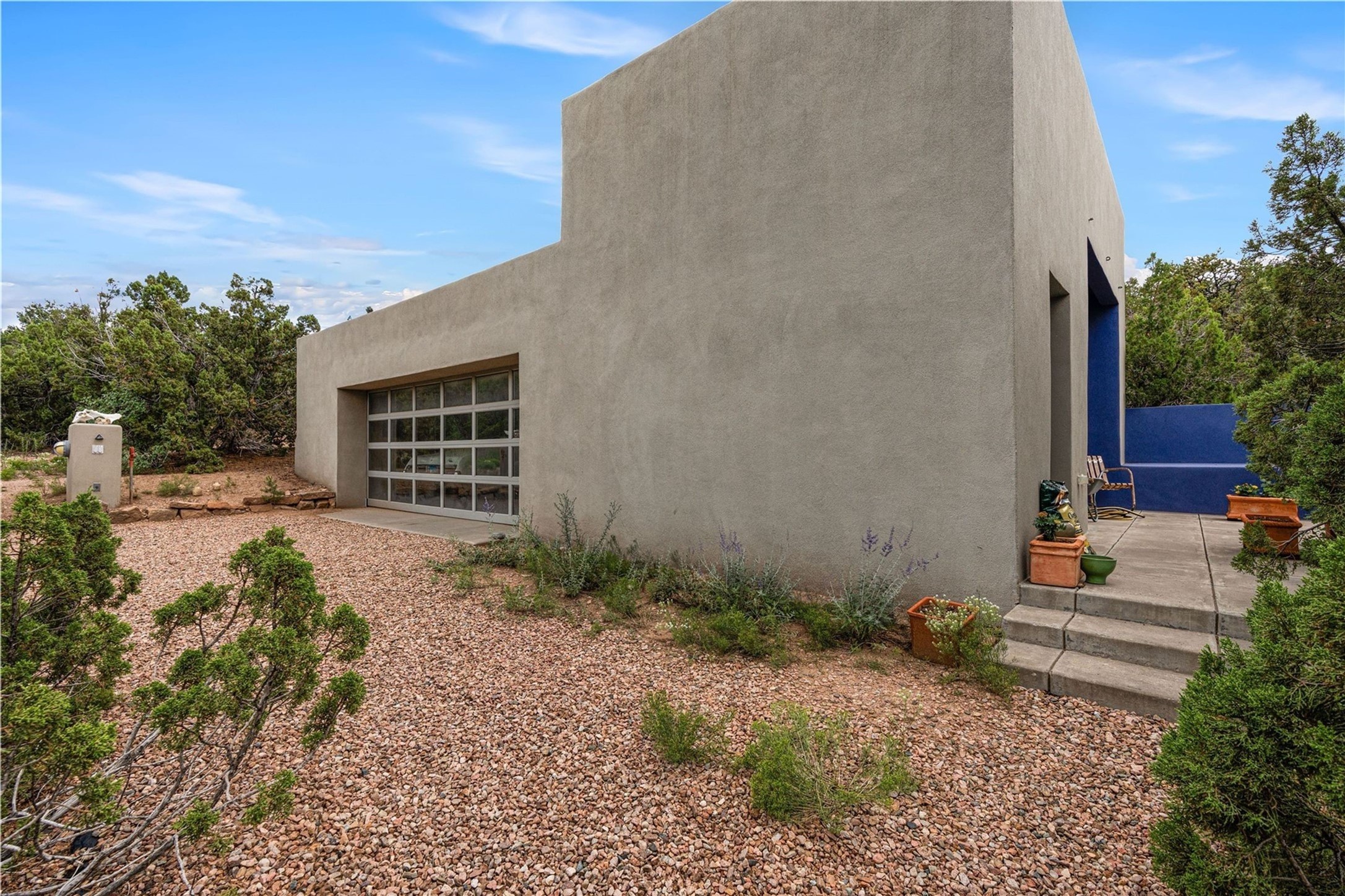 Stunning Modernist artist retreat in Tesuque located on a heavily wooded 7+/- acre view lot. Conceived by the owner as a private residence including a spectacular professional studio high on a ridge above the residence, the living quarters are divided into two structures separated by a spacious bricked patio.The larger of the two structures includes a well-equipped kitchen featuring an Aga stove, zinc counters that separate the dining area which leads to the living area. Open concept design, 12 foot ceilings throughout, surrounded by 10' glass walls on two sides, there are polished concrete floors, in-floor radiant heat, all adding to a great sense of volume and space. In intimate study that functions as a occasional guest bedroom includes a 3/4 bath. There is passive solar heating assistAccoss the bricked patio is the second structure including a massive bedroom, a large walk-in closet and full bath with jetted tub, twin sinks and shower compartment. 12' ceilings, diamond plastered walls and polished concrete floors with in-floor radiant heat and 10' glass walls.On the ridge above is an amazing professional studio that has been used for photography. A full dark room is included. There are polished concrete floors with radiant heat, 12' ceilings and a huge glass wall with a roll-up glass door. Also there is a guest space that includes a kitchen, a 3/4 bath and sleeping loft. Adjacent but completely separate is a stunning 65' long gallery and library with 10' high wood grid bookshelves.