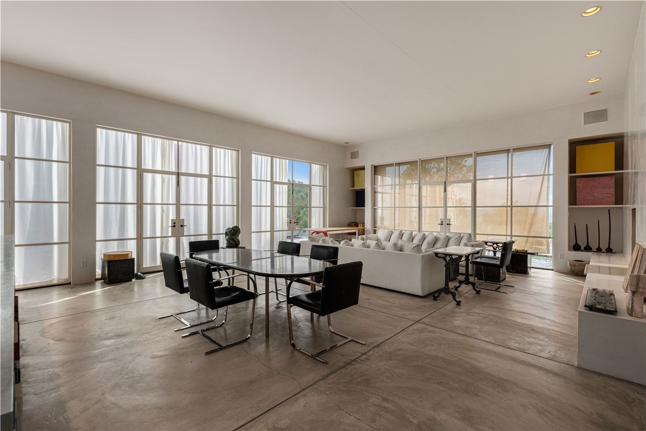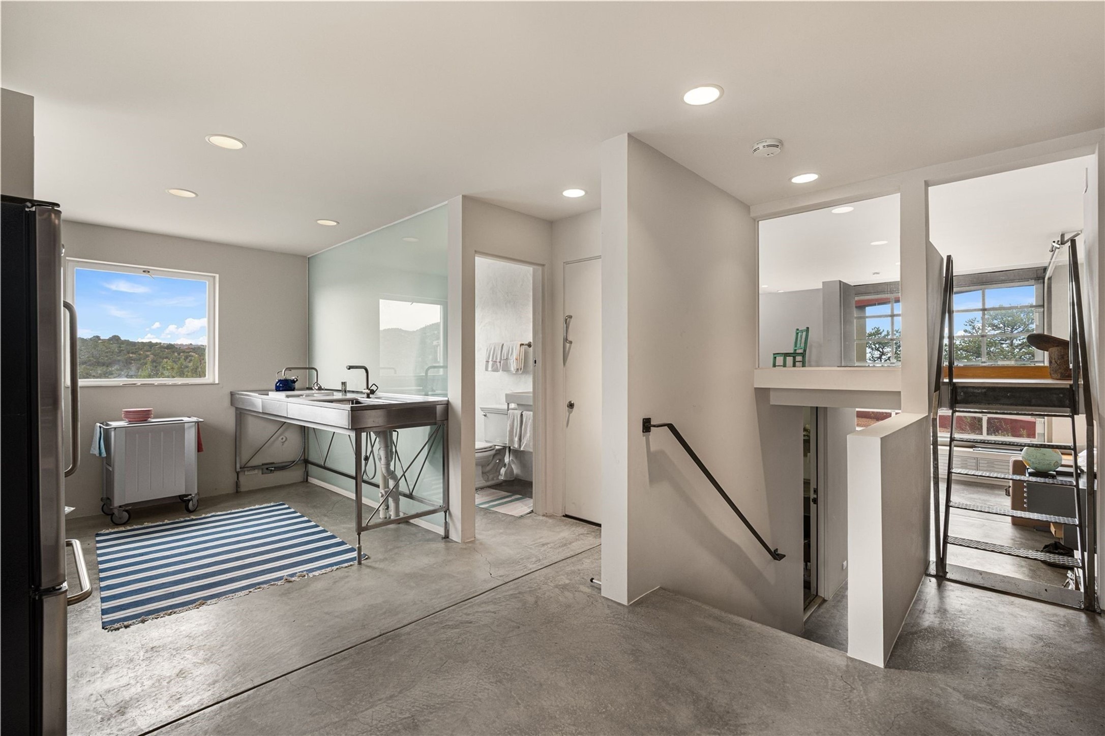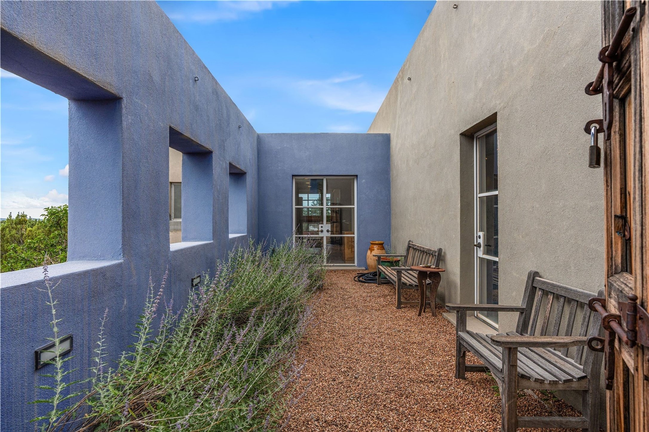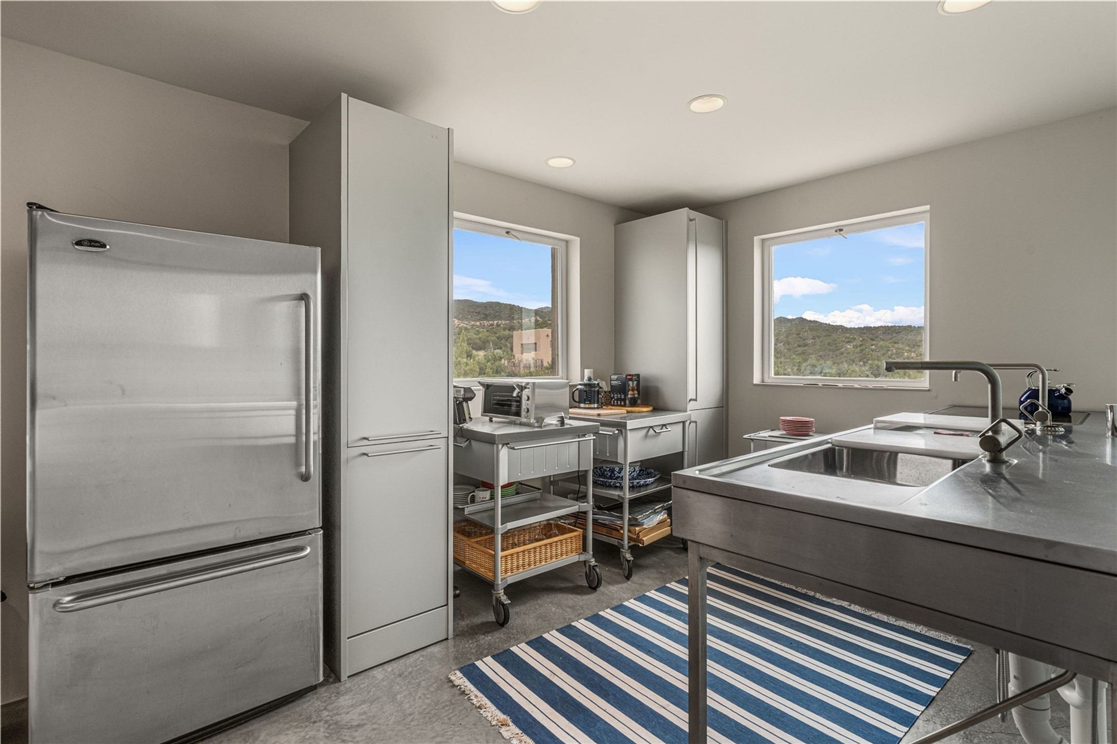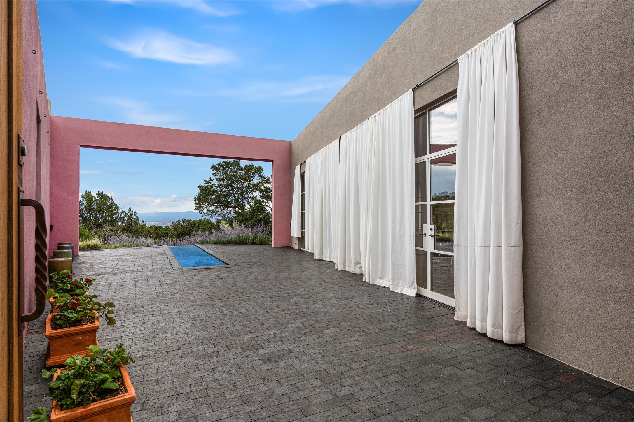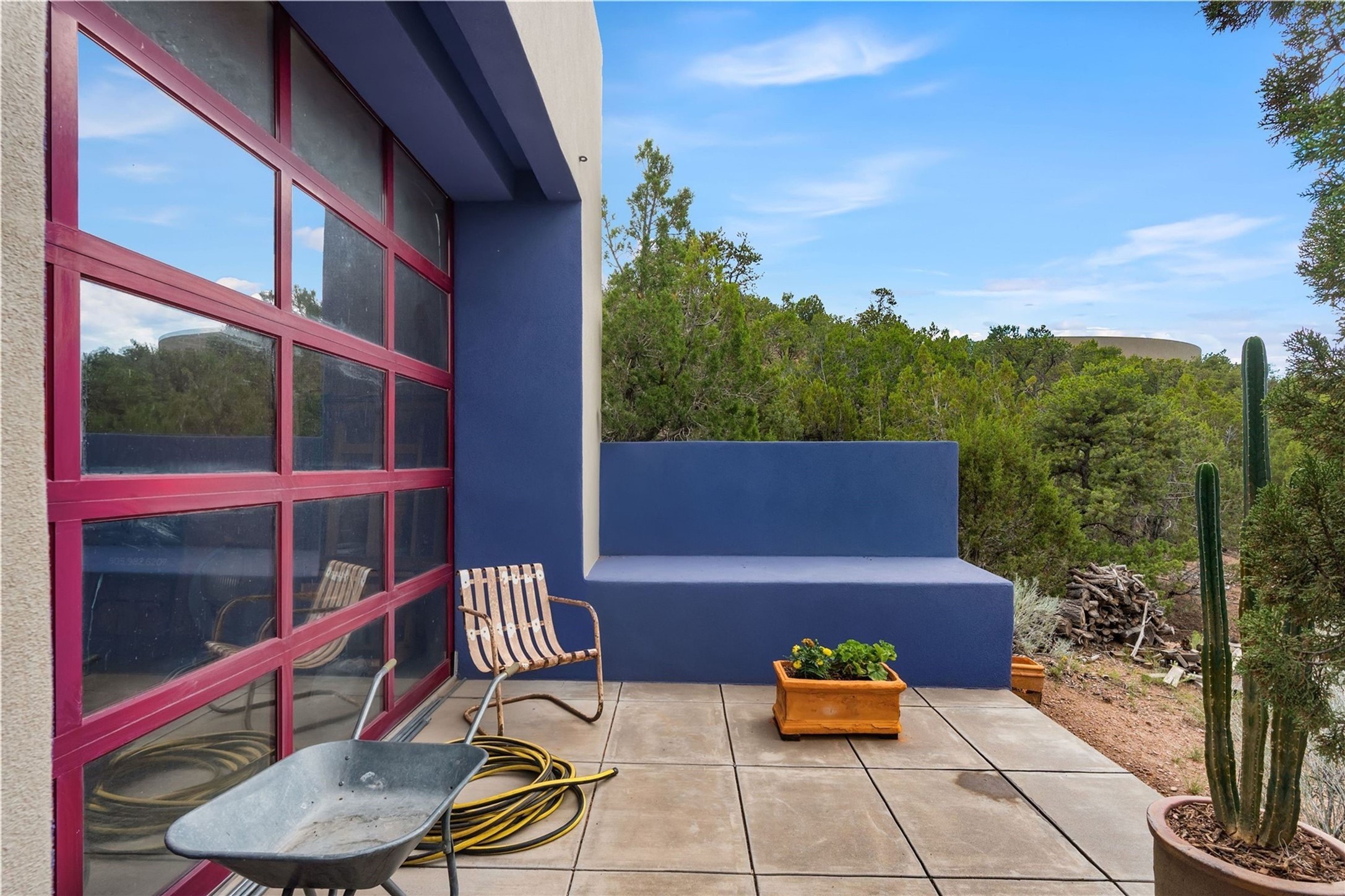 Stunning Modernist artist retreat in Tesuque located on a heavily wooded 7+/- acre view lot. Conceived by the owner as a private residence including a spectacular professional studio high on a ridge above the residence, the living quarters are divided into two structures separated by a spacious bricked patio.The larger of the two structures includes a well-equipped kitchen featuring an Aga stove, zinc counters that separate the dining area which leads to the living area. Open concept design, 12 foot ceilings throughout, surrounded by 10' glass walls on two sides, there are polished concrete floors, in-floor radiant heat, all adding to a great sense of volume and space. In intimate study that functions as a occasional guest bedroom includes a 3/4 bath. There is passive solar heating assistAccoss the bricked patio is the second structure including a massive bedroom, a large walk-in closet and full bath with jetted tub, twin sinks and shower compartment. 12' ceilings, diamond plastered walls and polished concrete floors with in-floor radiant heat and 10' glass walls.On the ridge above is an amazing professional studio that has been used for photography. A full dark room is included. There are polished concrete floors with radiant heat, 12' ceilings and a huge glass wall with a roll-up glass door. Also there is a guest space that includes a kitchen, a 3/4 bath and sleeping loft. Adjacent but completely separate is a stunning 65' long gallery and library with 10' high wood grid bookshelves.